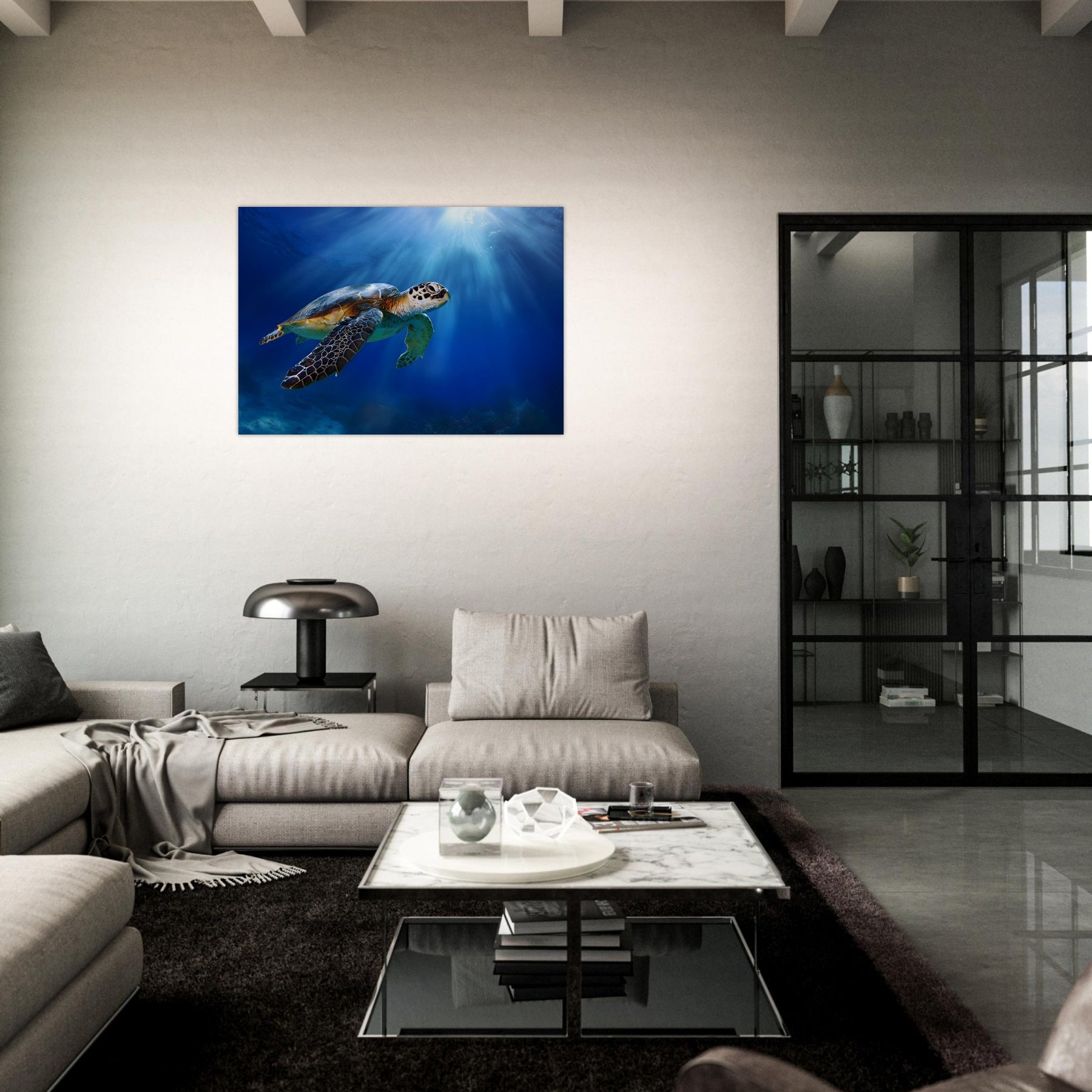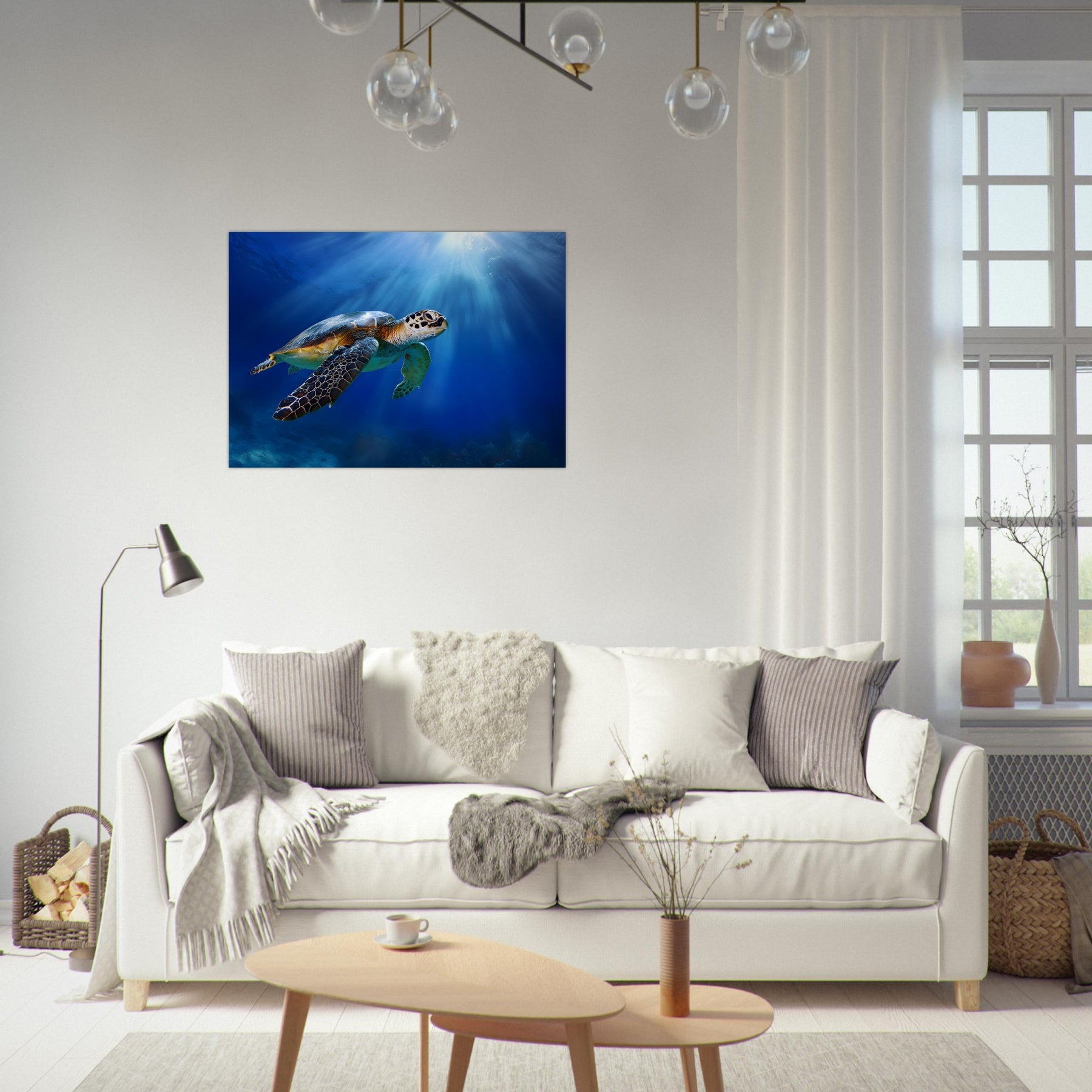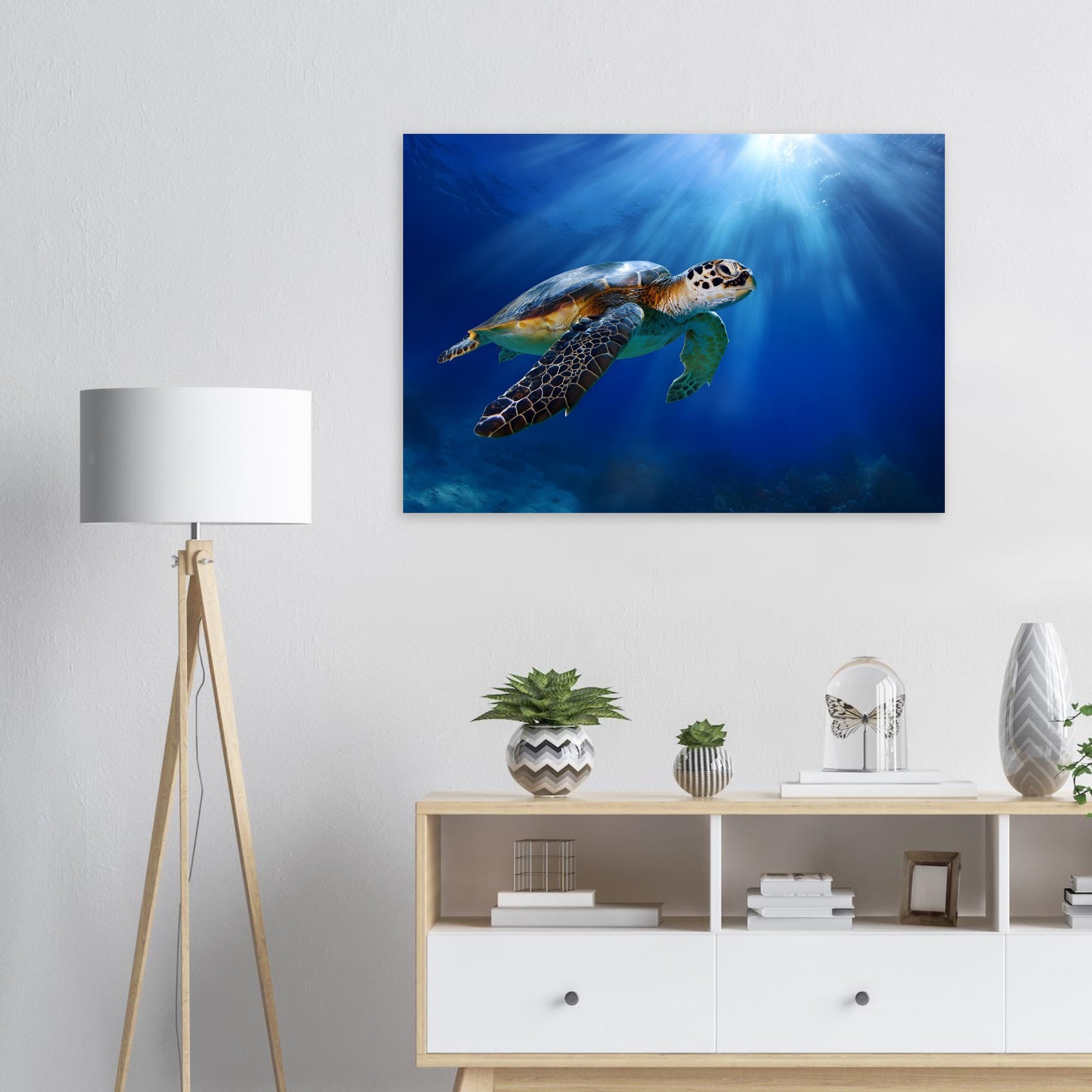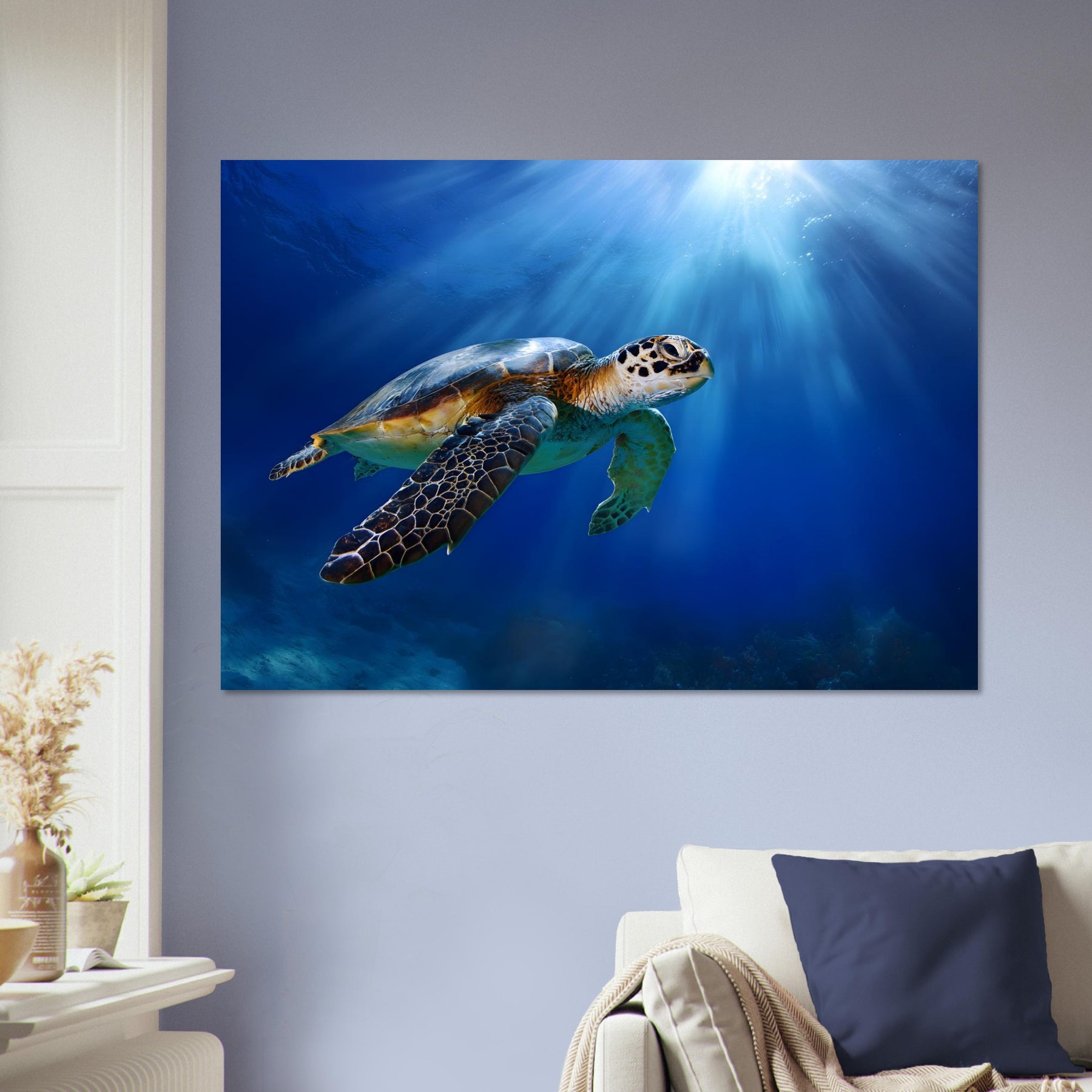 Transform your room with Ocean Light Guardian, a lightweight foam wall art piece designed to deliver calming ocean beauty with modern ease. Featuring a graceful sea turtle swimming through radiant blue waters, this artwork adds tranquility and nature-inspired charm to any space.