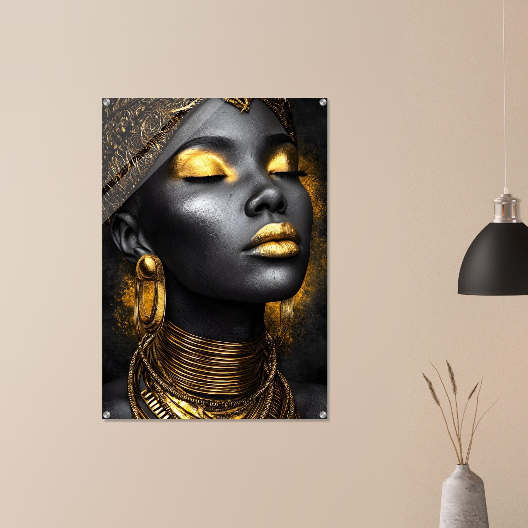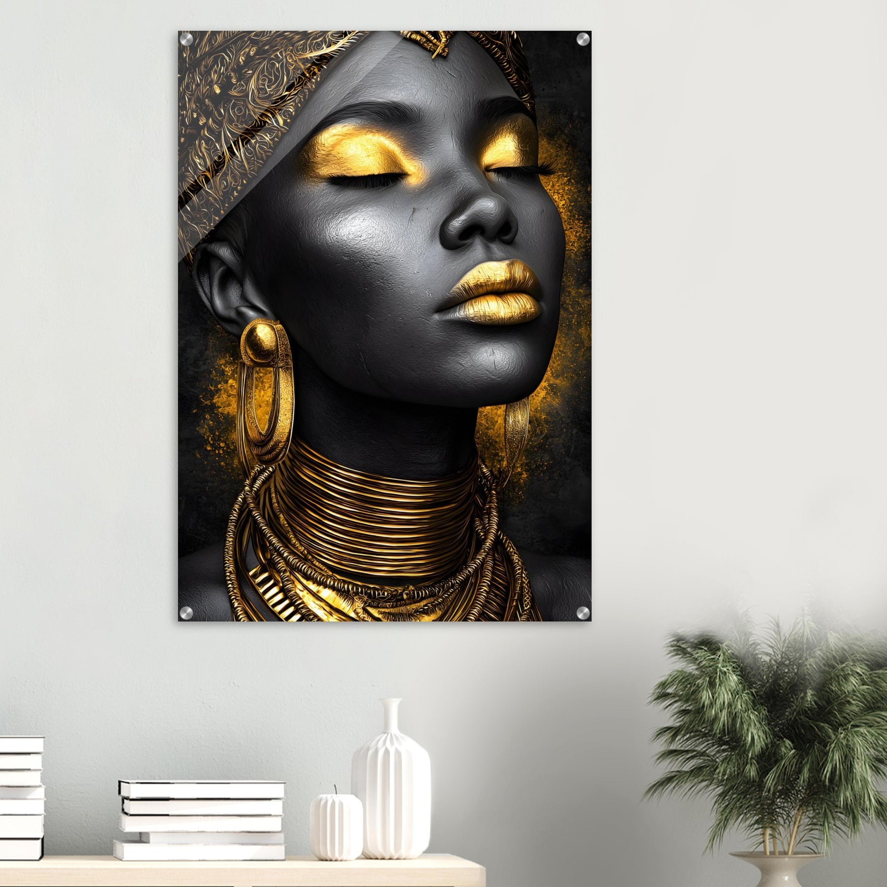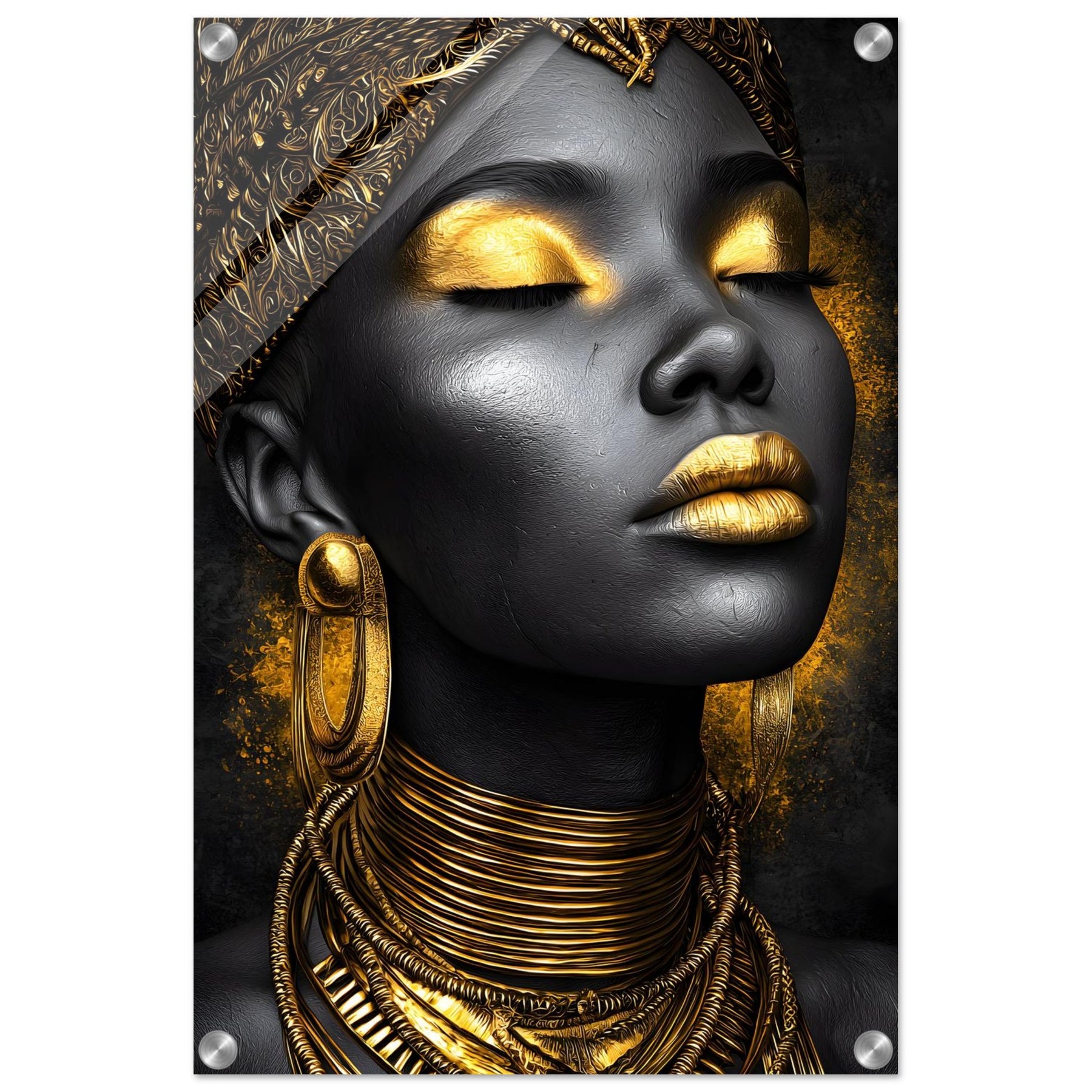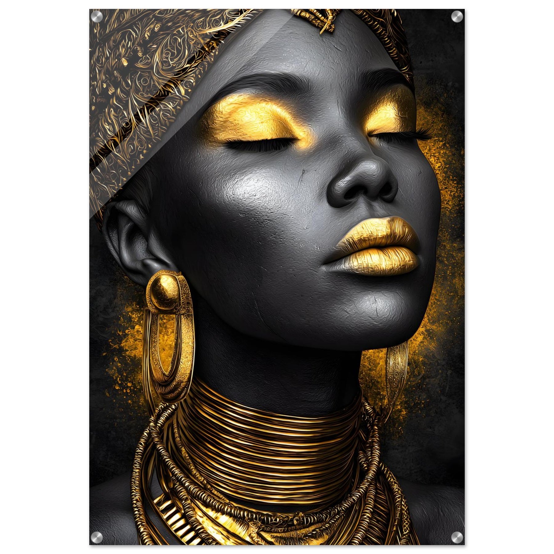 Celebrate sophistication and timeless beauty with our Golden Elegance Acrylic Wall Art. This radiant portrait captures the elegance of black and gold tones, detailed with intricate jewelry and serene confidence. The glossy acrylic finish enhances depth and brilliance, turning it into a true gallery-worthy centerpiece.