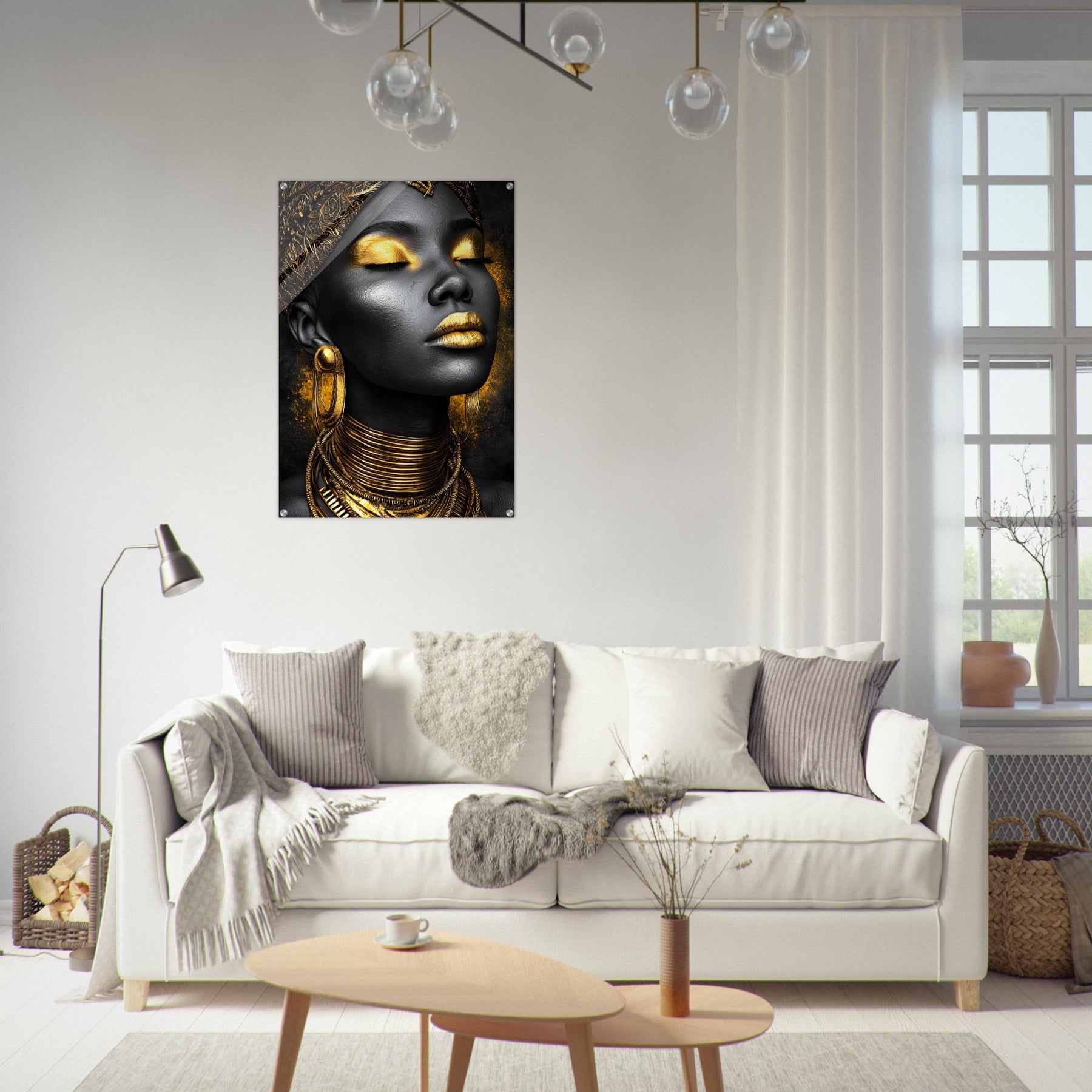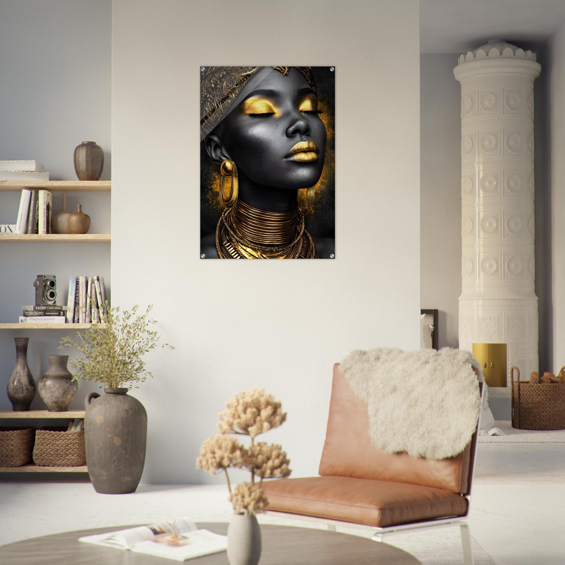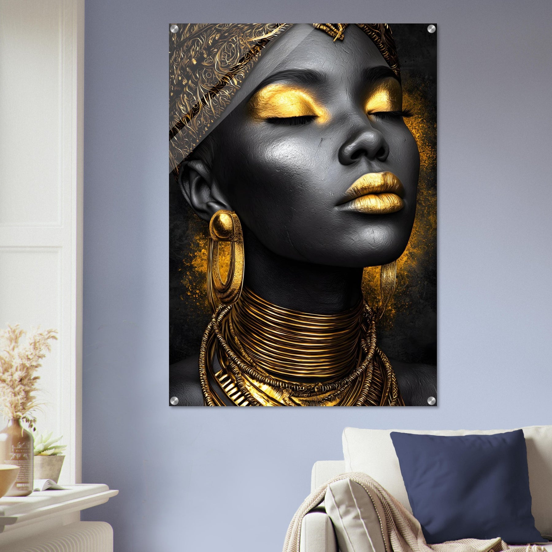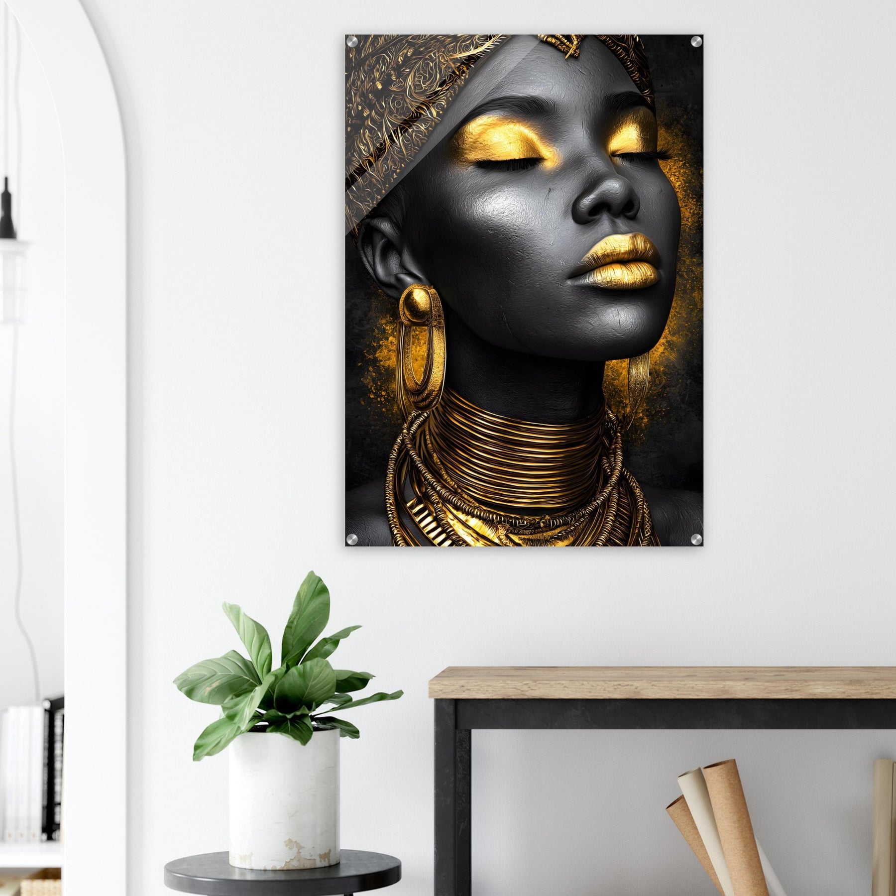 Celebrate sophistication and timeless beauty with our Golden Elegance Acrylic Wall Art. This radiant portrait captures the elegance of black and gold tones, detailed with intricate jewelry and serene confidence. The glossy acrylic finish enhances depth and brilliance, turning it into a true gallery-worthy centerpiece.