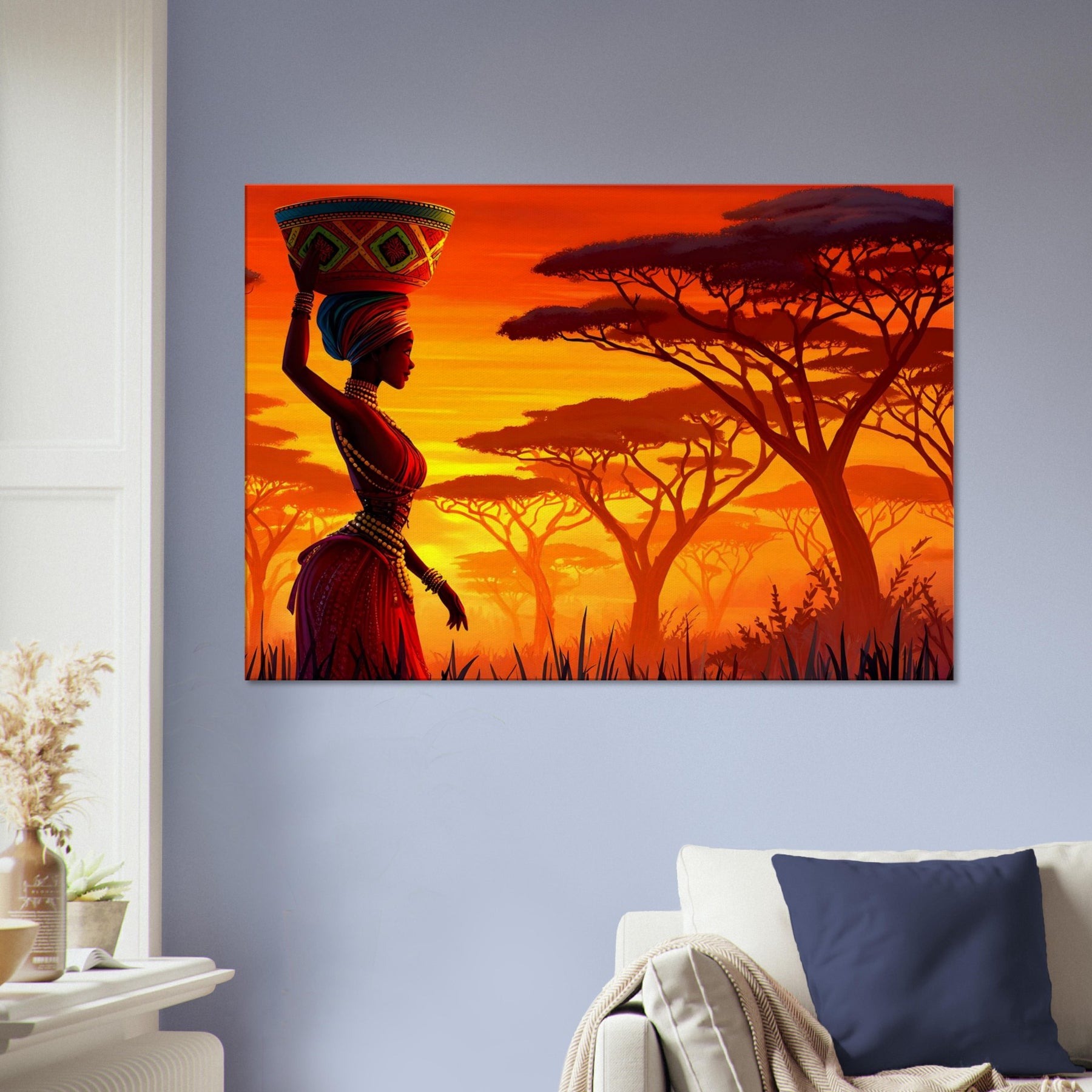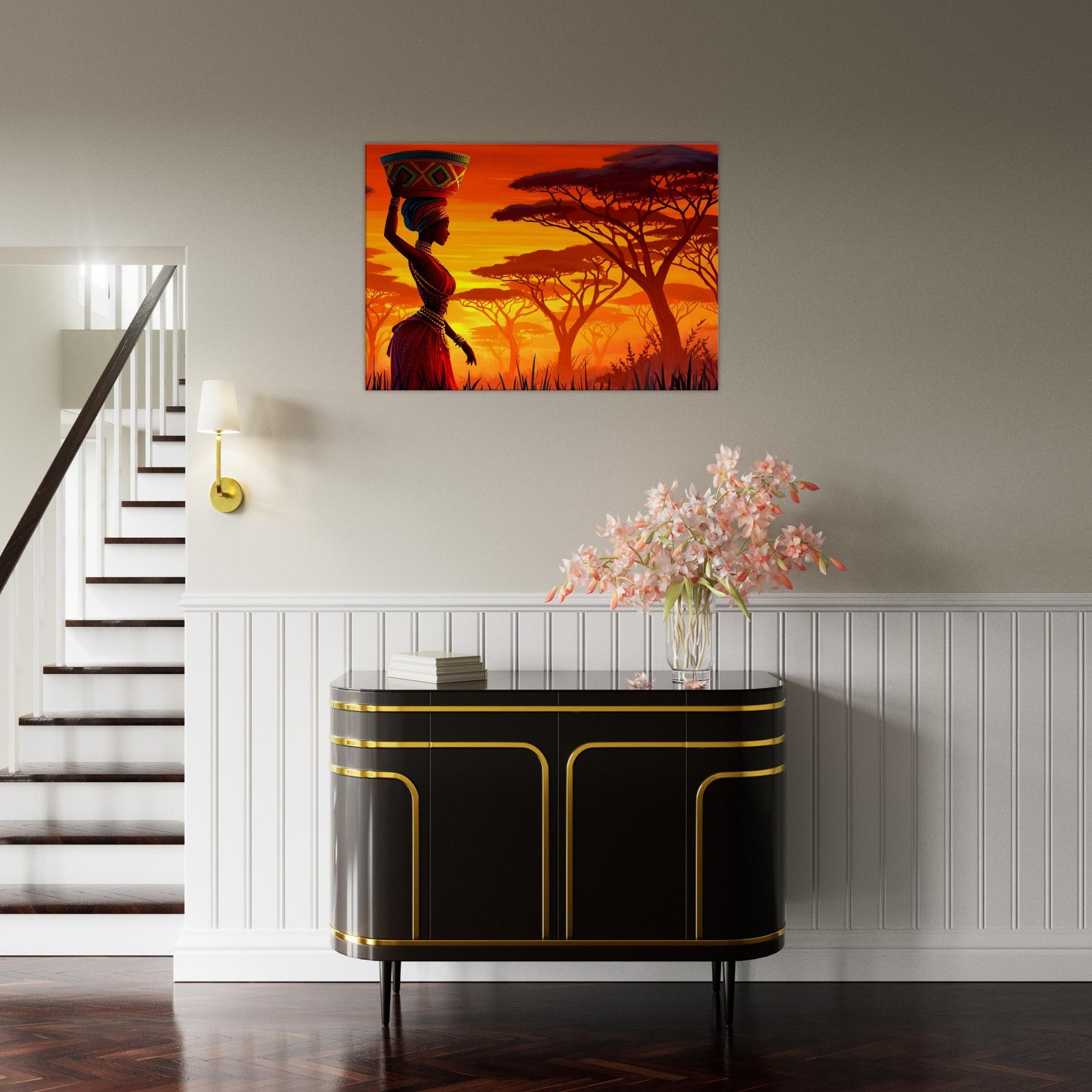 Celebrate the beauty of tradition and the resilience of culture with our Strength in Sunset Canvas Wall Art. This captivating piece portrays the silhouette of a woman carrying a basket on her head against a glowing African sunset, symbolizing strength, grace, and heritage. Printed on premium canvas, it brings warmth, depth, and timeless artistry to your space.