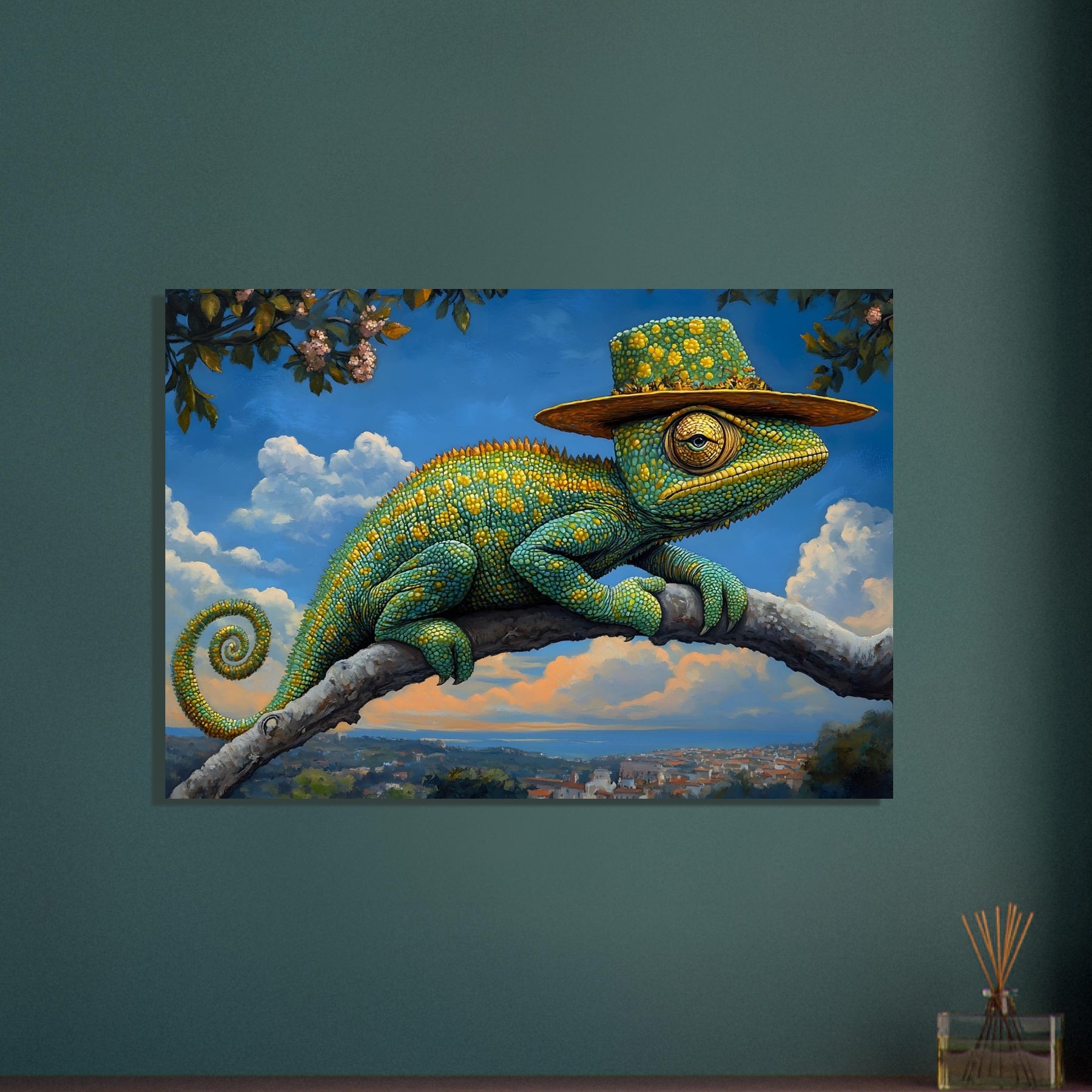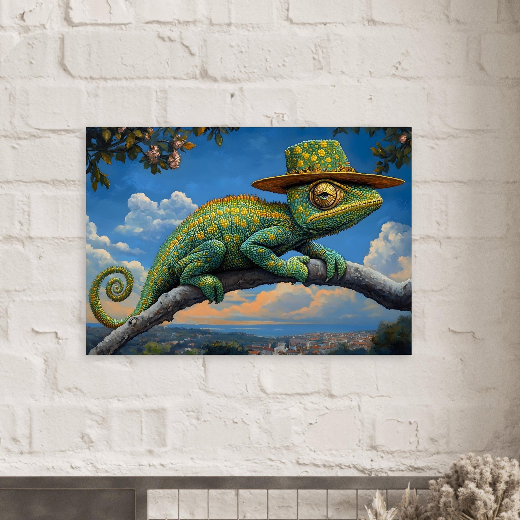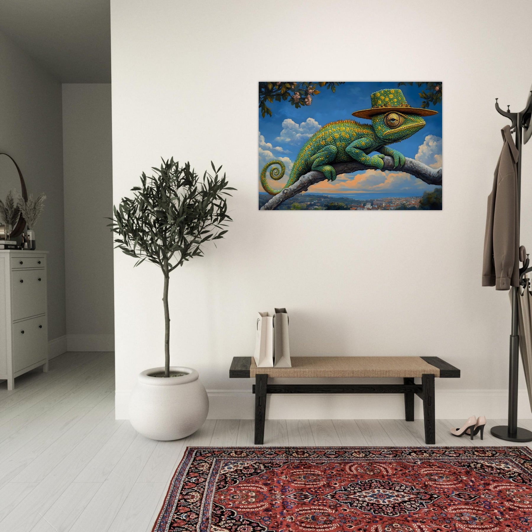 Transform your space with Chameleon Daydream, a lightweight foam wall art piece that infuses personality, color, and creativity into any room. Featuring a vividly patterned chameleon wearing a charming straw hat and perched above a serene landscape, this joyful artwork is perfect for brightening your décor.