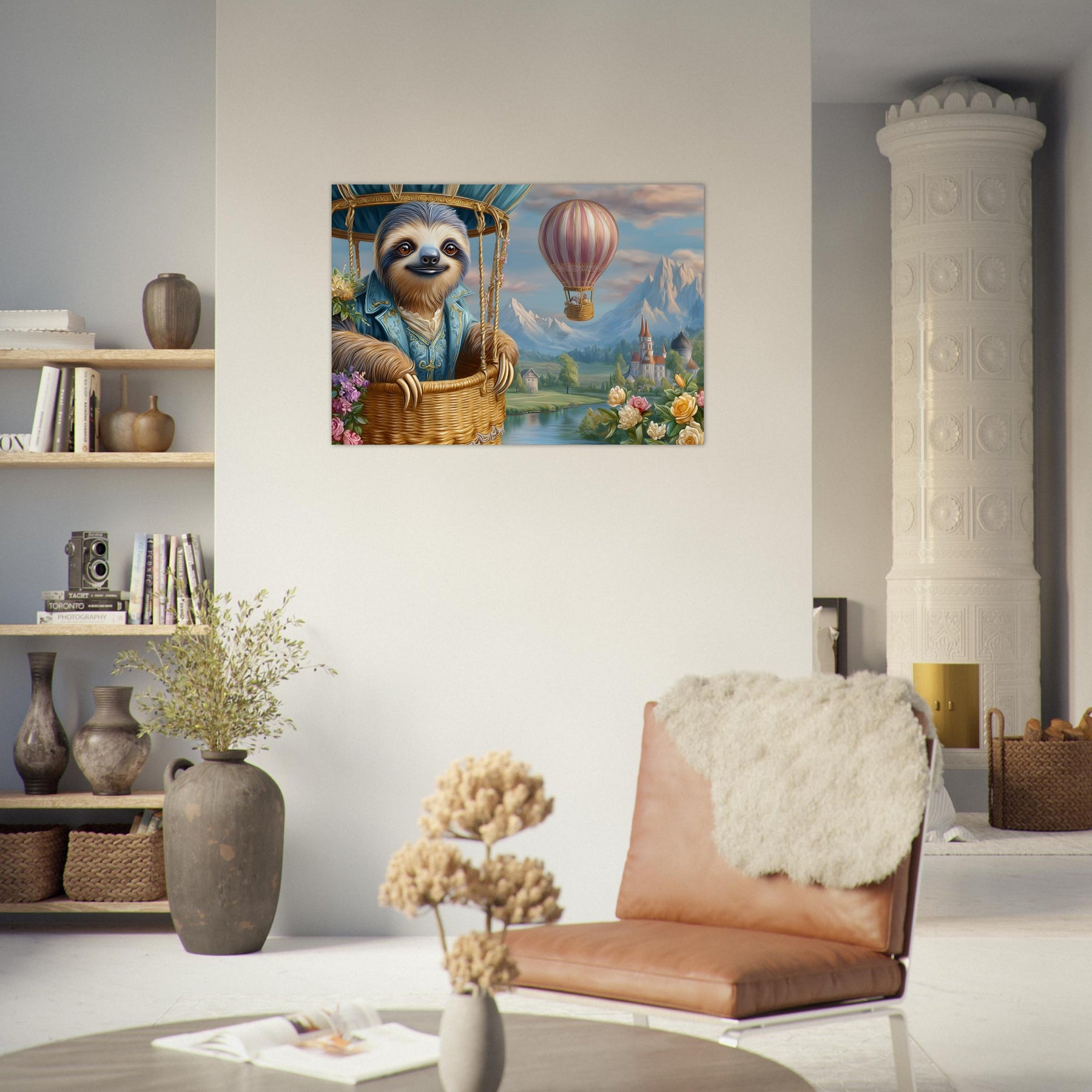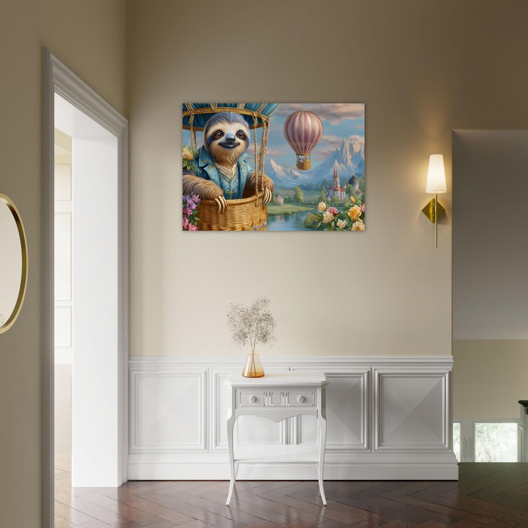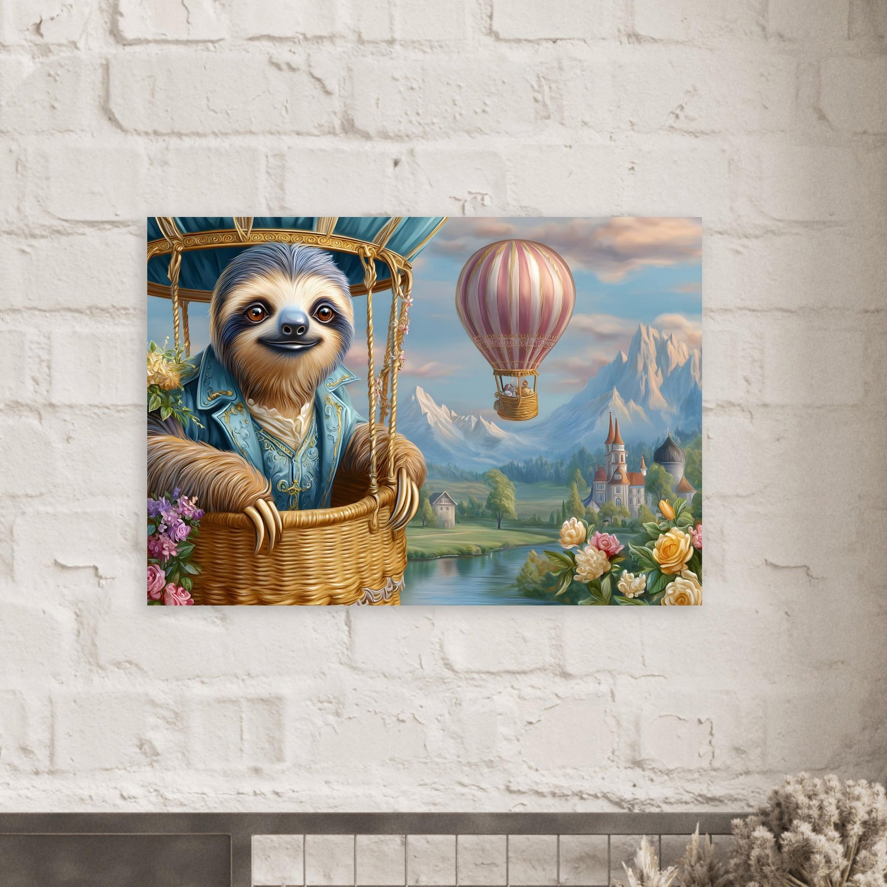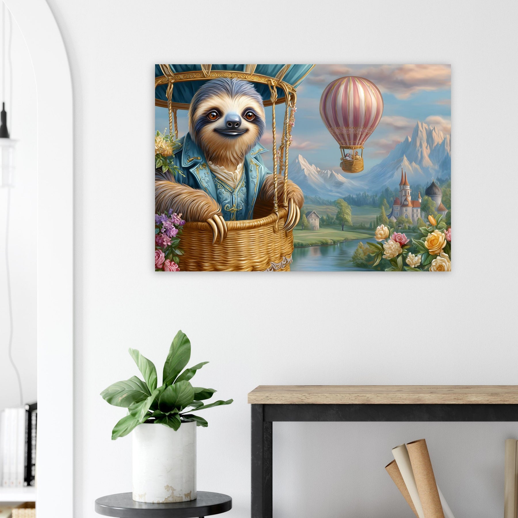 Add a touch of charm and playfulness to your décor with our Whimsical Journey Aluminum Wall Art. This delightful artwork features a sloth dressed in vintage attire, enjoying a majestic hot air balloon ride above a dreamy landscape of mountains, blooming flowers, and a distant castle. Printed on sleek aluminum, the vibrant tones and crisp details make this imaginative piece a joyful focal point for any room.