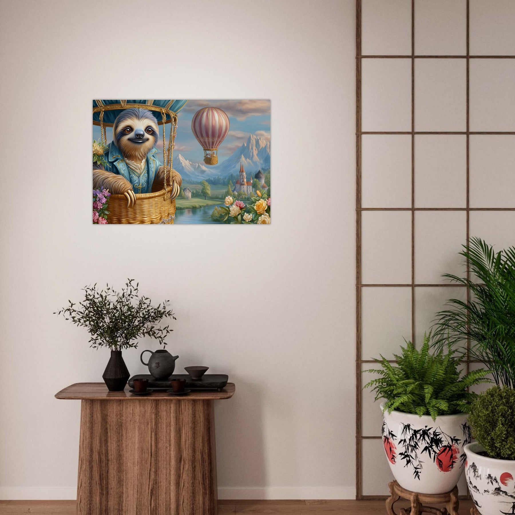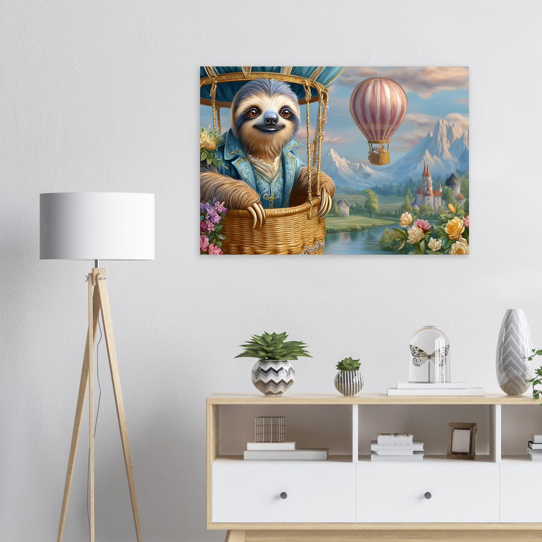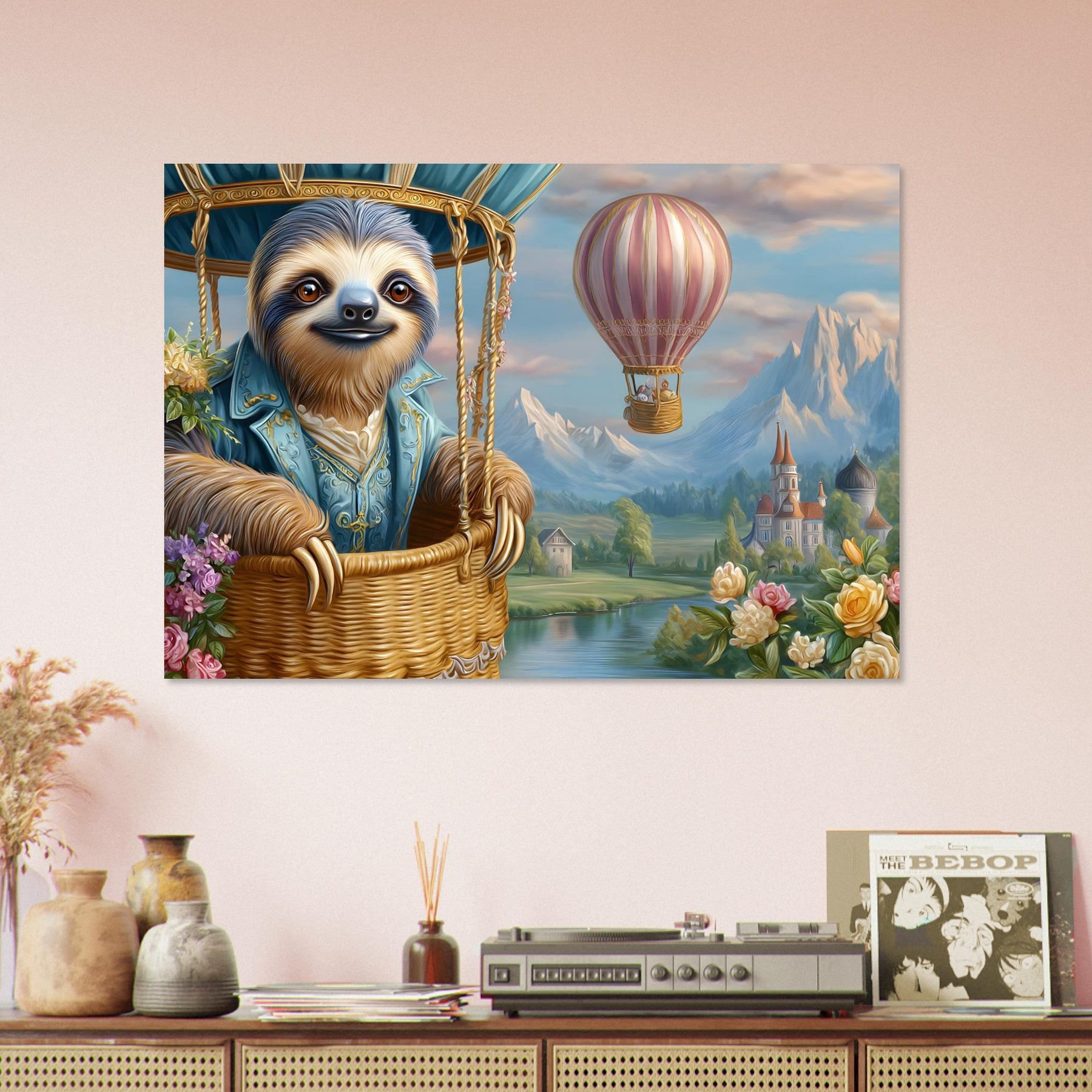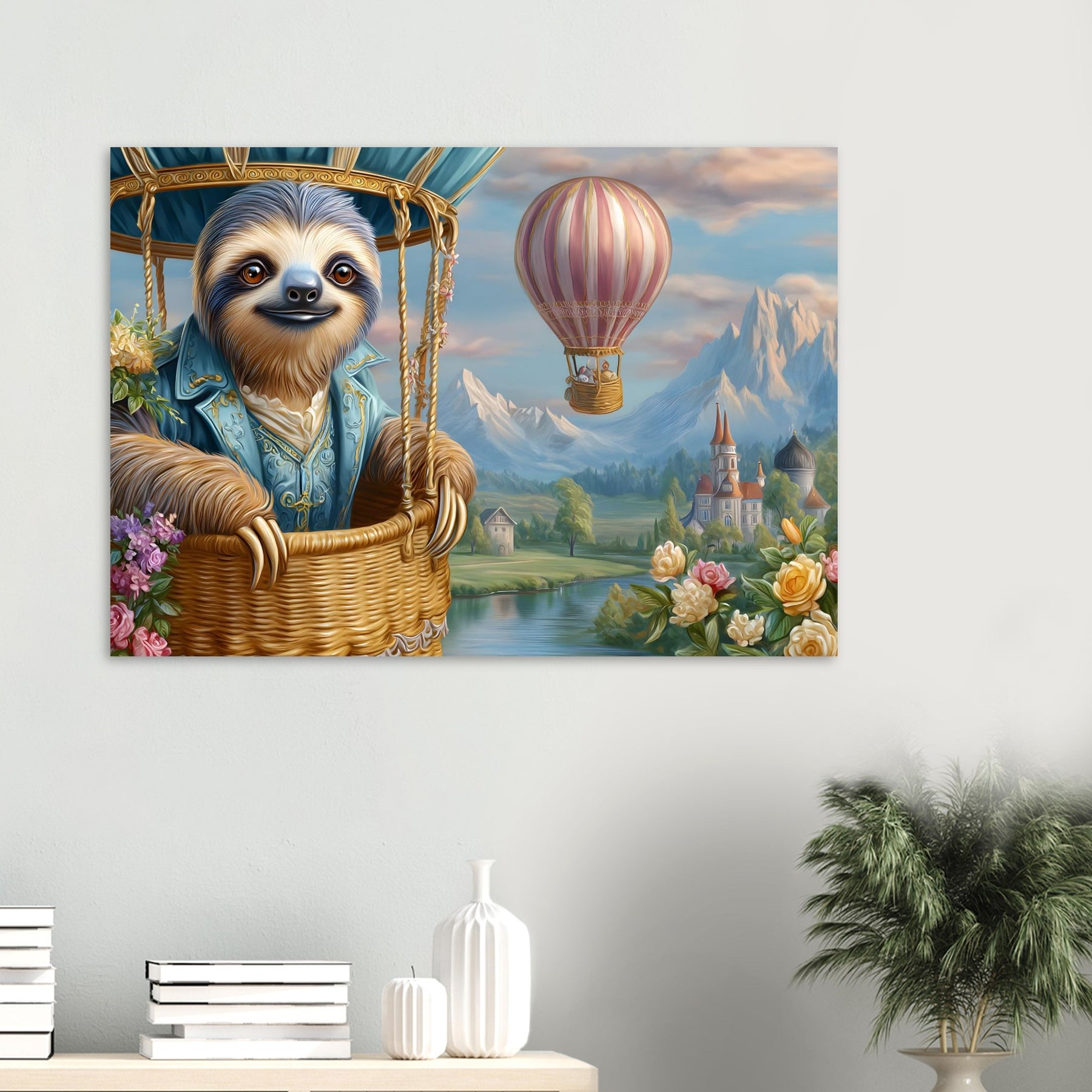 Add a touch of charm and playfulness to your décor with our Whimsical Journey Aluminum Wall Art. This delightful artwork features a sloth dressed in vintage attire, enjoying a majestic hot air balloon ride above a dreamy landscape of mountains, blooming flowers, and a distant castle. Printed on sleek aluminum, the vibrant tones and crisp details make this imaginative piece a joyful focal point for any room.