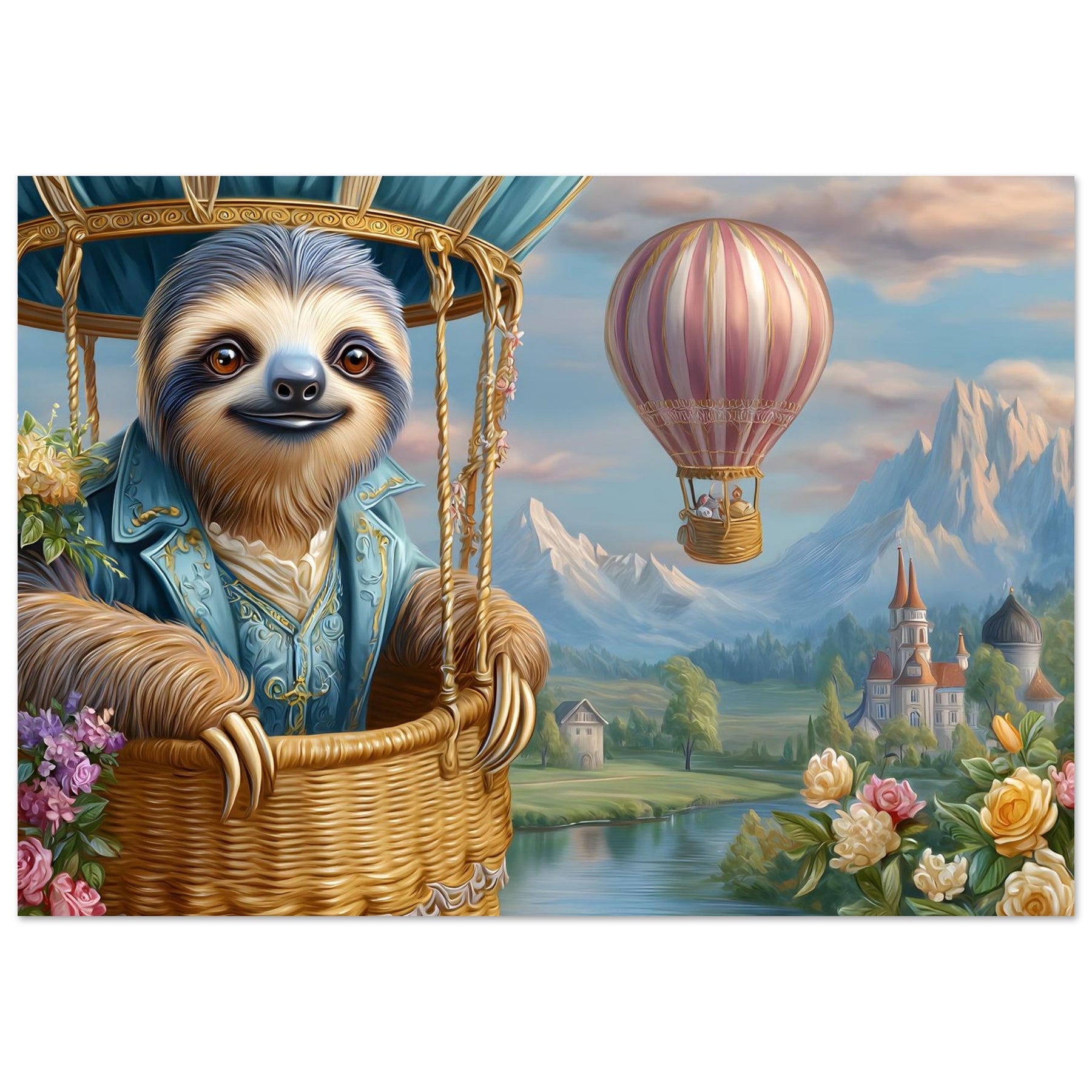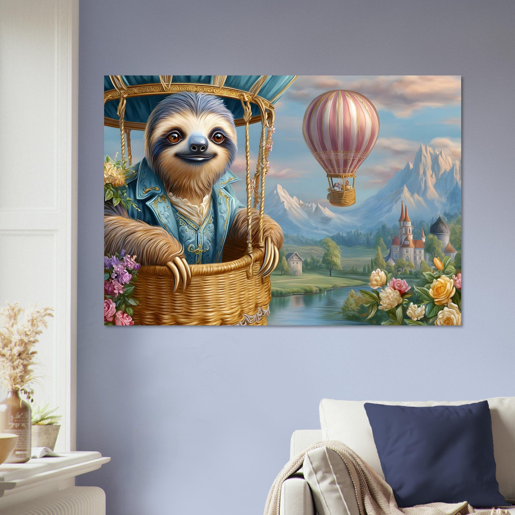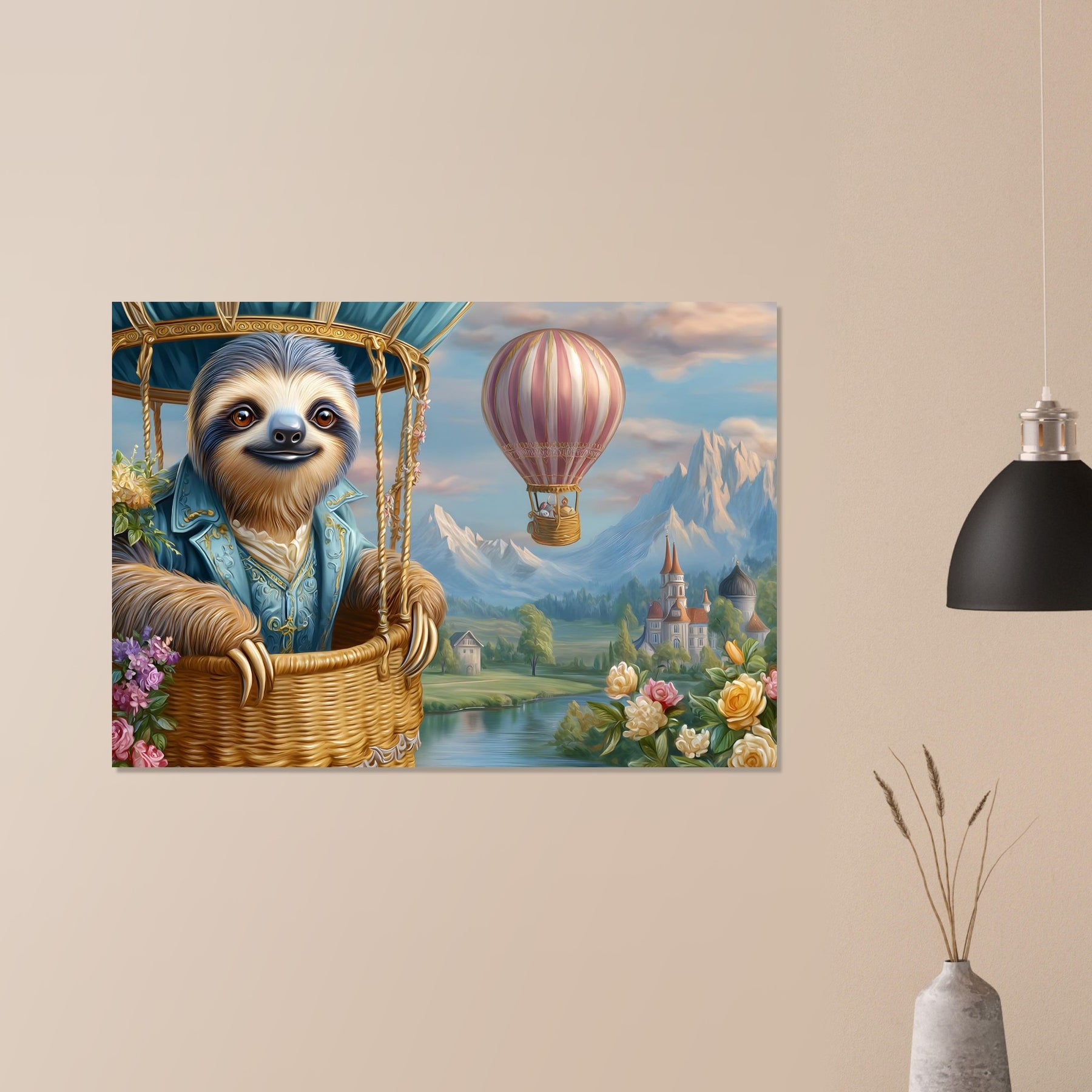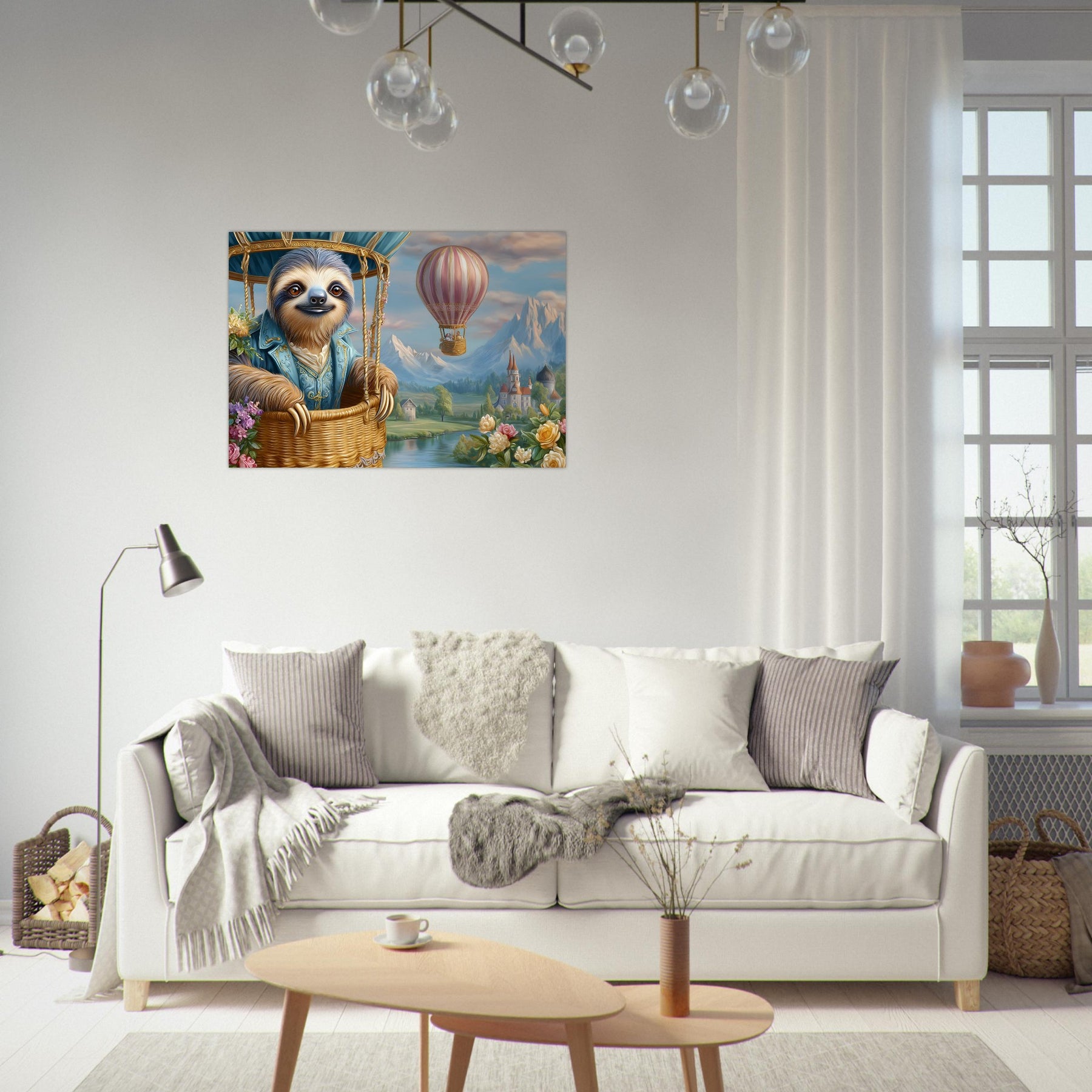 Add a touch of charm and playfulness to your décor with our Whimsical Journey Aluminum Wall Art. This delightful artwork features a sloth dressed in vintage attire, enjoying a majestic hot air balloon ride above a dreamy landscape of mountains, blooming flowers, and a distant castle. Printed on sleek aluminum, the vibrant tones and crisp details make this imaginative piece a joyful focal point for any room.