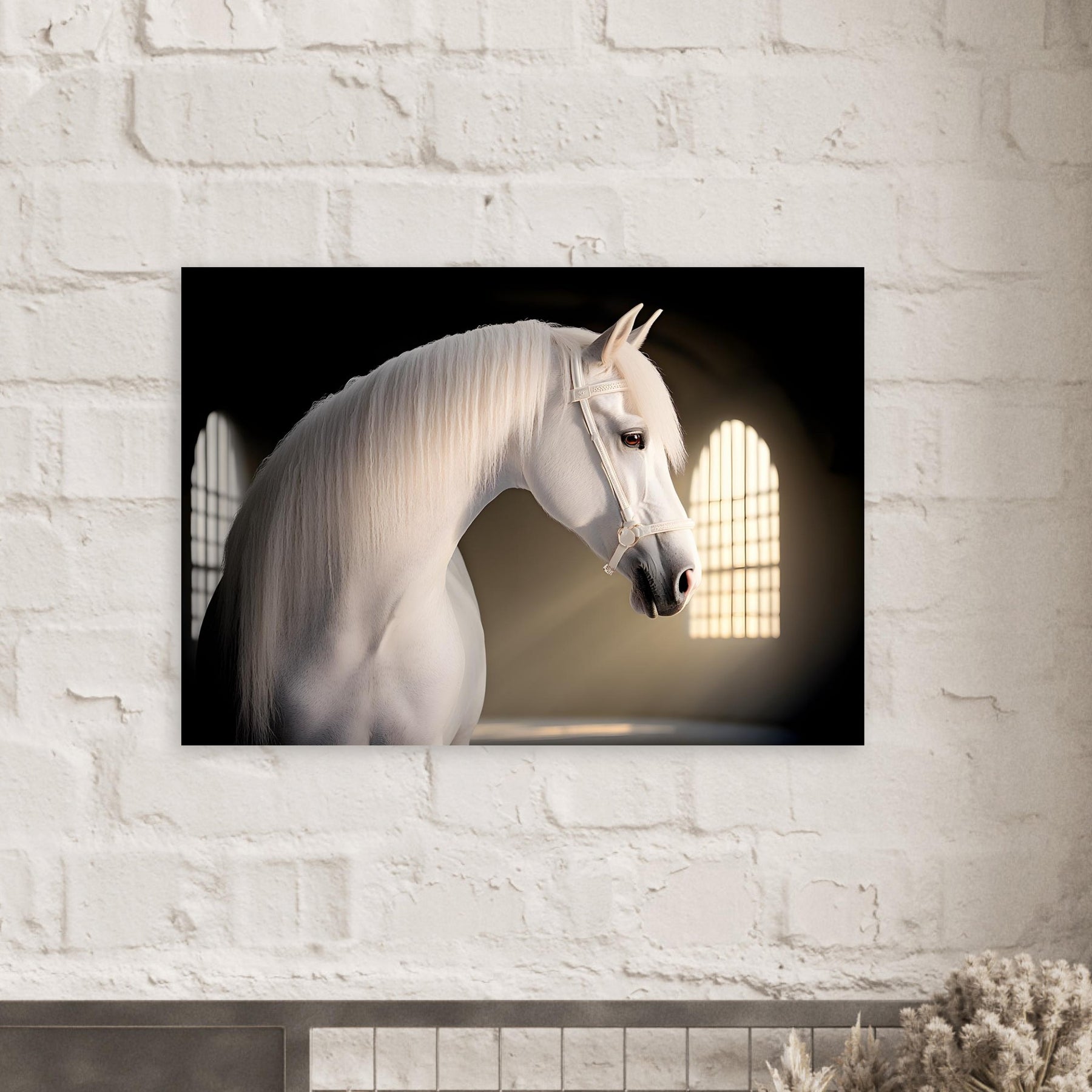 Bring timeless elegance and natural beauty to your space with our Majestic Grace Aluminum Wall Art. This stunning portrait captures a white horse bathed in soft, ethereal lighting, showcasing its refined features and flowing mane. The artwork radiates a sense of grace, freedom, and harmony, making it a breathtaking centerpiece for any interior. Printed on premium aluminum, the sleek finish enhances the depth, detail, and brilliance of the image for a truly captivating effect.
