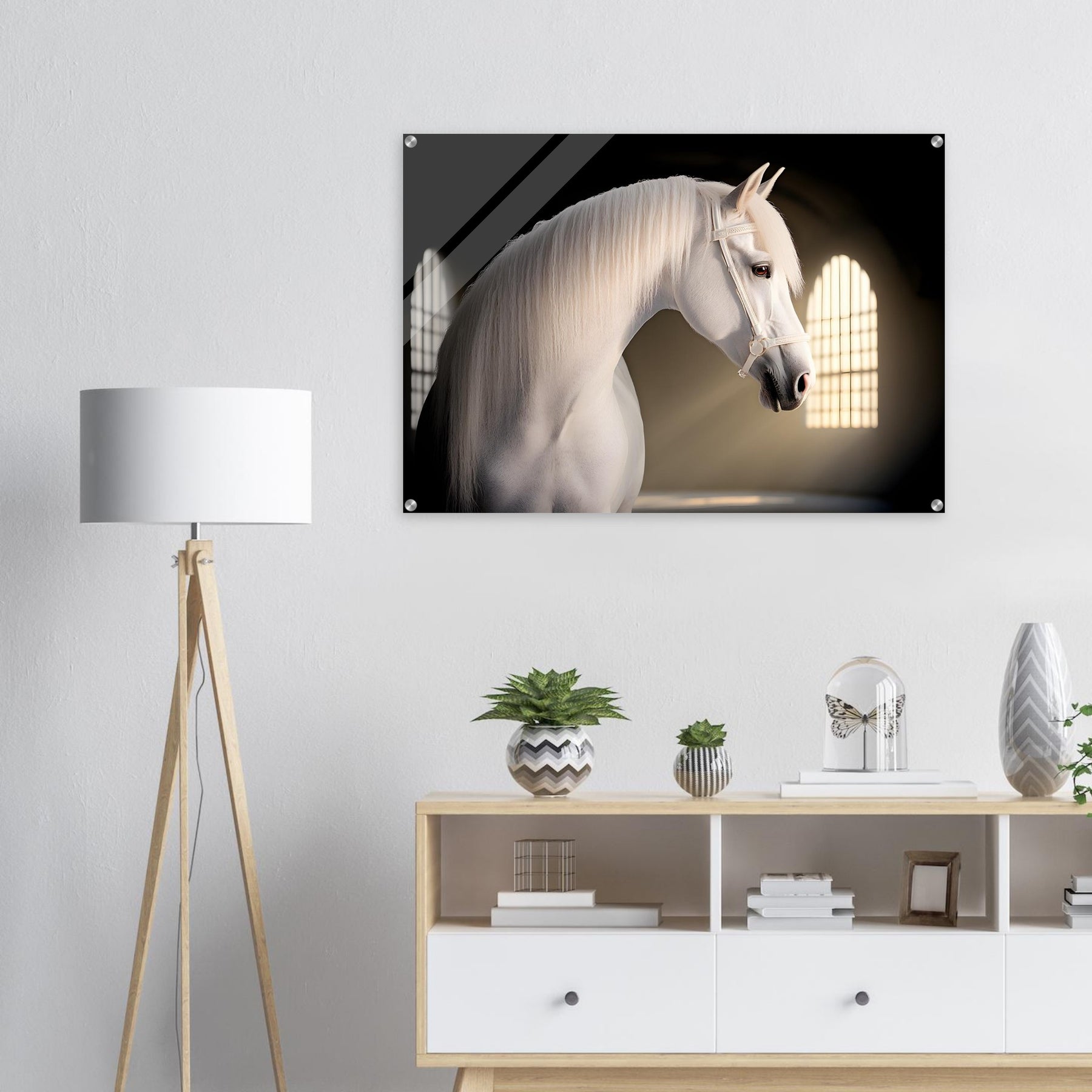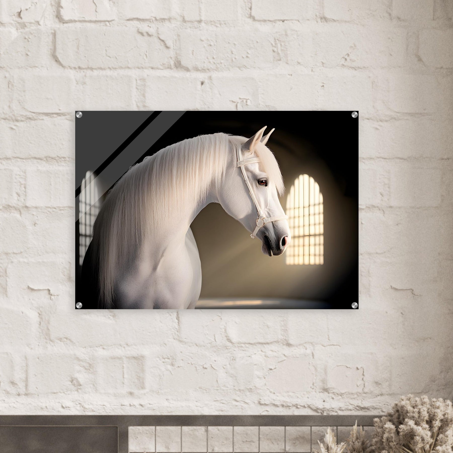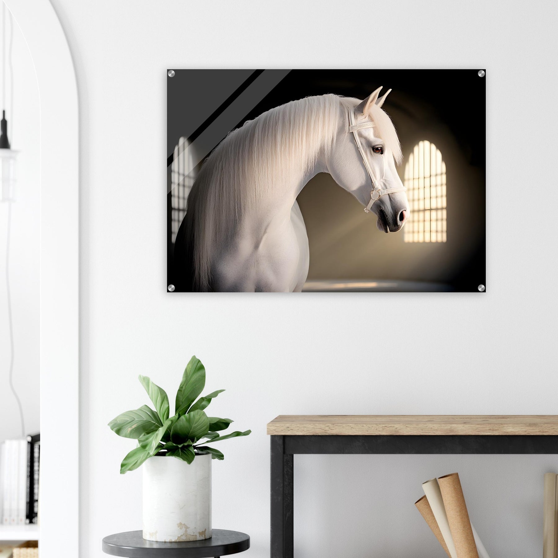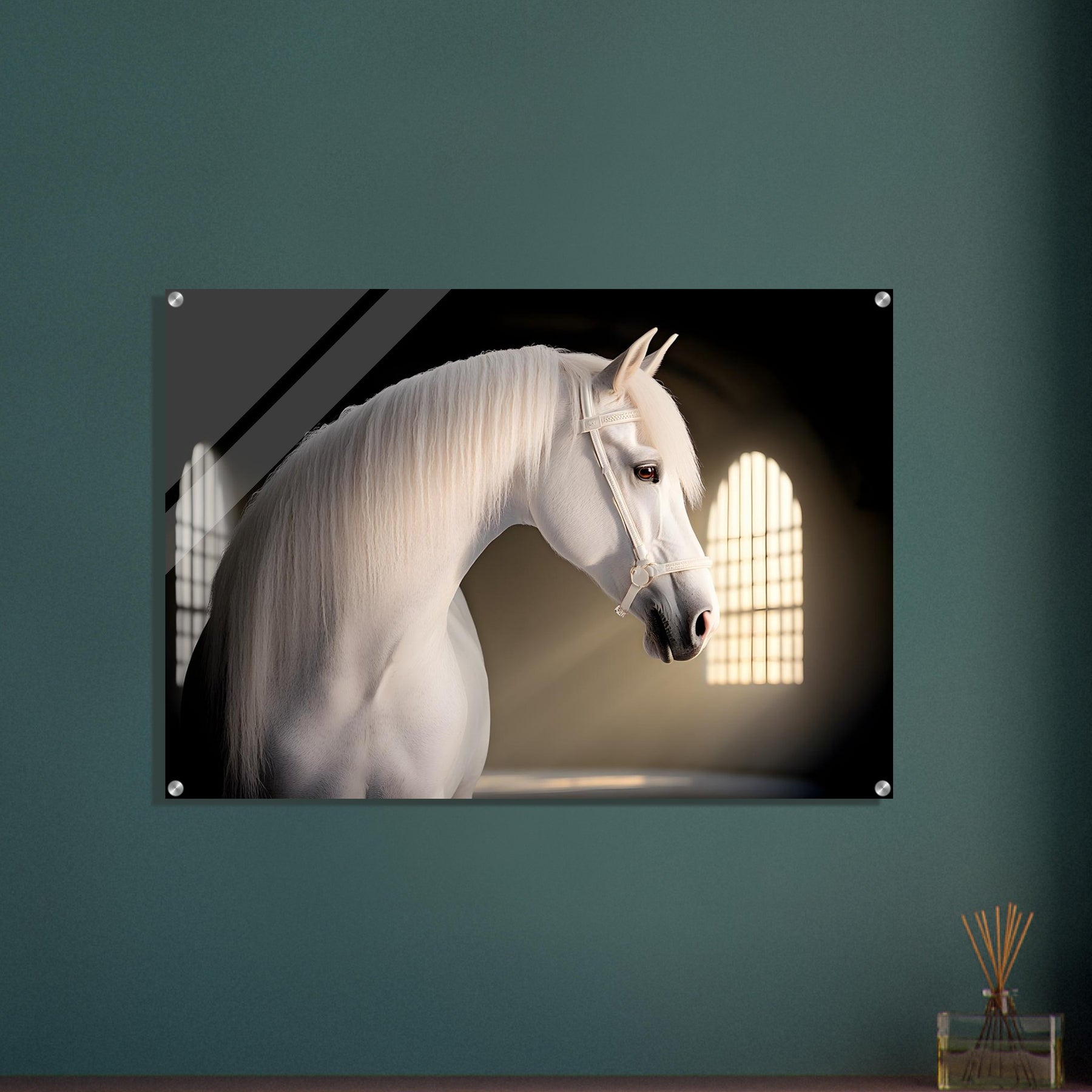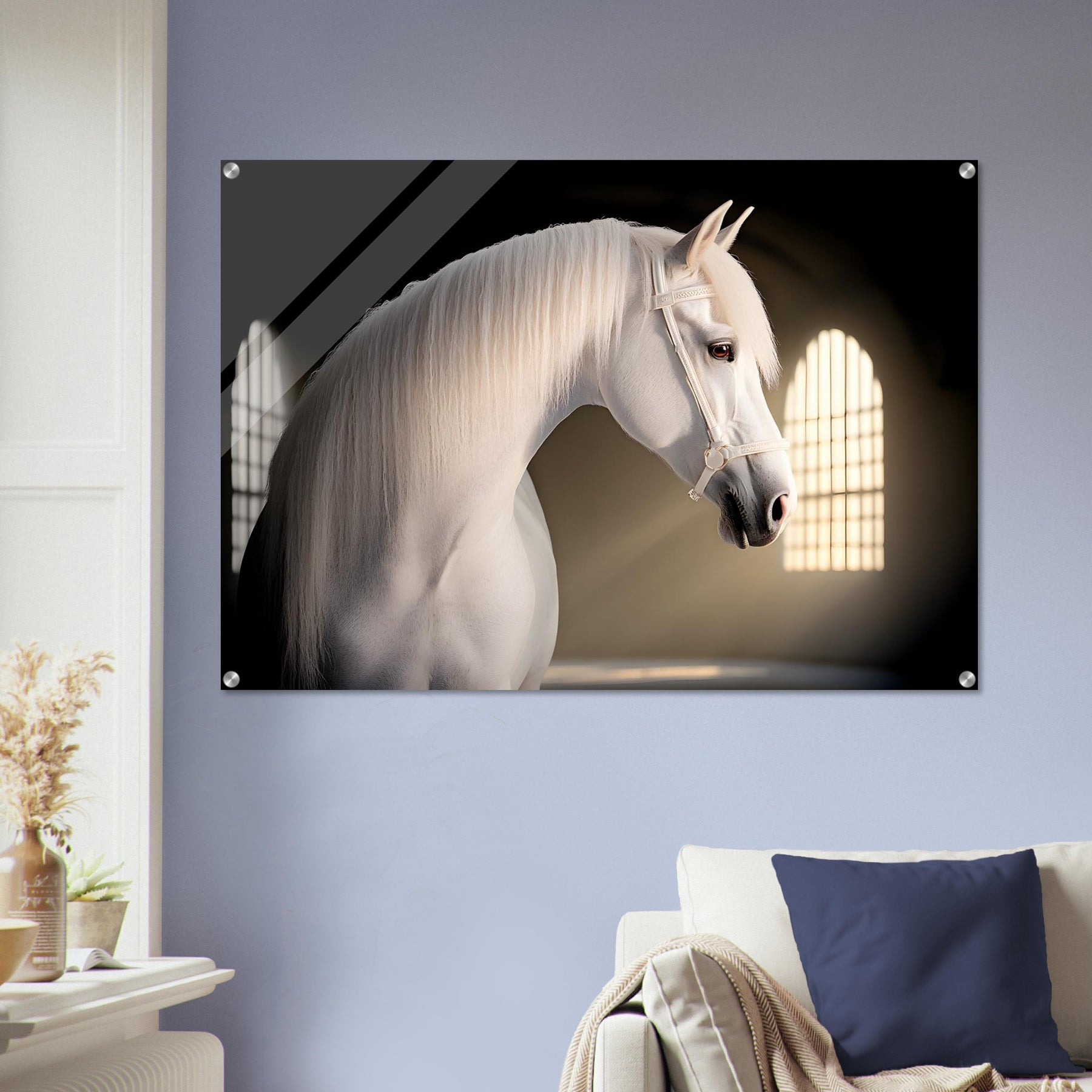 Experience brilliance and depth with our Majestic Grace Acrylic Wall Art. This captivating portrait of a white horse in glowing soft light highlights its flowing mane and powerful beauty. The glossy acrylic finish enhances the richness of tones and details, creating a striking, modern centerpiece that radiates grace and harmony.