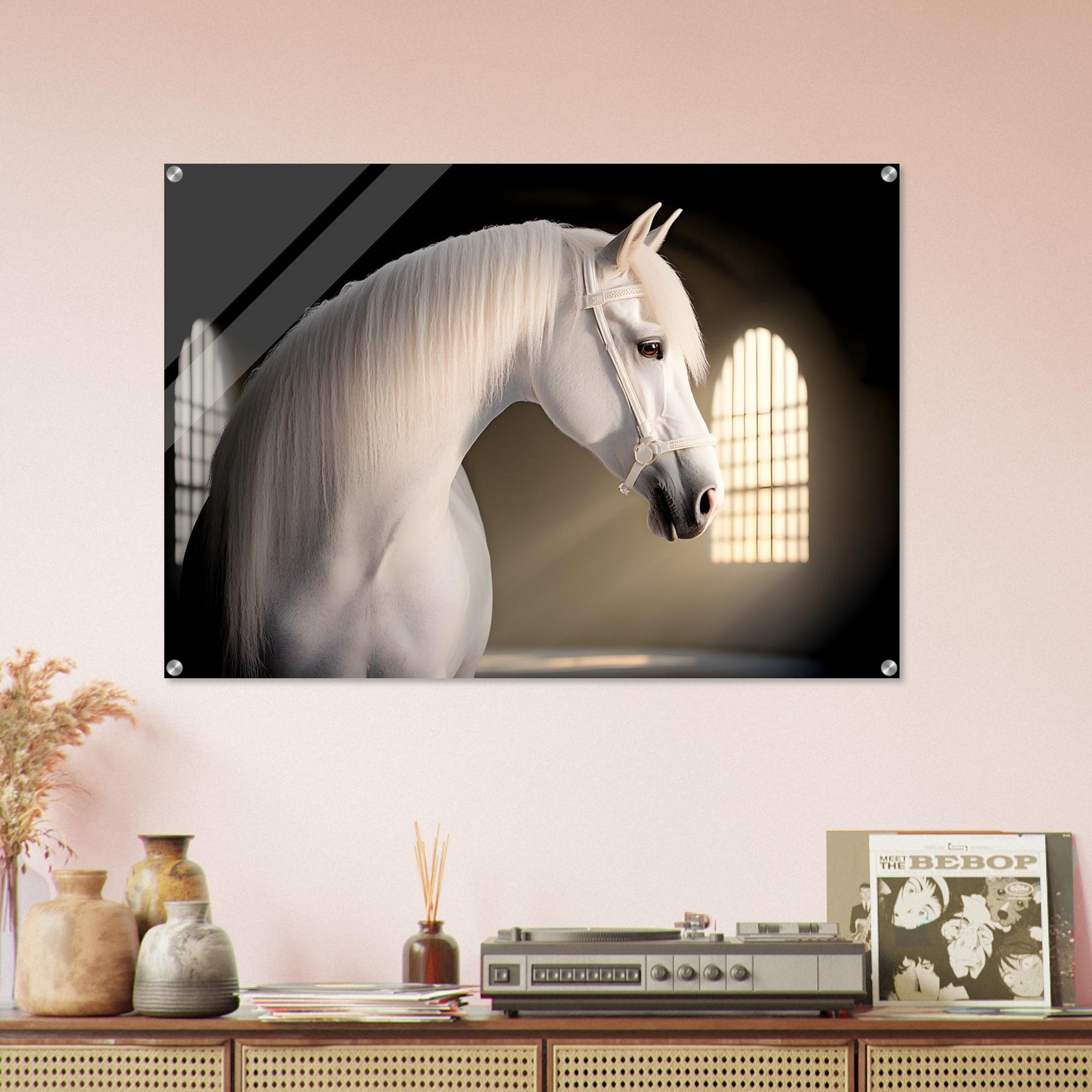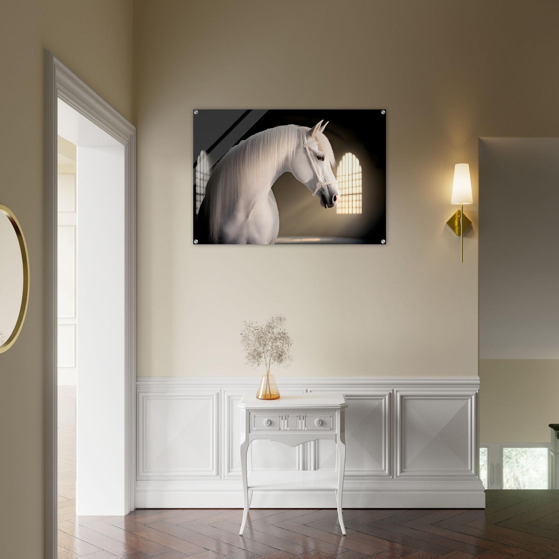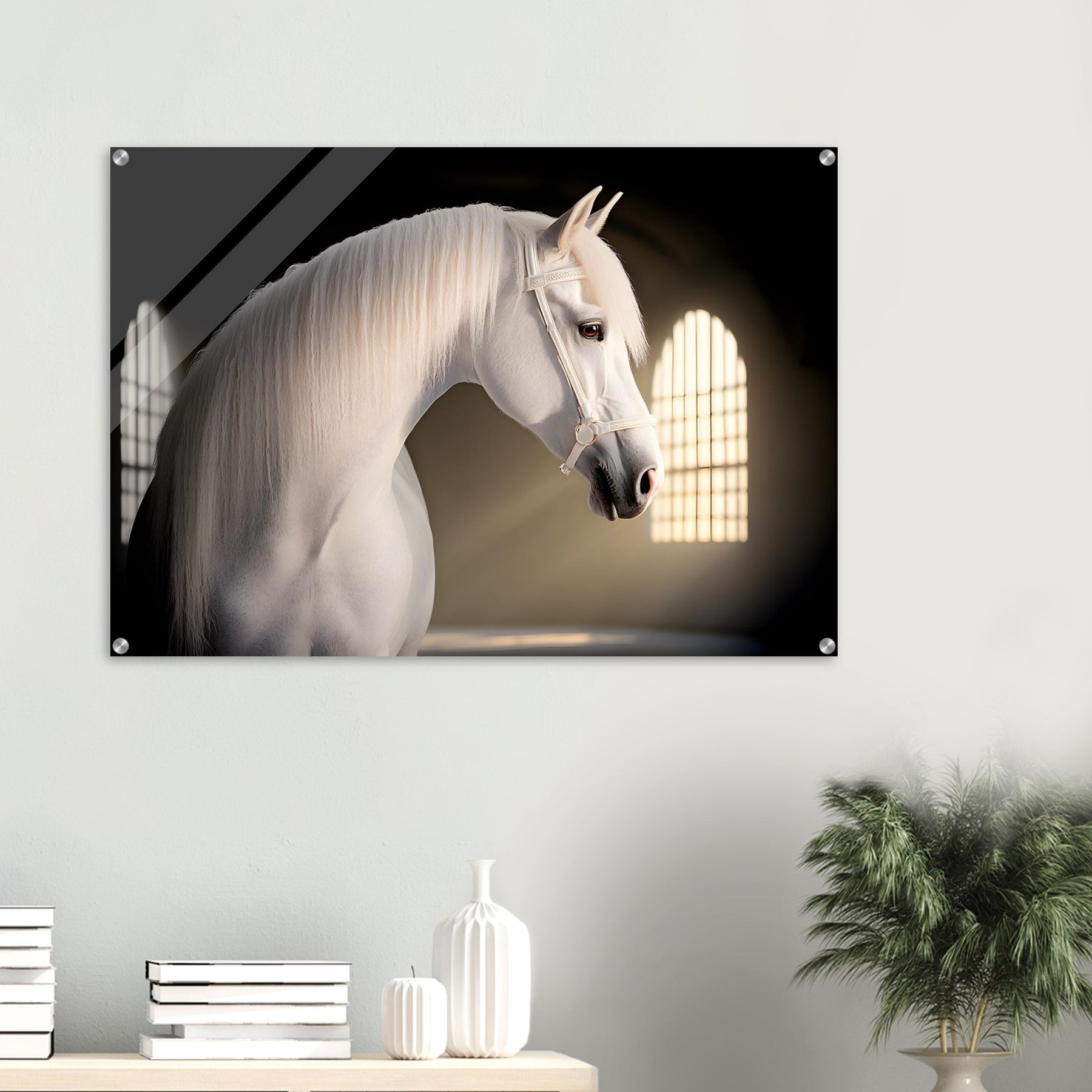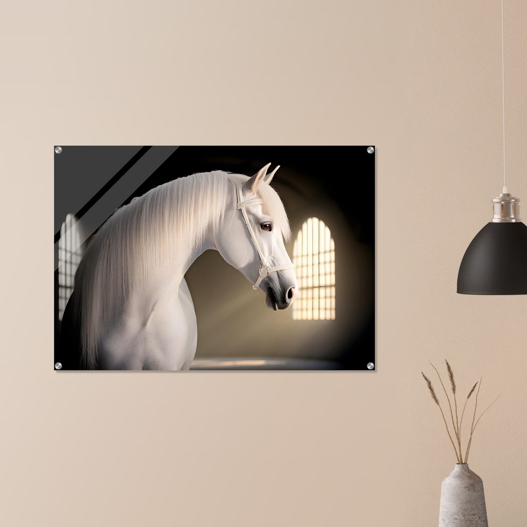 Experience brilliance and depth with our Majestic Grace Acrylic Wall Art. This captivating portrait of a white horse in glowing soft light highlights its flowing mane and powerful beauty. The glossy acrylic finish enhances the richness of tones and details, creating a striking, modern centerpiece that radiates grace and harmony.