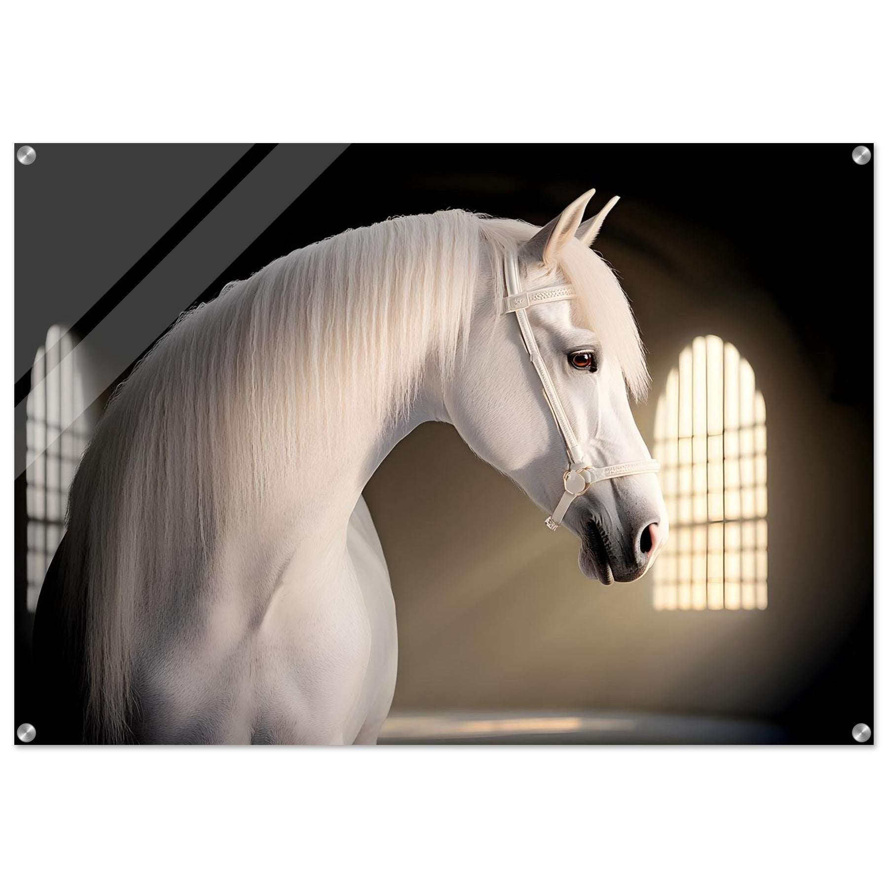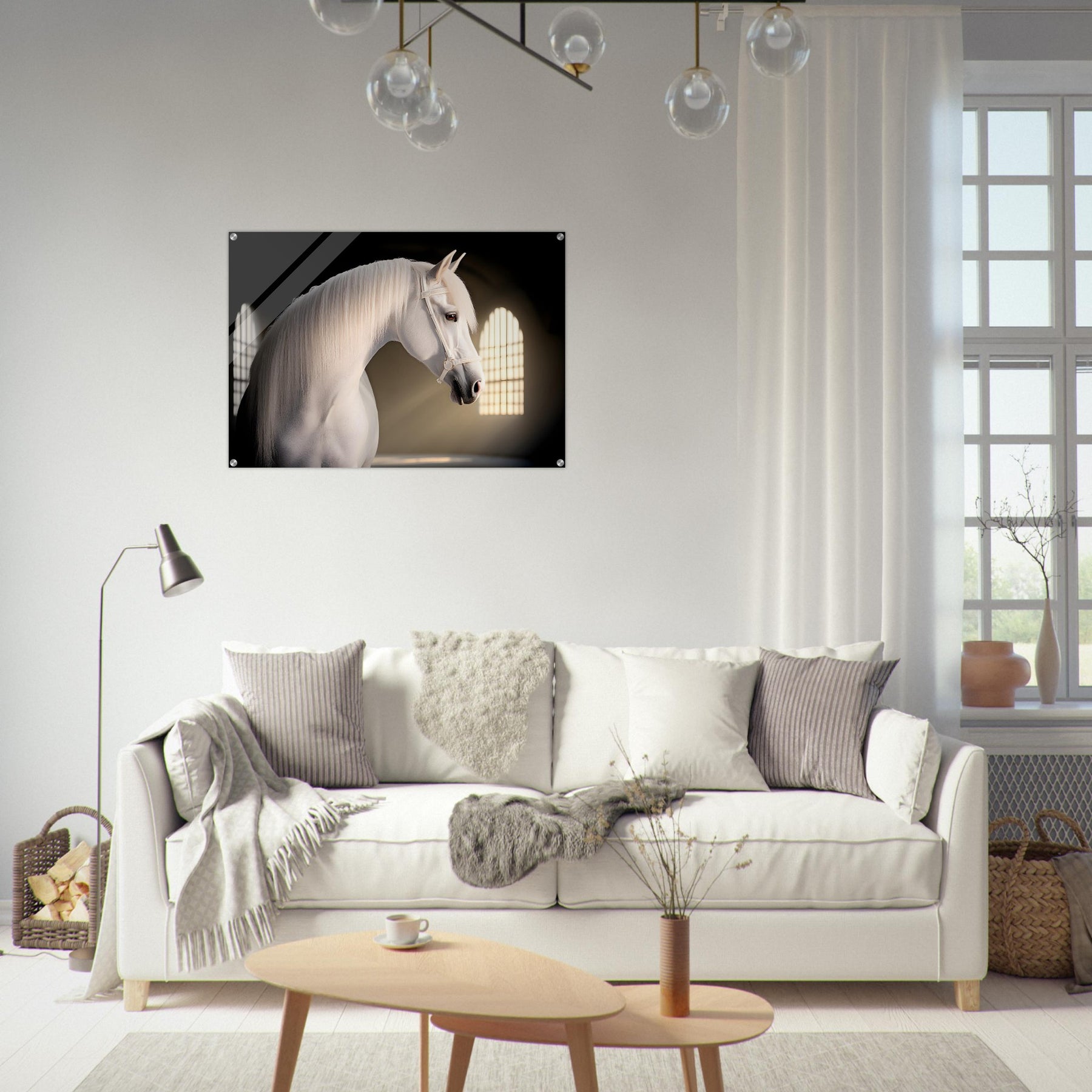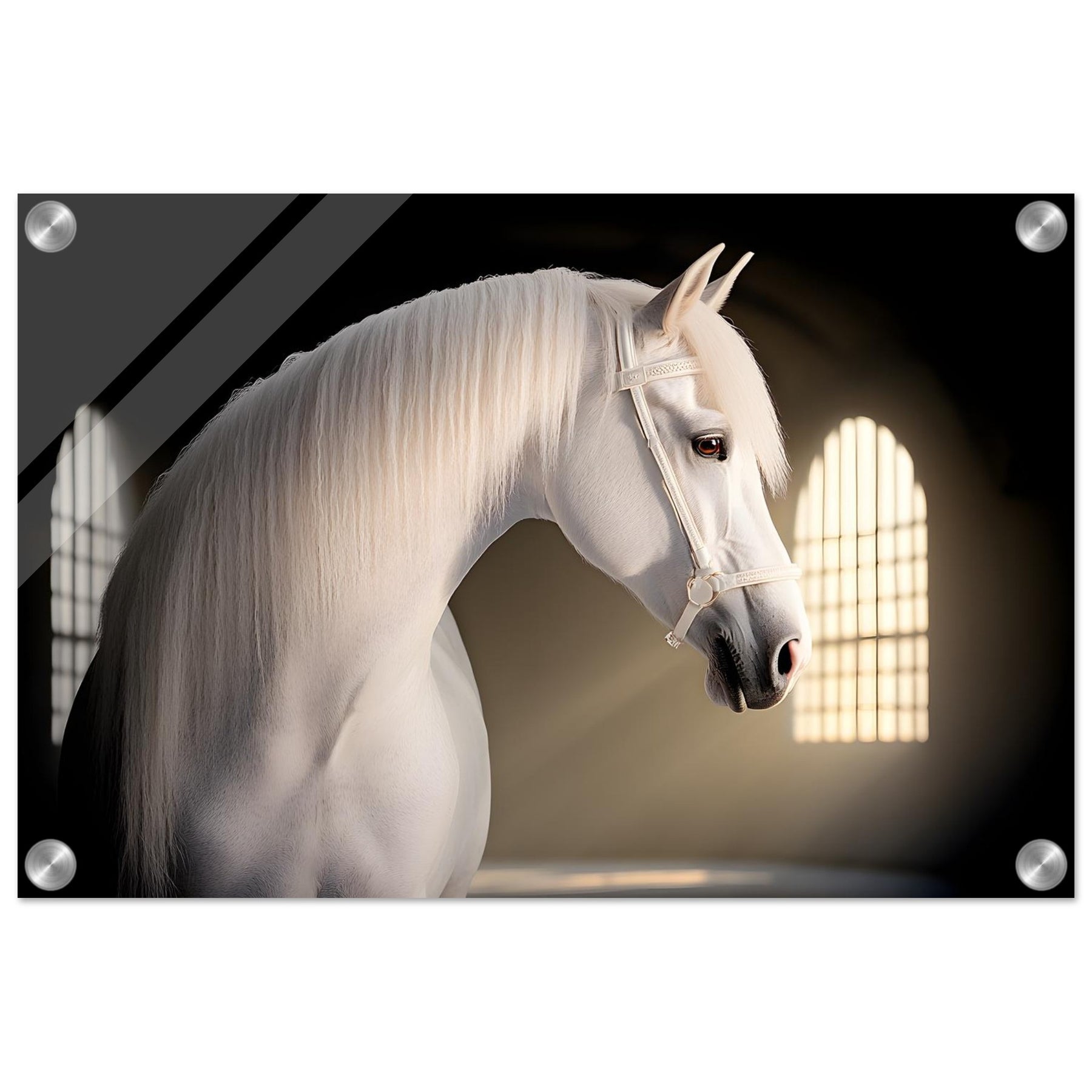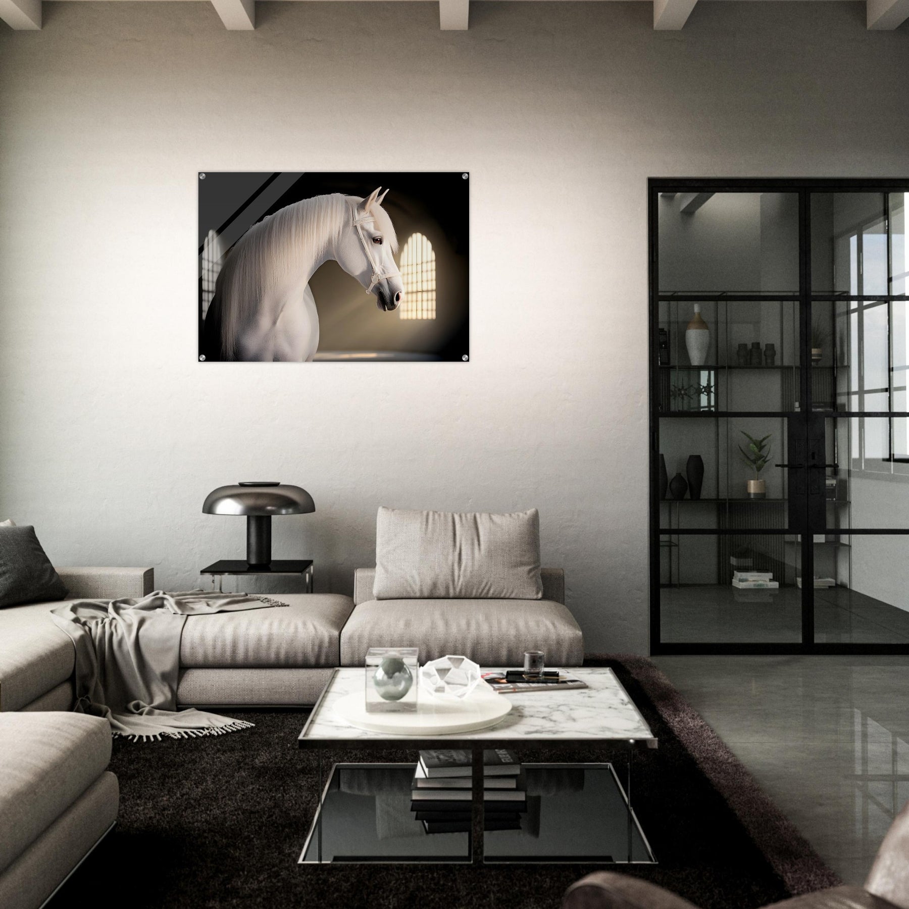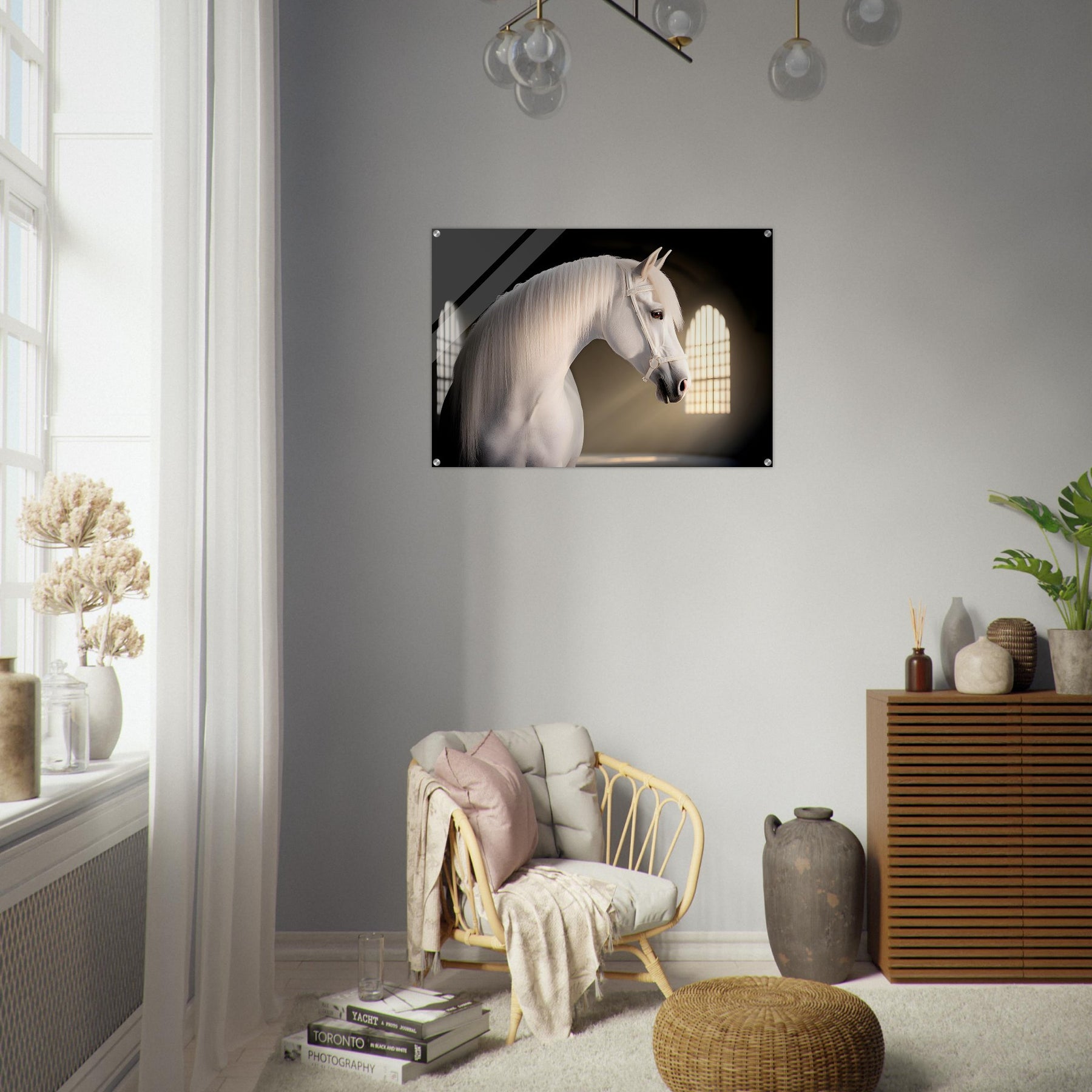 Experience brilliance and depth with our Majestic Grace Acrylic Wall Art. This captivating portrait of a white horse in glowing soft light highlights its flowing mane and powerful beauty. The glossy acrylic finish enhances the richness of tones and details, creating a striking, modern centerpiece that radiates grace and harmony.