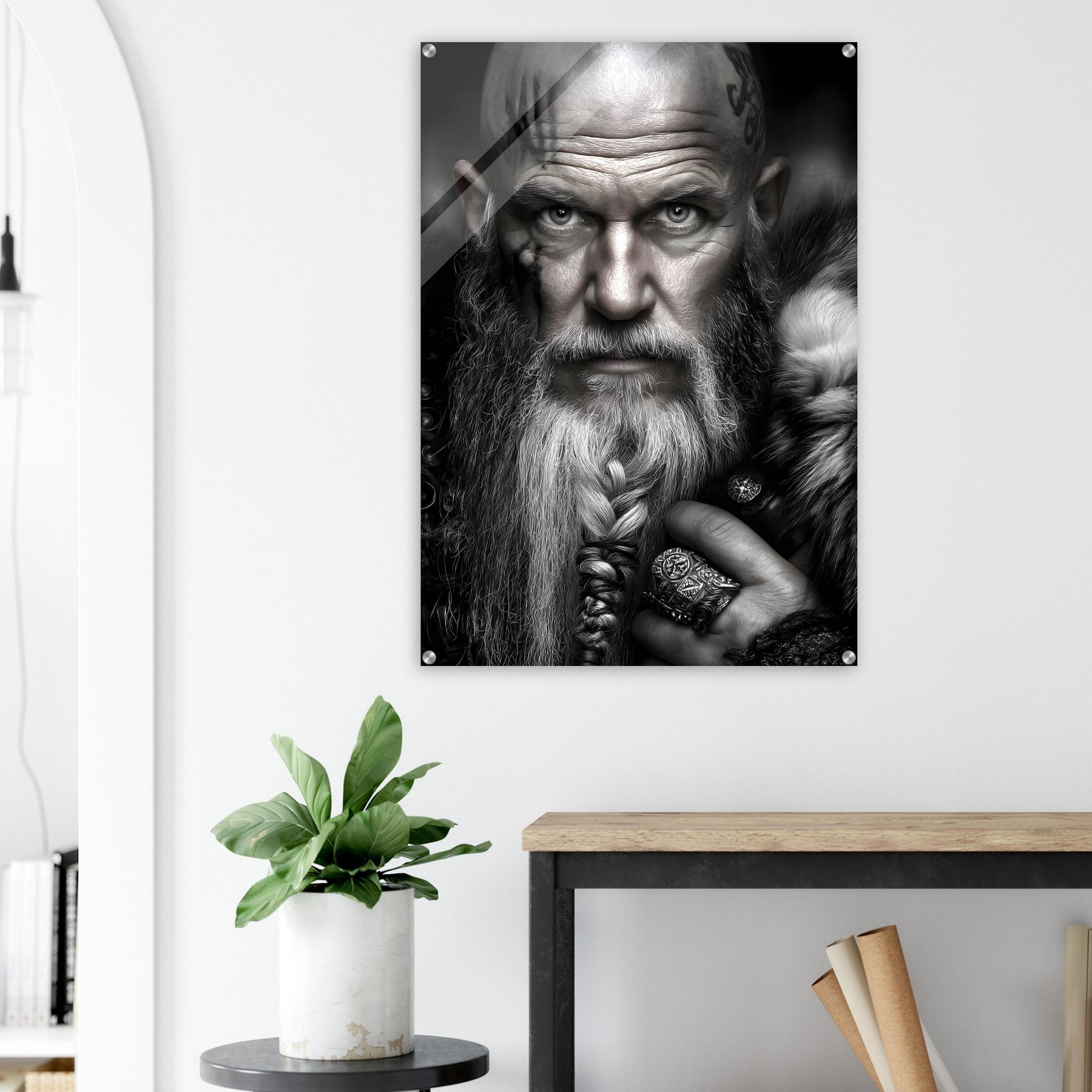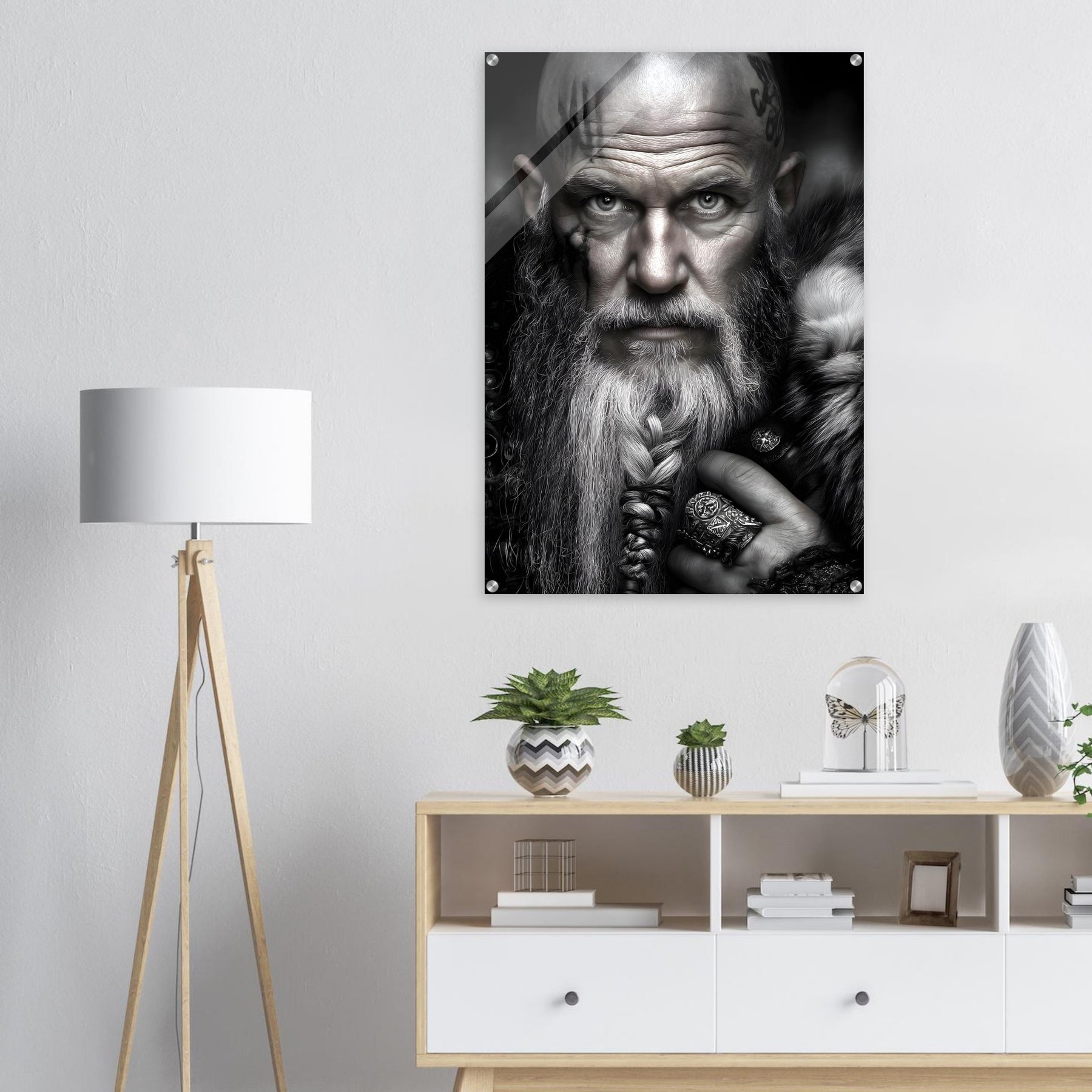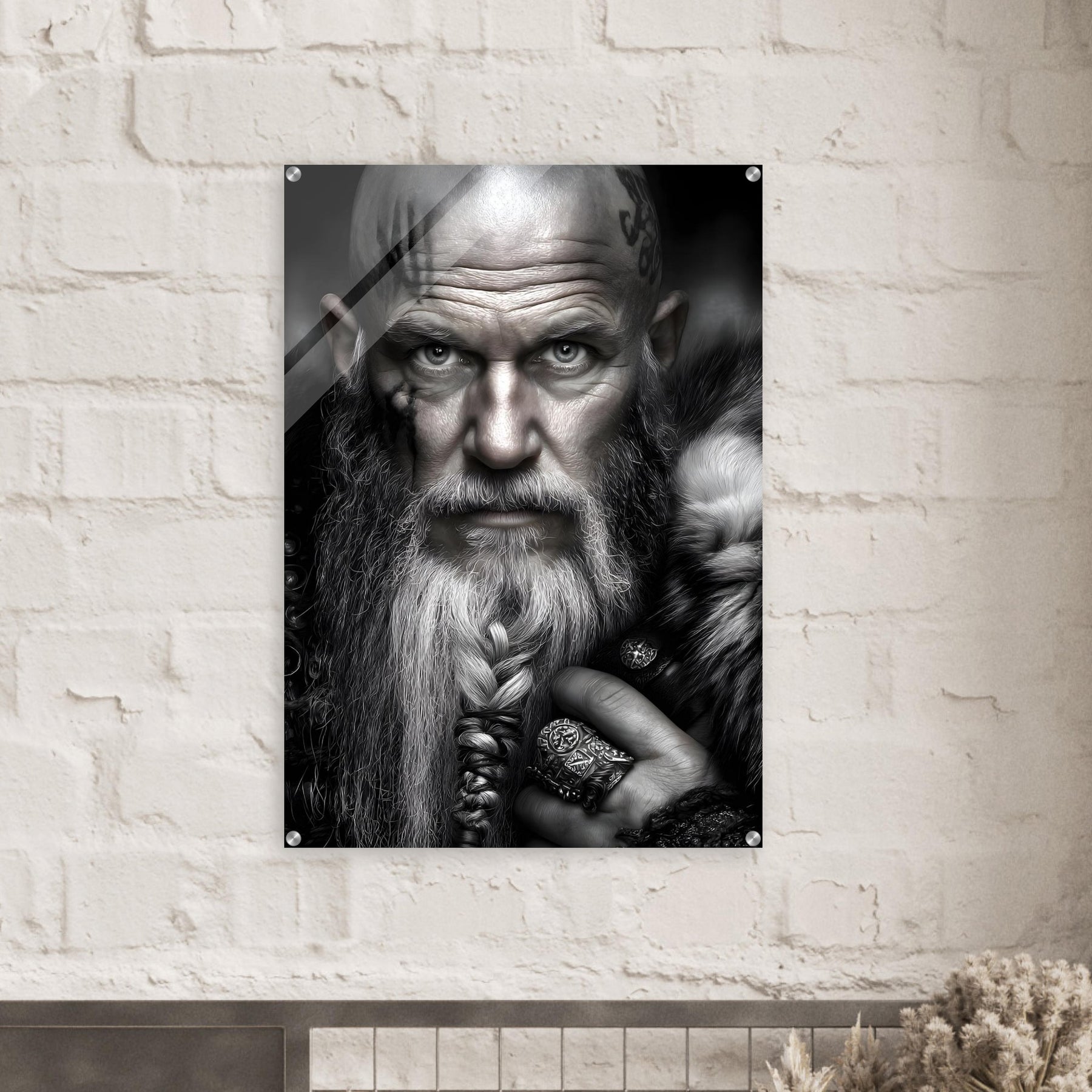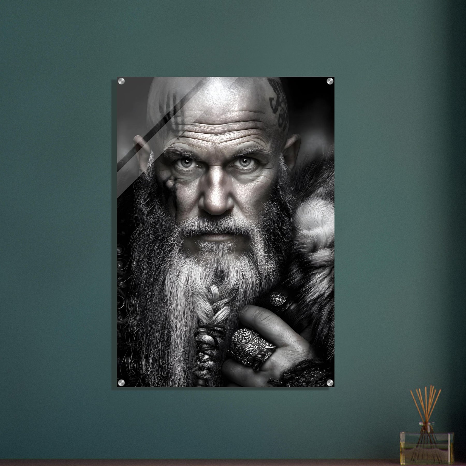 Experience striking depth and detail with our Monochrome Warrior Acrylic Art. This dramatic portrait of a rugged warrior with a beard, tattoos, and a strong gaze comes to life through the glossy acrylic finish. The monochrome style enhances the raw intensity, making this piece a bold centerpiece for any room.