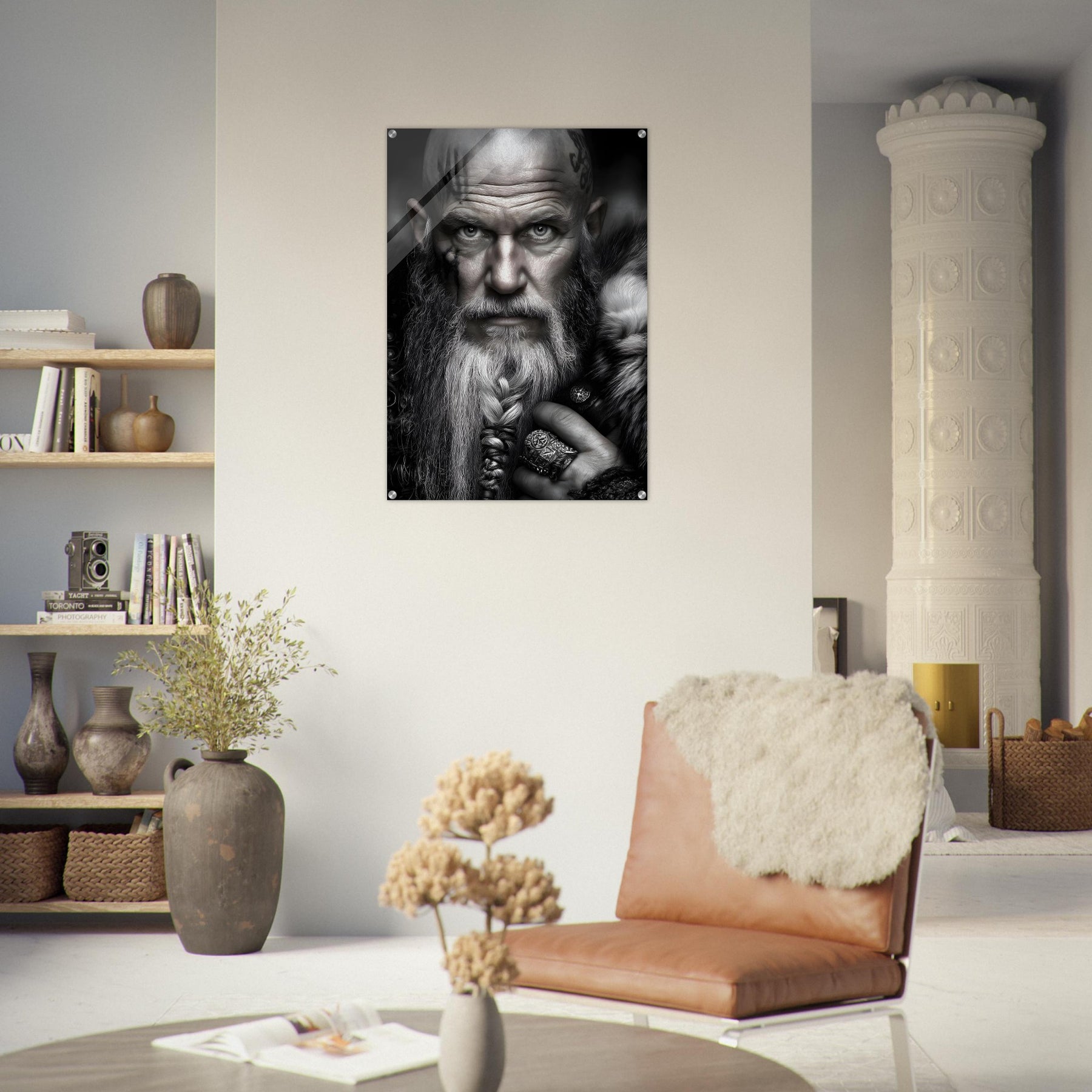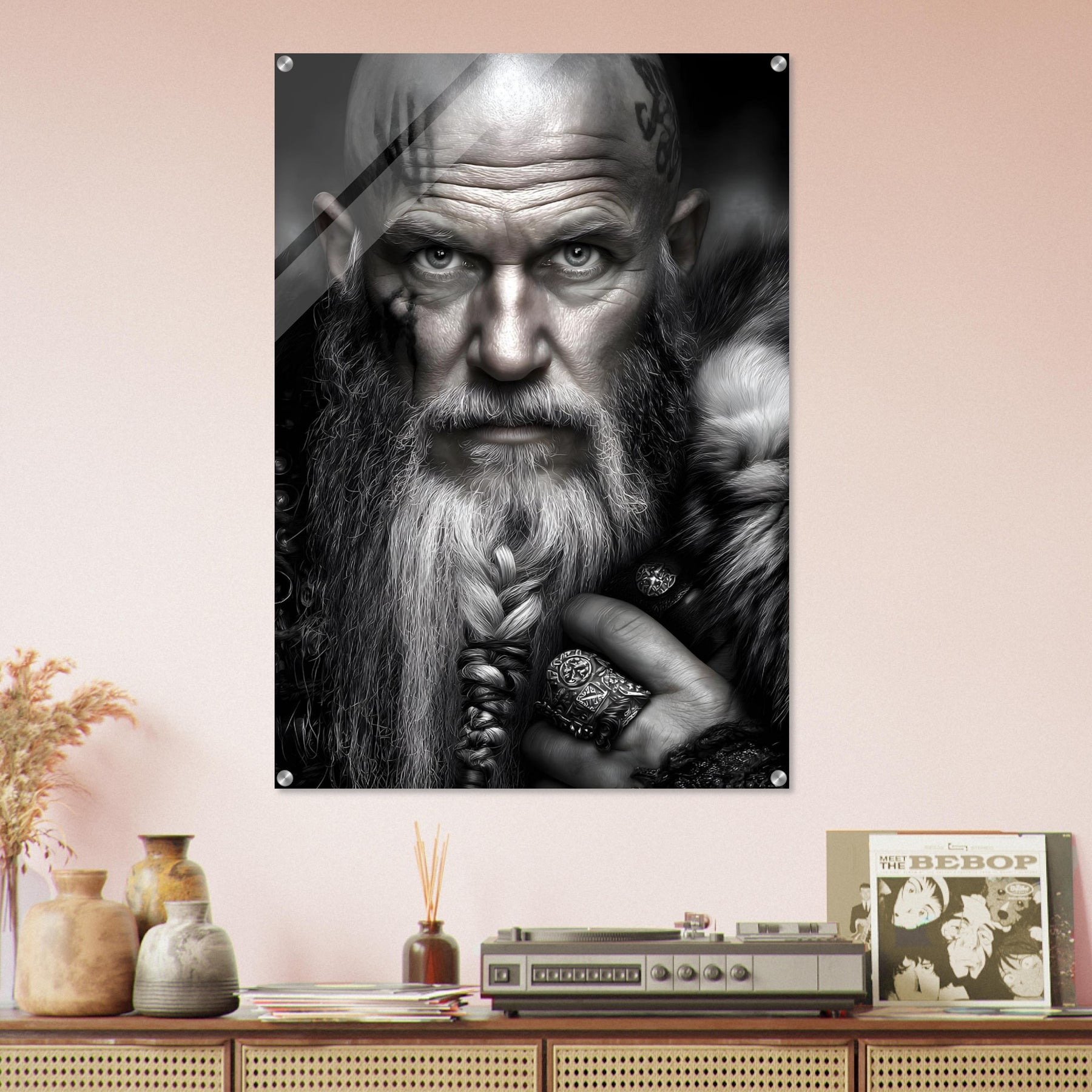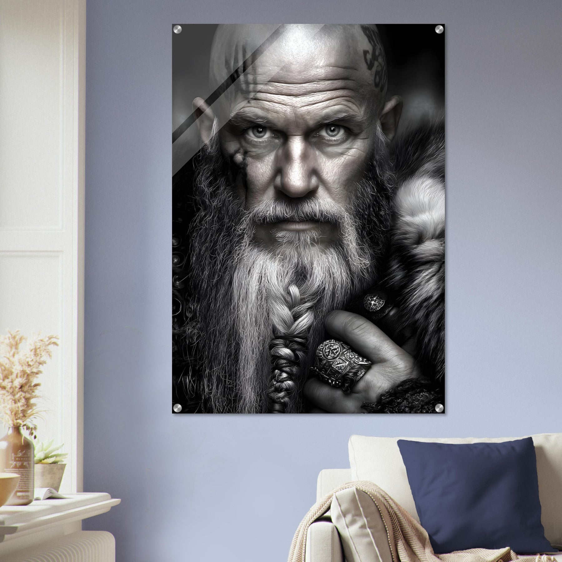 Experience striking depth and detail with our Monochrome Warrior Acrylic Art. This dramatic portrait of a rugged warrior with a beard, tattoos, and a strong gaze comes to life through the glossy acrylic finish. The monochrome style enhances the raw intensity, making this piece a bold centerpiece for any room.