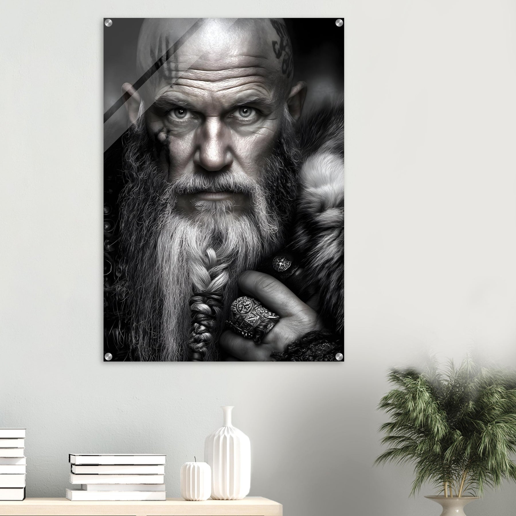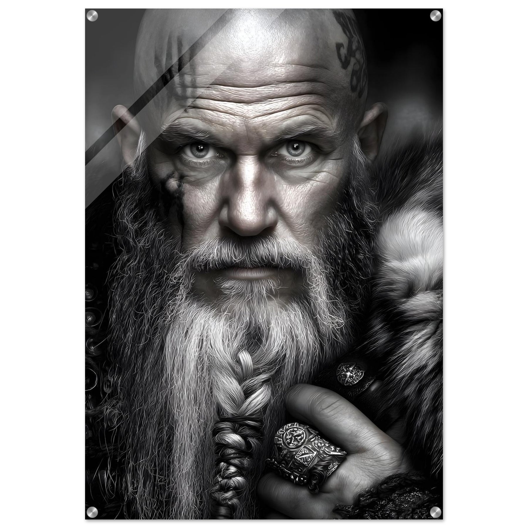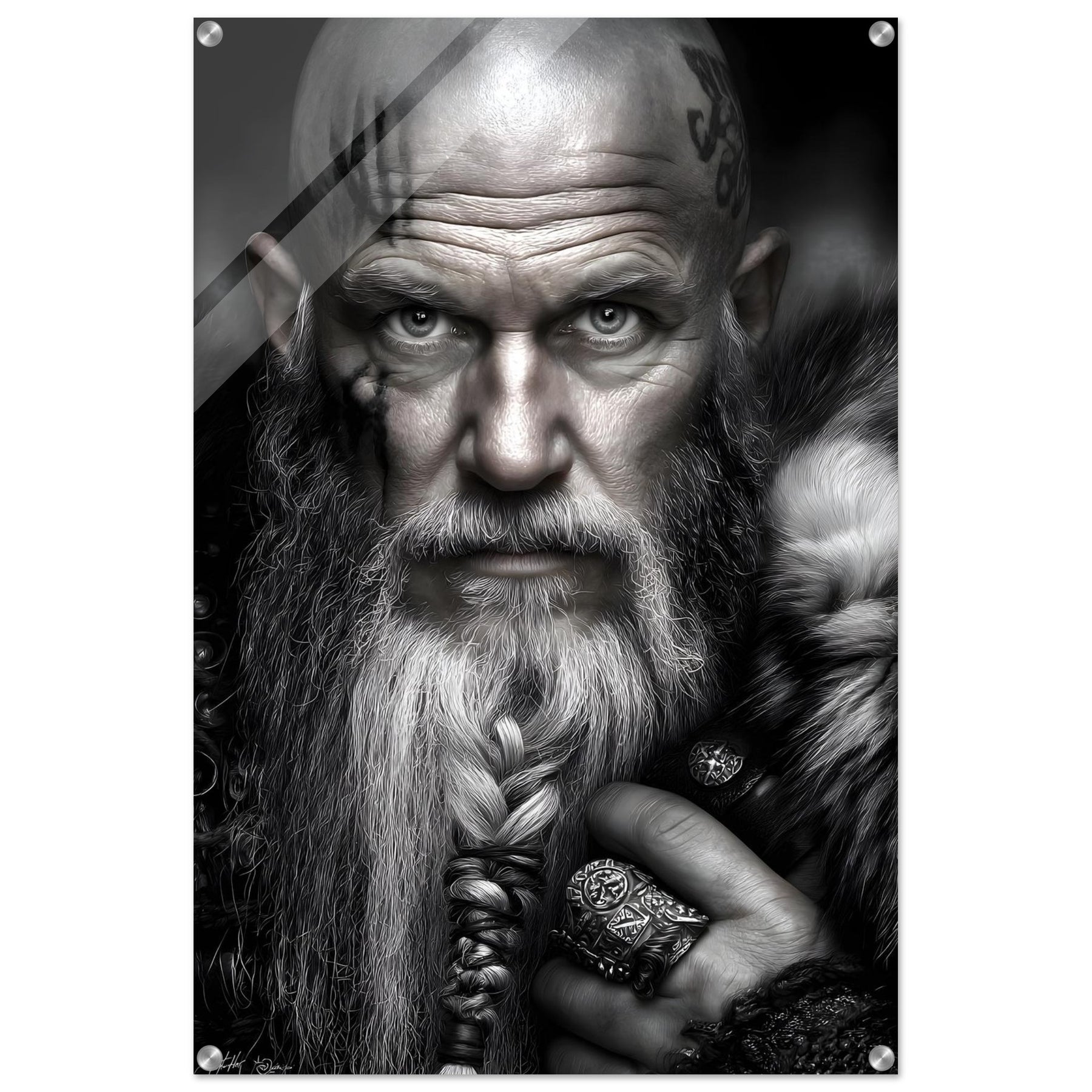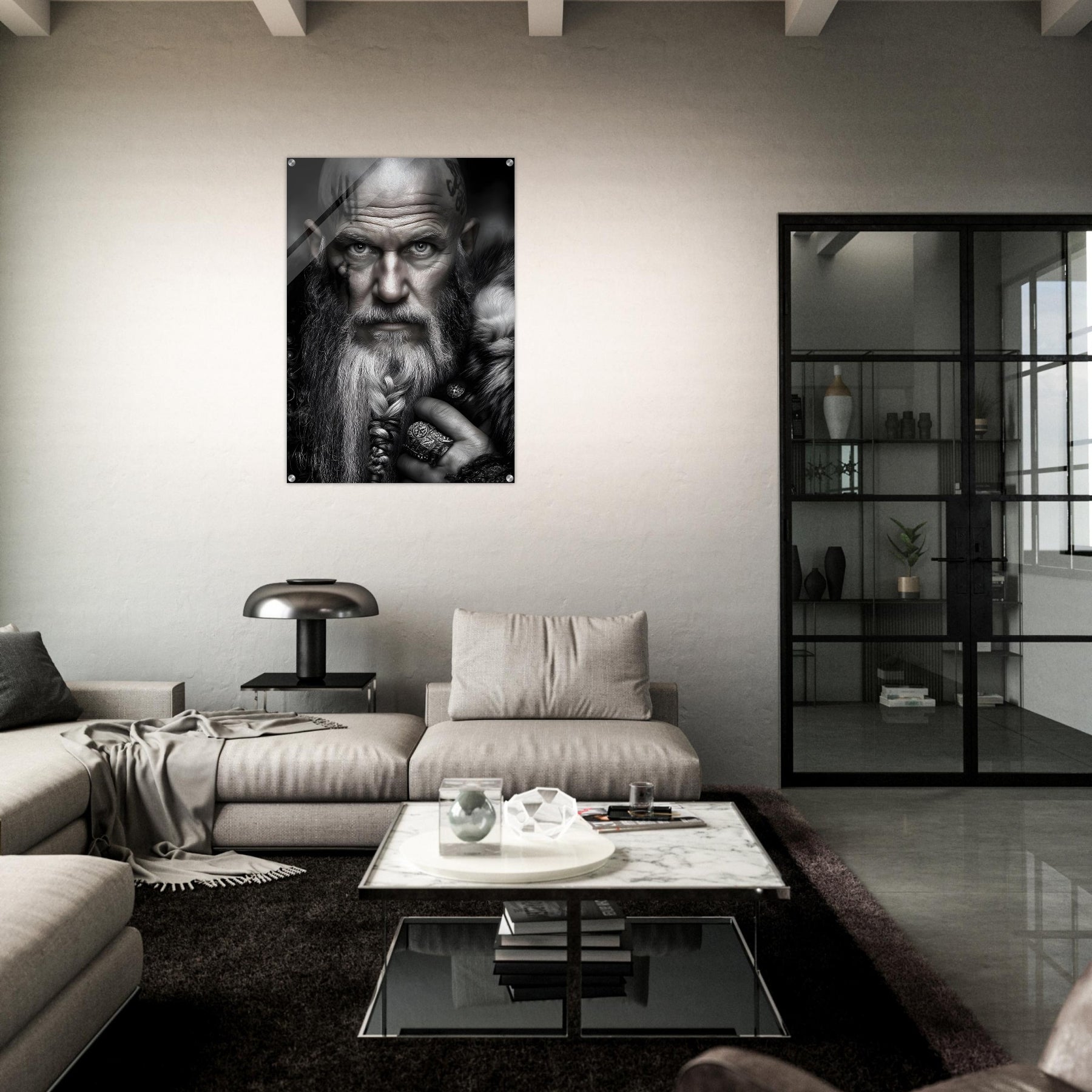Experience striking depth and detail with our Monochrome Warrior Acrylic Art. This dramatic portrait of a rugged warrior with a beard, tattoos, and a strong gaze comes to life through the glossy acrylic finish. The monochrome style enhances the raw intensity, making this piece a bold centerpiece for any room.