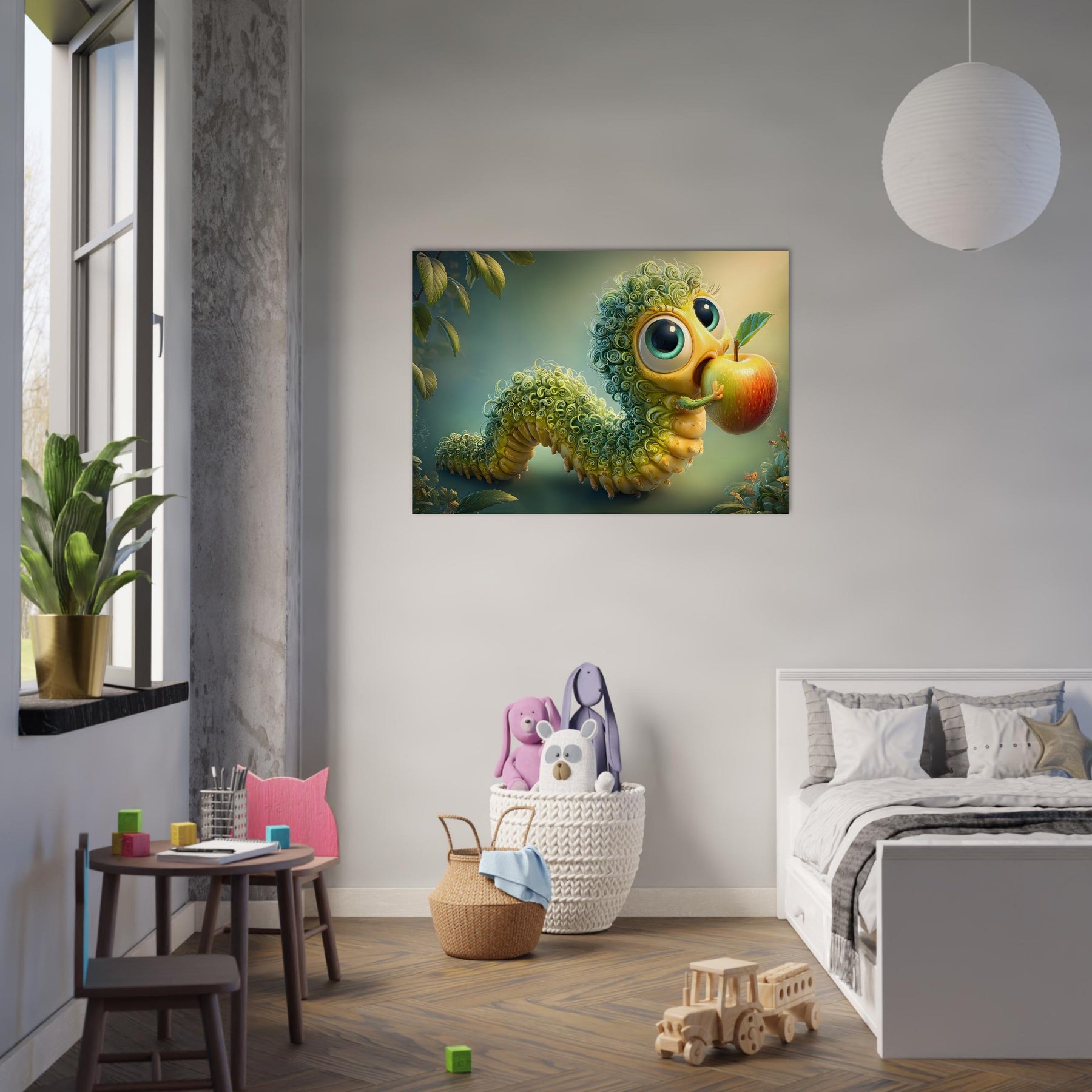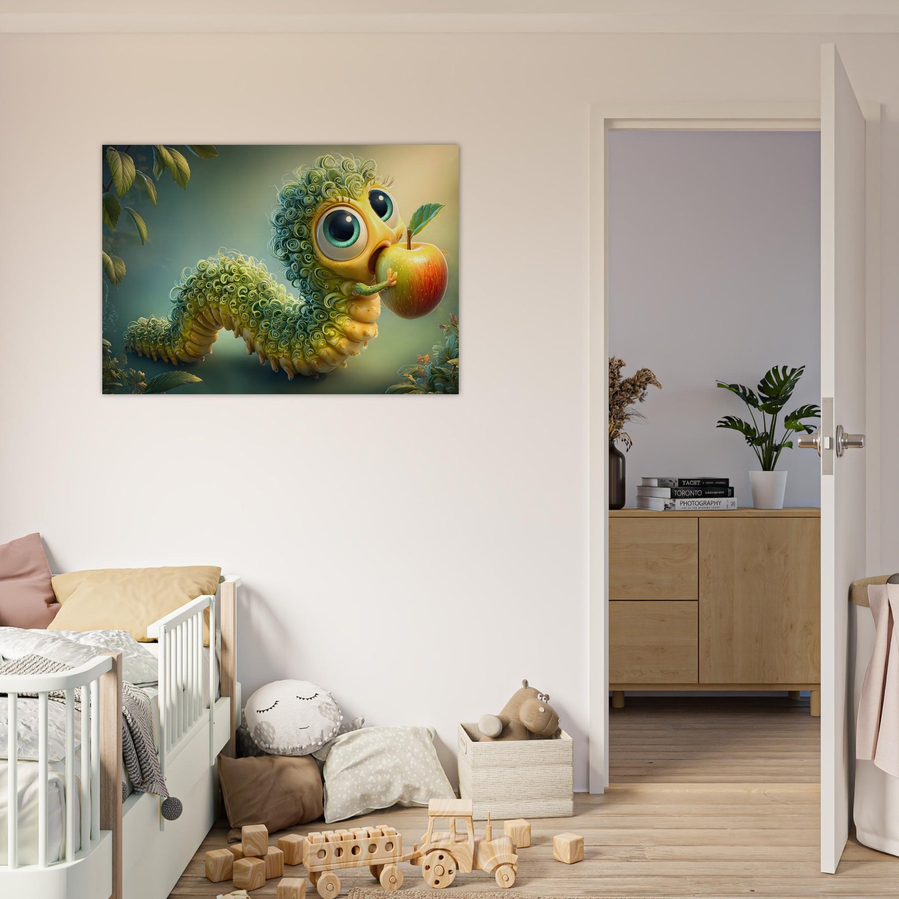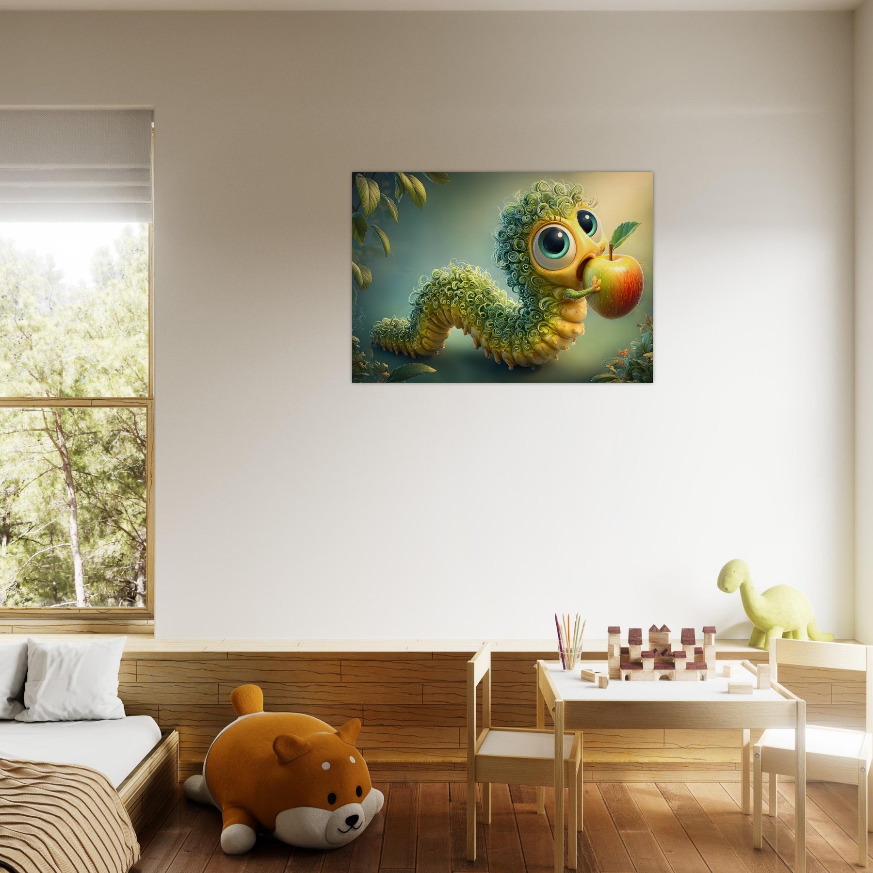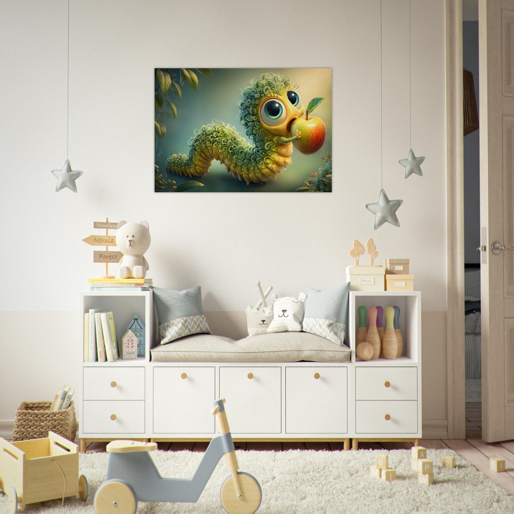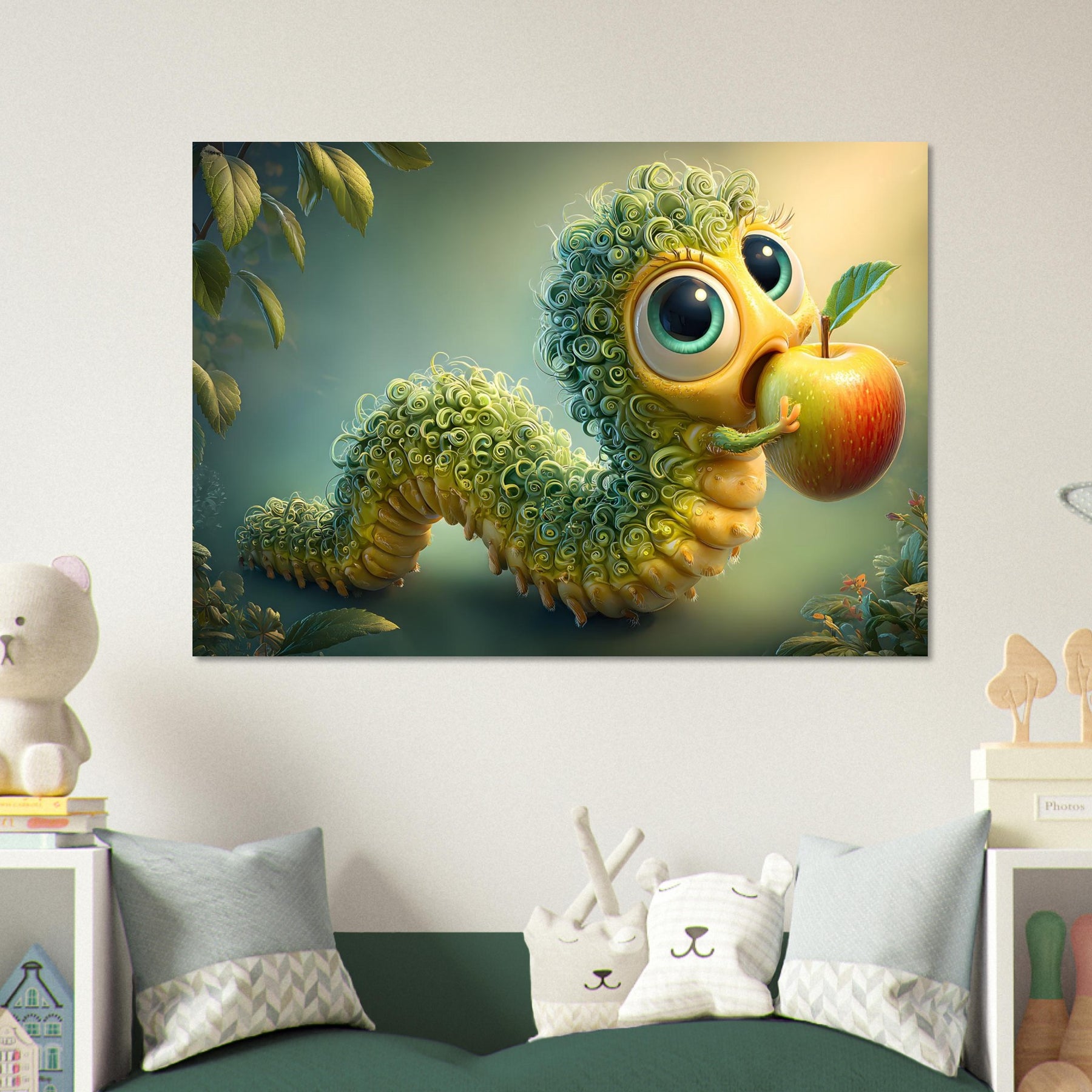 Brighten your child’s room with the cheerful charm of the Apple Delight Aluminum Wall Art. This adorable illustration features a curly green caterpillar joyfully holding a shiny red apple, capturing the beauty of nature’s bounty and the pure joy of playfulness. Bursting with color and character, it brings a fresh, happy energy to any space.