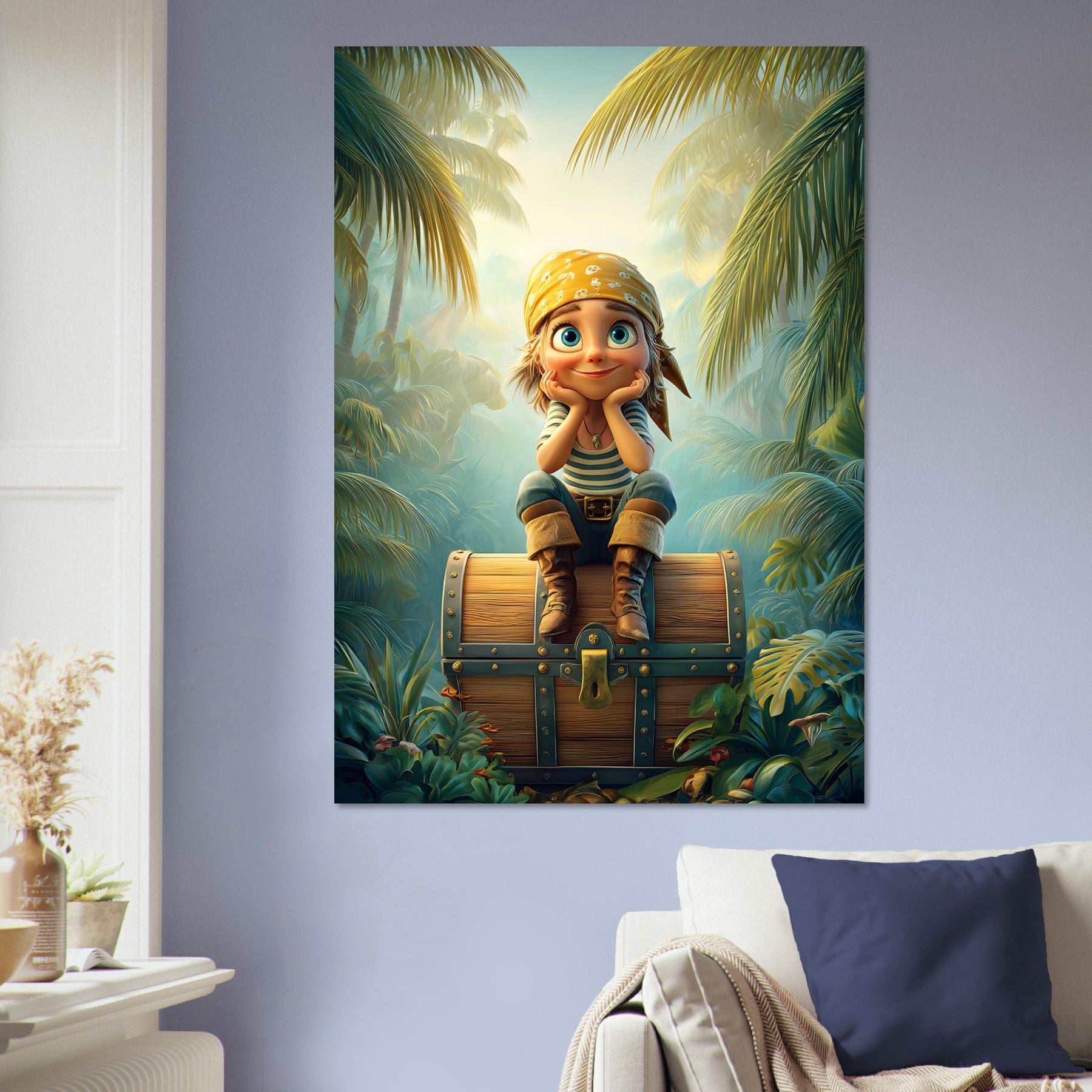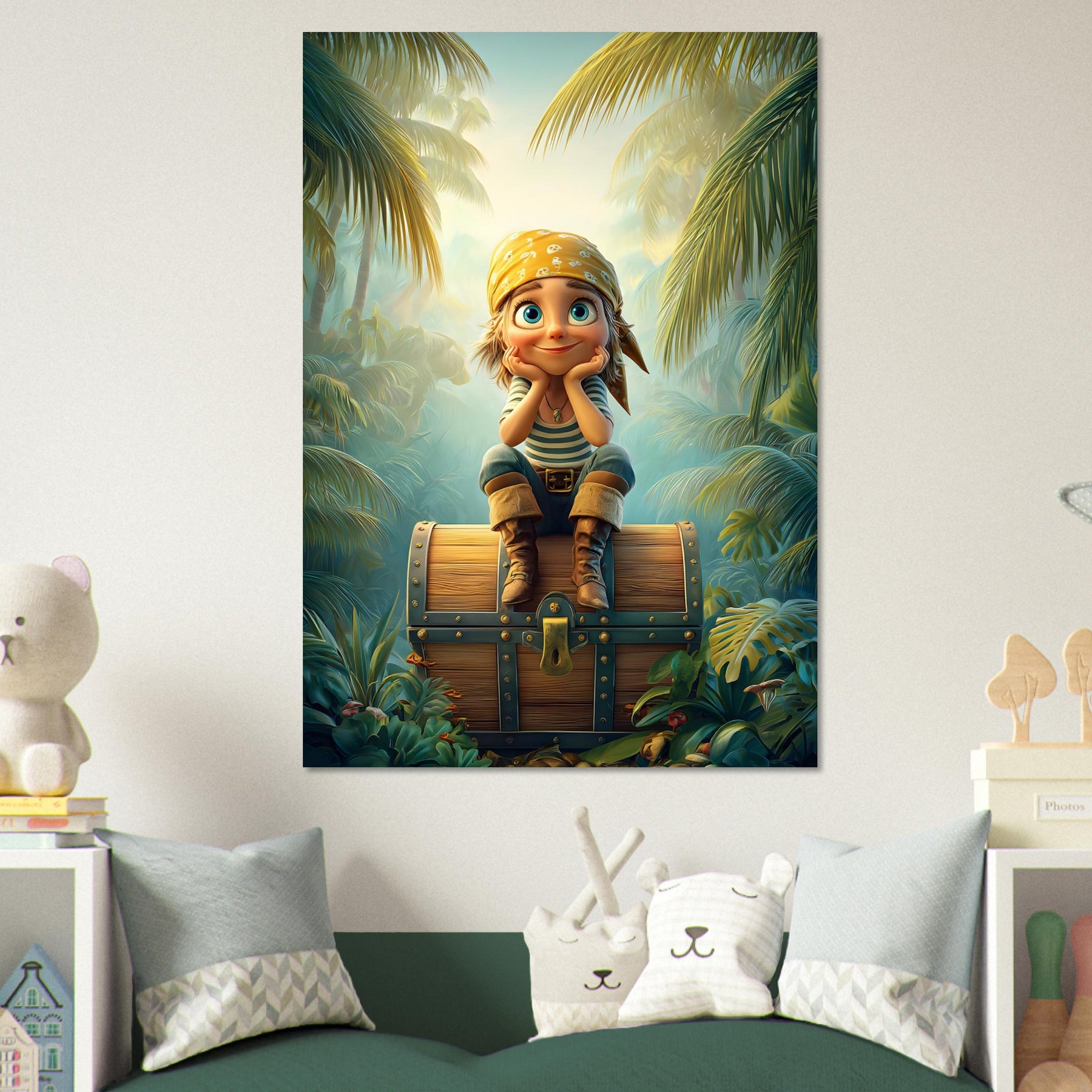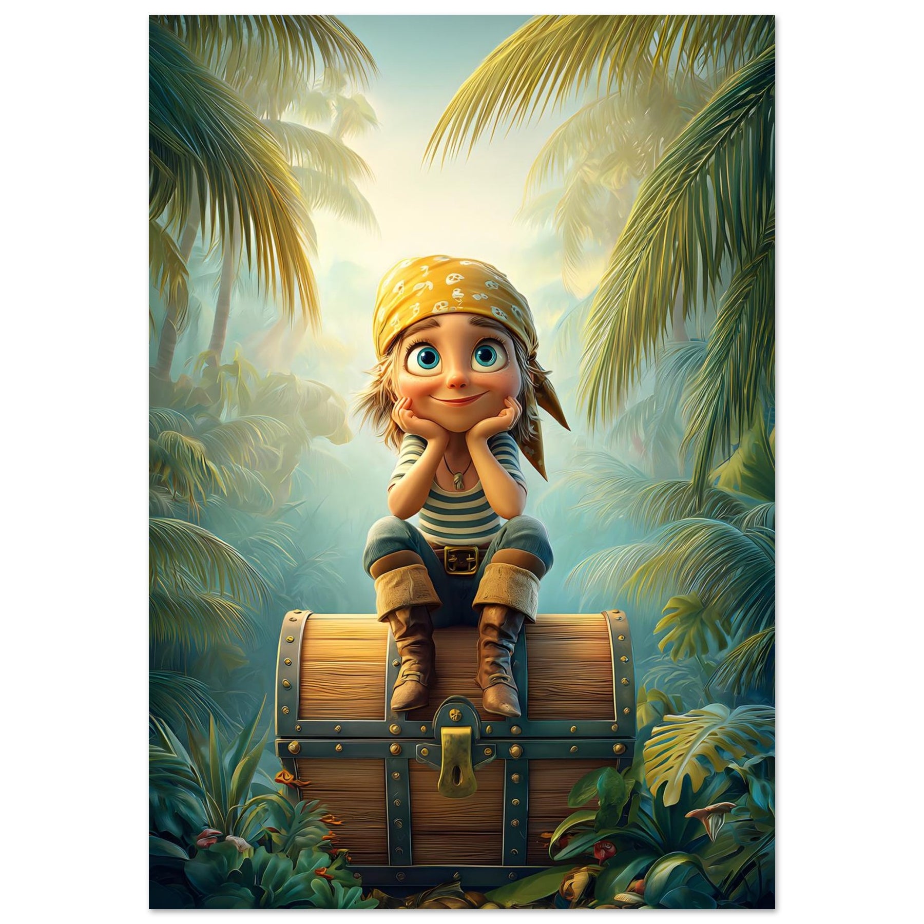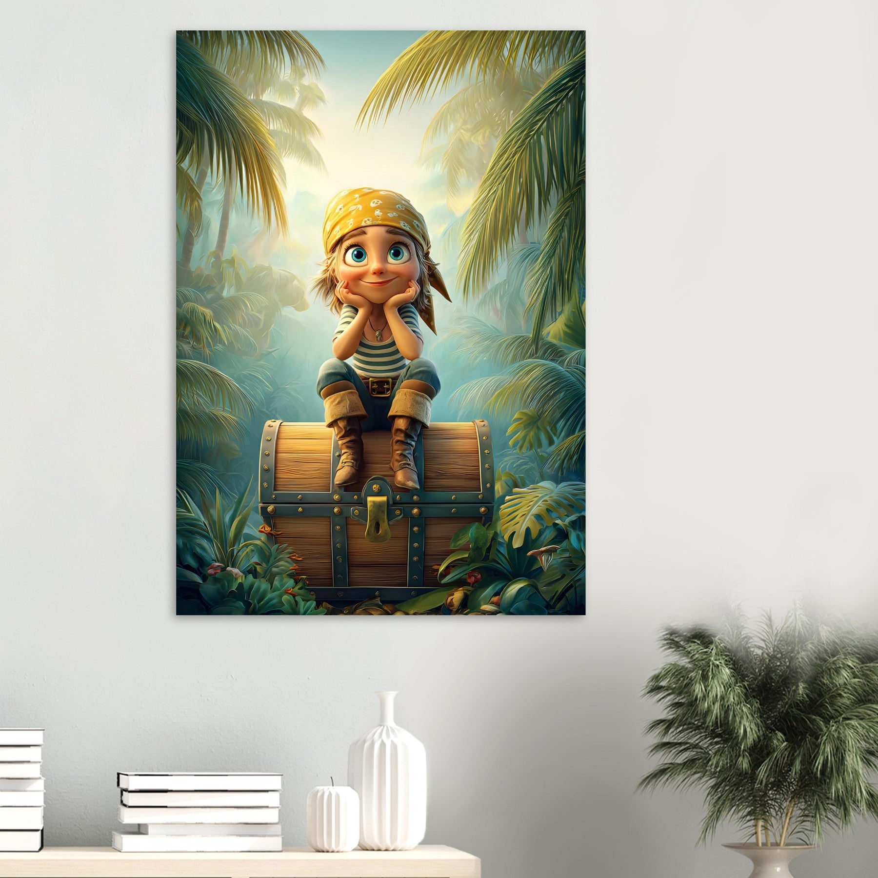 Ignite your child’s imagination with the Jungle Explorer Aluminum Wall Art. This captivating piece features a young adventurer with sparkling eyes sitting atop a treasure chest, surrounded by the lush beauty of a tropical jungle. Bursting with color, mystery, and playful energy, it perfectly captures the magic of discovery and the wonder of exploration.