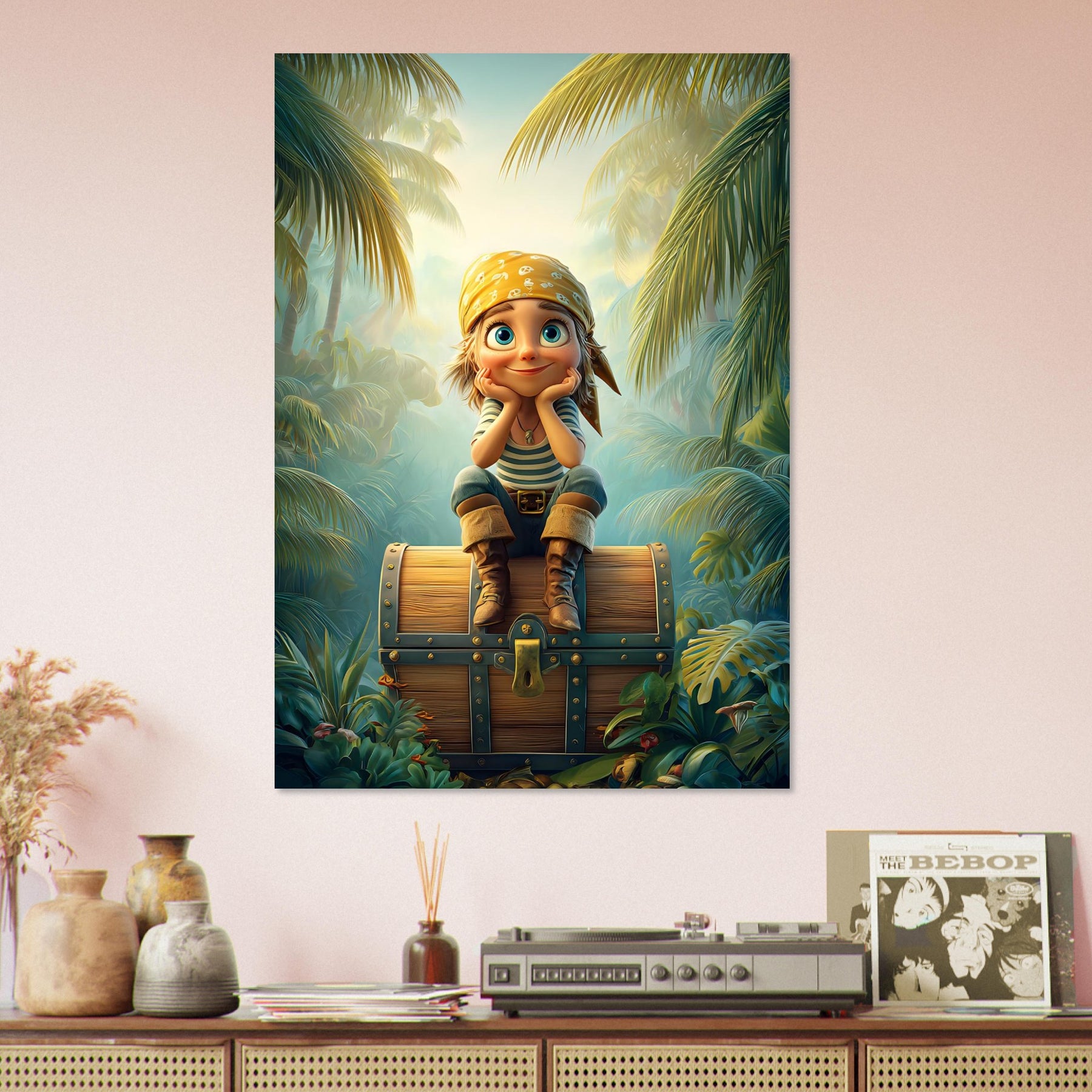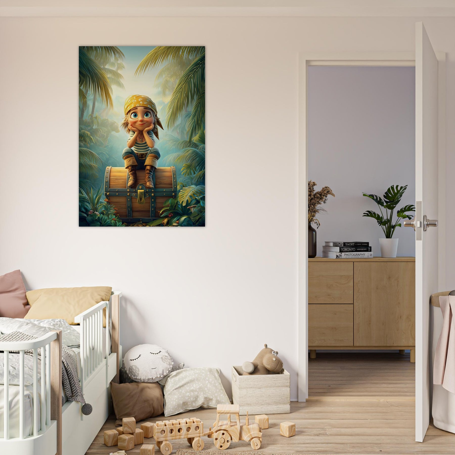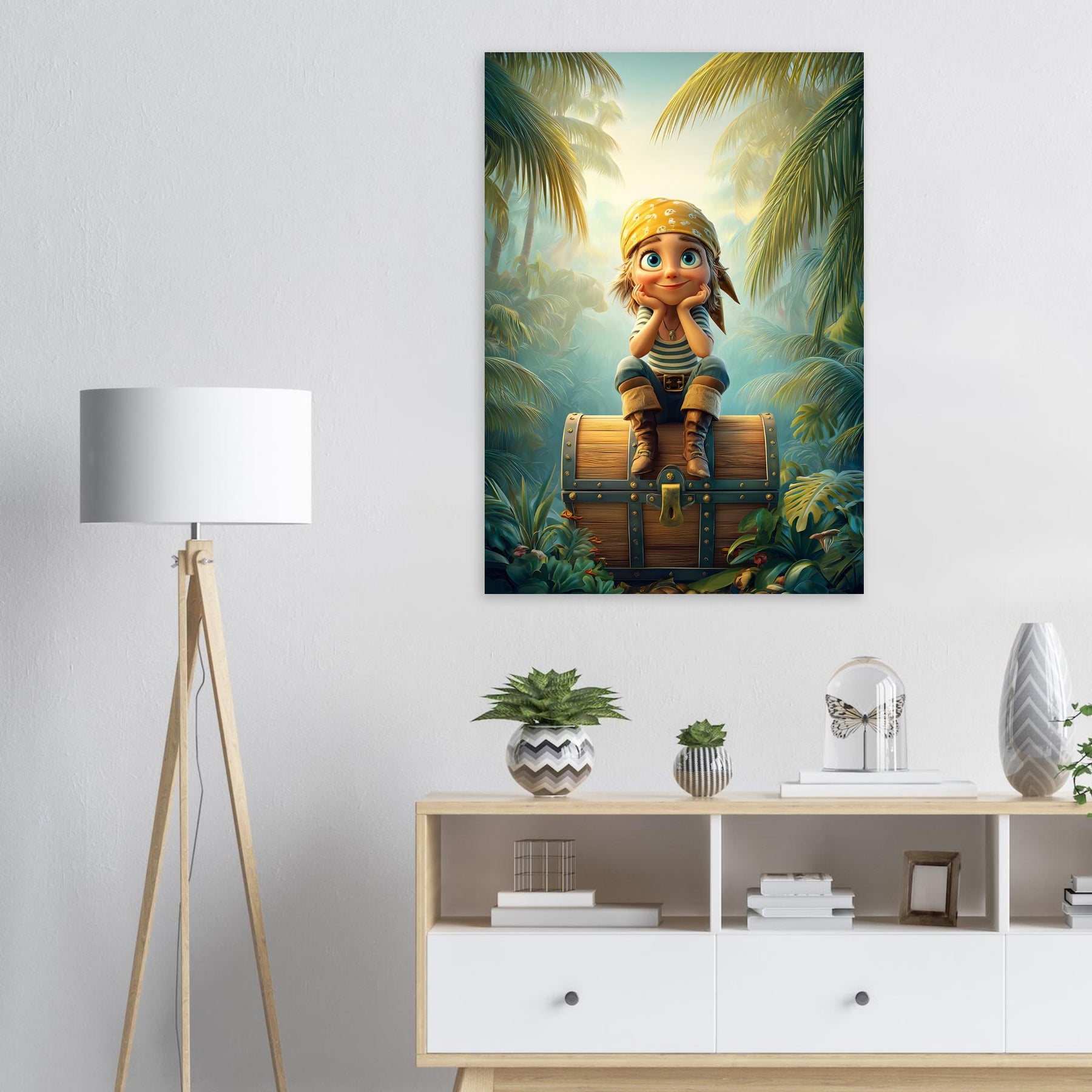 Ignite your child’s imagination with the Jungle Explorer Aluminum Wall Art. This captivating piece features a young adventurer with sparkling eyes sitting atop a treasure chest, surrounded by the lush beauty of a tropical jungle. Bursting with color, mystery, and playful energy, it perfectly captures the magic of discovery and the wonder of exploration.