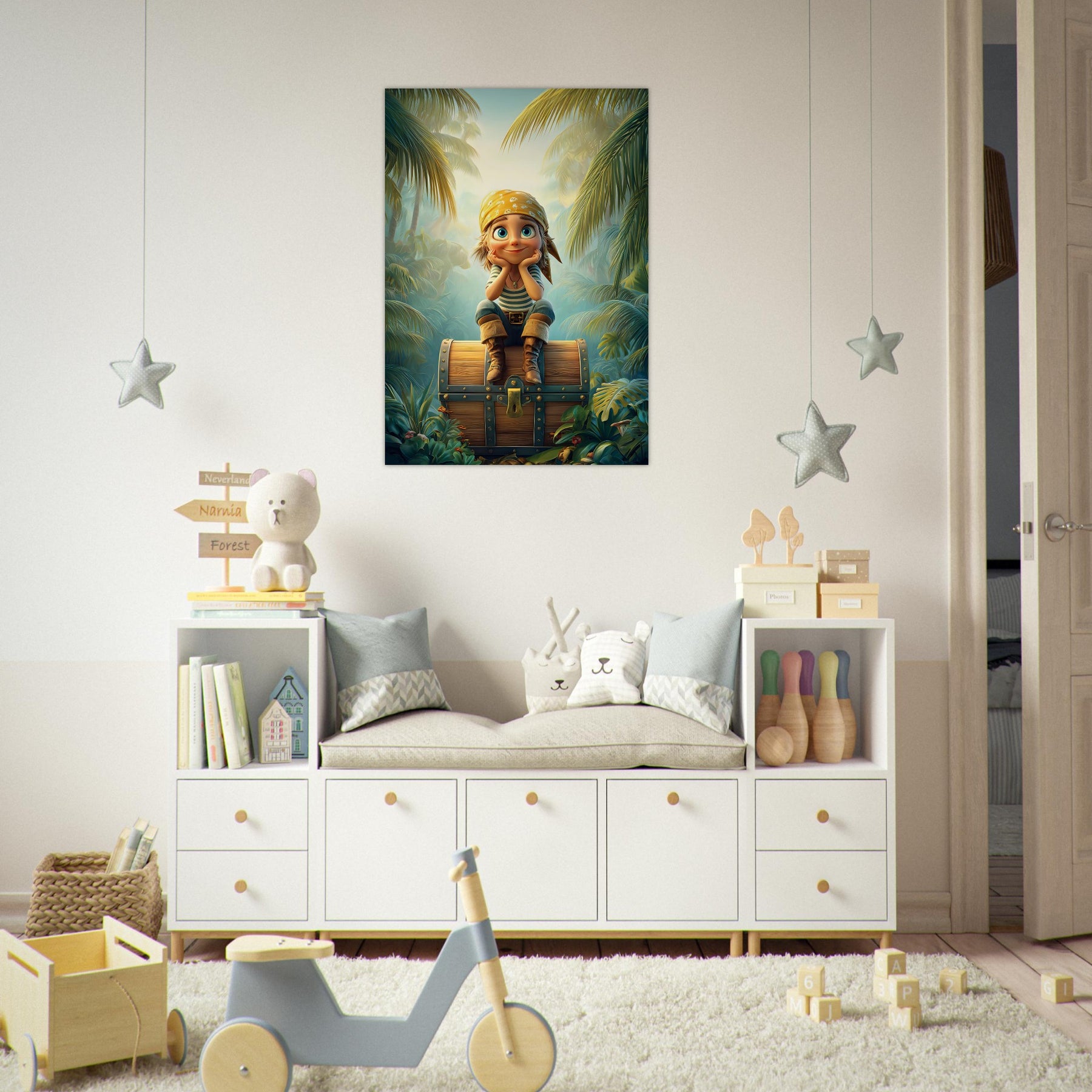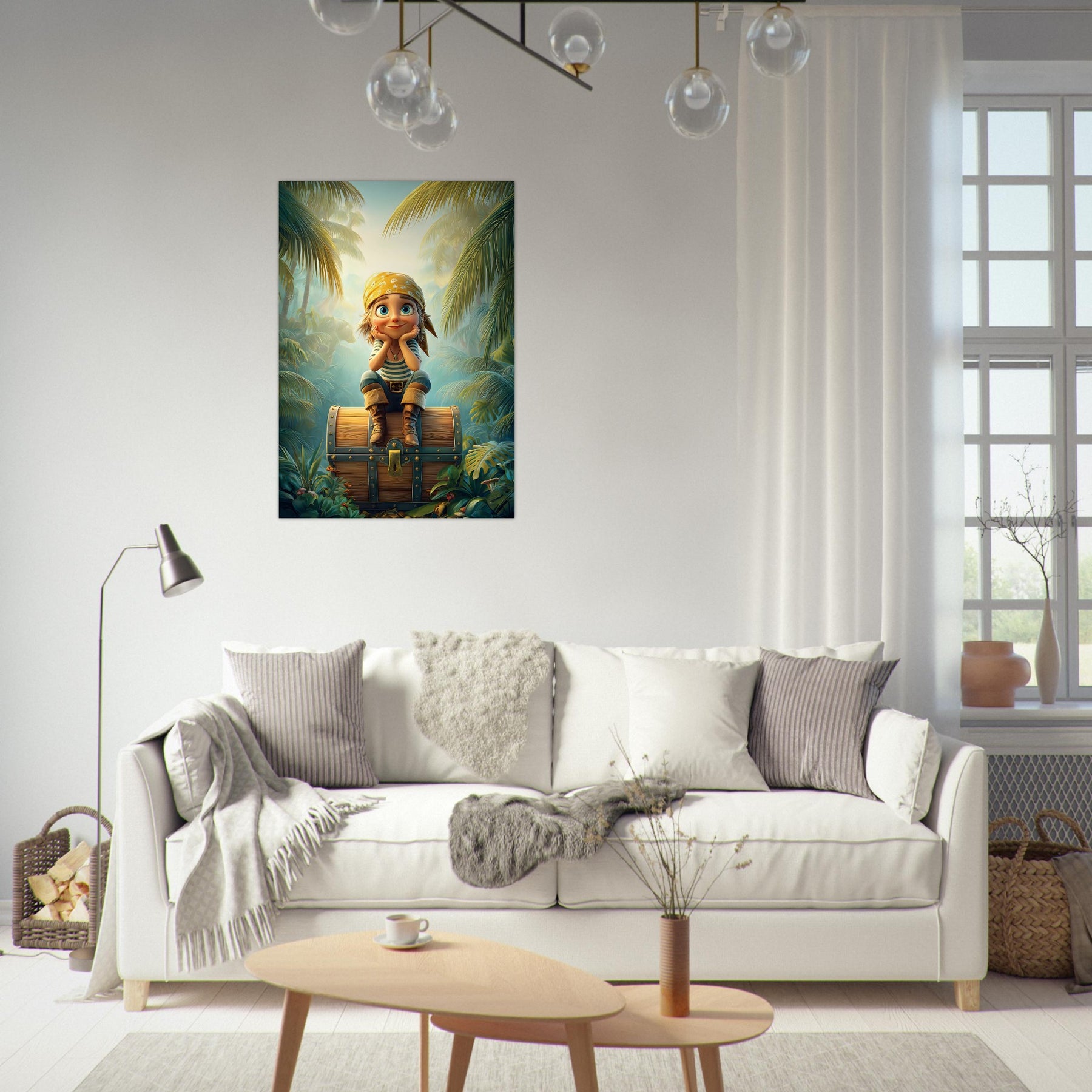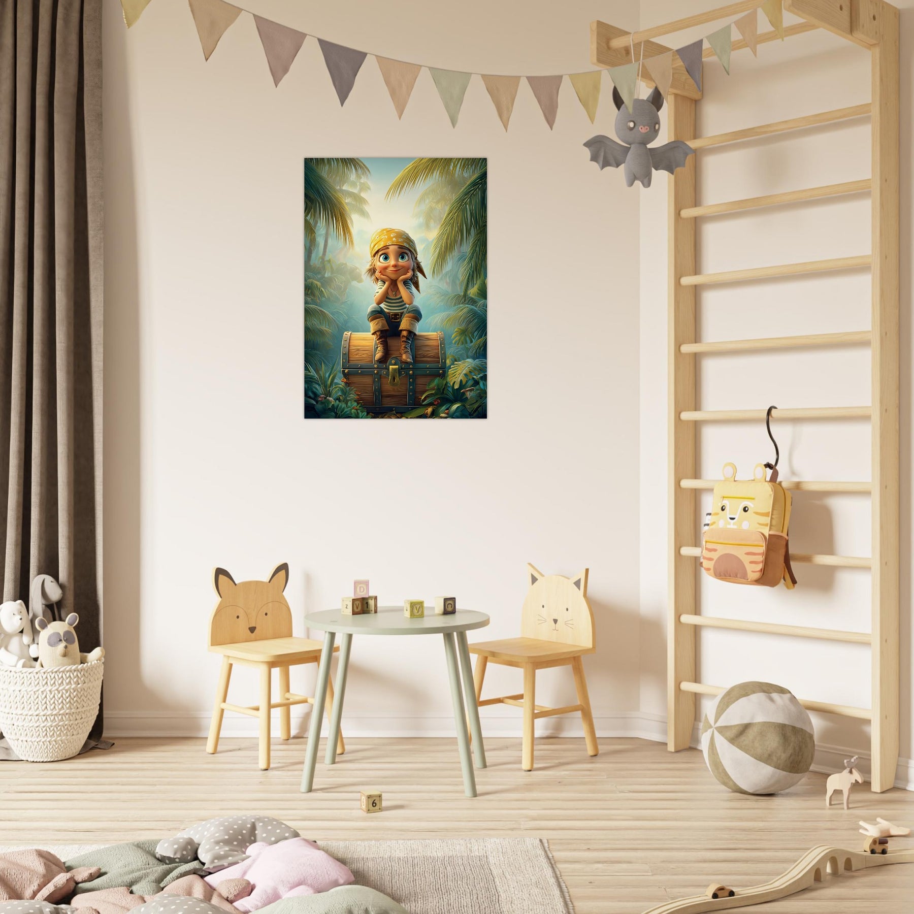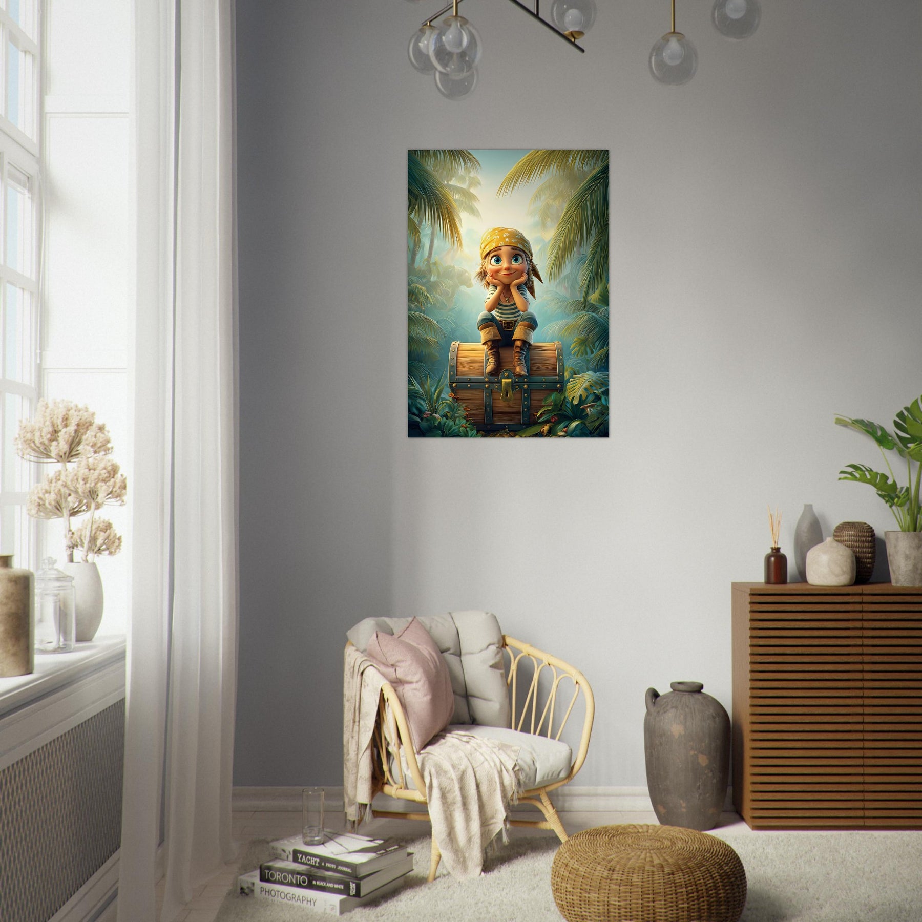 Ignite your child’s imagination with the Jungle Explorer Aluminum Wall Art. This captivating piece features a young adventurer with sparkling eyes sitting atop a treasure chest, surrounded by the lush beauty of a tropical jungle. Bursting with color, mystery, and playful energy, it perfectly captures the magic of discovery and the wonder of exploration.