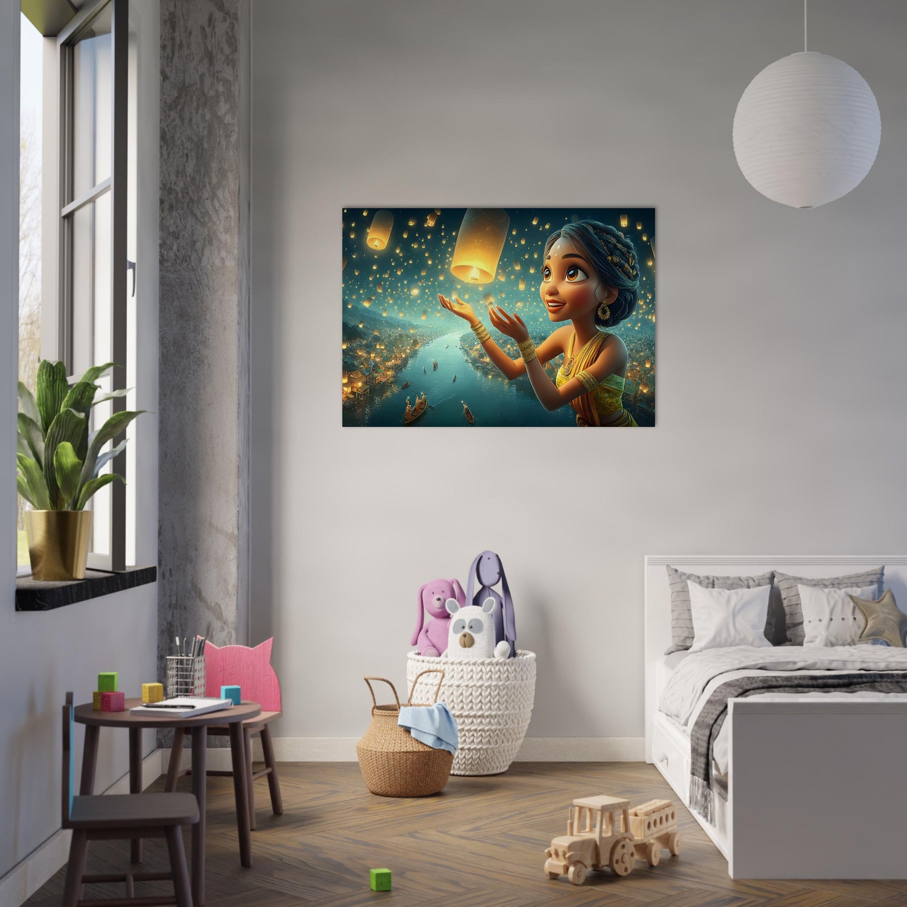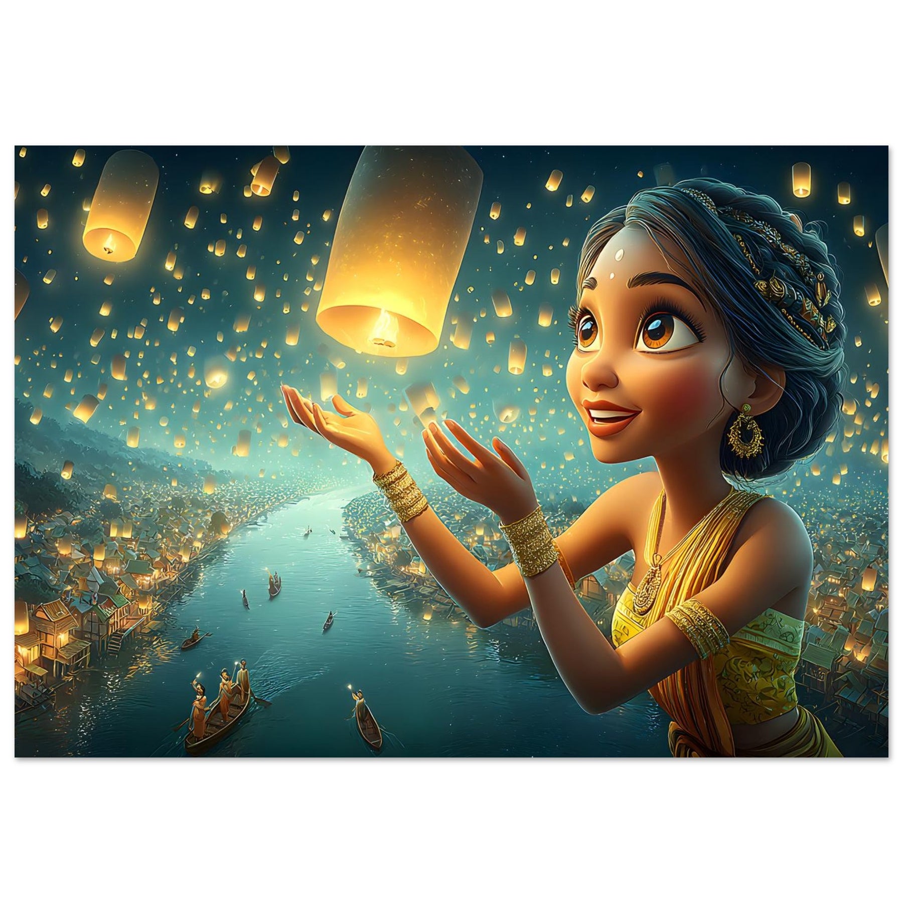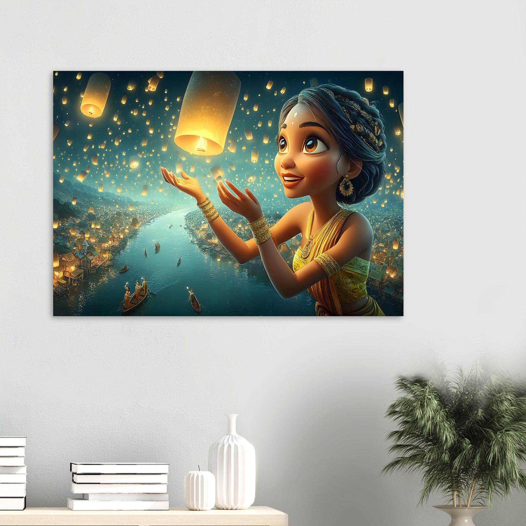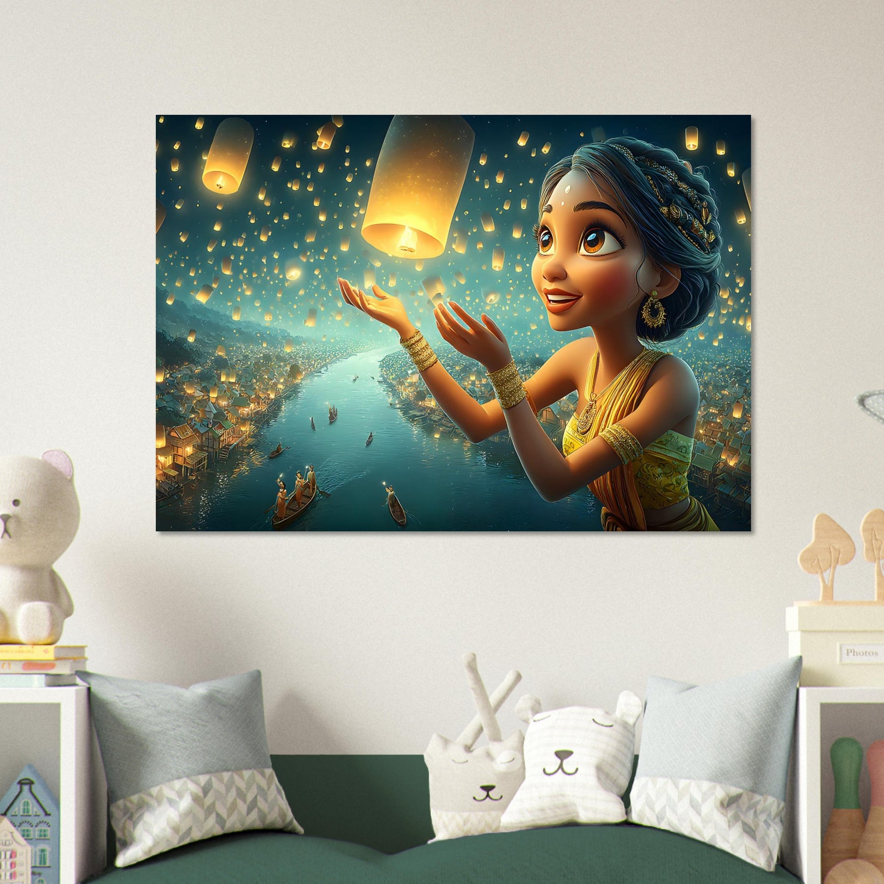 Illuminate your child’s room with the serene beauty of the Lantern Dreams Aluminum Wall Art. This enchanting illustration portrays a young girl in a vibrant outfit joyfully releasing glowing lanterns into the starlit night sky, surrounded by a tranquil river shimmering with reflections and warm golden light. The scene captures the magic of hope, celebration, and wonder — bringing a sense of peace and inspiration to any space.