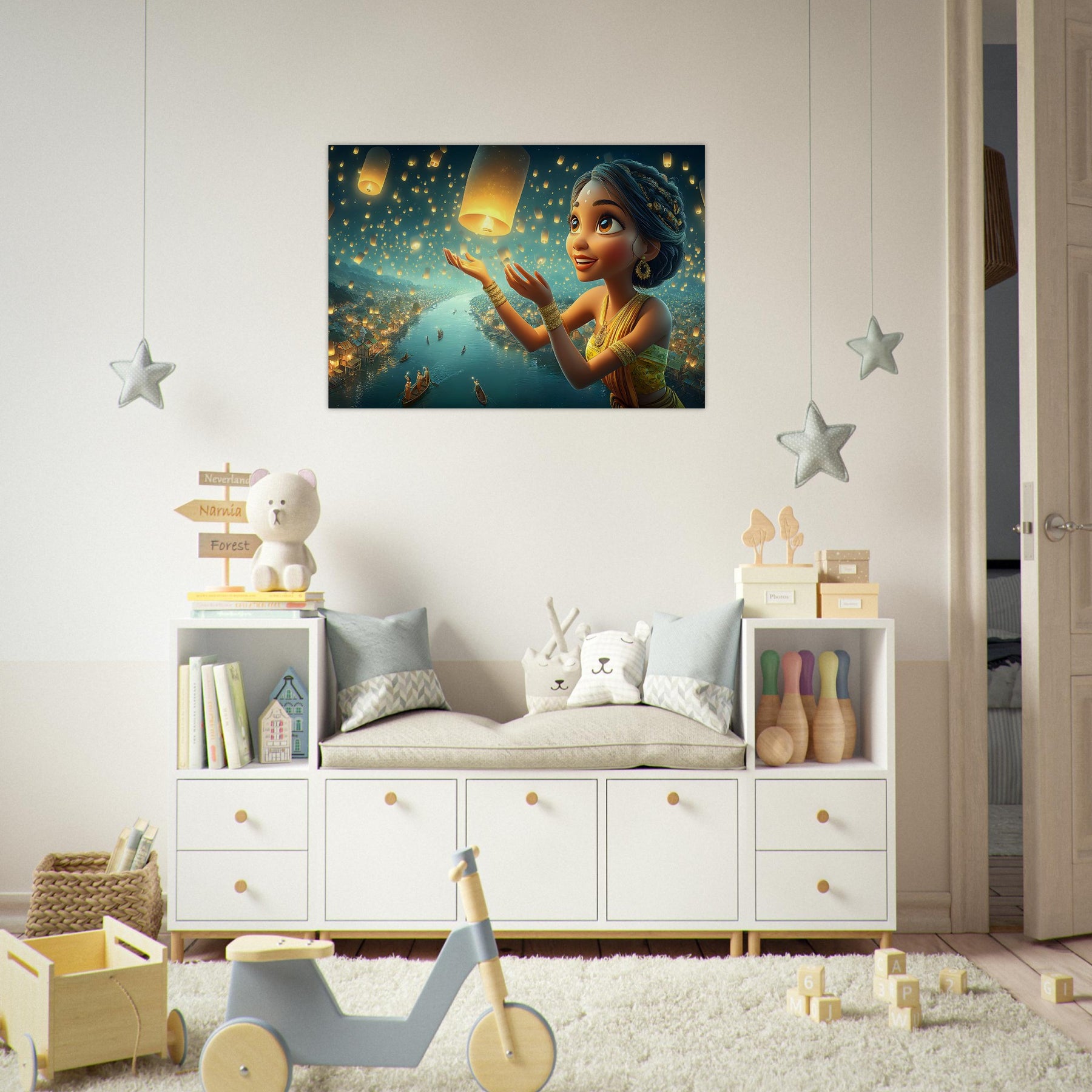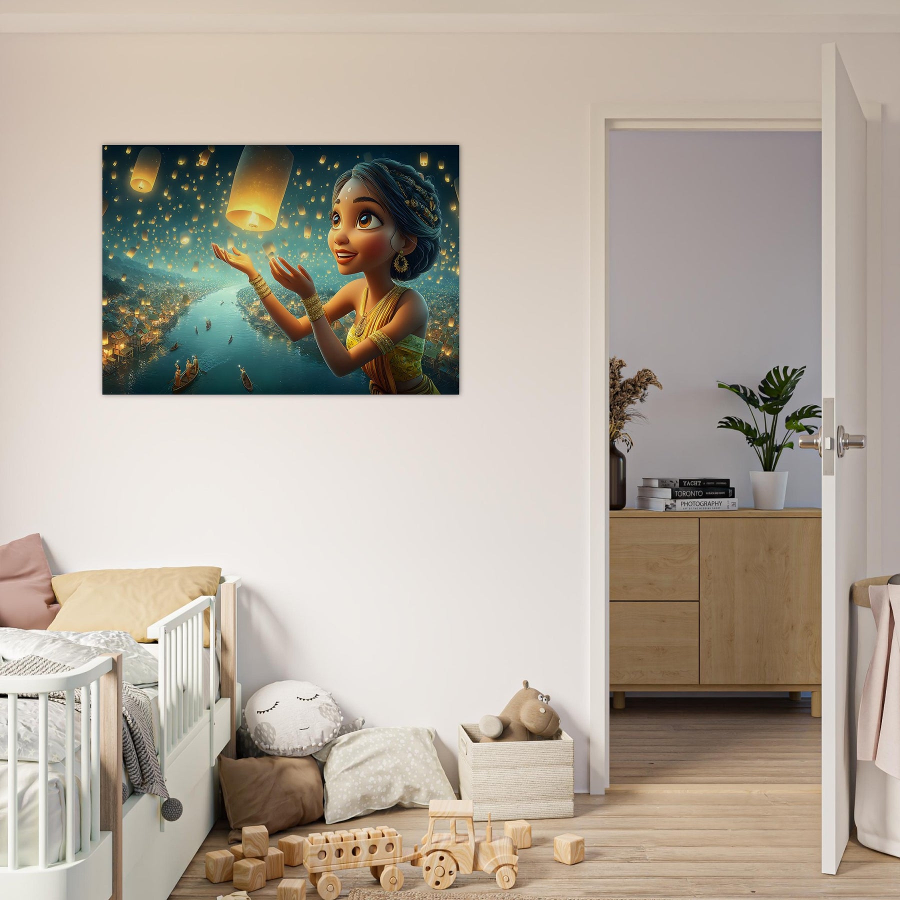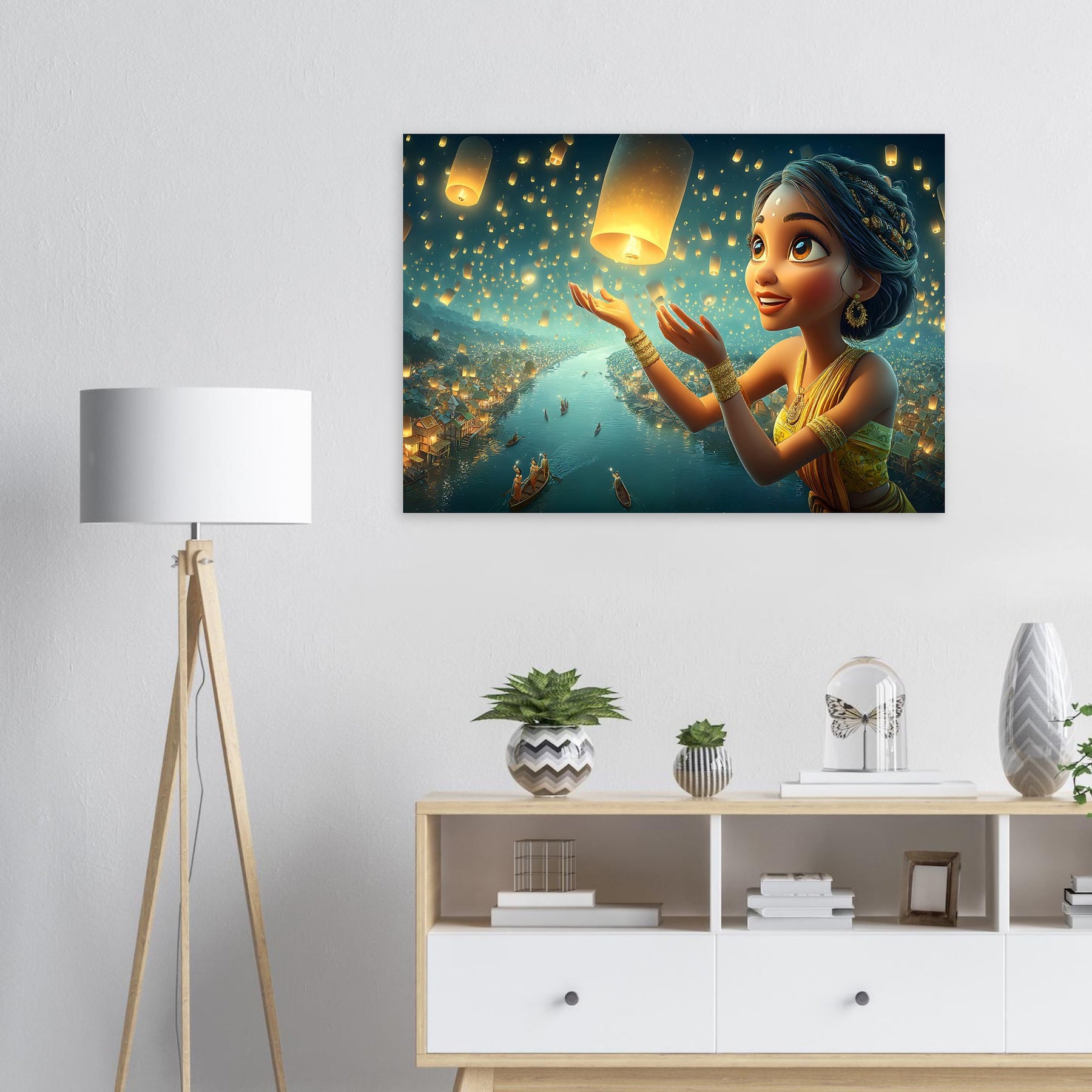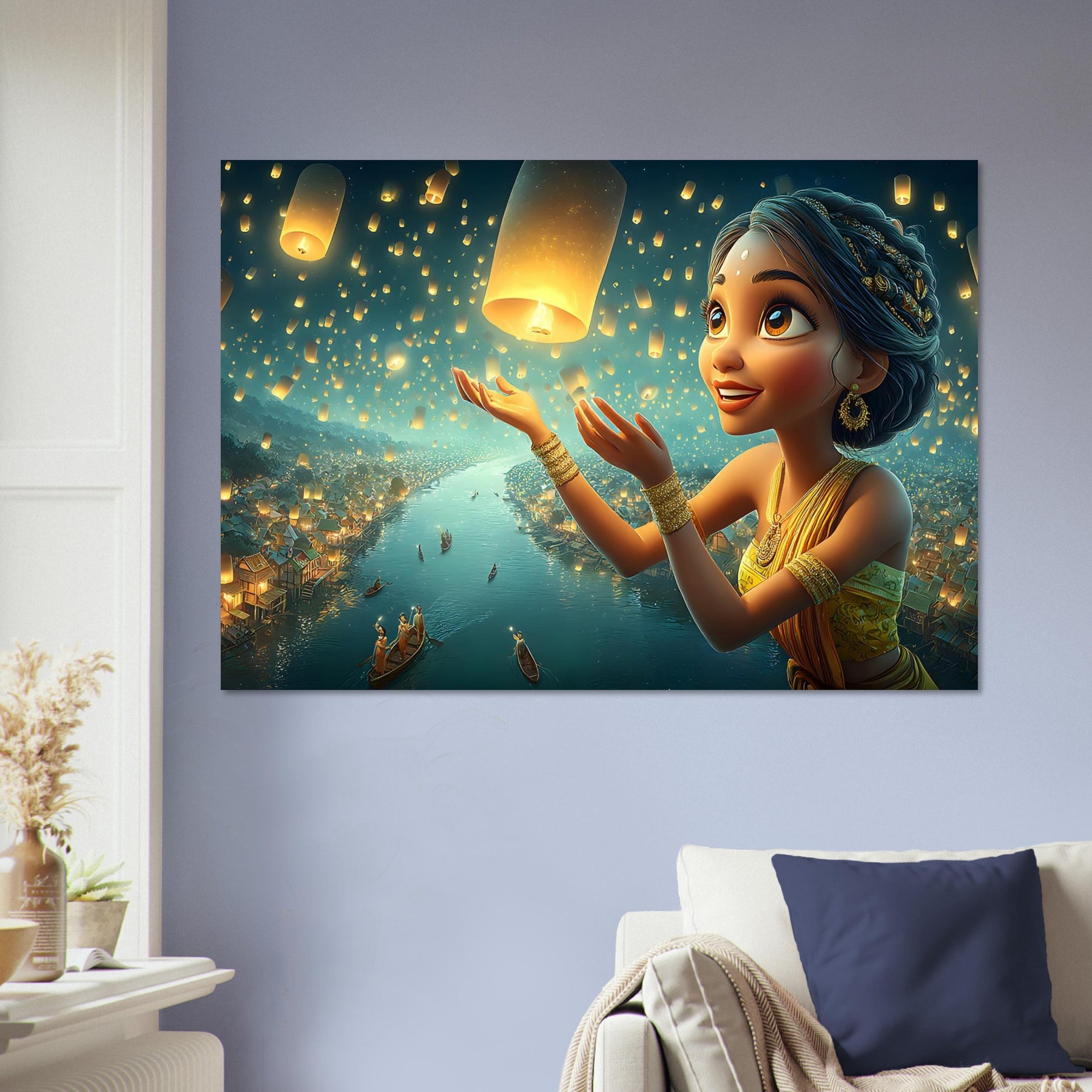 Illuminate your child’s room with the serene beauty of the Lantern Dreams Aluminum Wall Art. This enchanting illustration portrays a young girl in a vibrant outfit joyfully releasing glowing lanterns into the starlit night sky, surrounded by a tranquil river shimmering with reflections and warm golden light. The scene captures the magic of hope, celebration, and wonder — bringing a sense of peace and inspiration to any space.