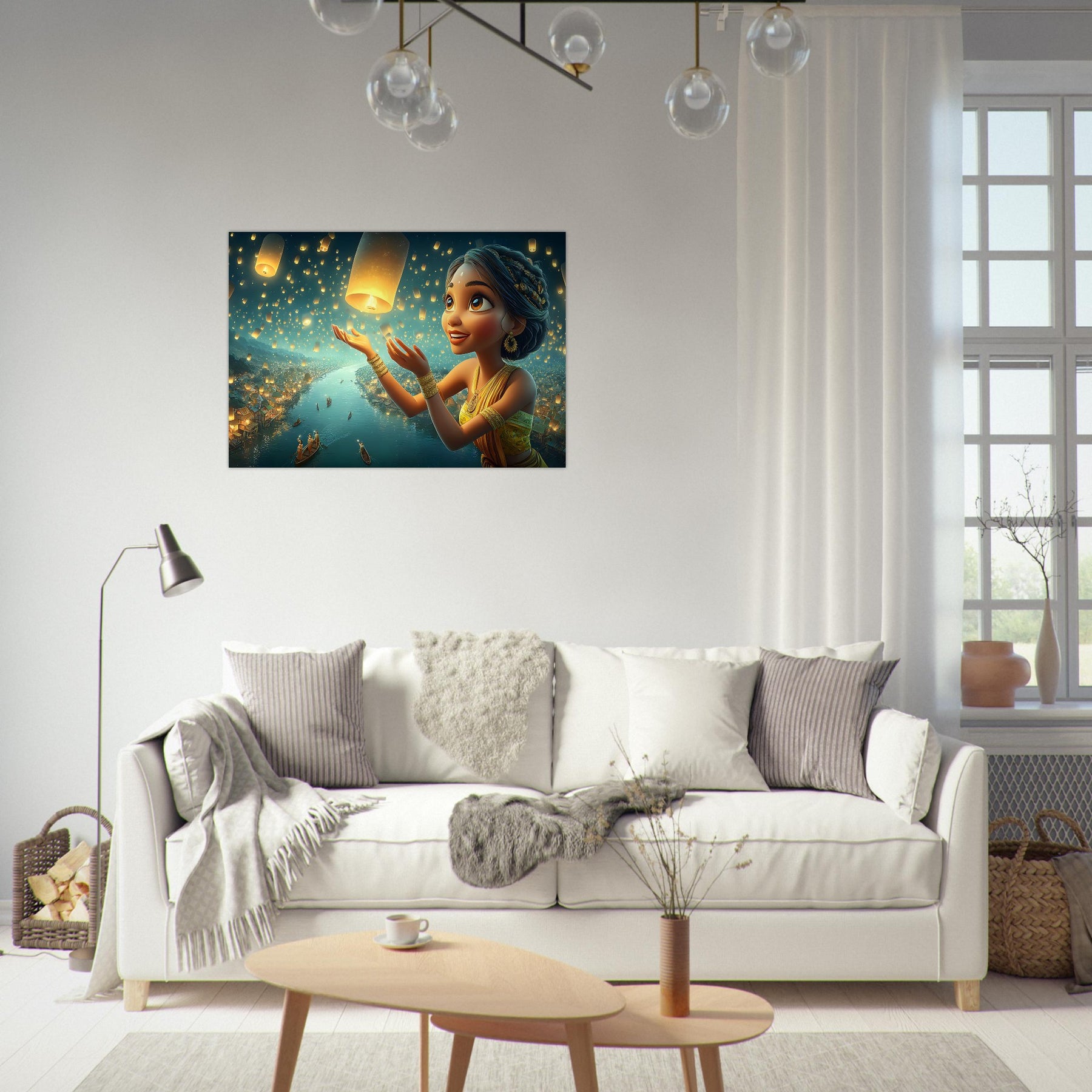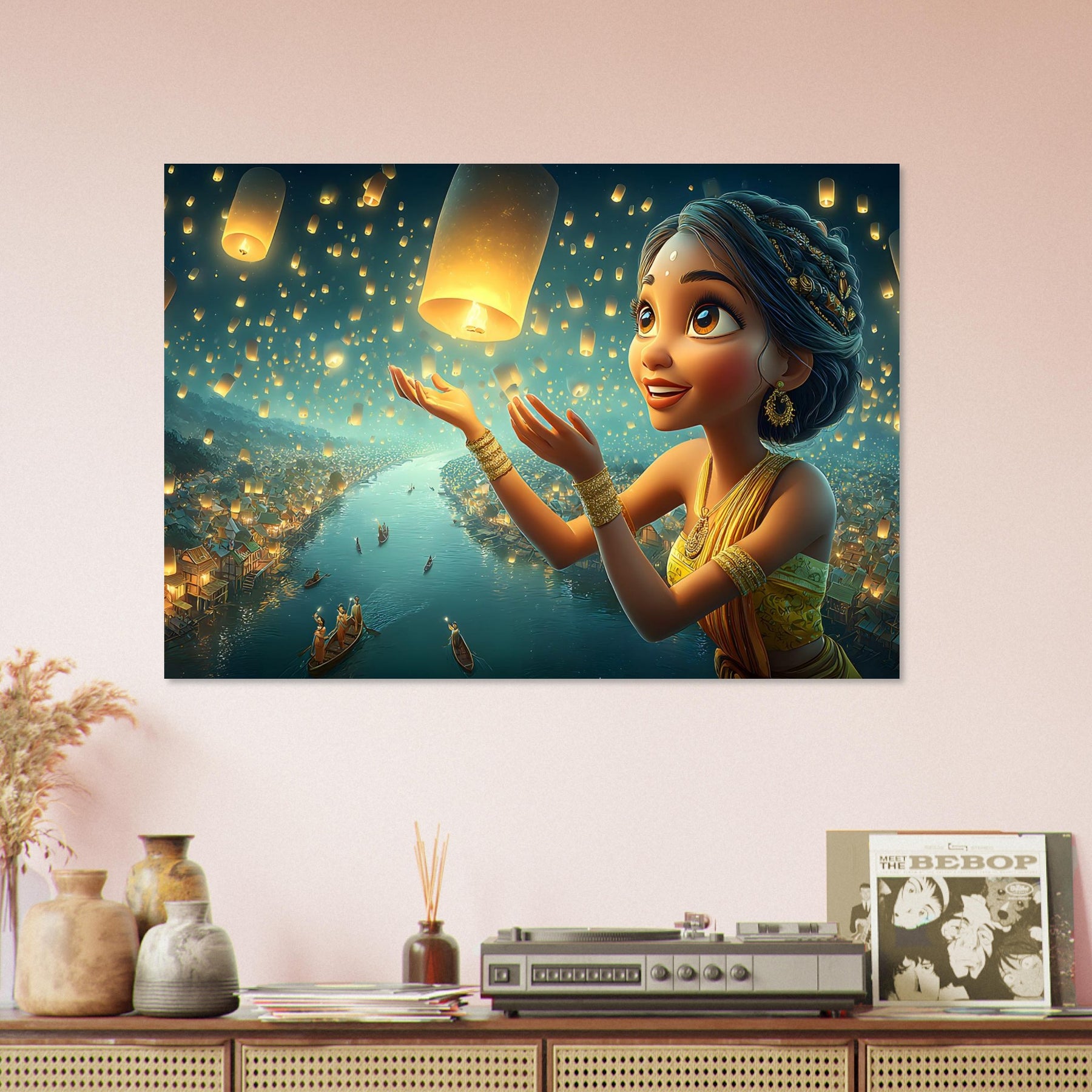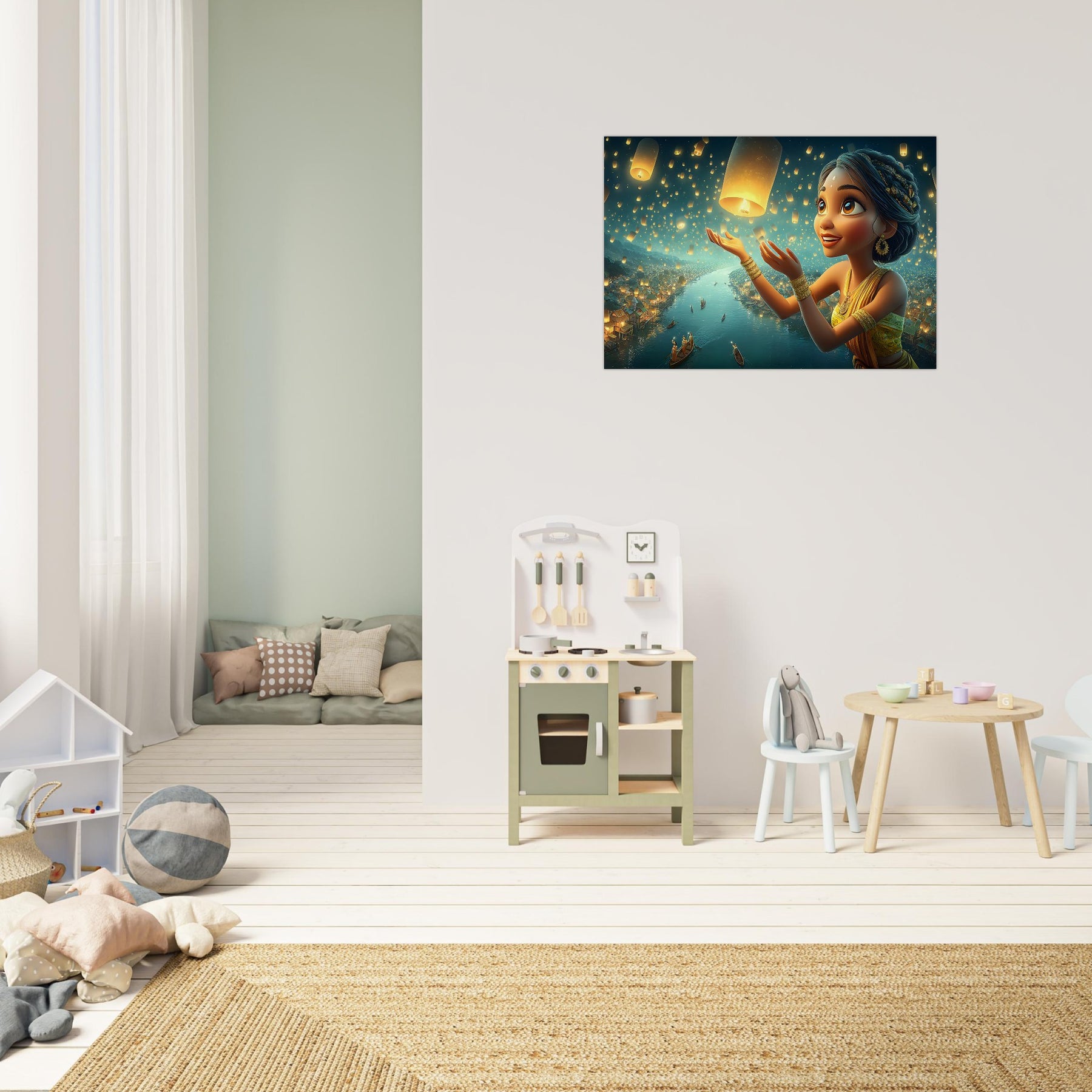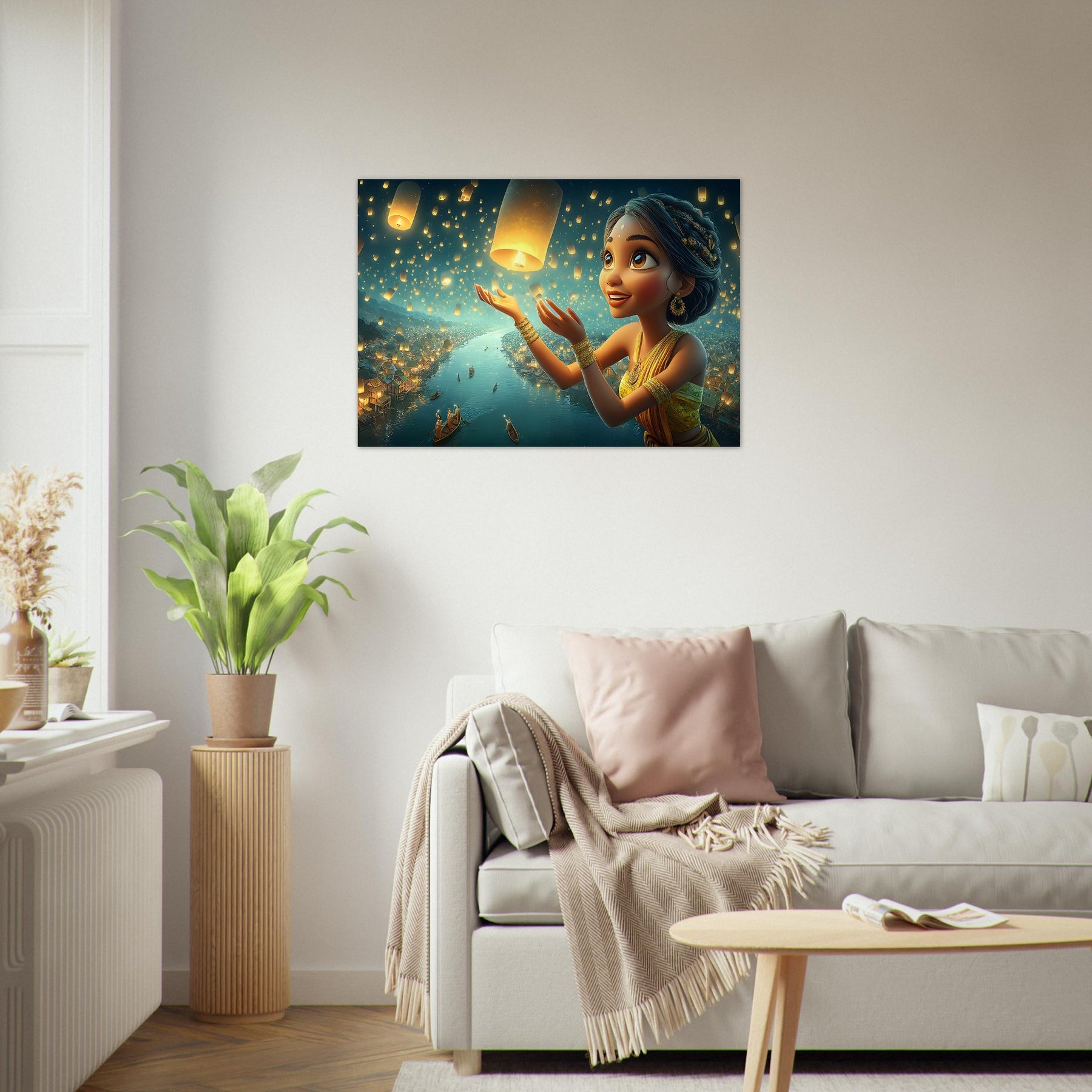 Illuminate your child’s room with the serene beauty of the Lantern Dreams Aluminum Wall Art. This enchanting illustration portrays a young girl in a vibrant outfit joyfully releasing glowing lanterns into the starlit night sky, surrounded by a tranquil river shimmering with reflections and warm golden light. The scene captures the magic of hope, celebration, and wonder — bringing a sense of peace and inspiration to any space.