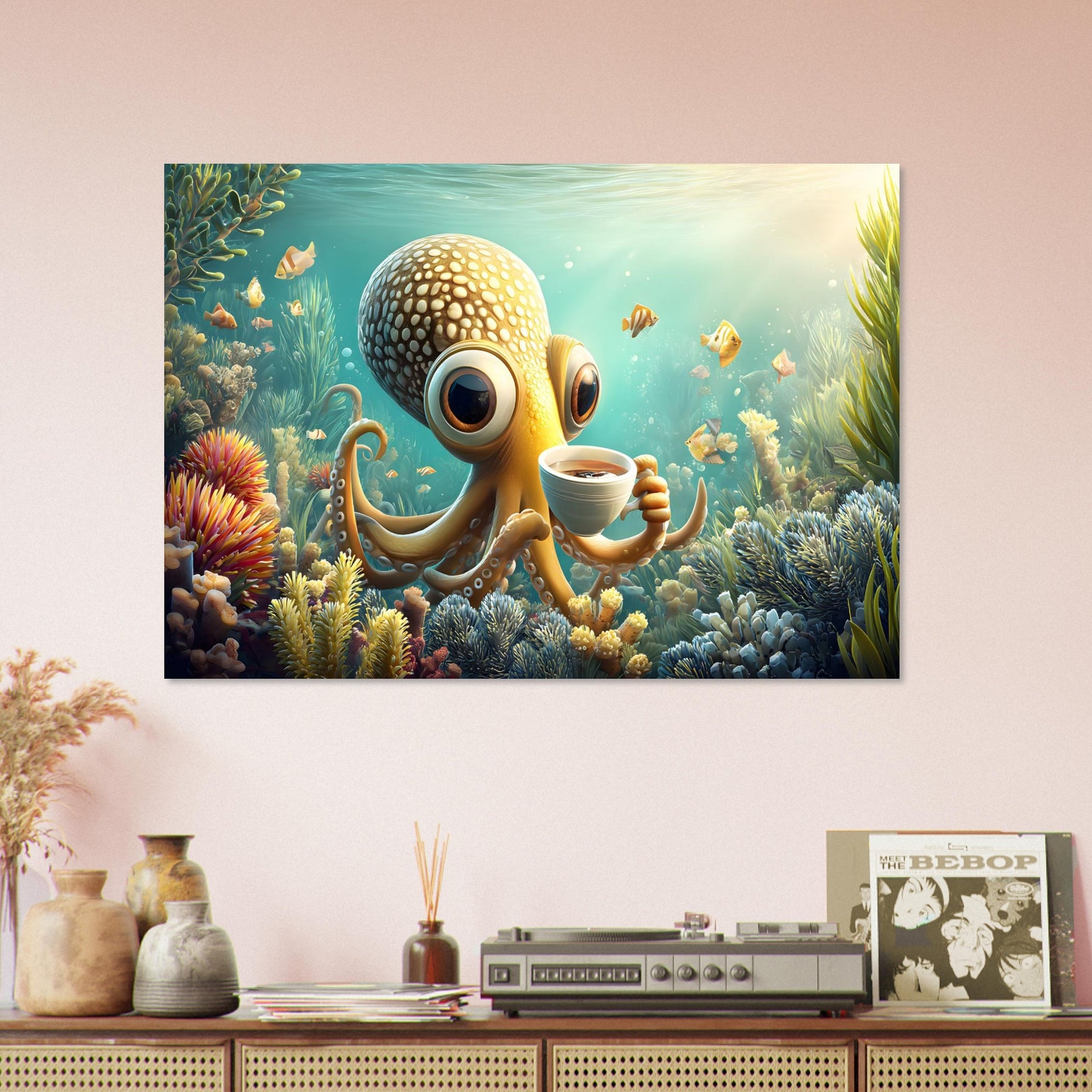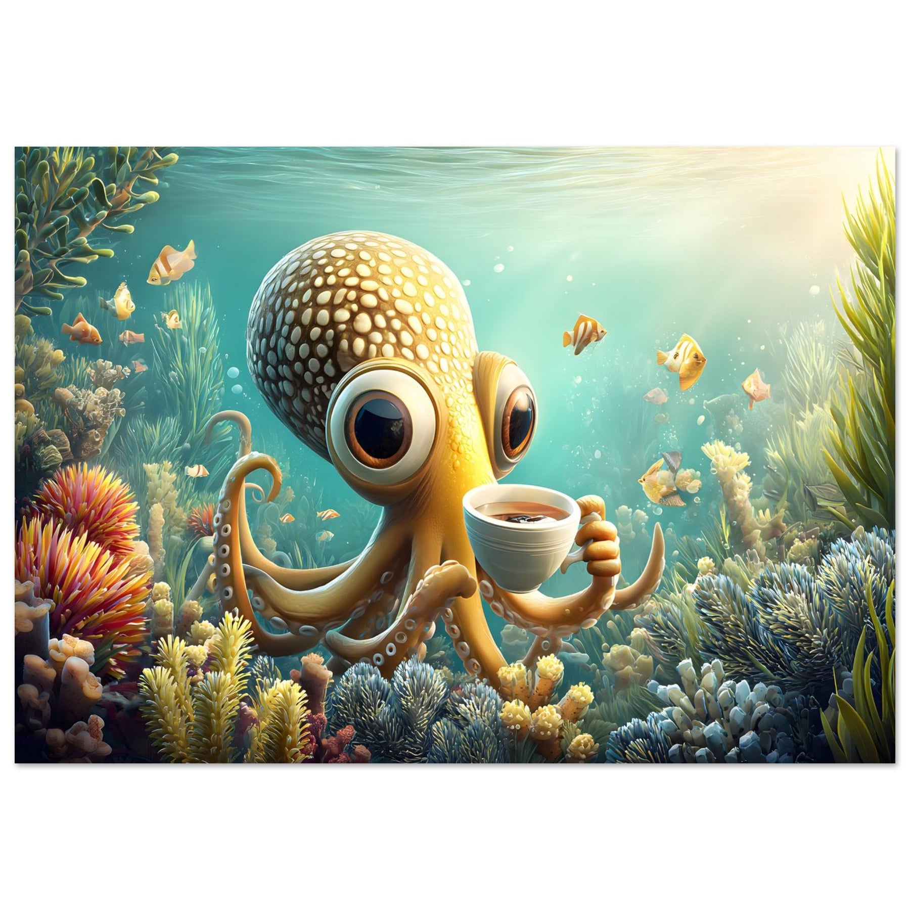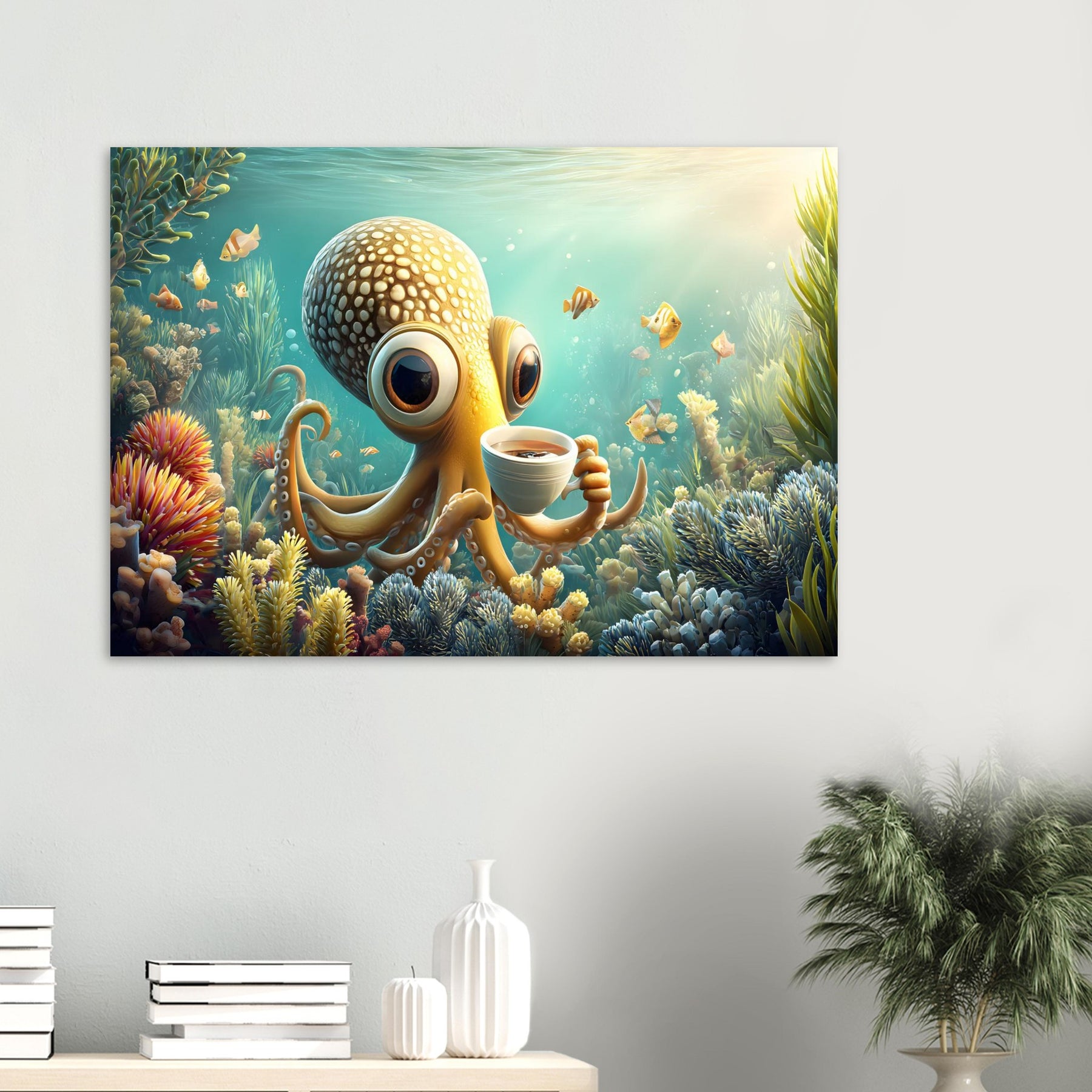 Ocean Brew – Whimsical Octopus with Coffee Aluminum Wall Art