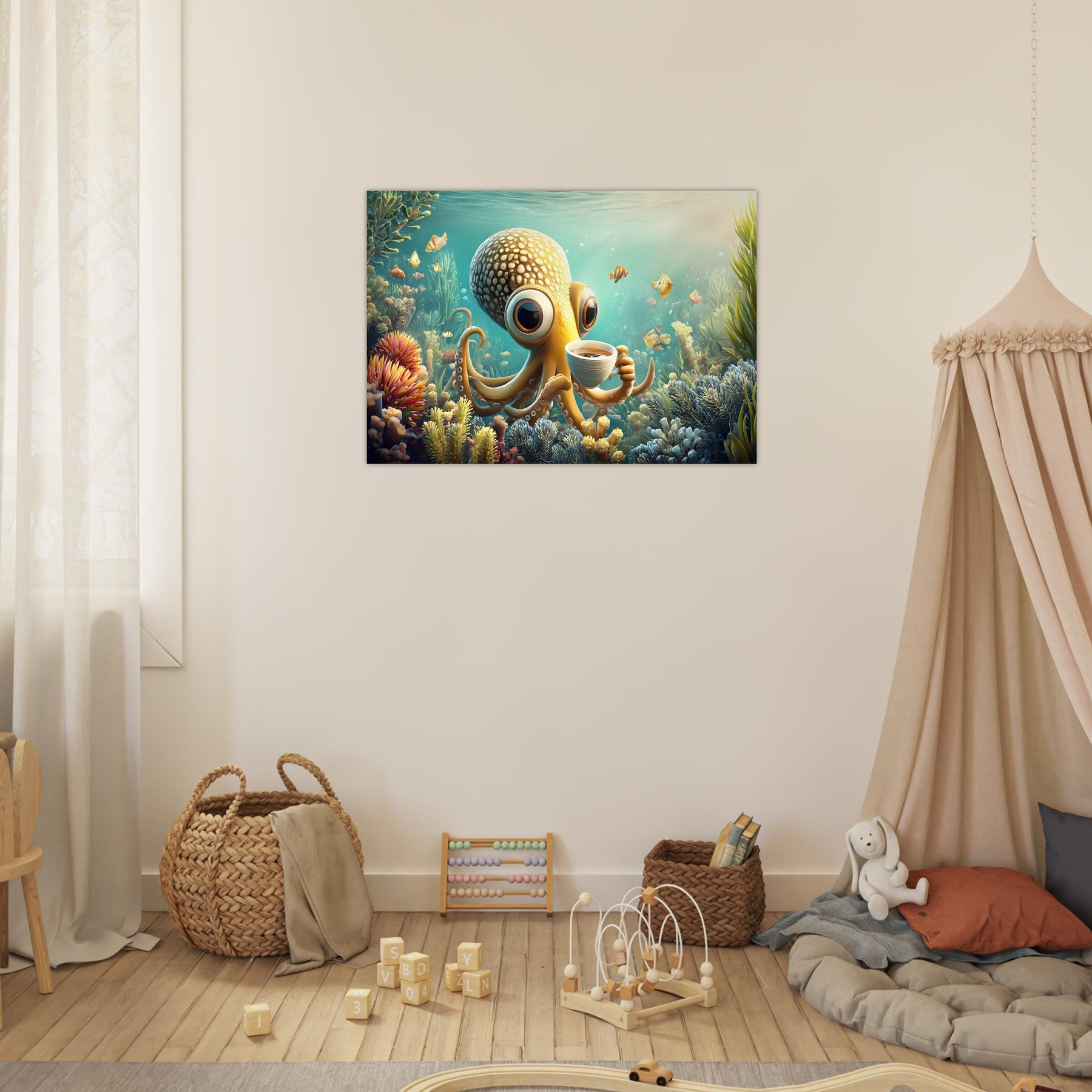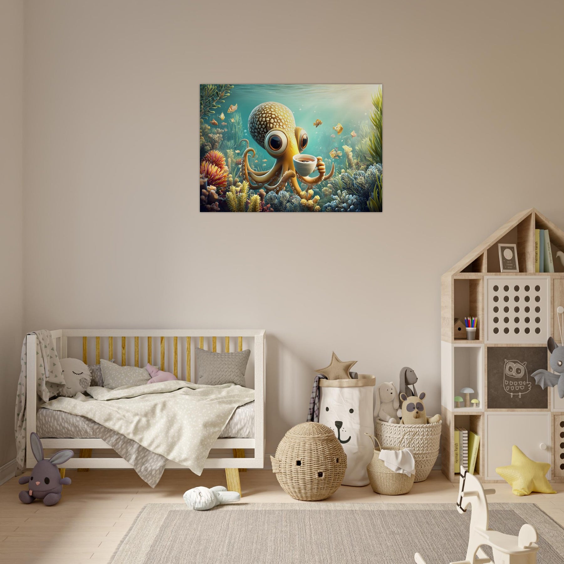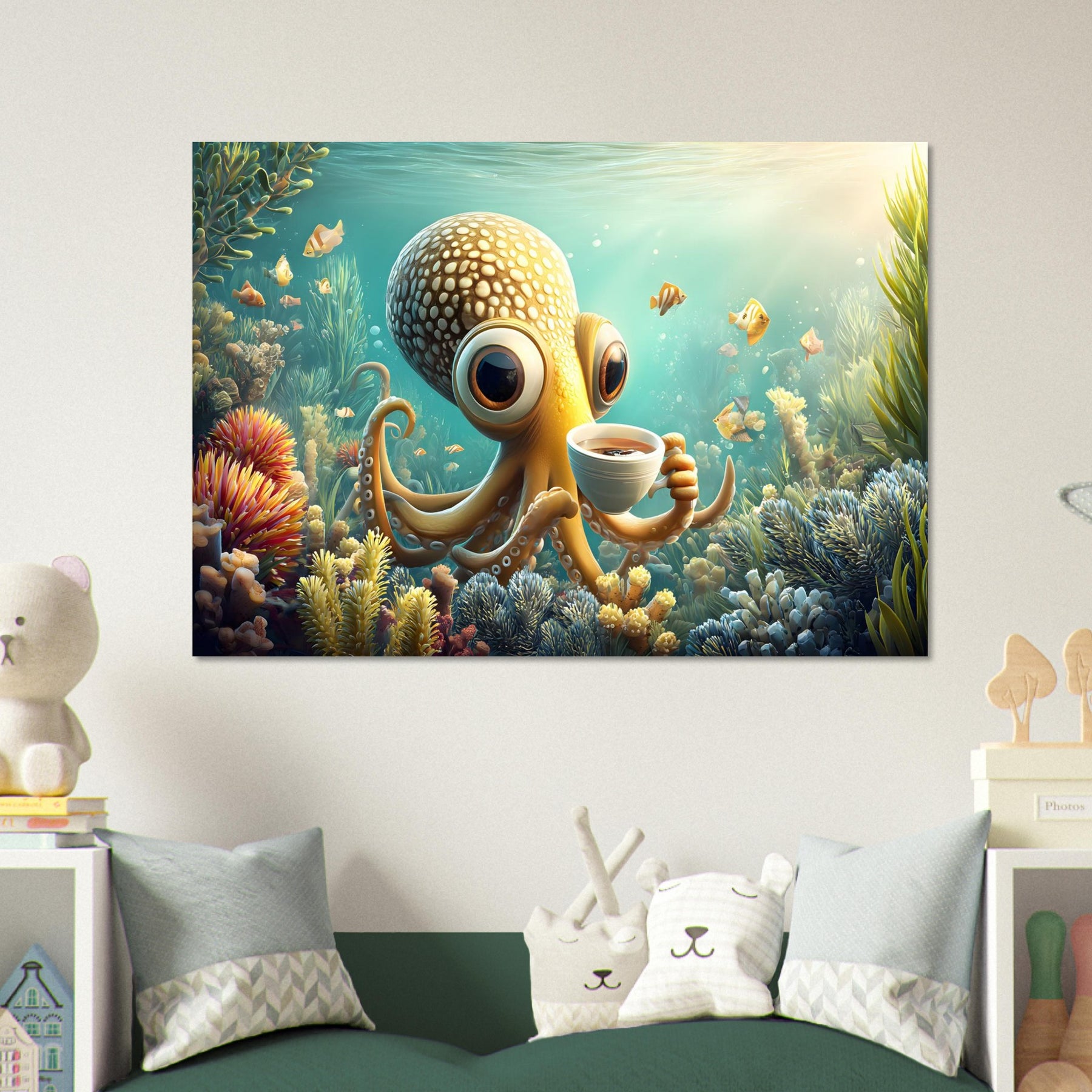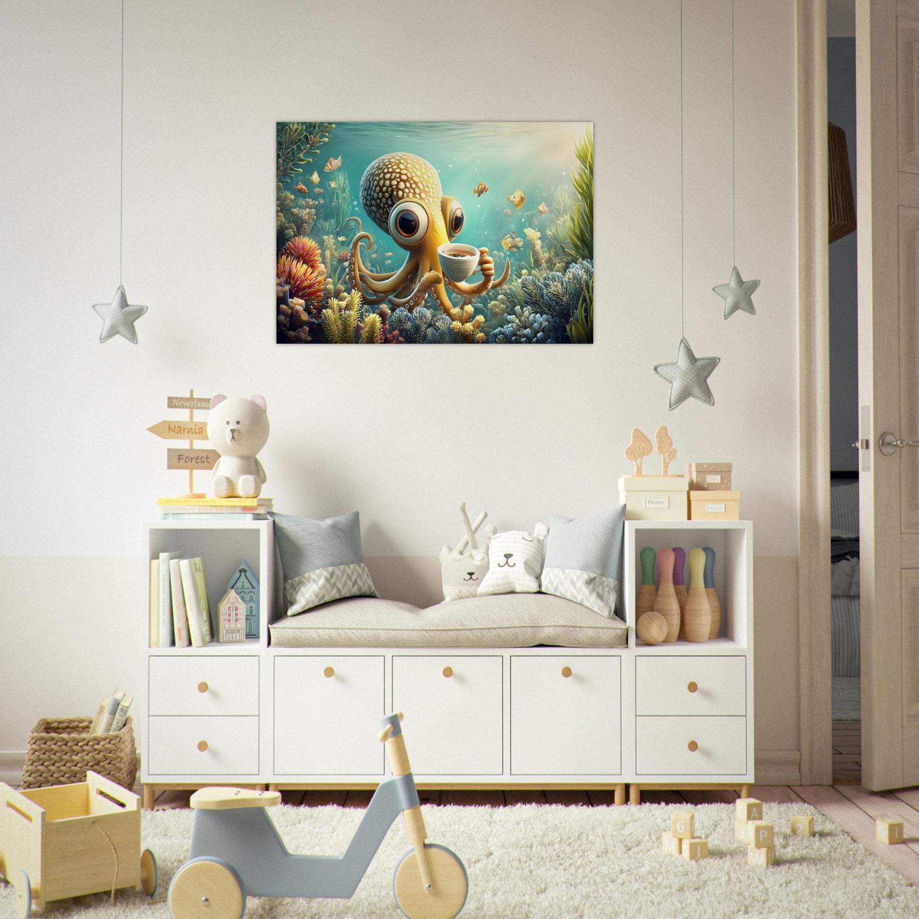 Bring a splash of underwater charm to your child’s room with the Ocean Brew Aluminum Wall Art. This delightful illustration features a friendly octopus enjoying a steaming cup of coffee amid a vibrant coral reef teeming with colorful fish. Blending the beauty of marine life with a touch of humor and coziness, it’s a playful reminder to find joy in life’s simple moments.
