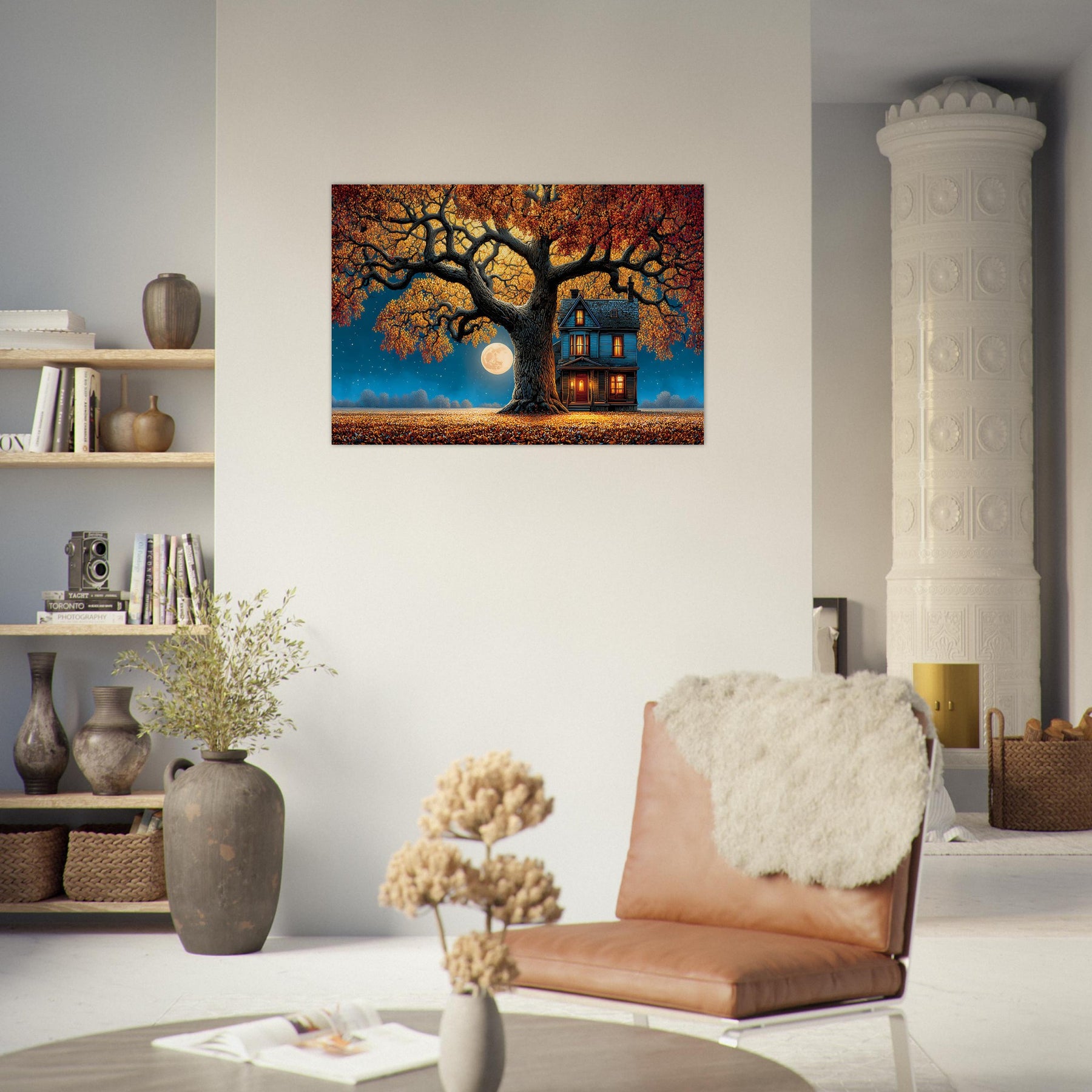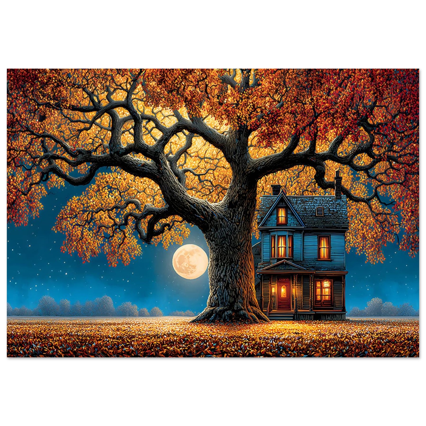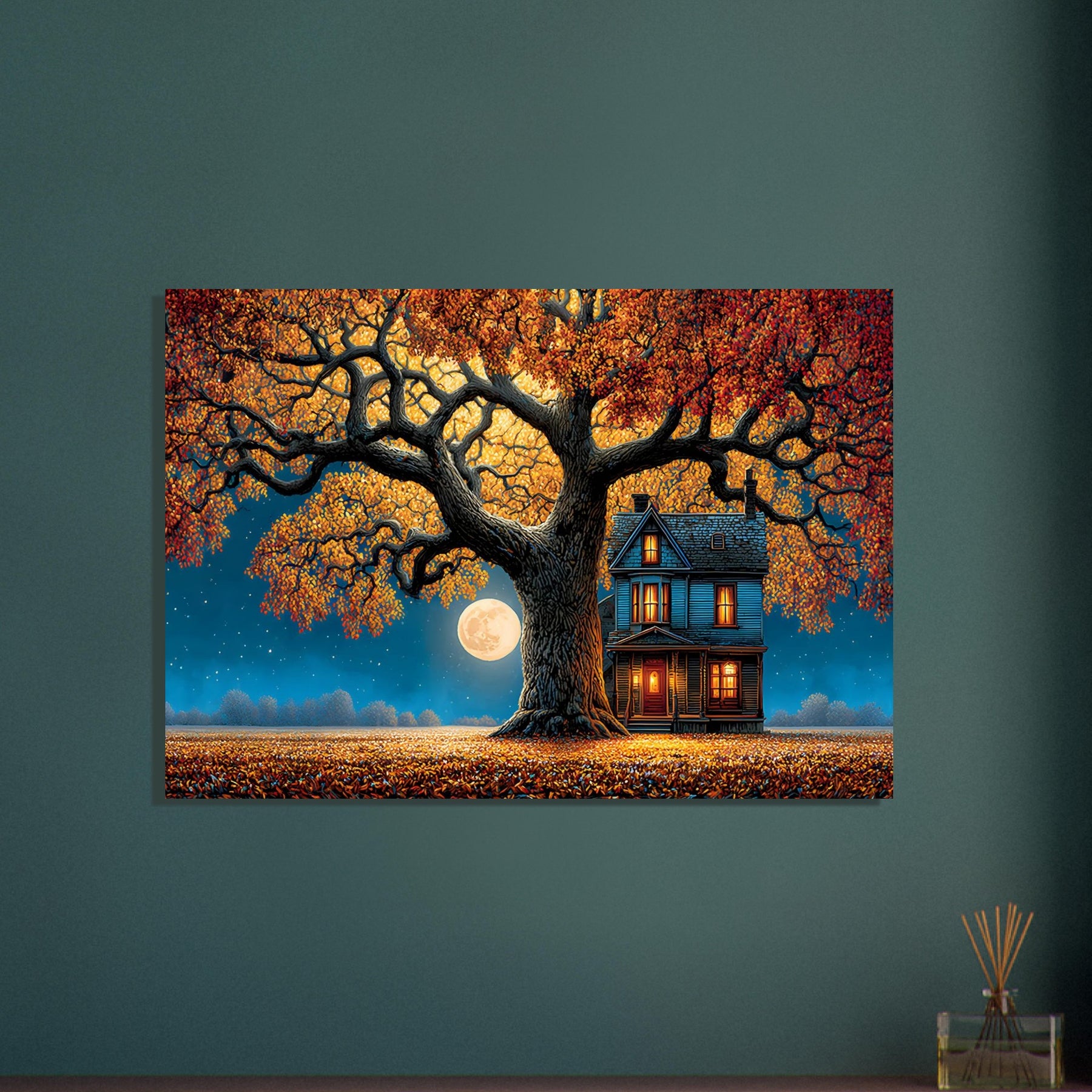 Transform your space with the enchanting beauty of Moonlit Autumn Serenity Aluminum Wall Art. This captivating artwork portrays a charming house nestled beneath a vibrant autumn tree, glowing warmly under the light of a luminous full moon. The scene evokes feelings of peace, comfort, and timeless tranquility, making it a perfect centerpiece for any room.