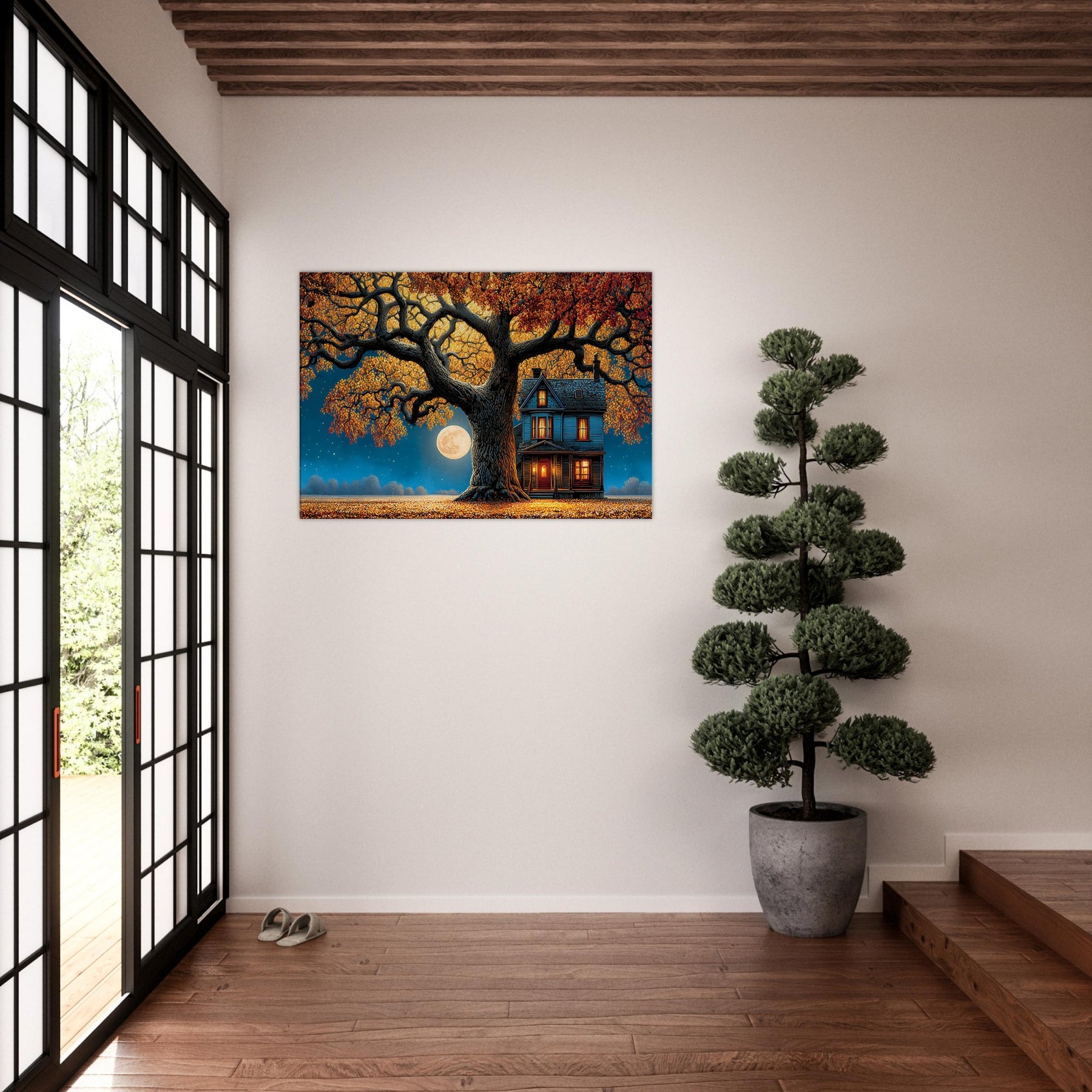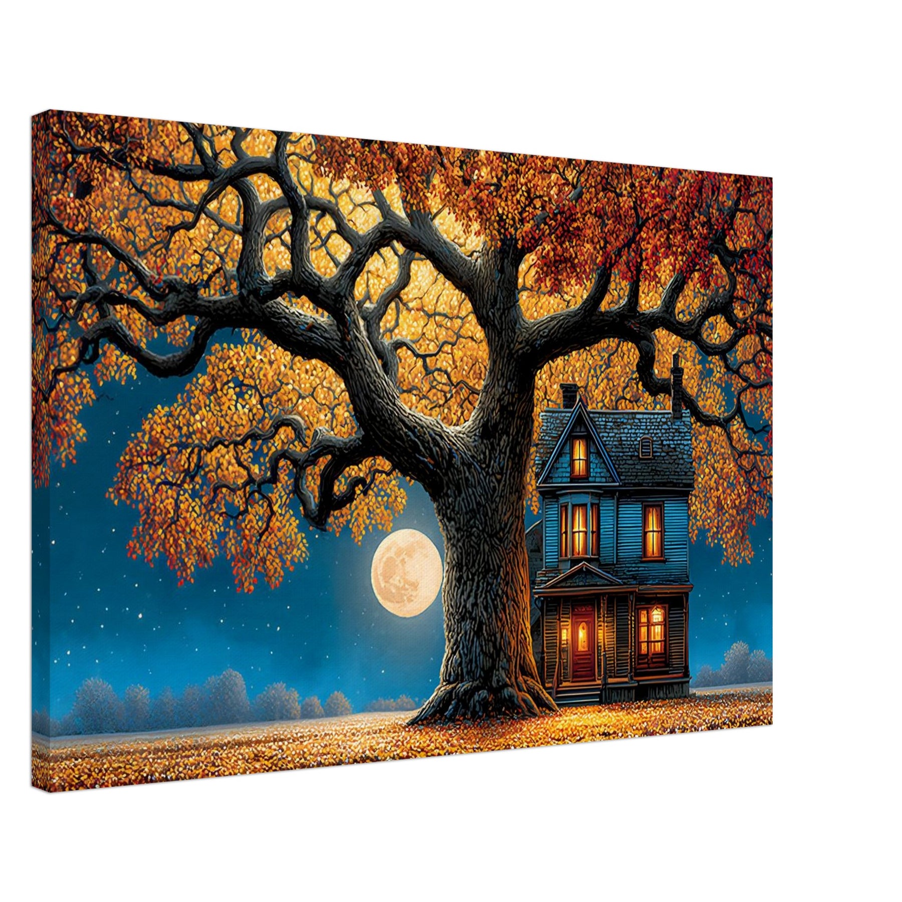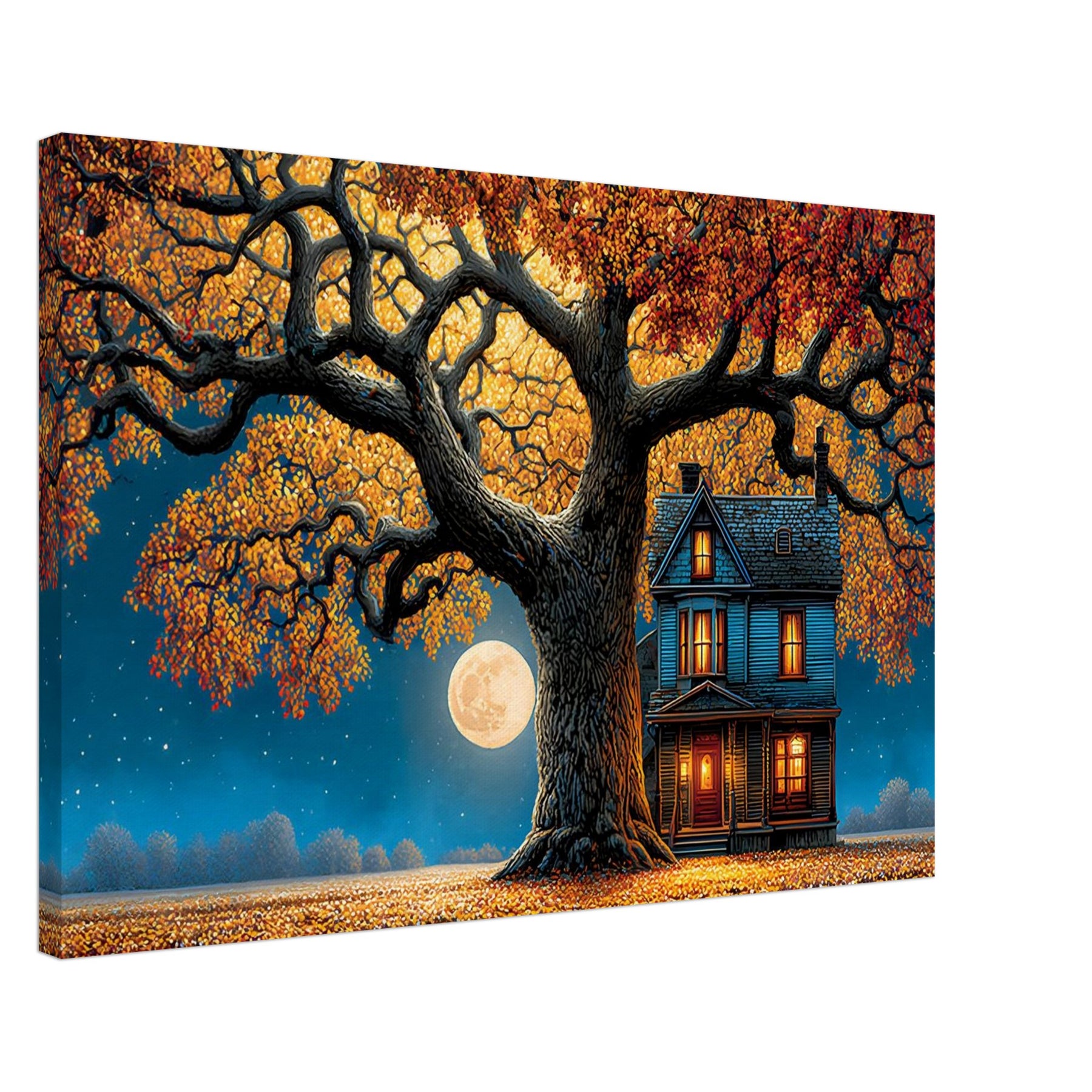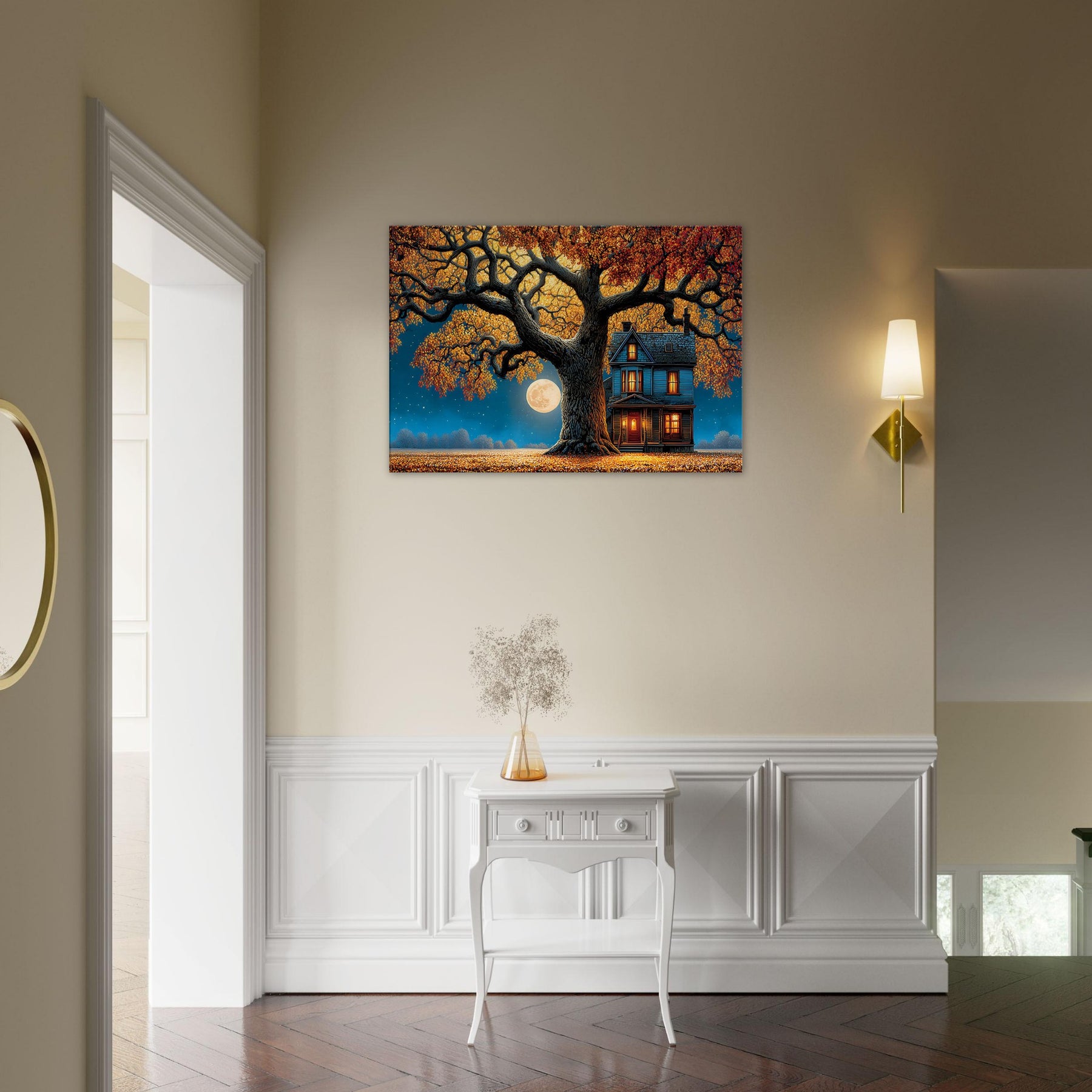 Add warmth and elegance to your walls with the Moonlit Autumn Serenity Canvas Wall Art. This enchanting piece depicts a cozy house tucked beneath a vibrant autumn tree, bathed in the glow of a luminous full moon. The rich textures and painterly depth of canvas bring the scene to life, making it a perfect accent for bedrooms, living rooms, or reading nooks.