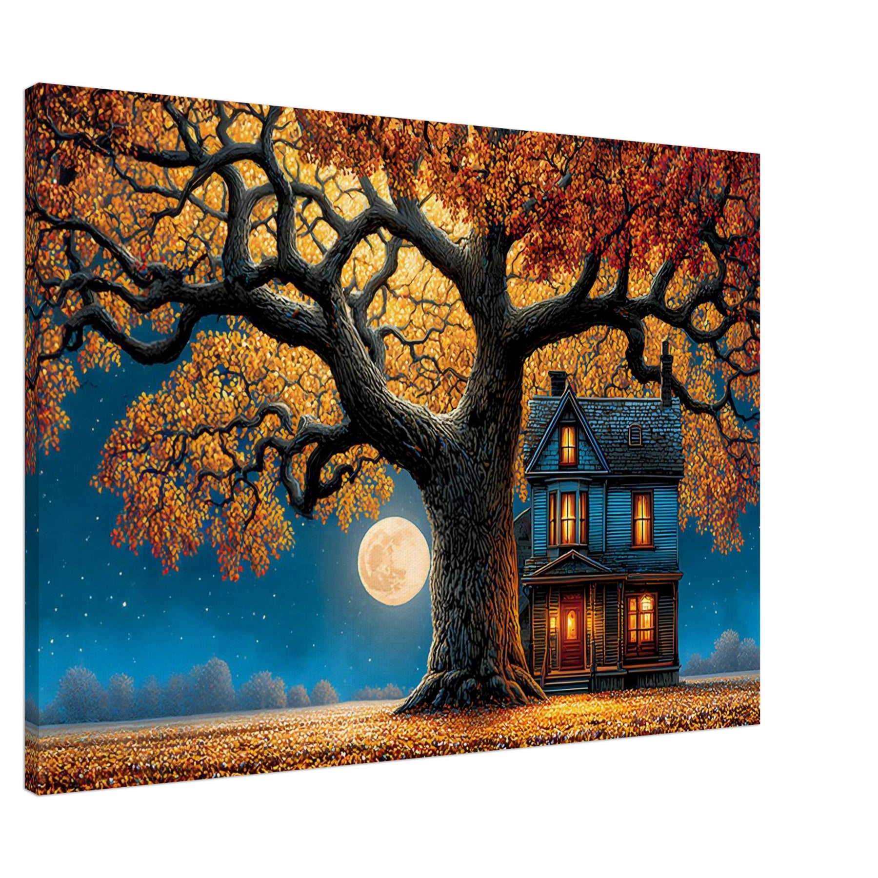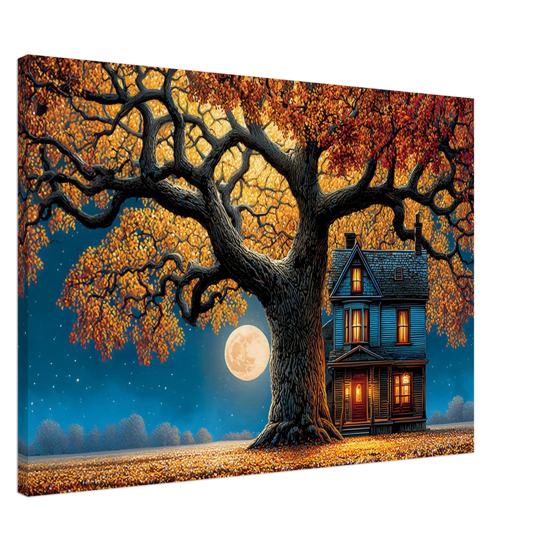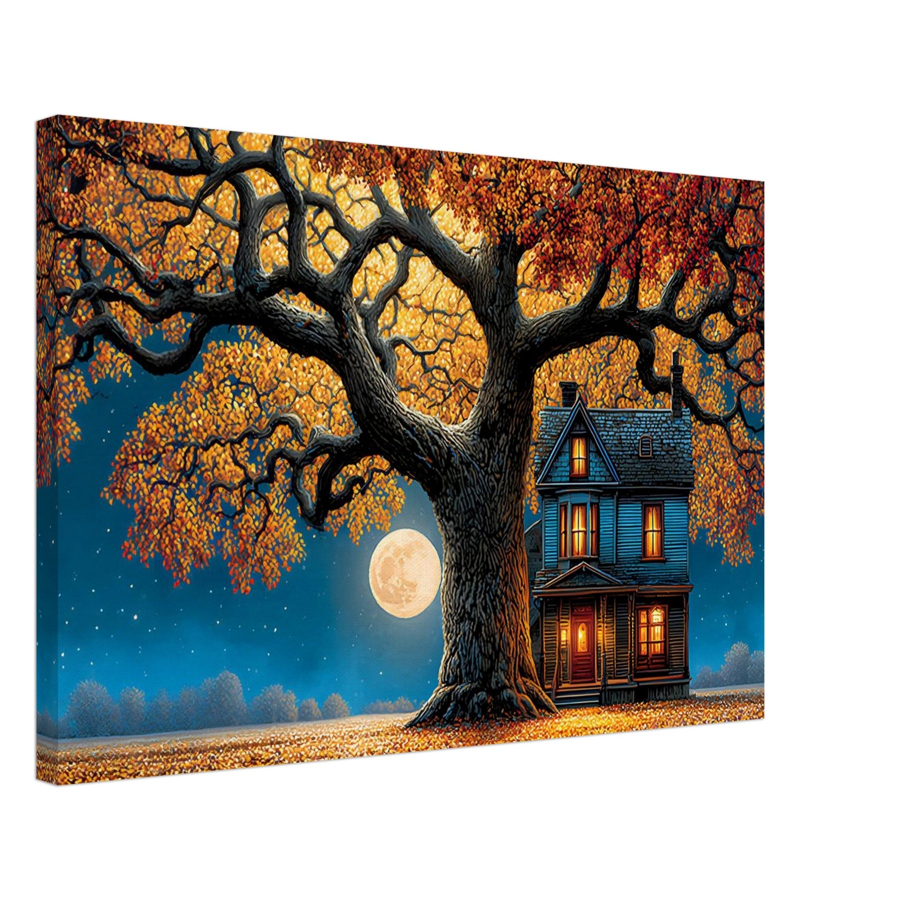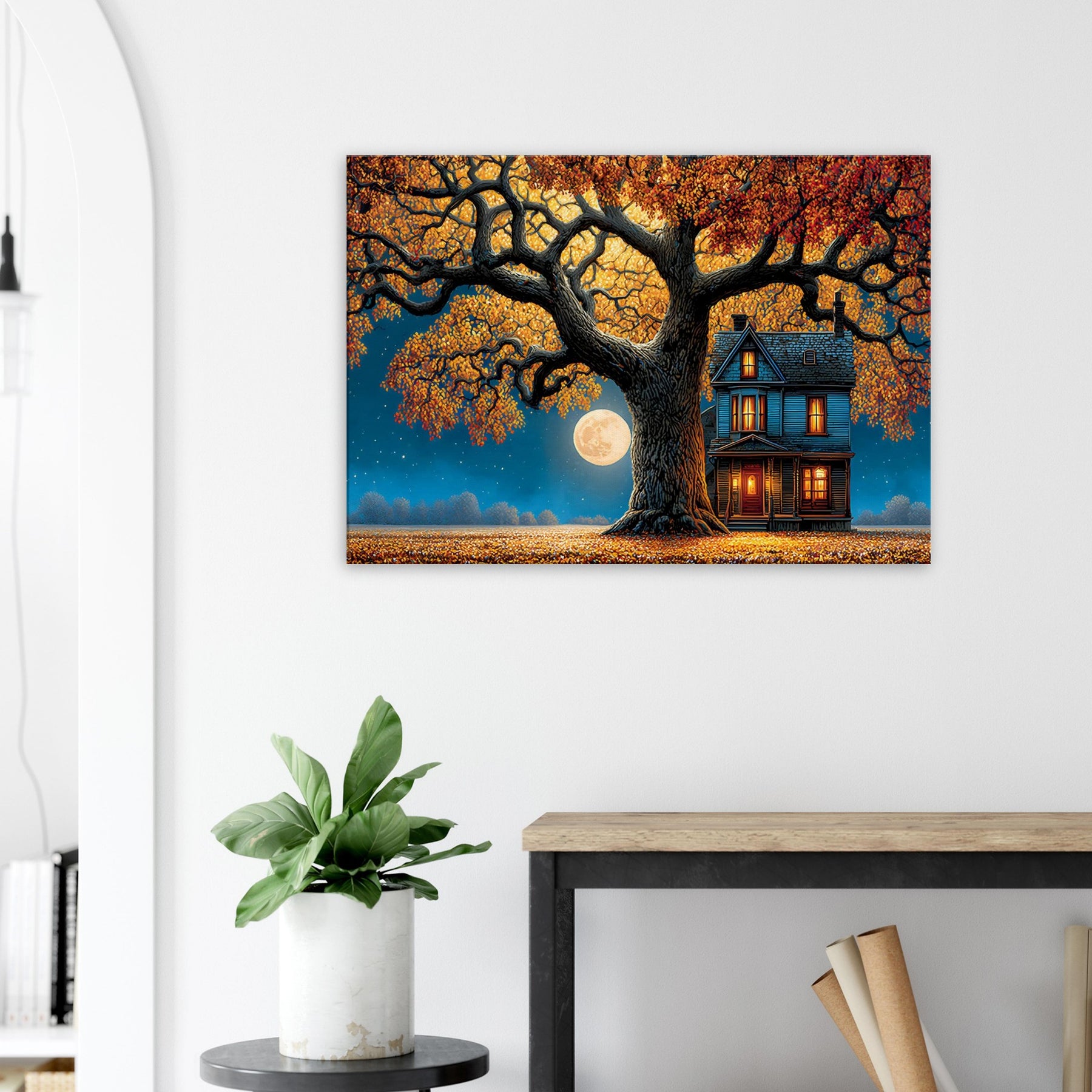 Add warmth and elegance to your walls with the Moonlit Autumn Serenity Canvas Wall Art. This enchanting piece depicts a cozy house tucked beneath a vibrant autumn tree, bathed in the glow of a luminous full moon. The rich textures and painterly depth of canvas bring the scene to life, making it a perfect accent for bedrooms, living rooms, or reading nooks.
