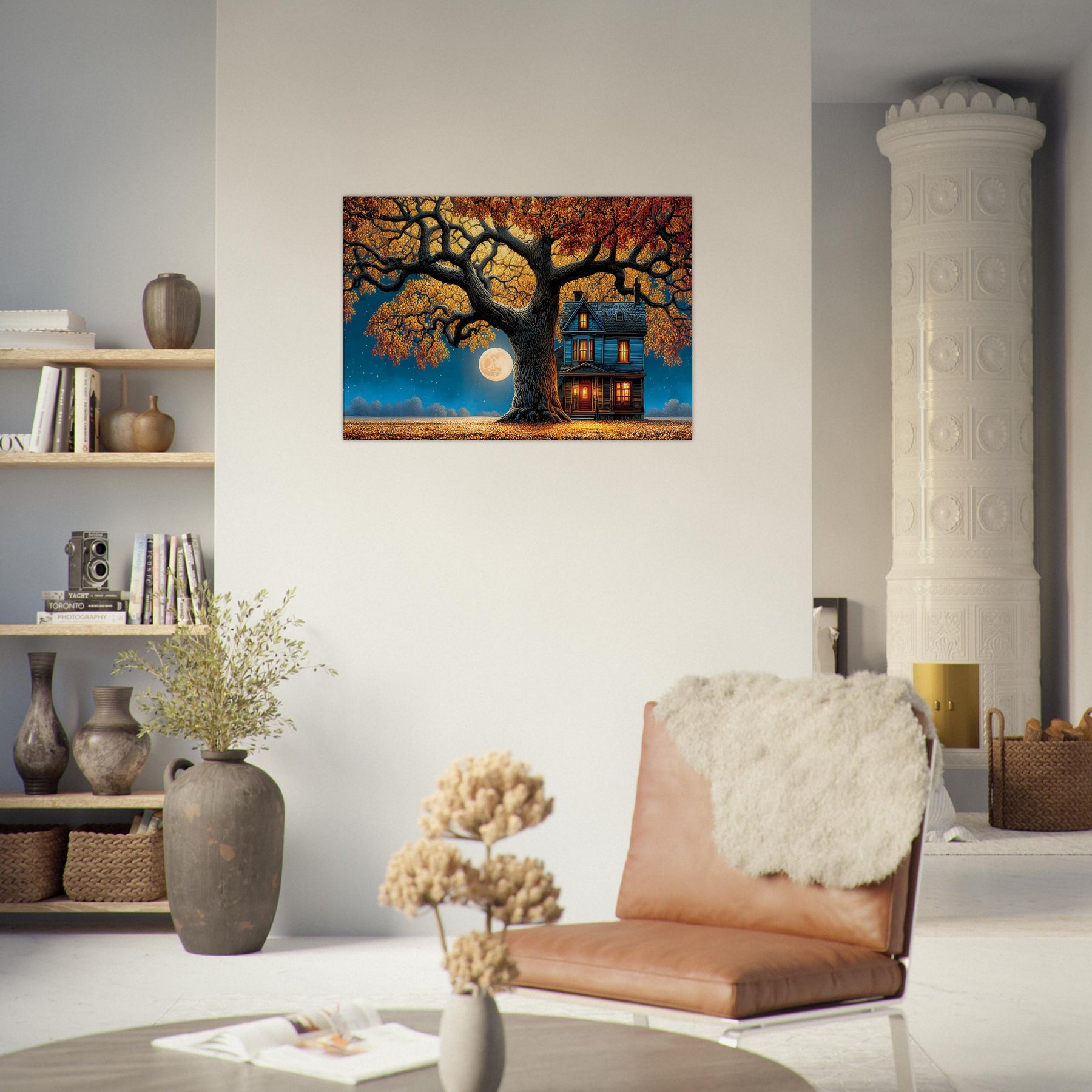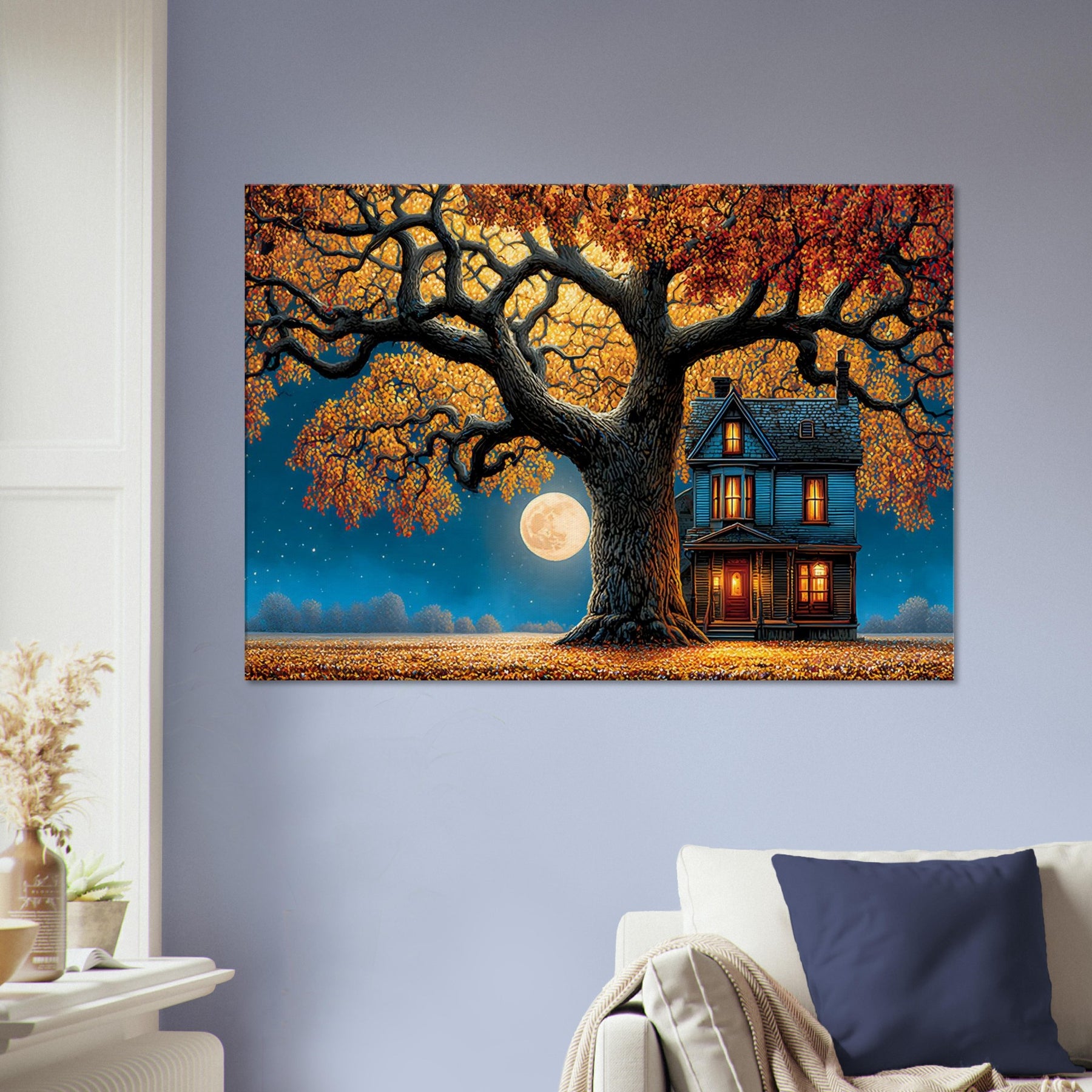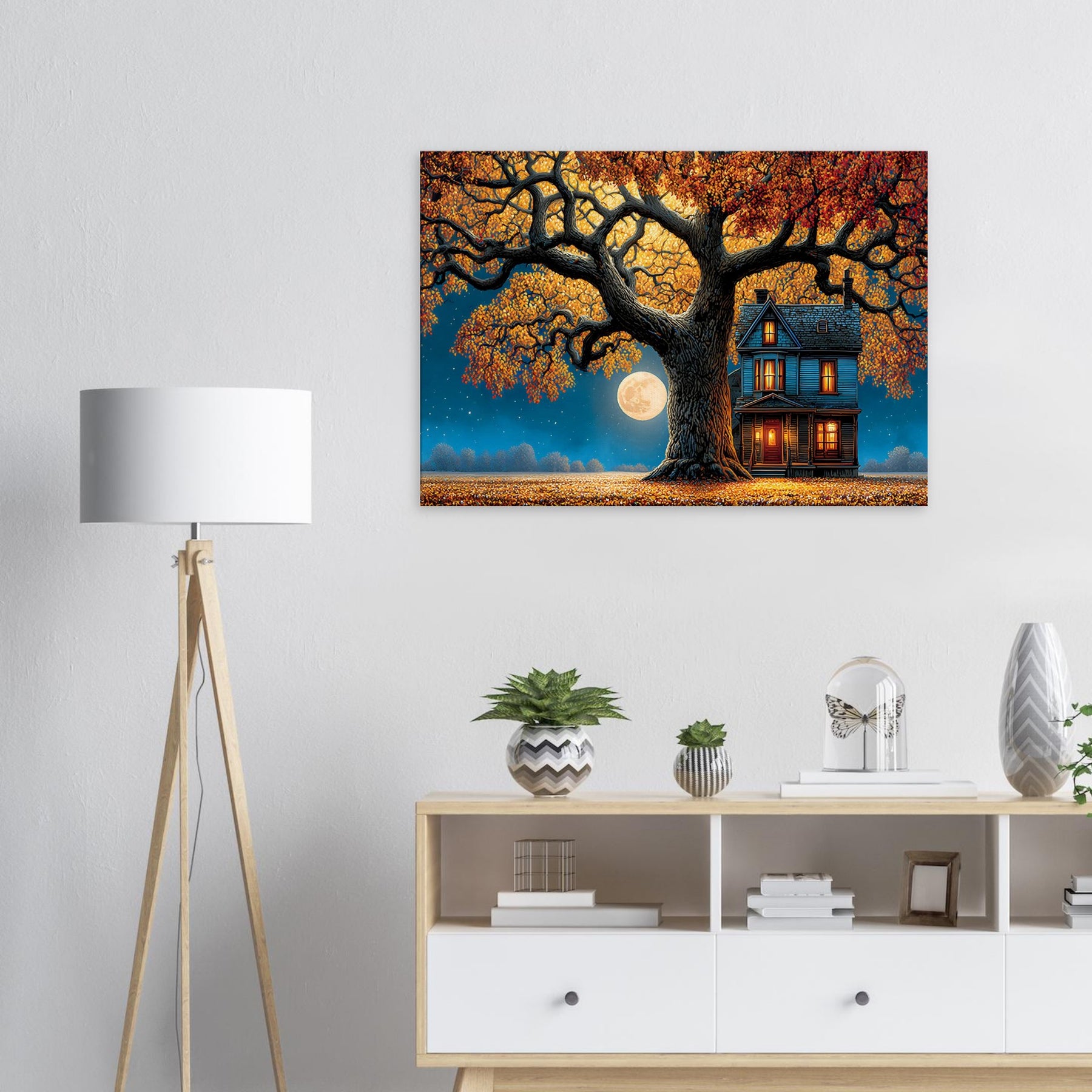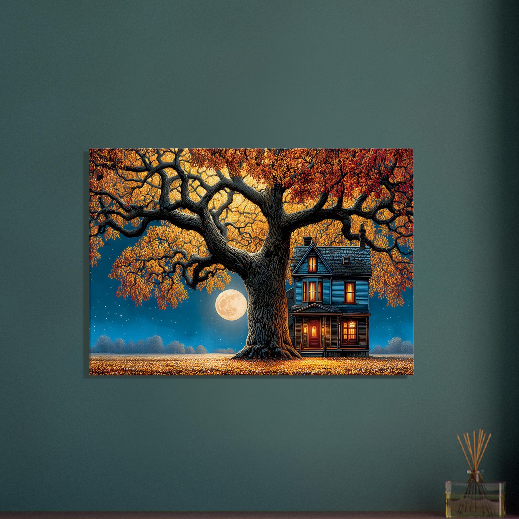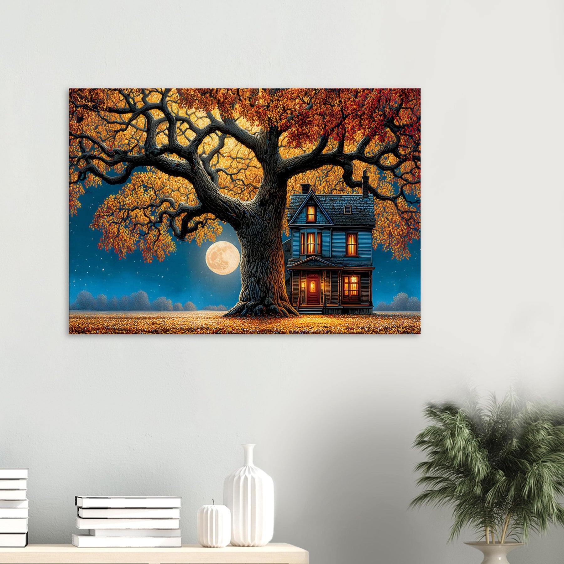 Add warmth and elegance to your walls with the Moonlit Autumn Serenity Canvas Wall Art. This enchanting piece depicts a cozy house tucked beneath a vibrant autumn tree, bathed in the glow of a luminous full moon. The rich textures and painterly depth of canvas bring the scene to life, making it a perfect accent for bedrooms, living rooms, or reading nooks.