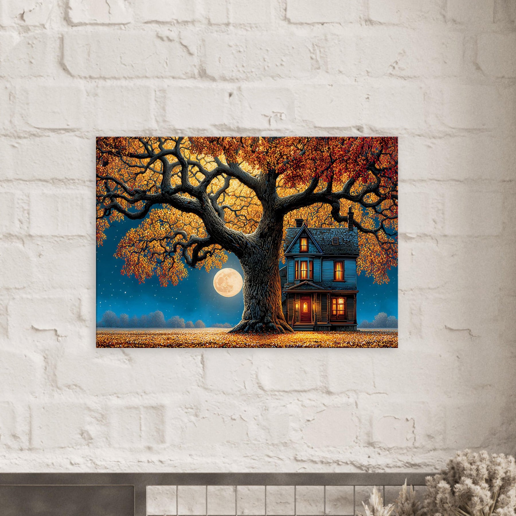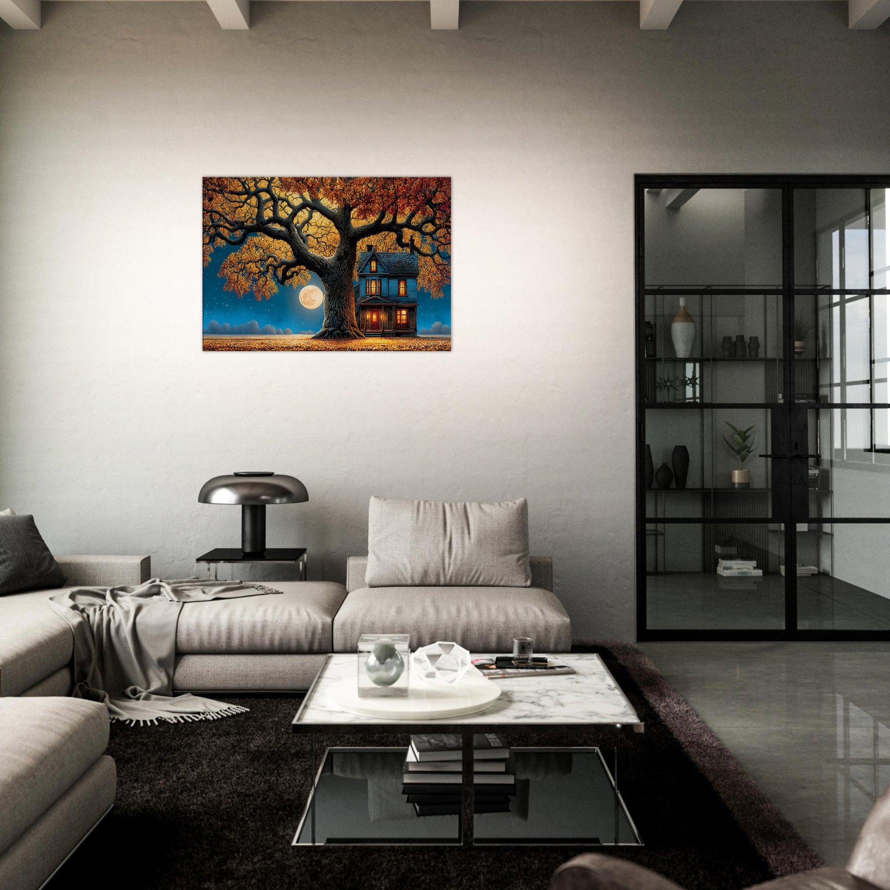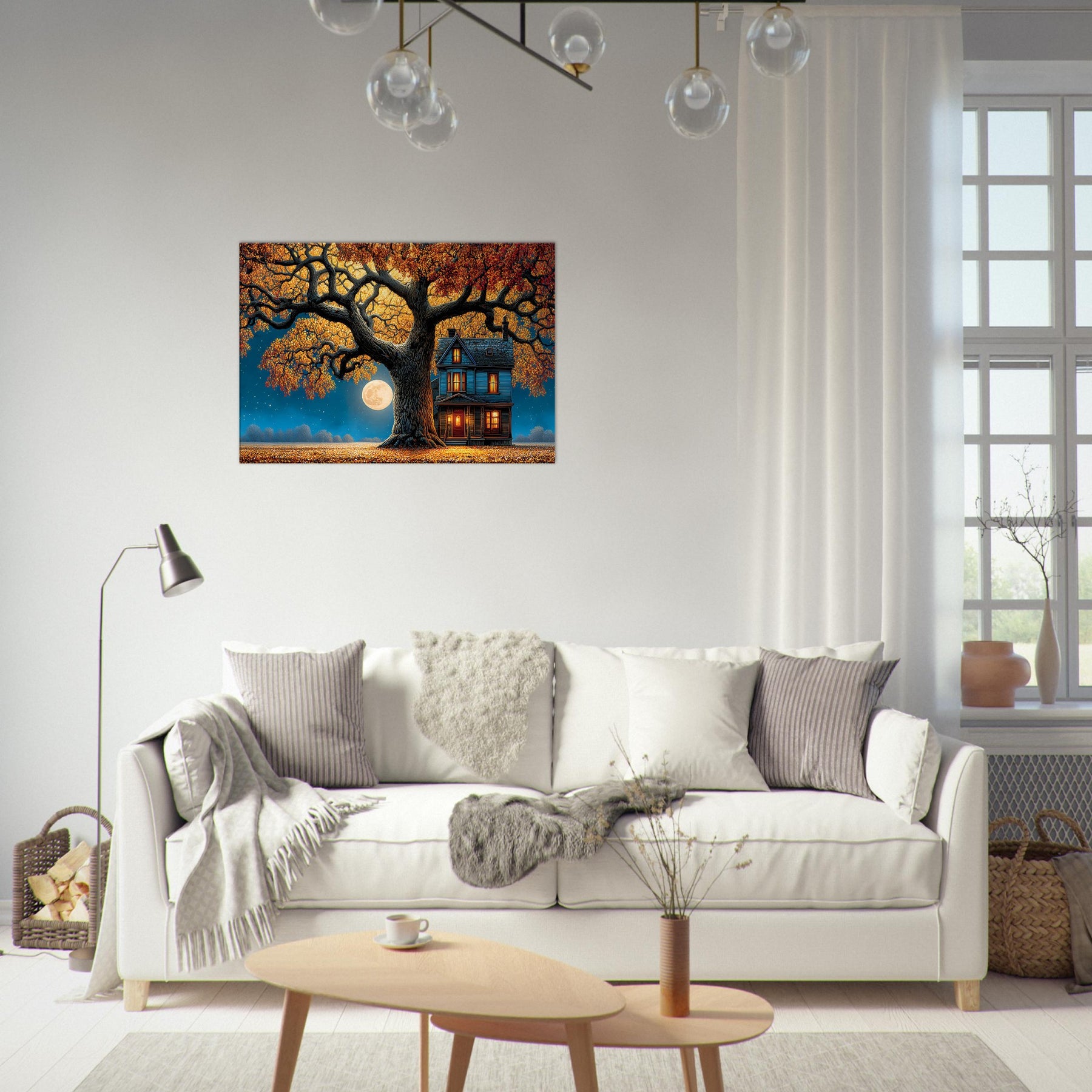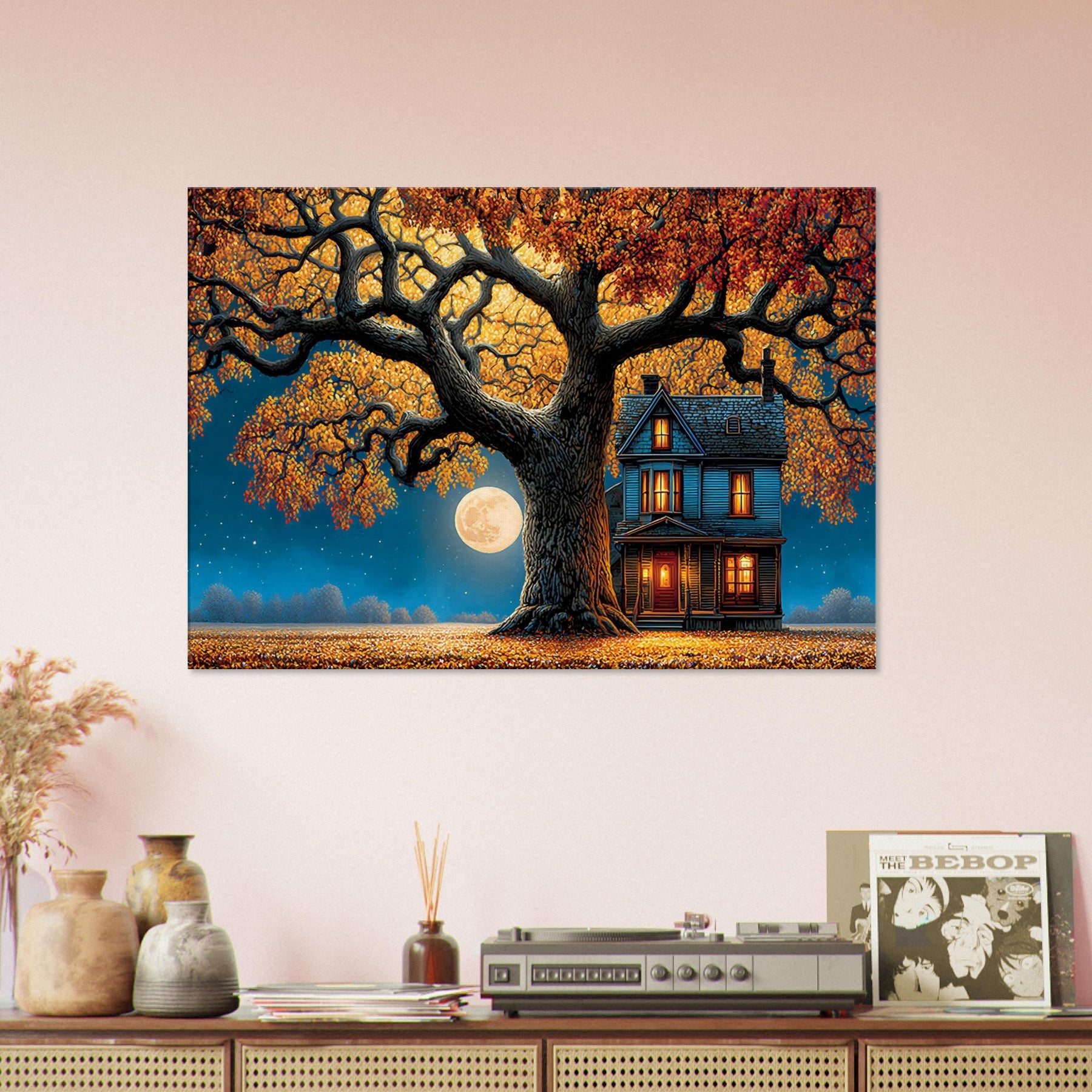 Add warmth and elegance to your walls with the Moonlit Autumn Serenity Canvas Wall Art. This enchanting piece depicts a cozy house tucked beneath a vibrant autumn tree, bathed in the glow of a luminous full moon. The rich textures and painterly depth of canvas bring the scene to life, making it a perfect accent for bedrooms, living rooms, or reading nooks.