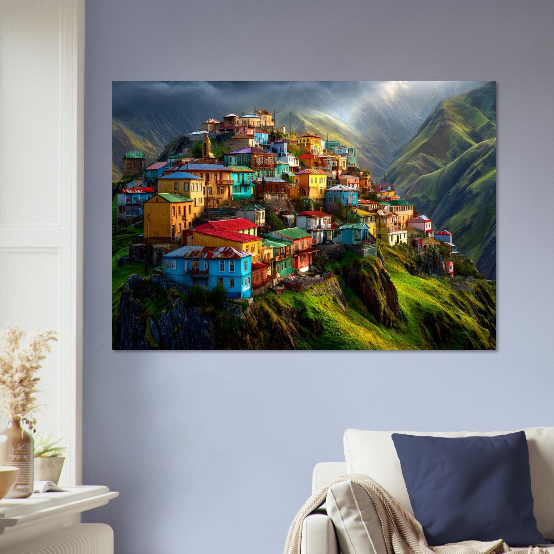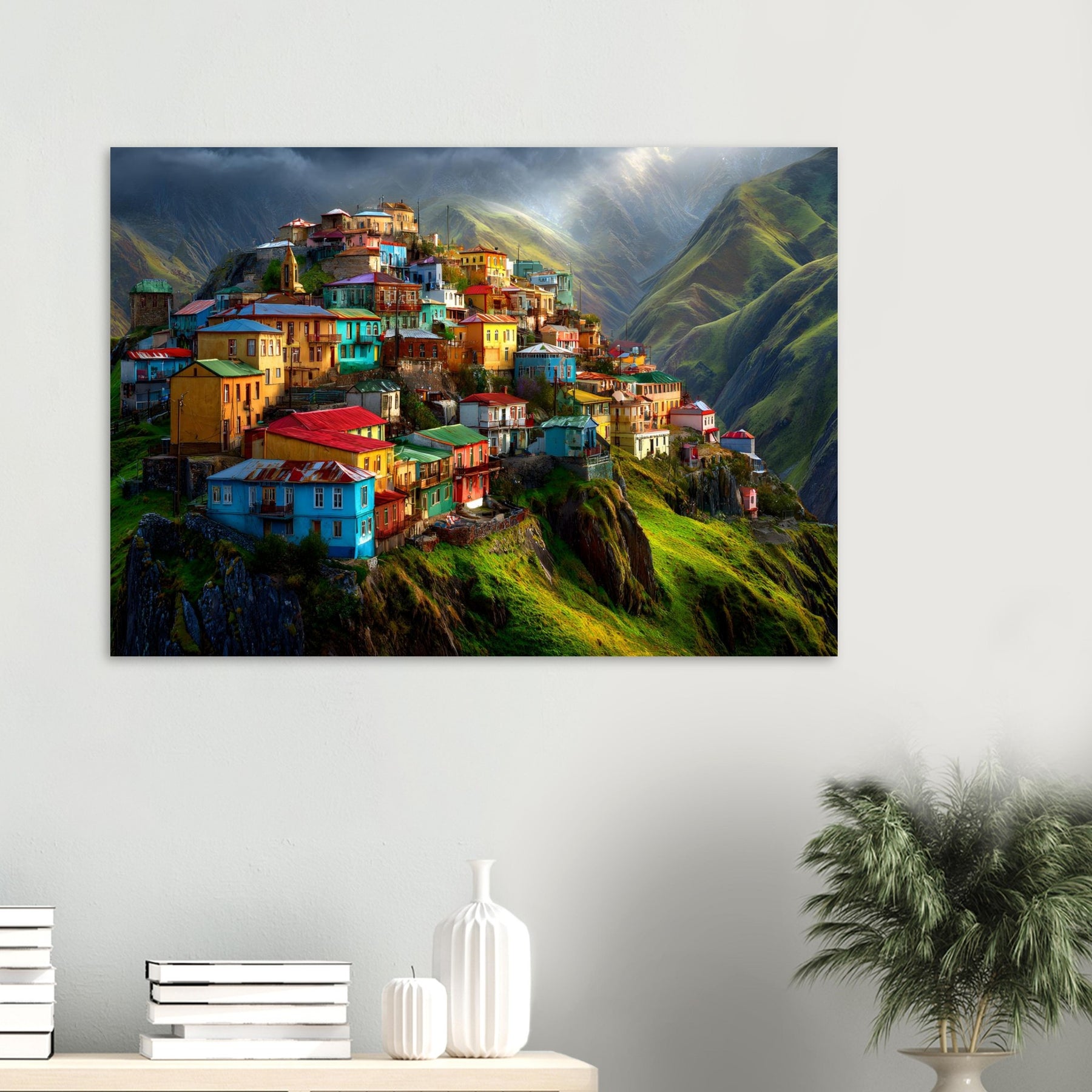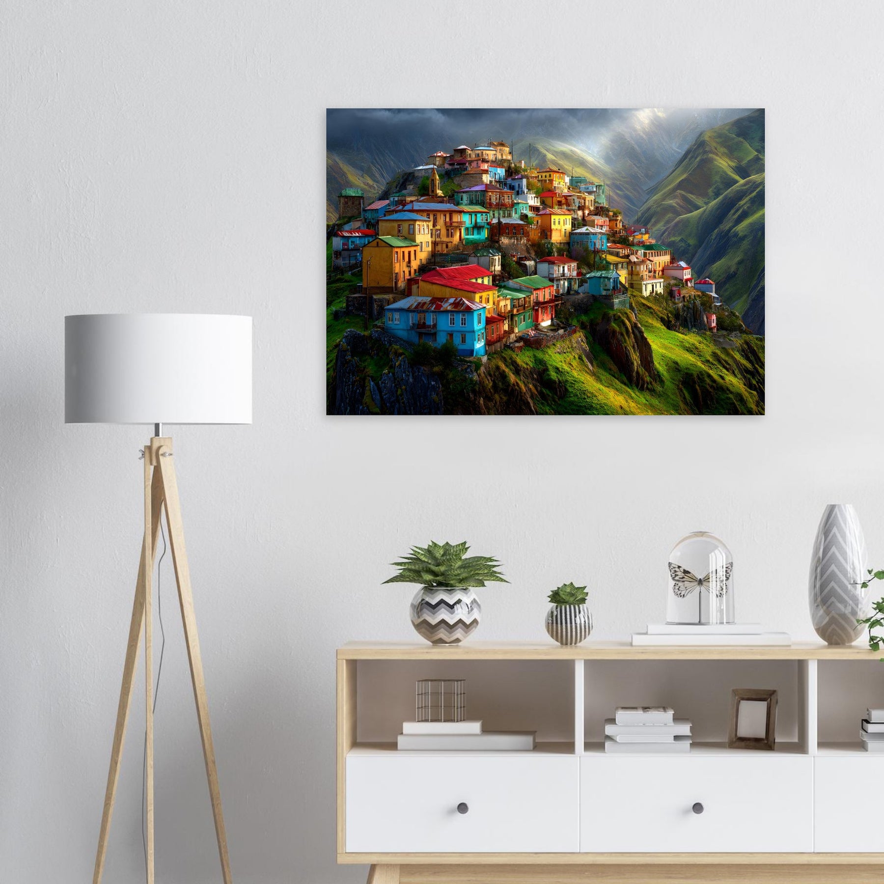 Add a fresh, modern accent with Hillside Harmony Village, a foam wall art featuring a vibrant hillside village built into a dramatic mountain slope. The clean presentation emphasizes color, structure, and landscape while keeping the artwork light and contemporary.