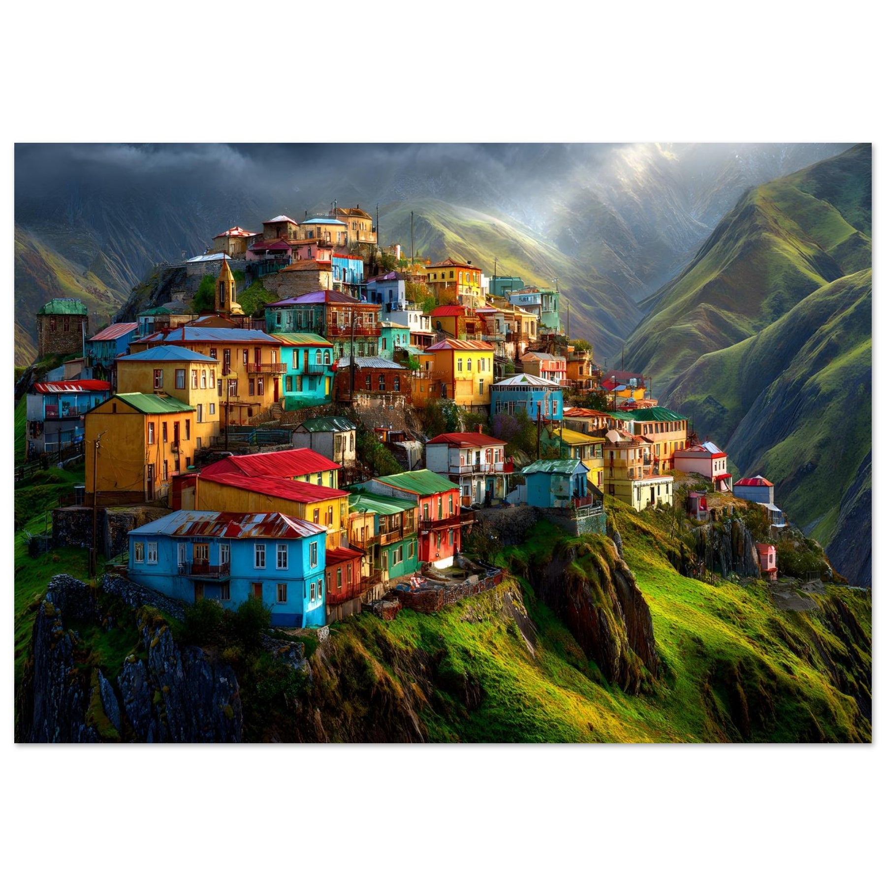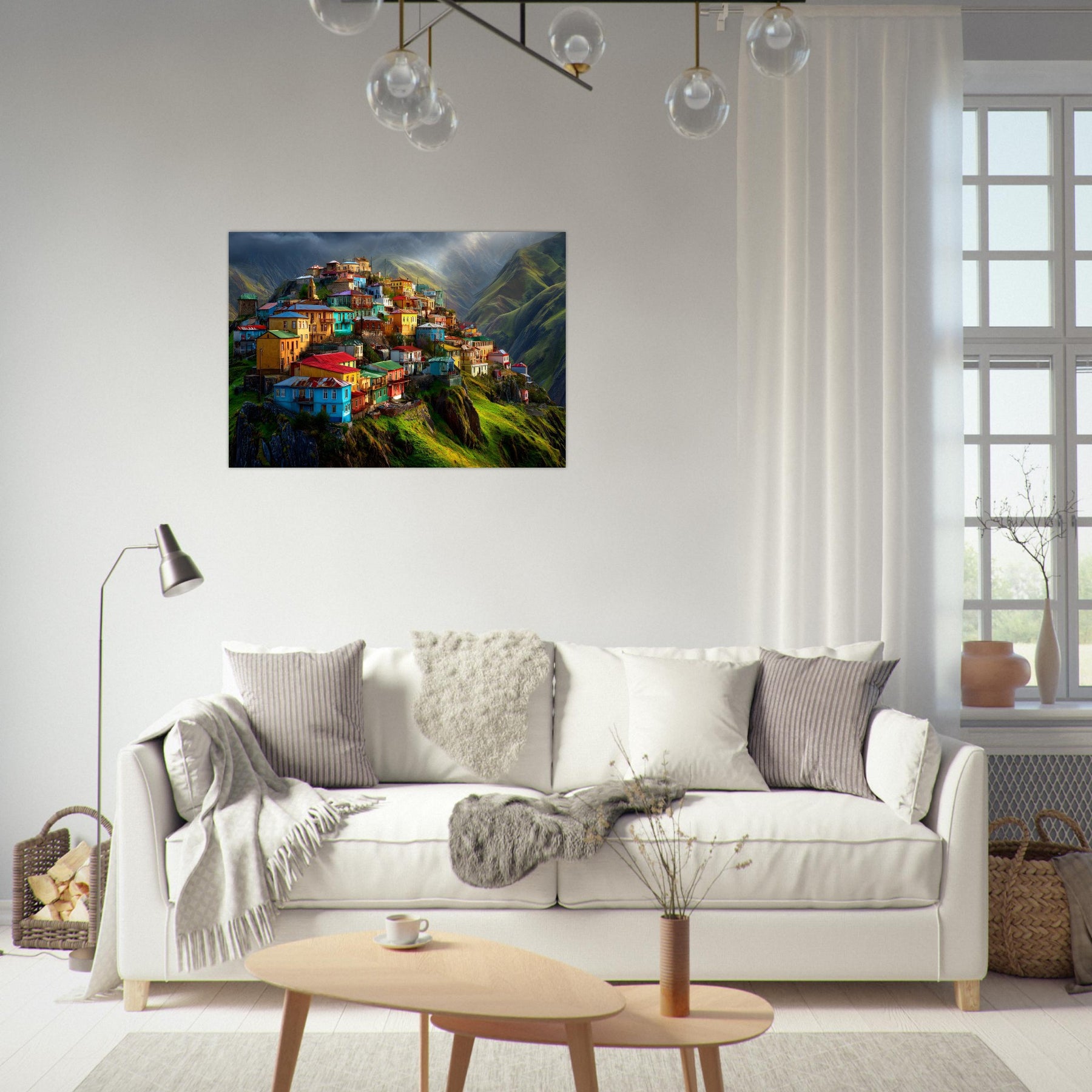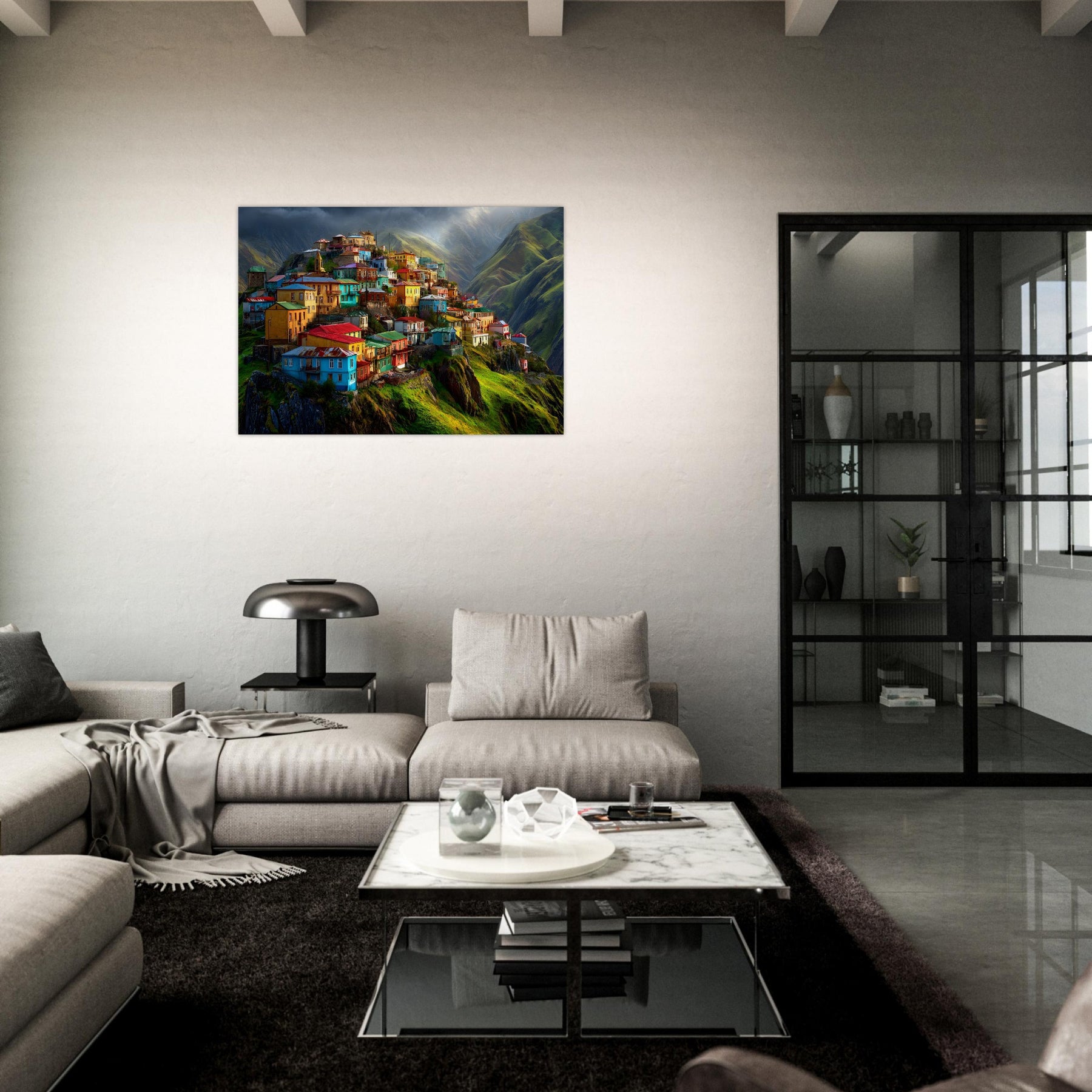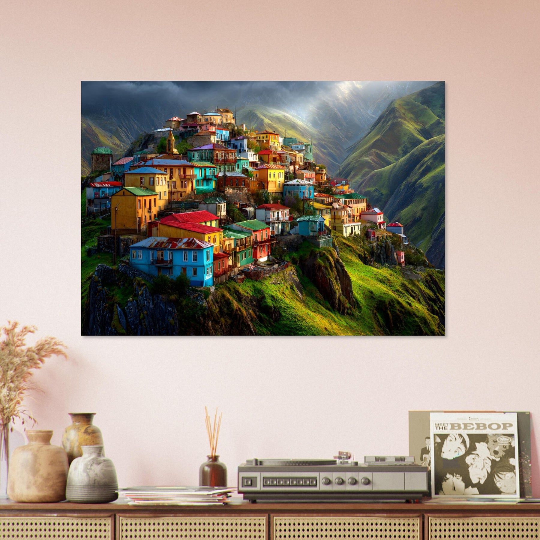 Add a fresh, modern accent with Hillside Harmony Village, a foam wall art featuring a vibrant hillside village built into a dramatic mountain slope. The clean presentation emphasizes color, structure, and landscape while keeping the artwork light and contemporary.