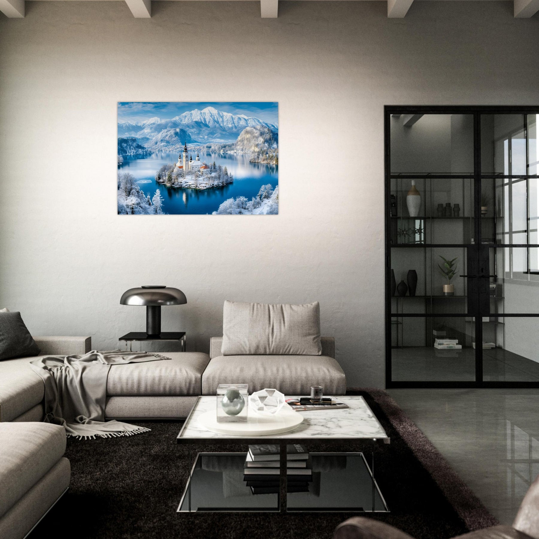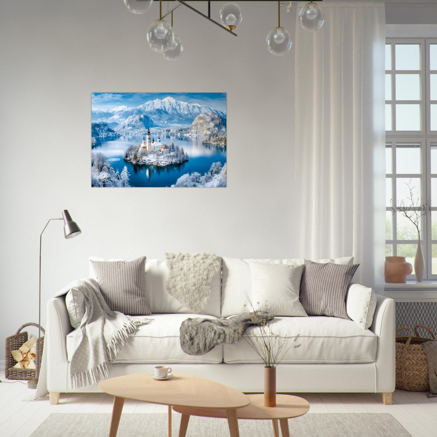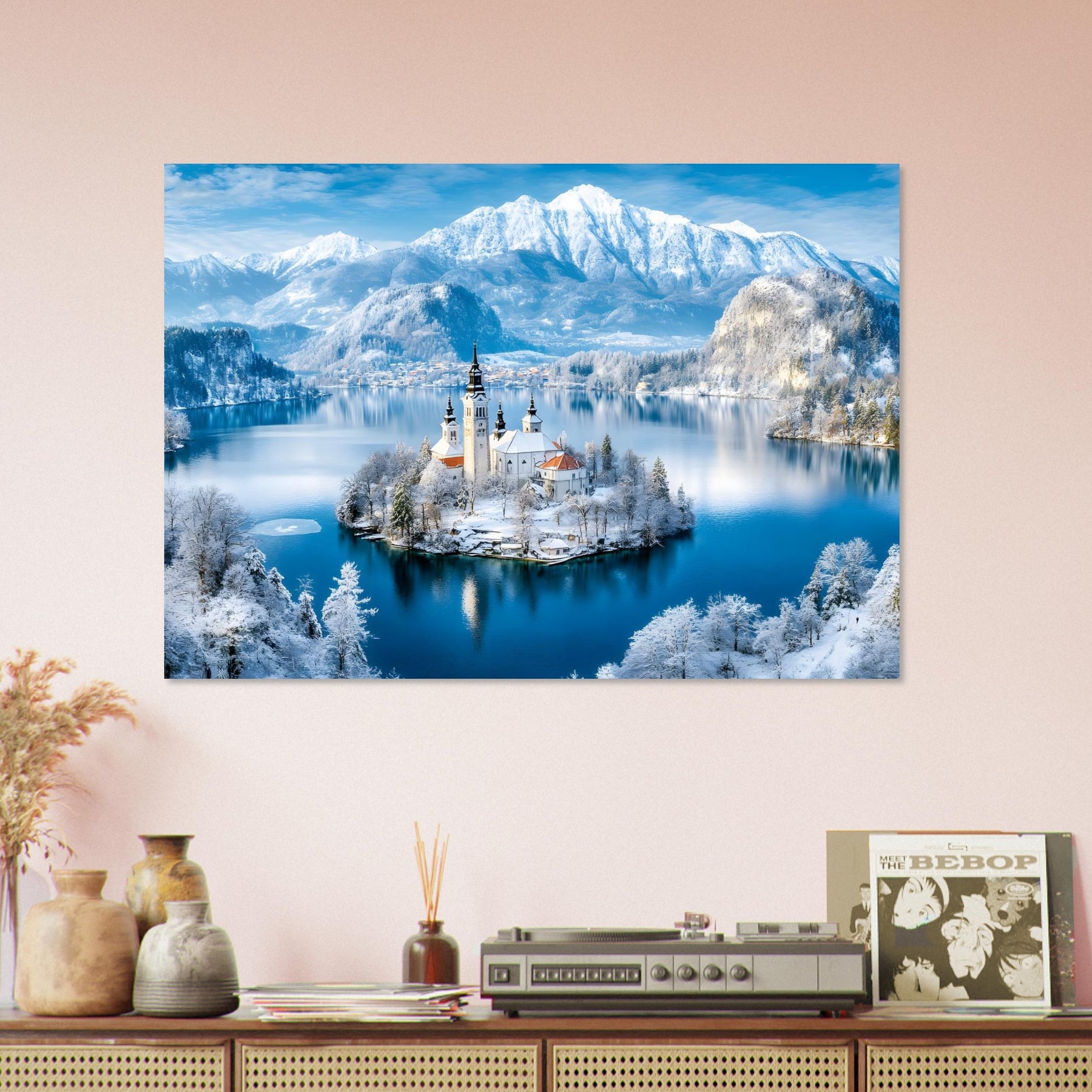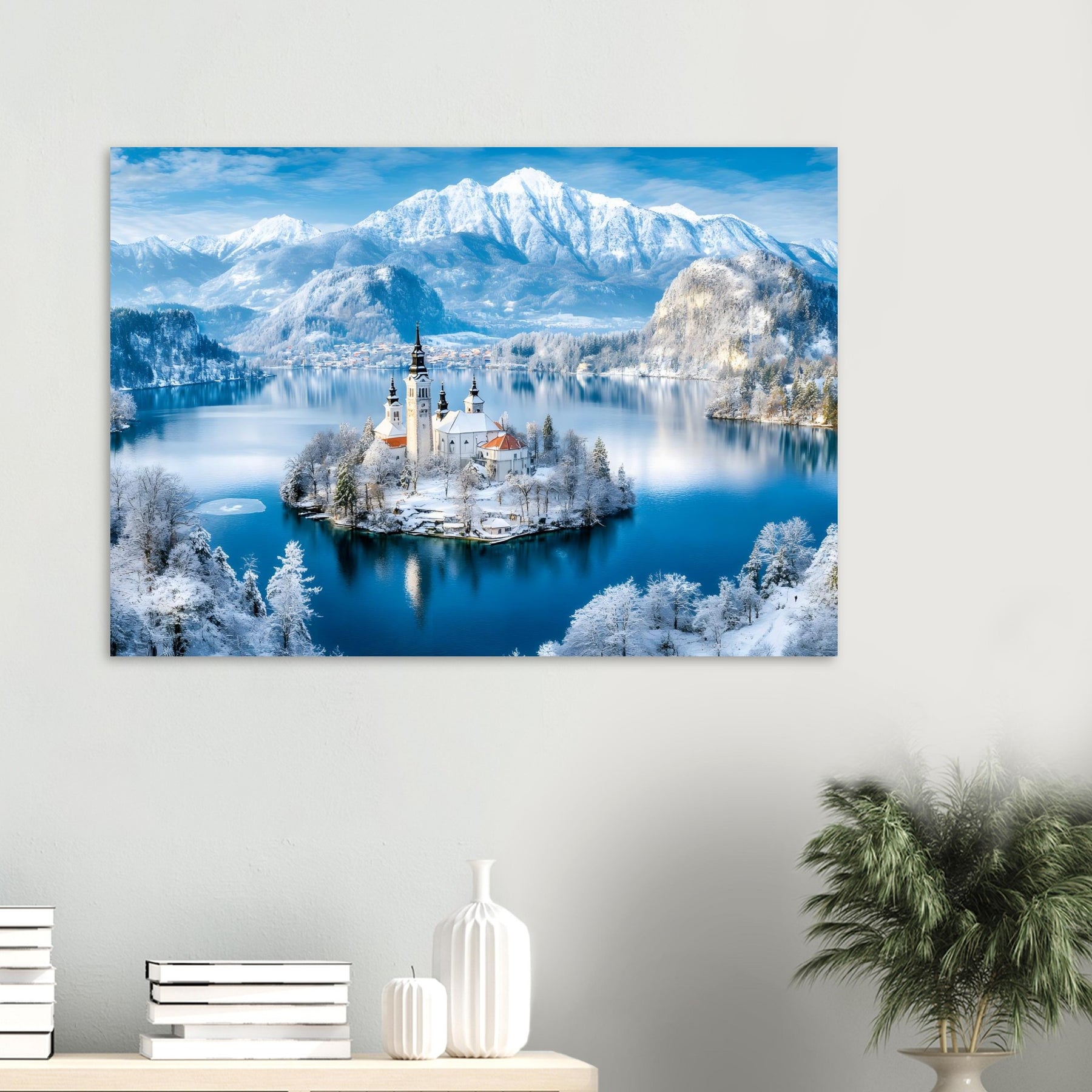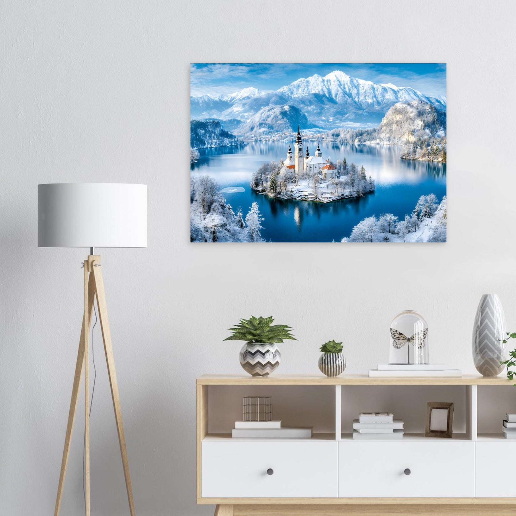 Transform your space with Winter Enchantment, a modern foam wall art piece showcasing Lake Bled’s island church set within a tranquil winter landscape. The lightweight matte finish highlights the serene tones and crisp details while maintaining a clean, contemporary look.