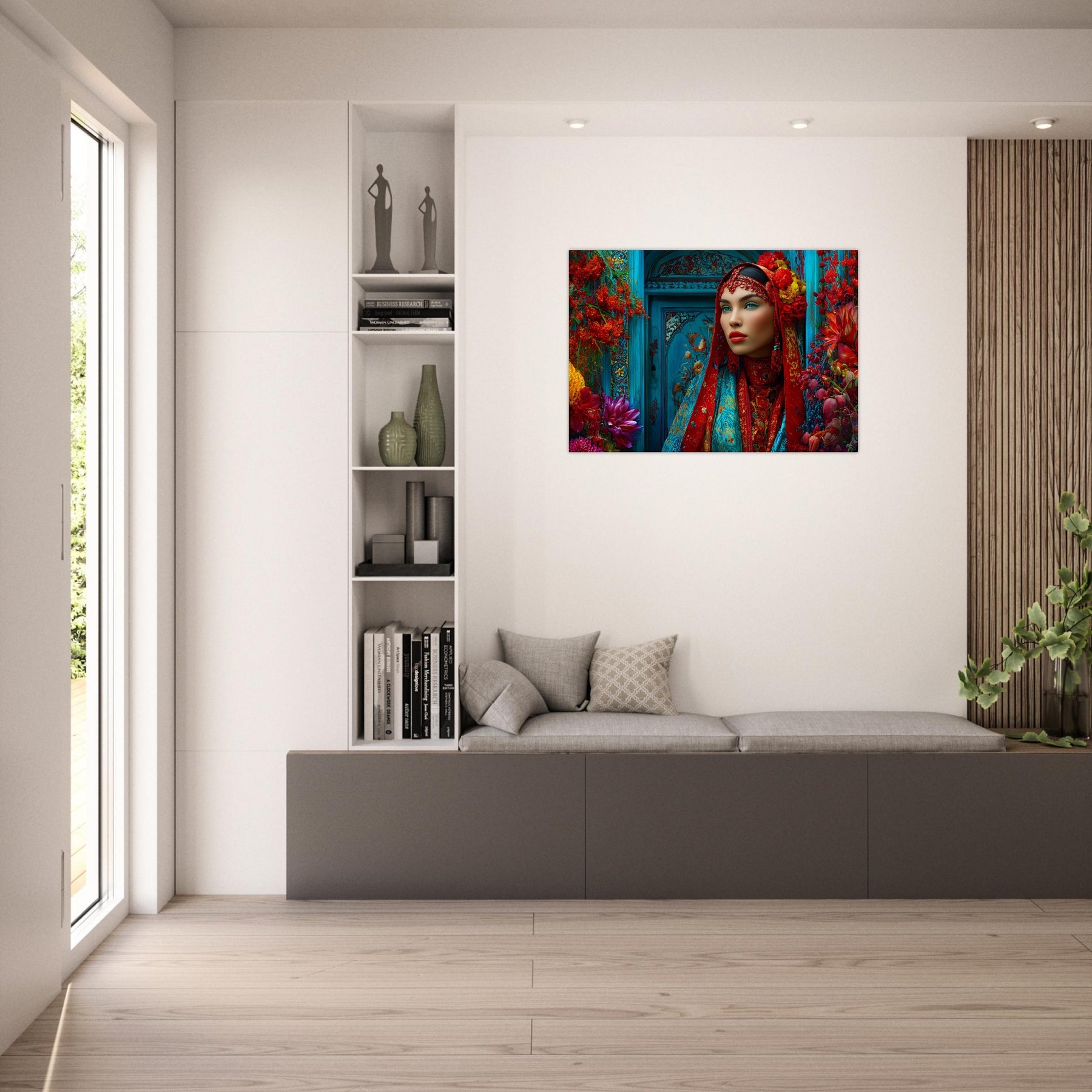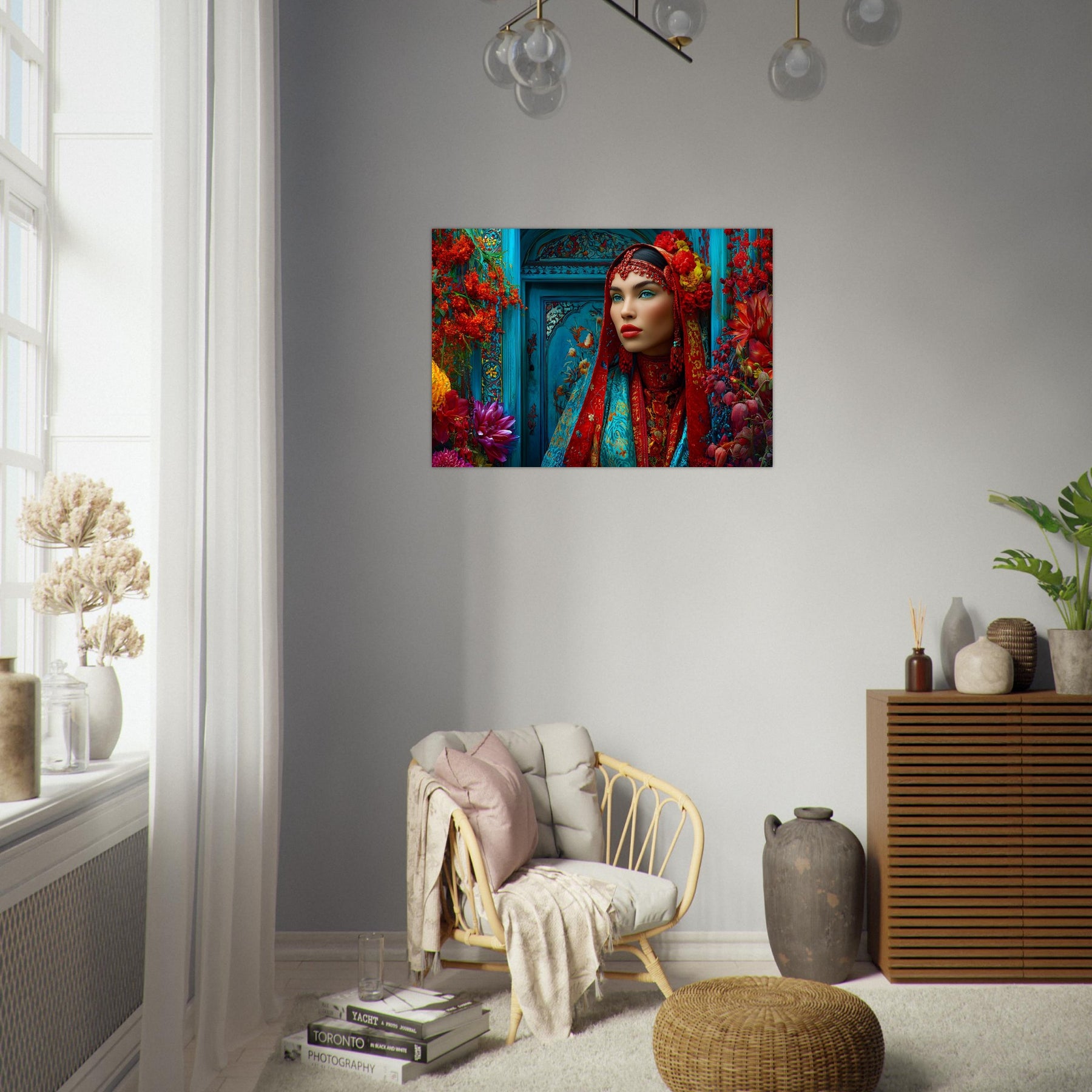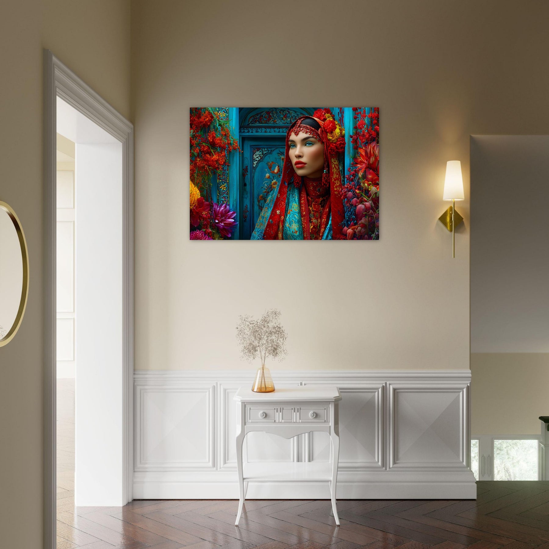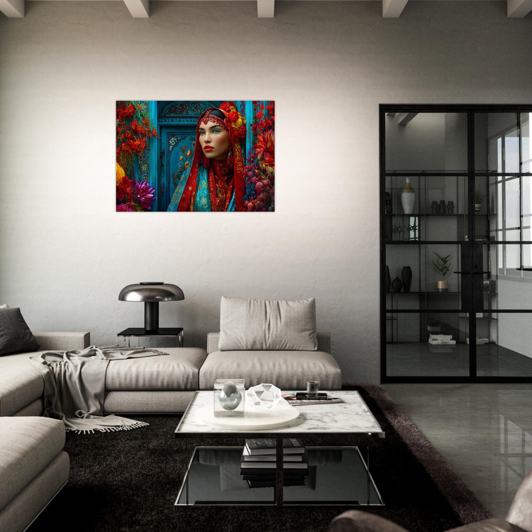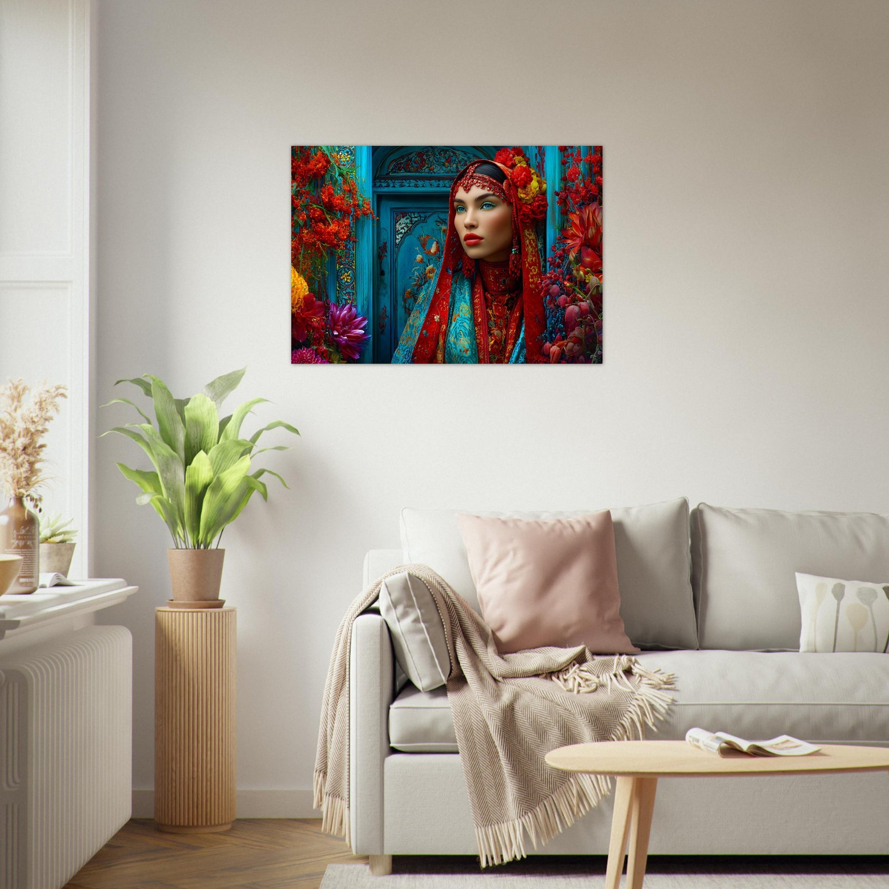 Bring modern flair and vivid style into your space with our Floral Elegance Foam Wall Art. Featuring a striking woman in colorful floral attire, this lightweight design highlights her elegance and cultural richness with bold colors and detailed textures. Sleek and frameless, the foam board print is easy to hang, making it a perfect fit for any contemporary space.