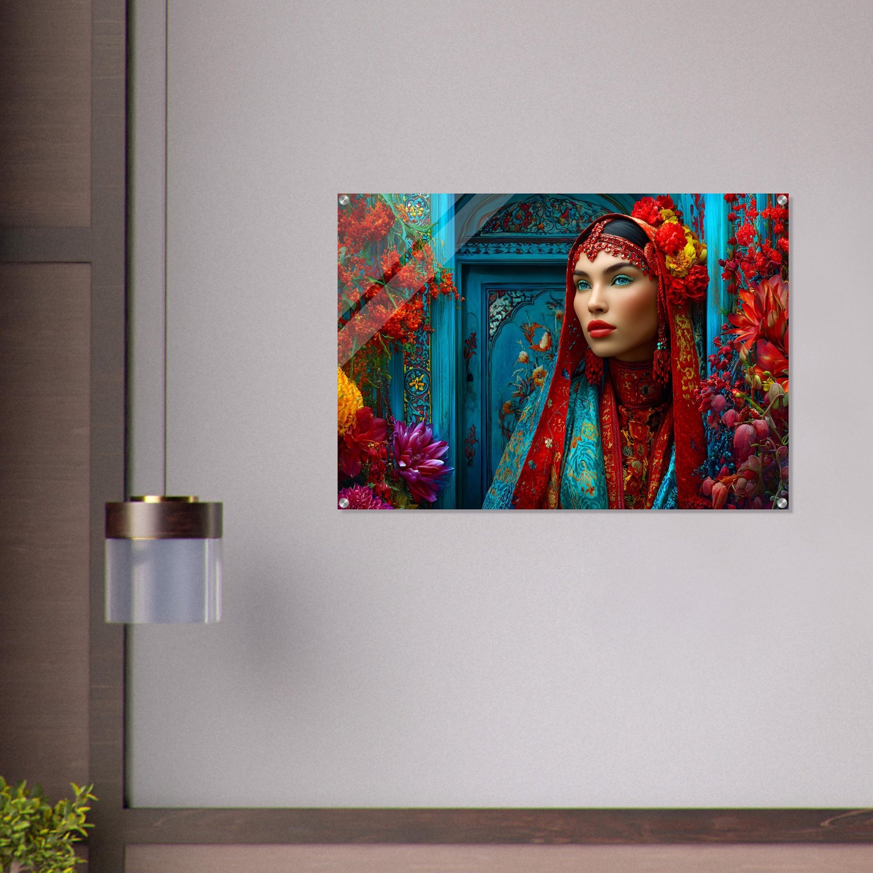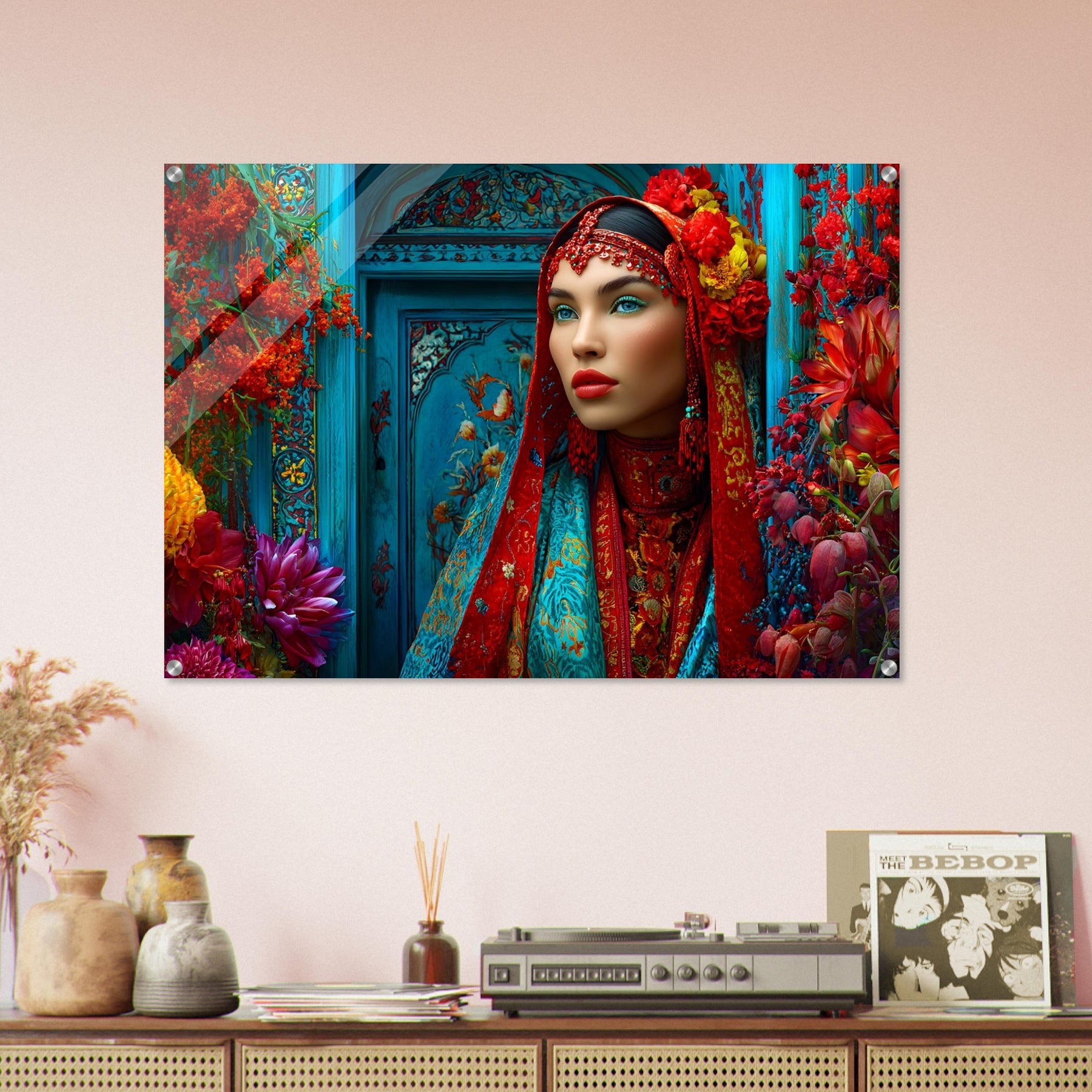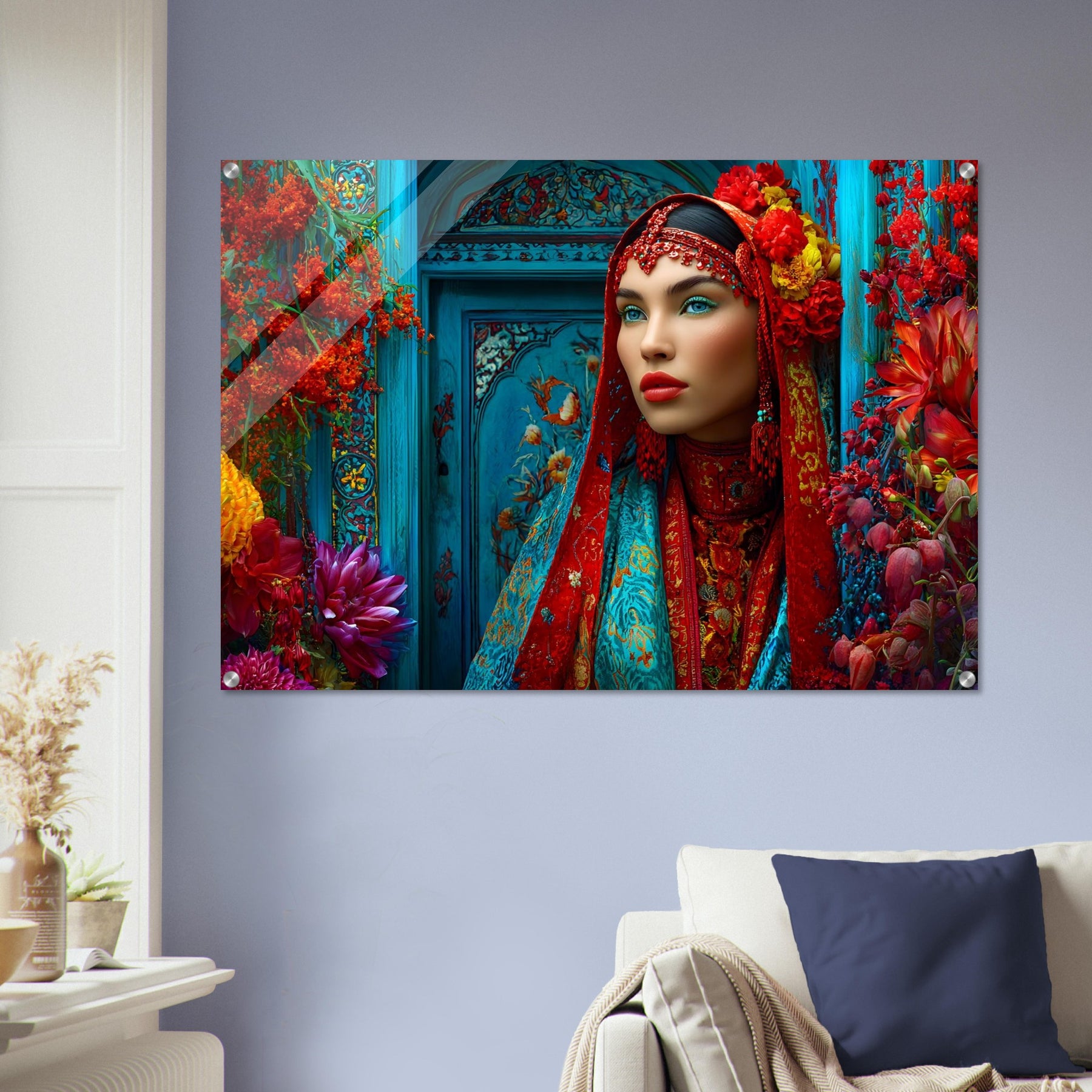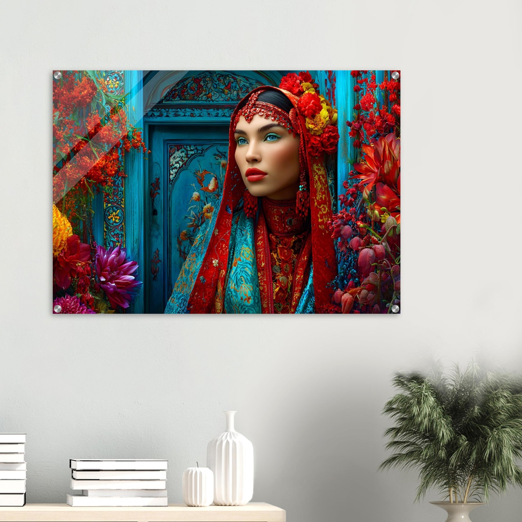 Elevate your décor with the brilliance of our Floral Elegance Acrylic Wall Art. This radiant portrait of a woman in vibrant floral attire glows with intricate patterns and striking colors, embodying elegance, tradition, and grace. The glossy acrylic finish enhances the depth and vibrancy, making it a captivating centerpiece for any room.