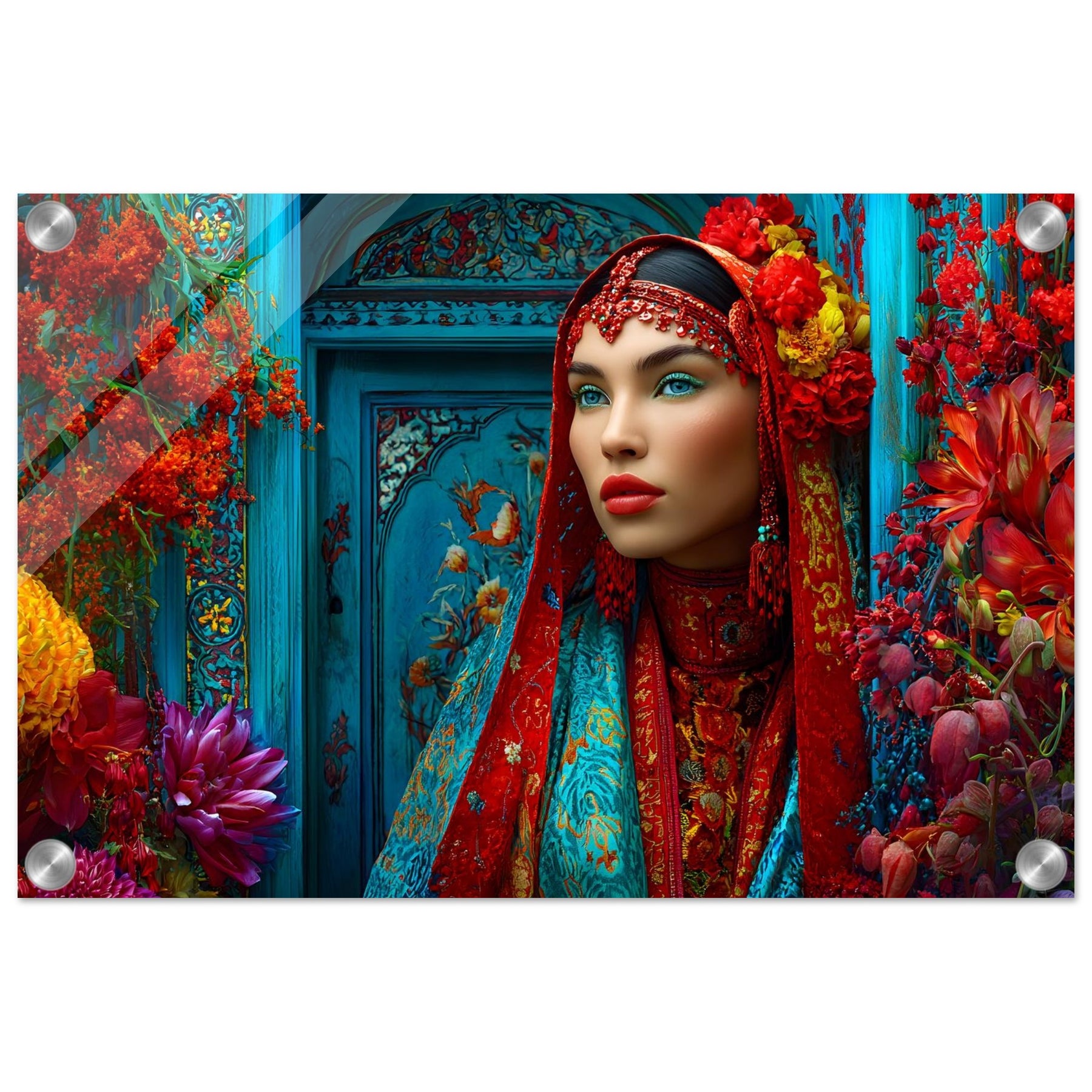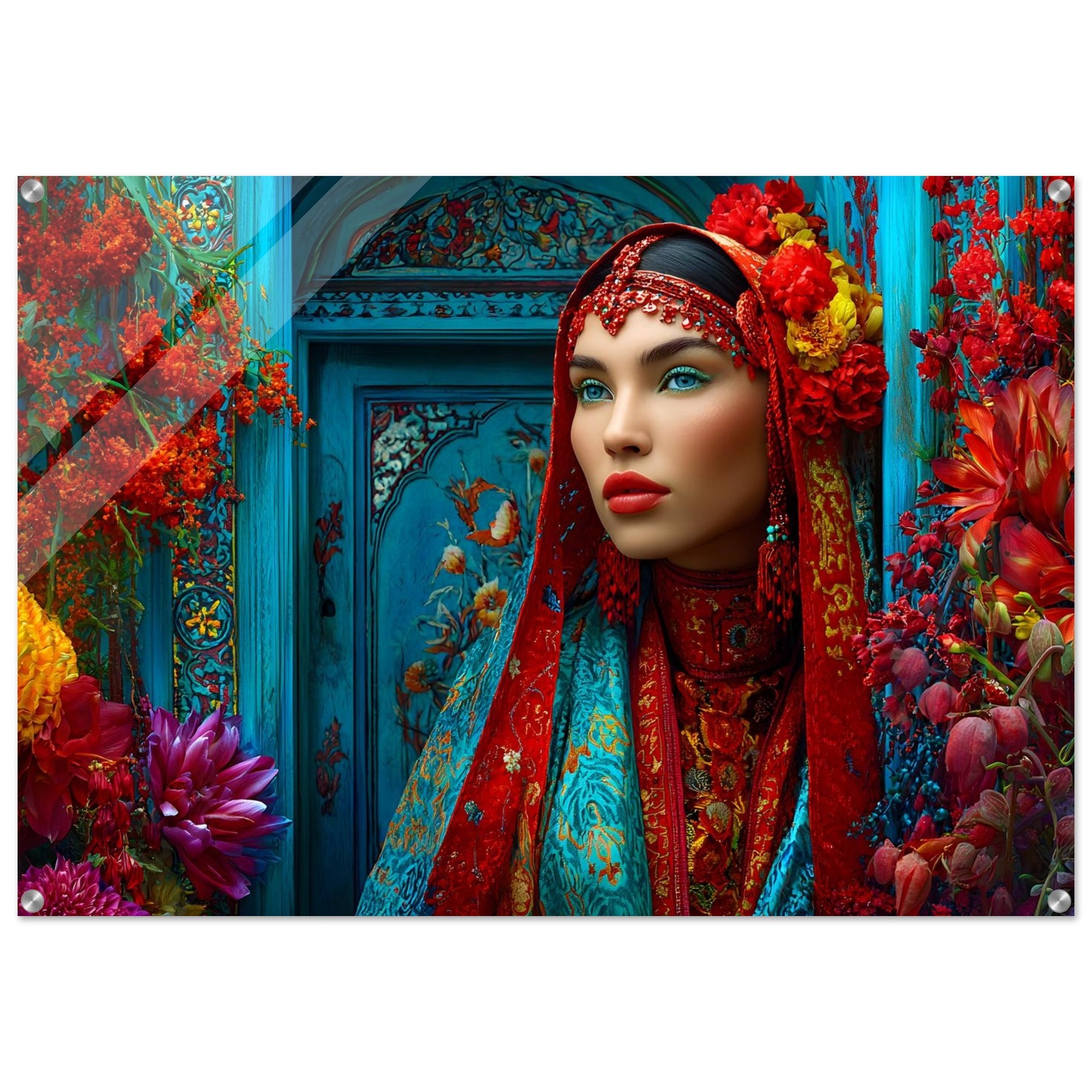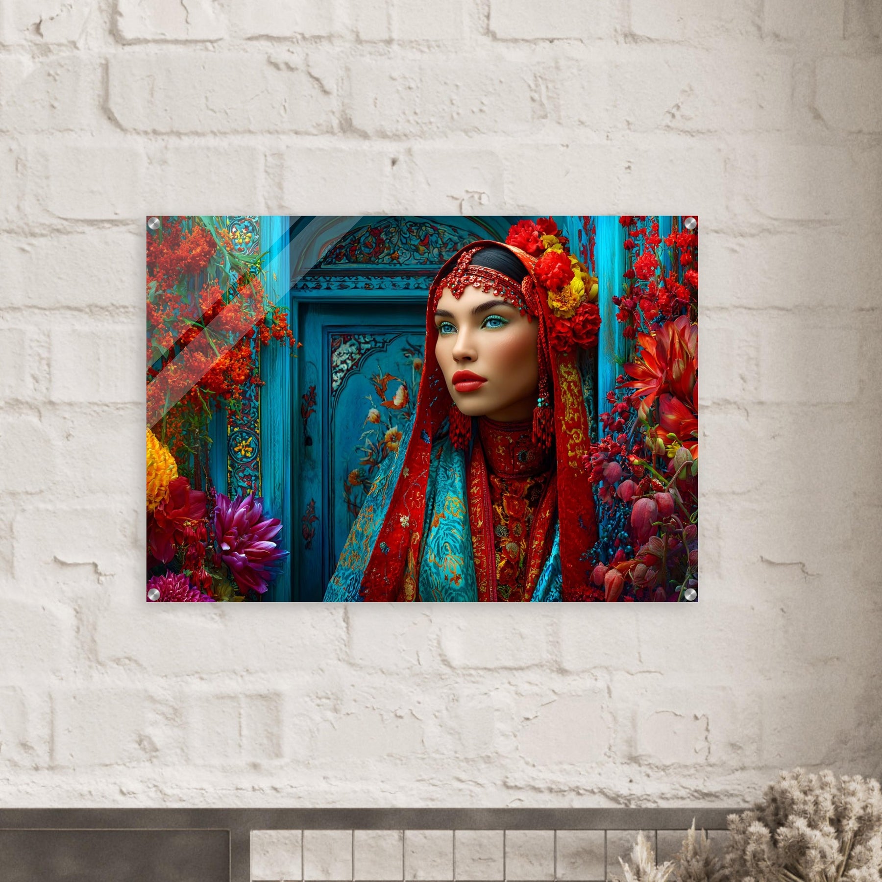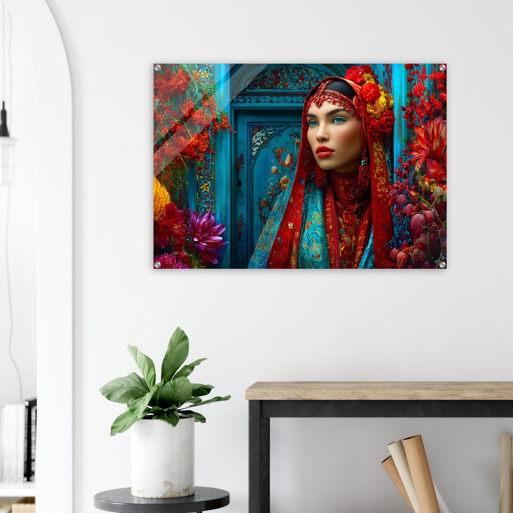 Elevate your décor with the brilliance of our Floral Elegance Acrylic Wall Art. This radiant portrait of a woman in vibrant floral attire glows with intricate patterns and striking colors, embodying elegance, tradition, and grace. The glossy acrylic finish enhances the depth and vibrancy, making it a captivating centerpiece for any room.