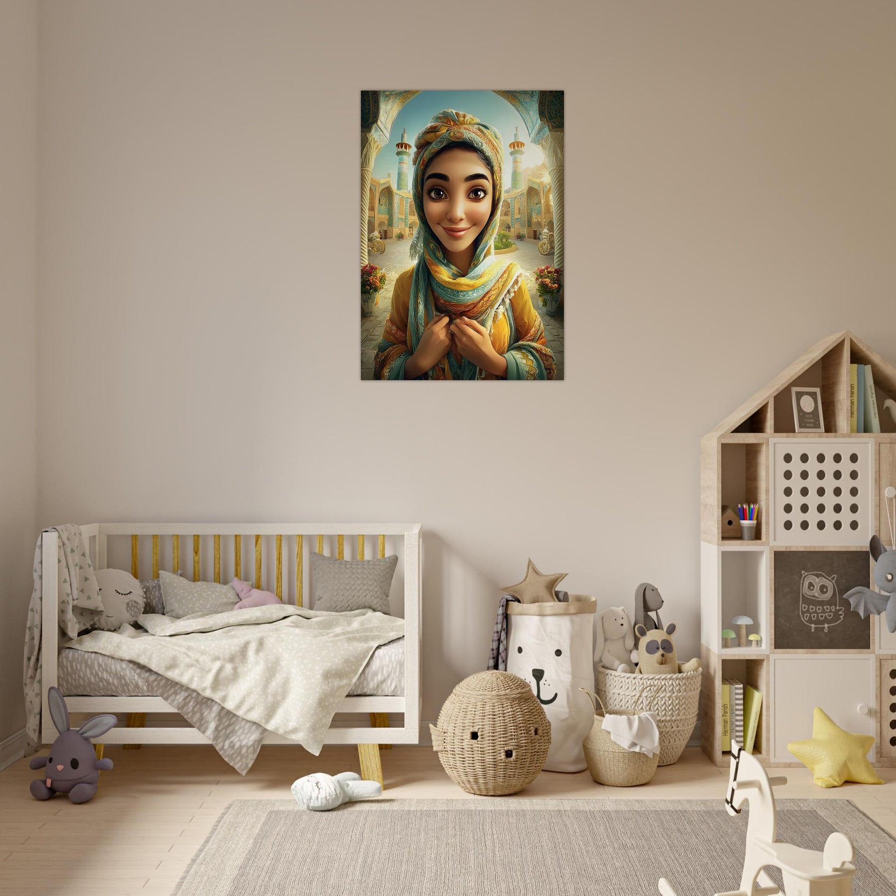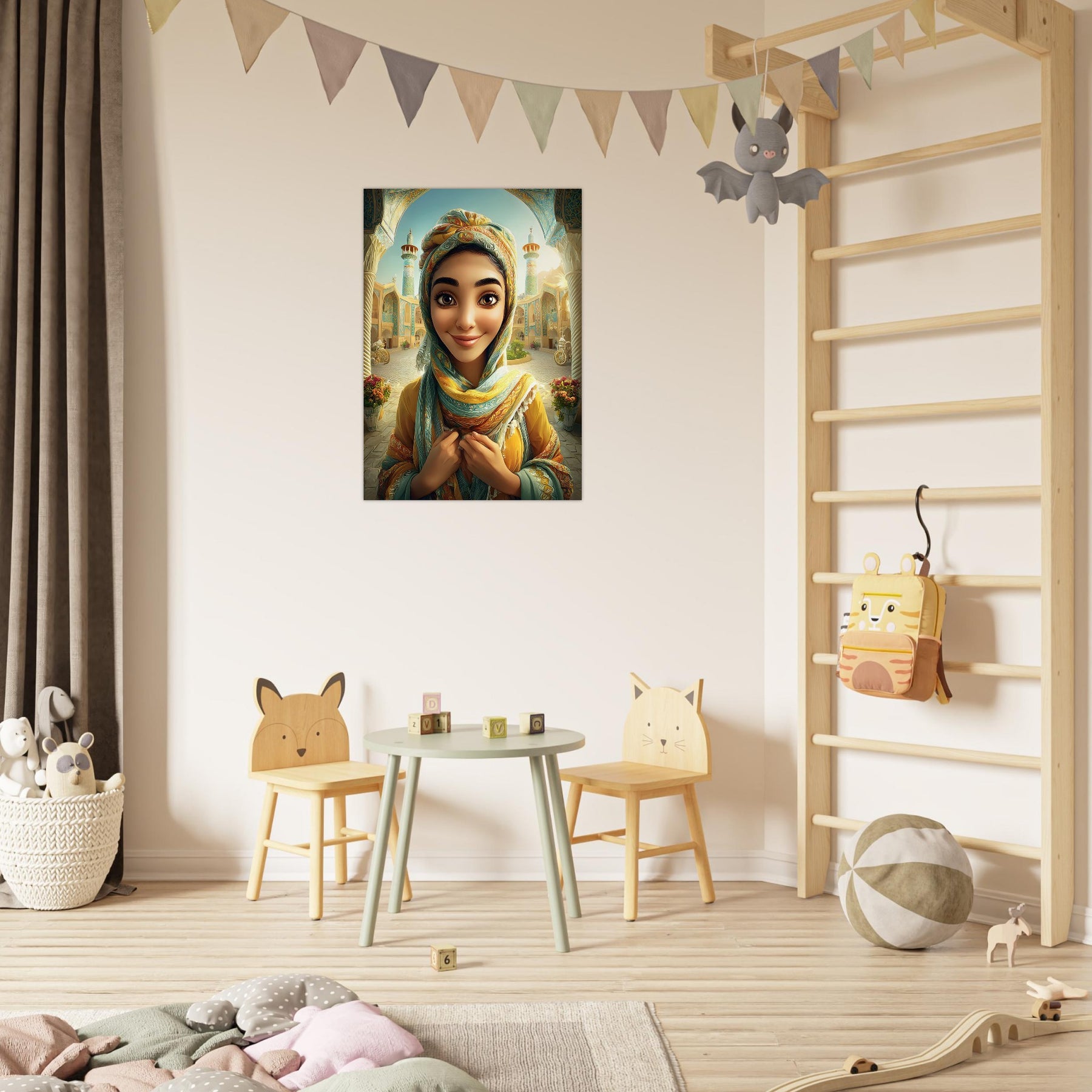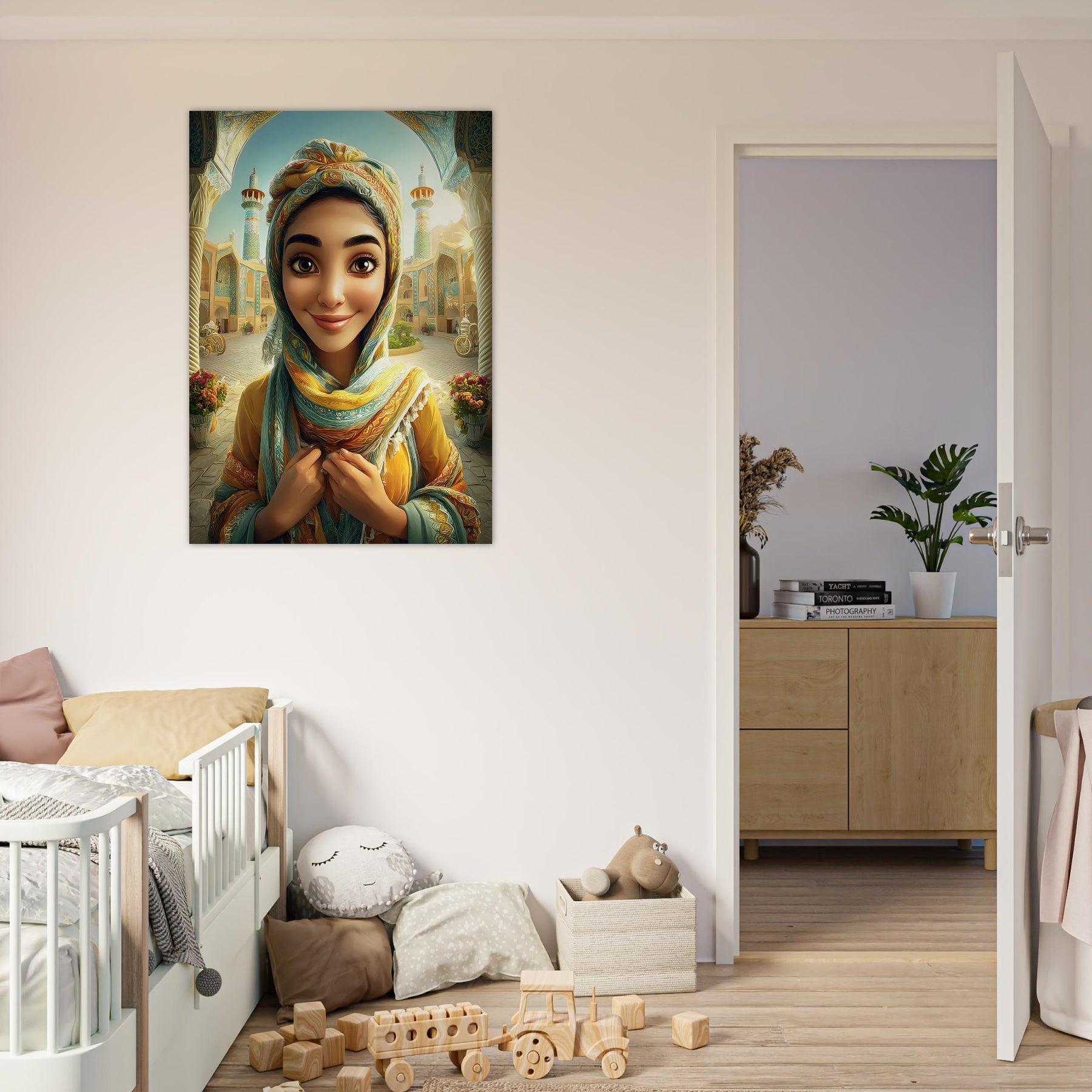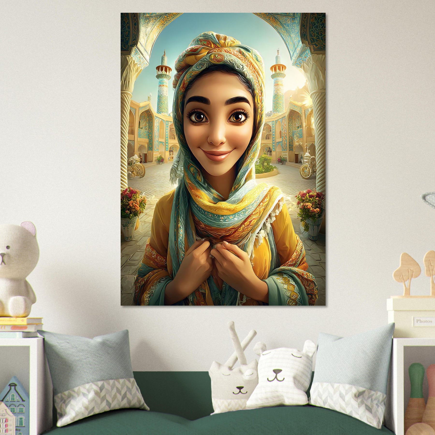 Infuse your child’s room with color, culture, and charm with our Cultural Grace Aluminum Wall Art. This captivating illustration features a whimsical young woman dressed in colorful traditional attire, standing gracefully before a stunning architectural backdrop that celebrates heritage, elegance, and timeless beauty.