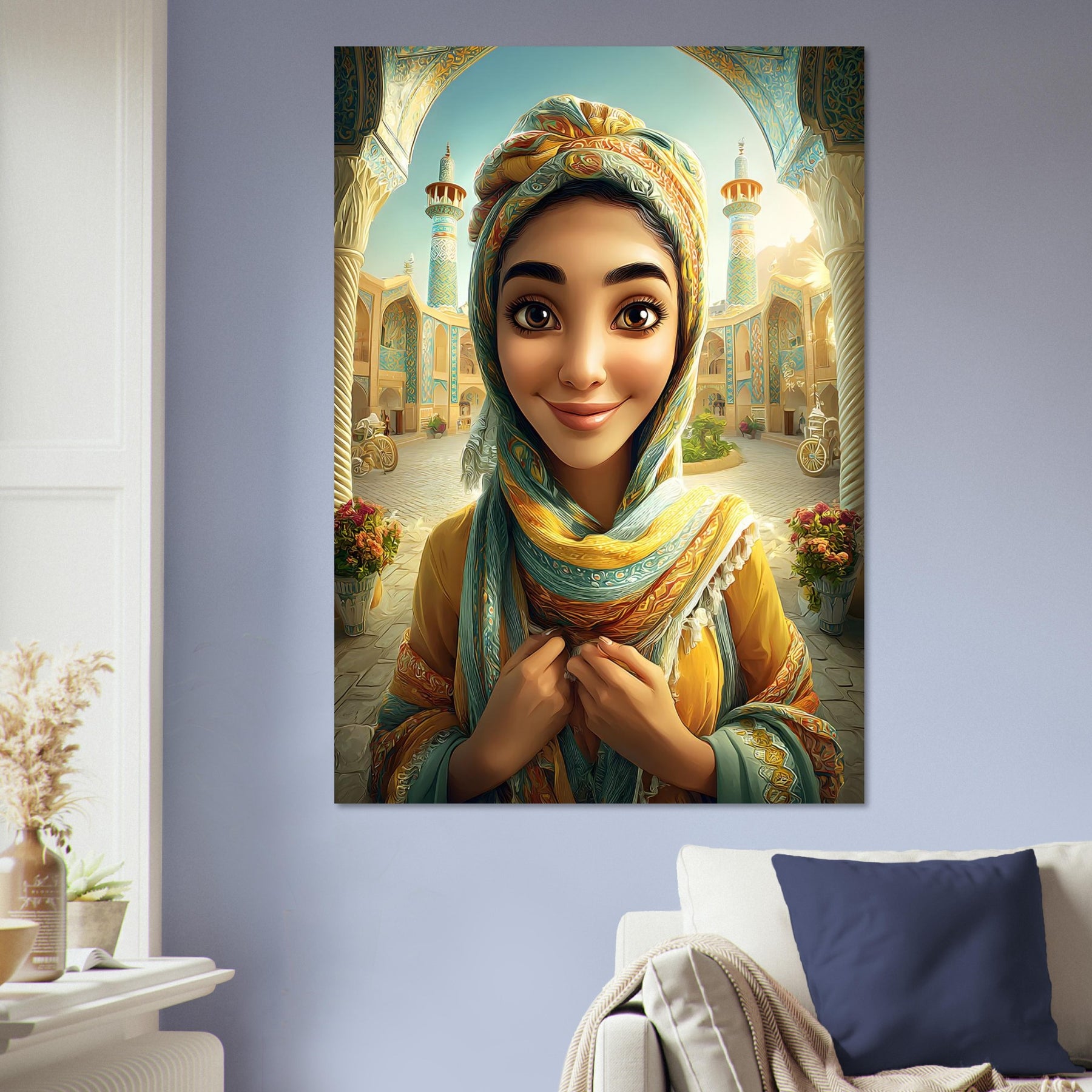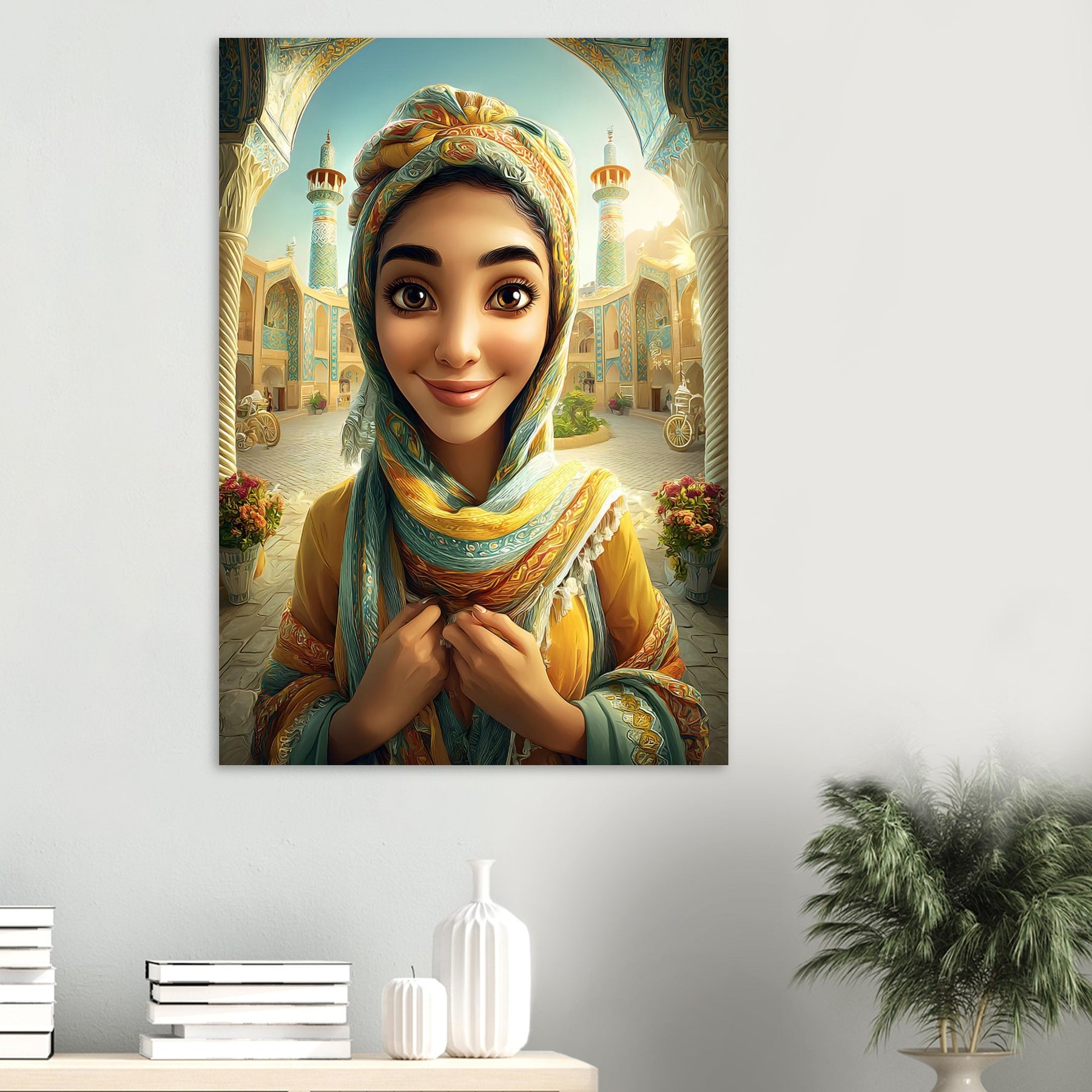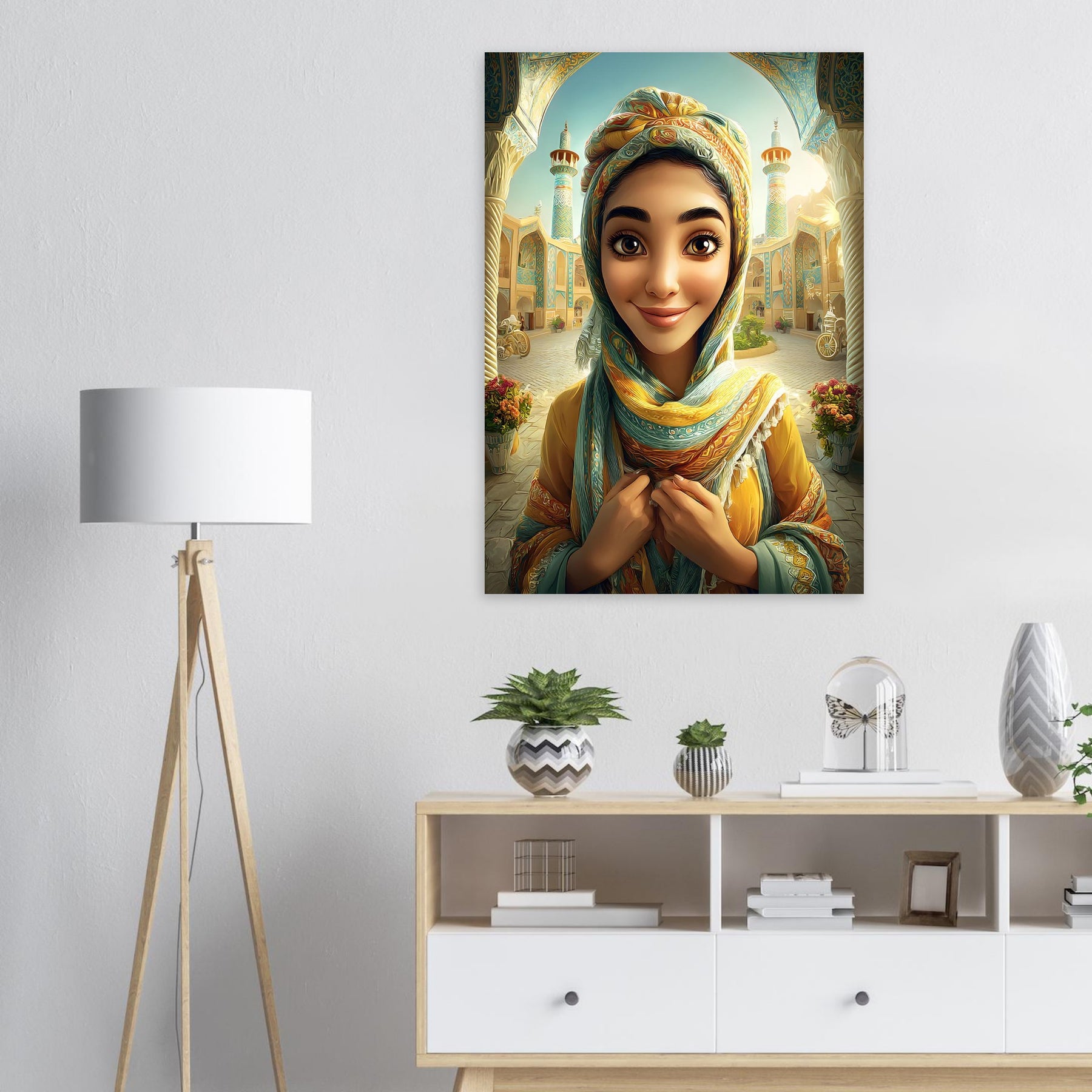 Infuse your child’s room with color, culture, and charm with our Cultural Grace Aluminum Wall Art. This captivating illustration features a whimsical young woman dressed in colorful traditional attire, standing gracefully before a stunning architectural backdrop that celebrates heritage, elegance, and timeless beauty.