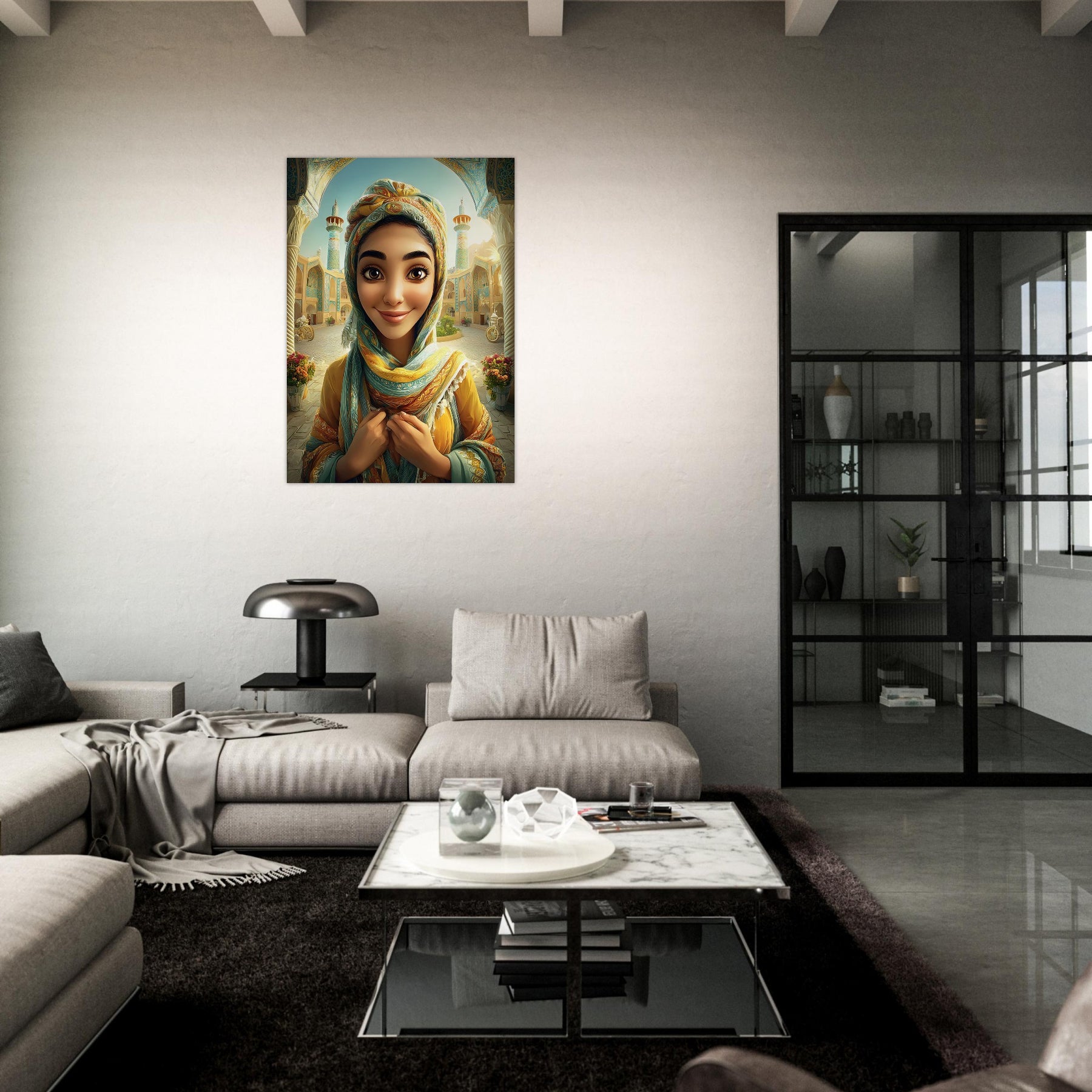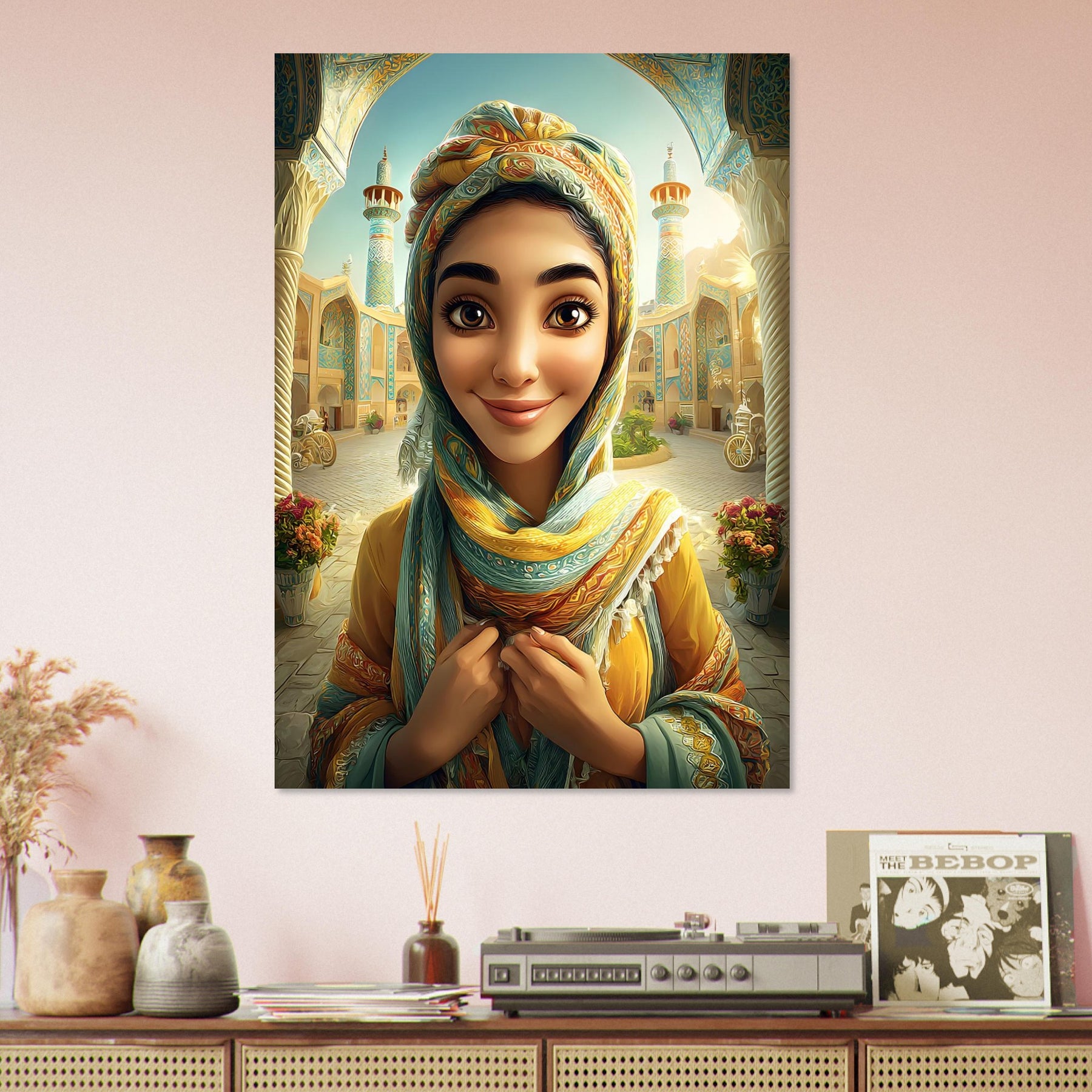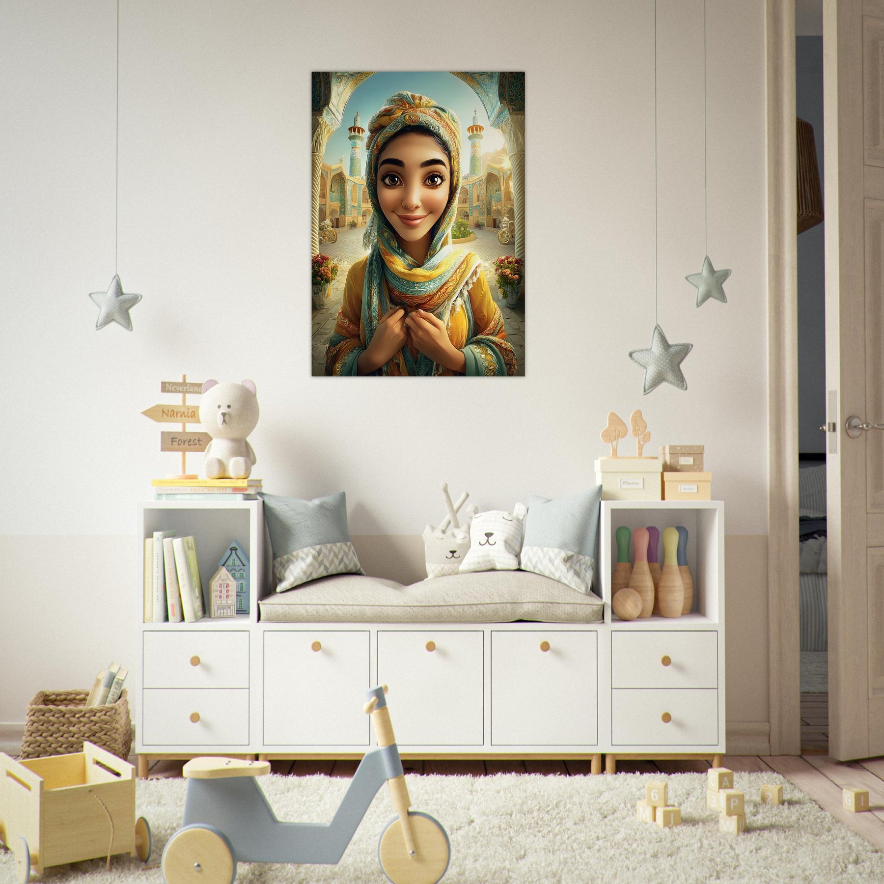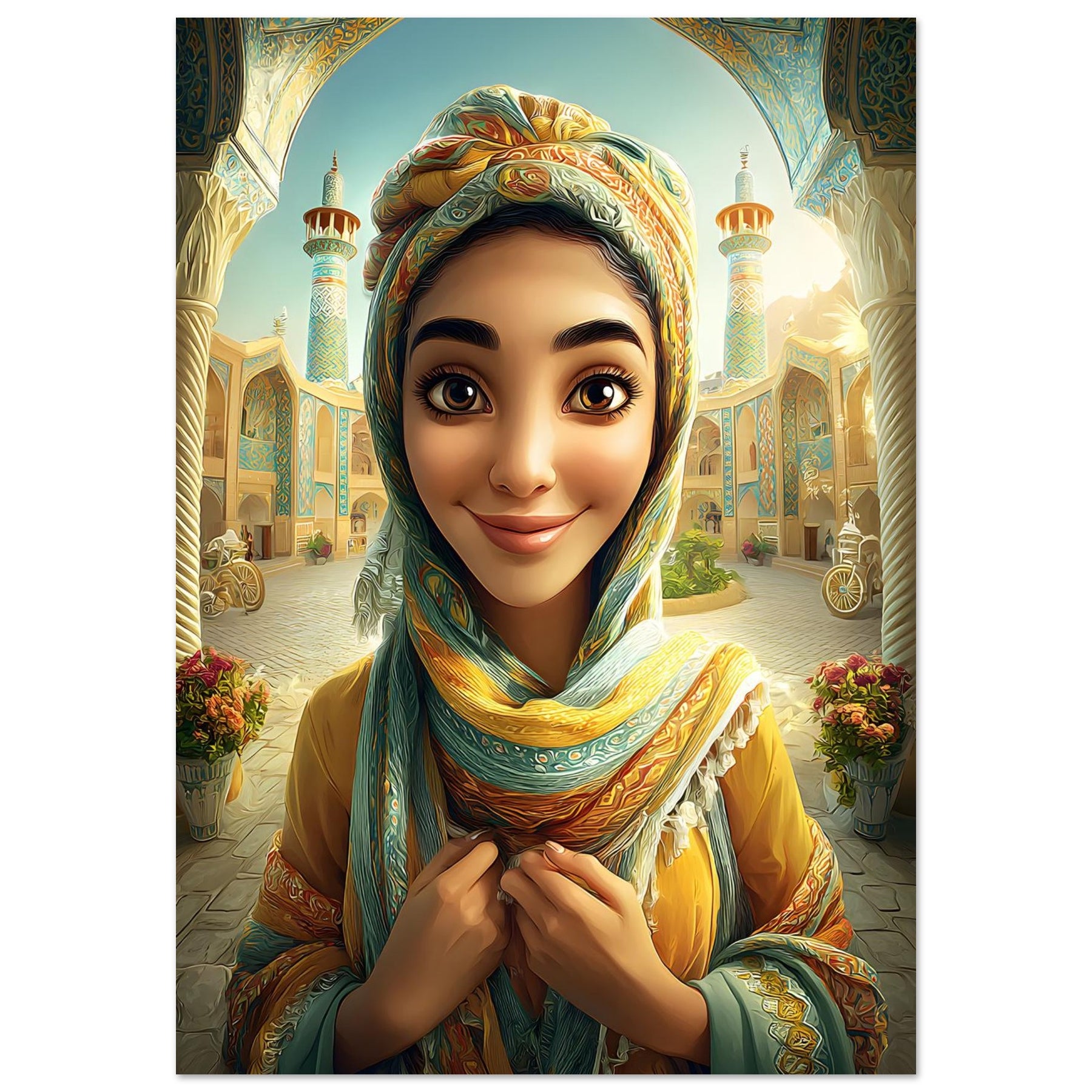 Infuse your child’s room with color, culture, and charm with our Cultural Grace Aluminum Wall Art. This captivating illustration features a whimsical young woman dressed in colorful traditional attire, standing gracefully before a stunning architectural backdrop that celebrates heritage, elegance, and timeless beauty.