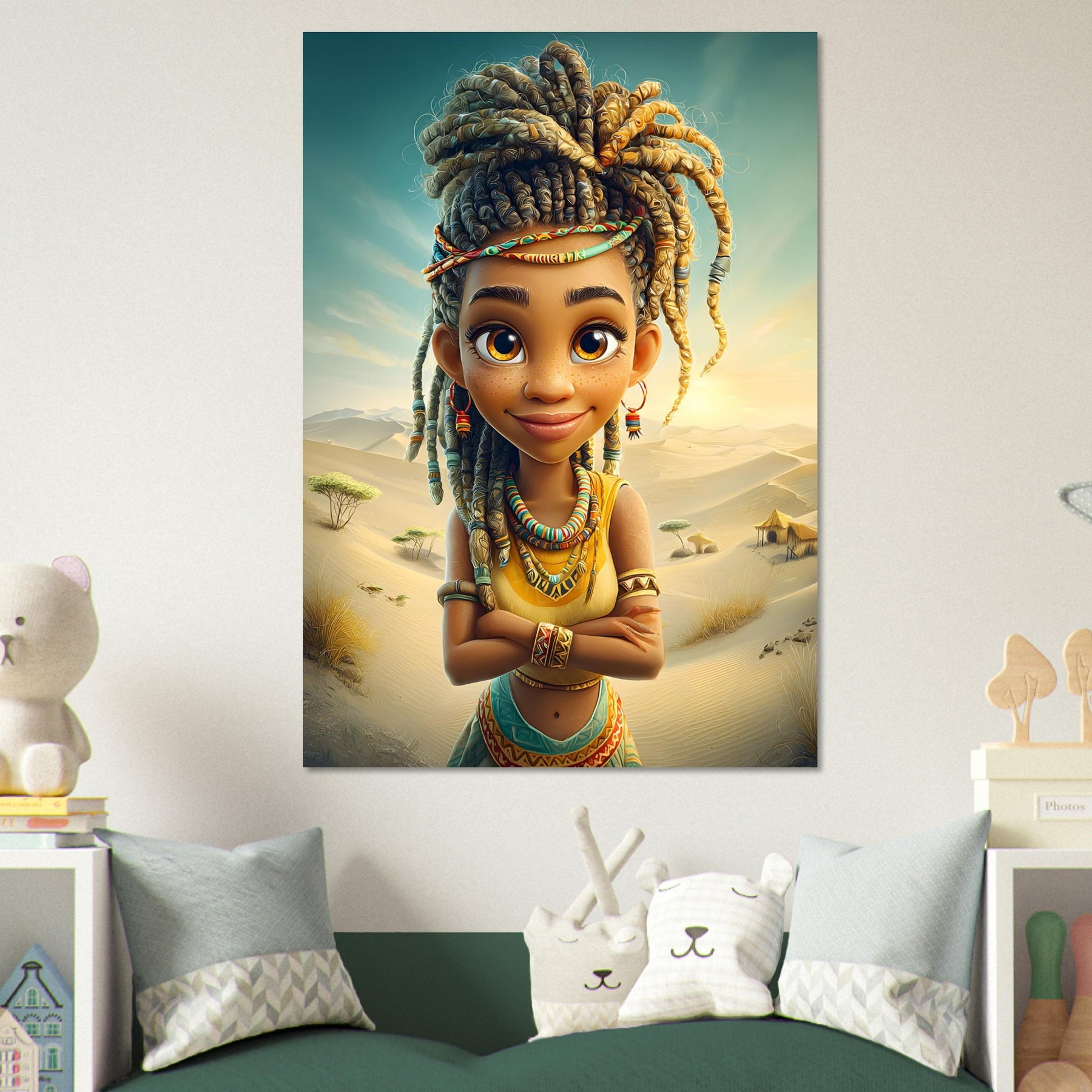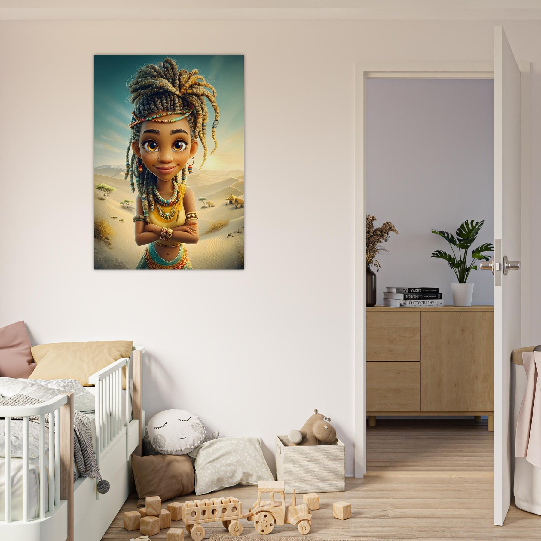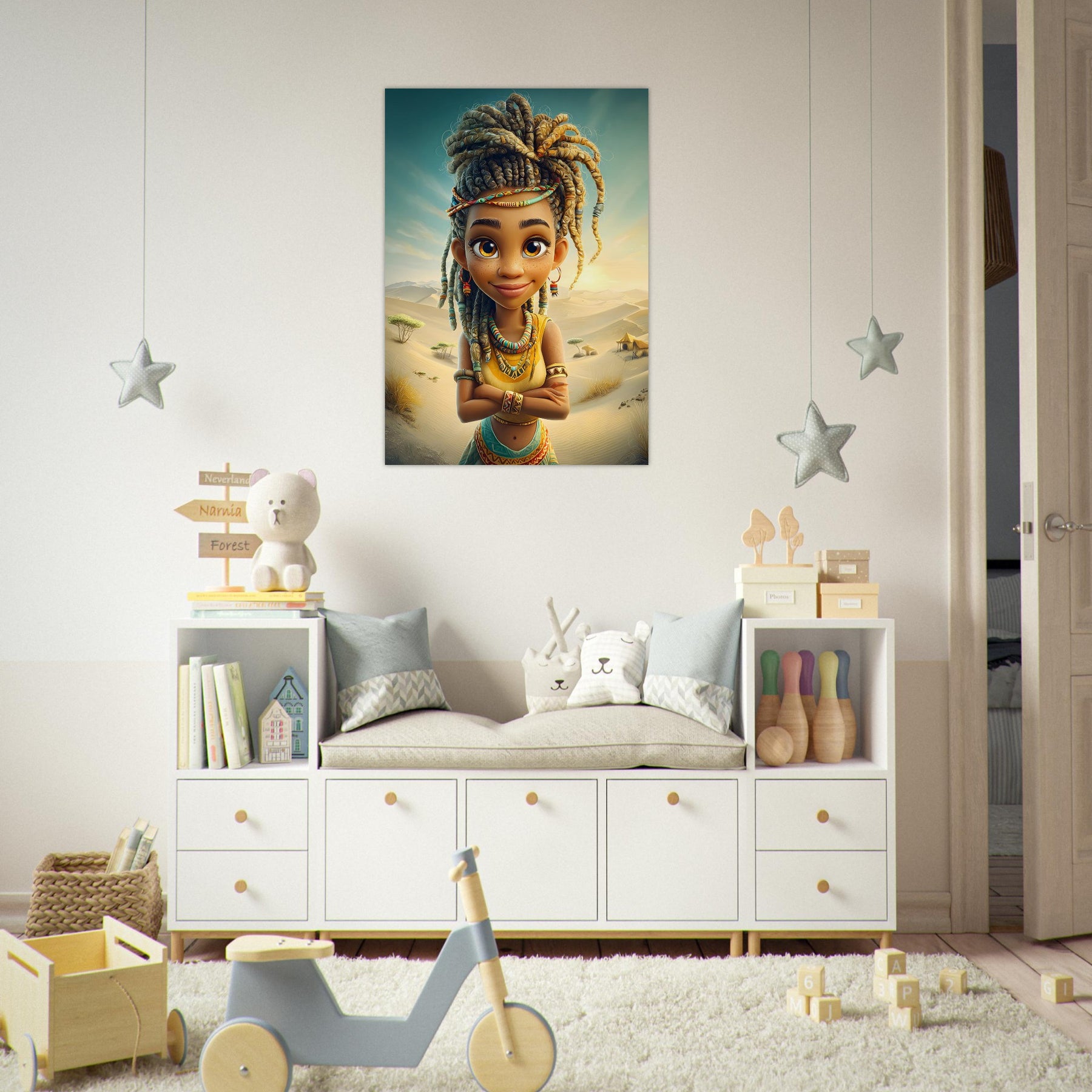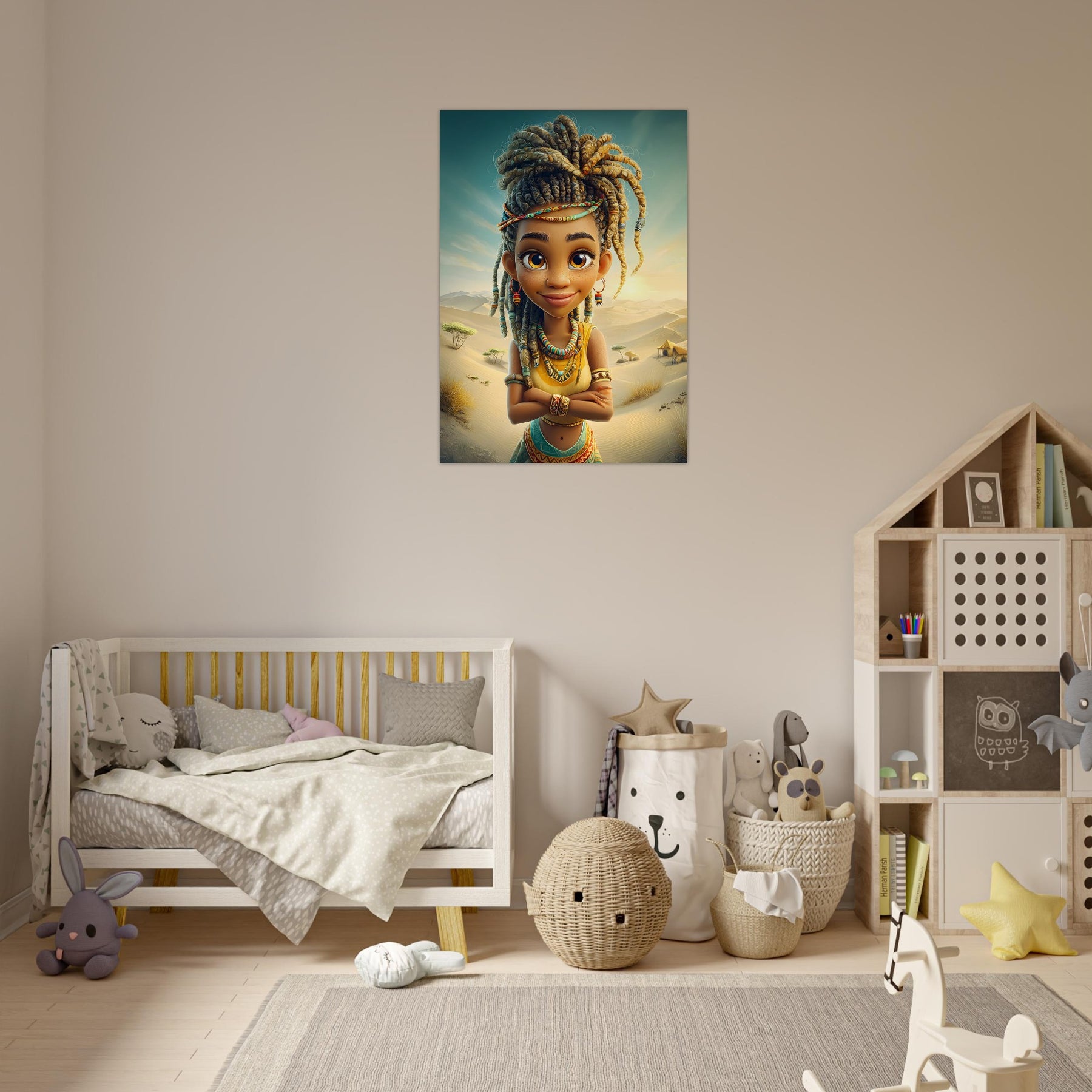 Infuse your child’s room with color, culture, and confidence through Desert Grace Aluminum Wall Art. This captivating illustration features a whimsical young woman standing proudly in a serene desert landscape, her intricate braided hairstyle and vibrant attire reflecting beauty, heritage, and strength. The warm tones and artistic detailing create a harmonious blend of elegance and inspiration, perfect for nurturing imagination and cultural appreciation.