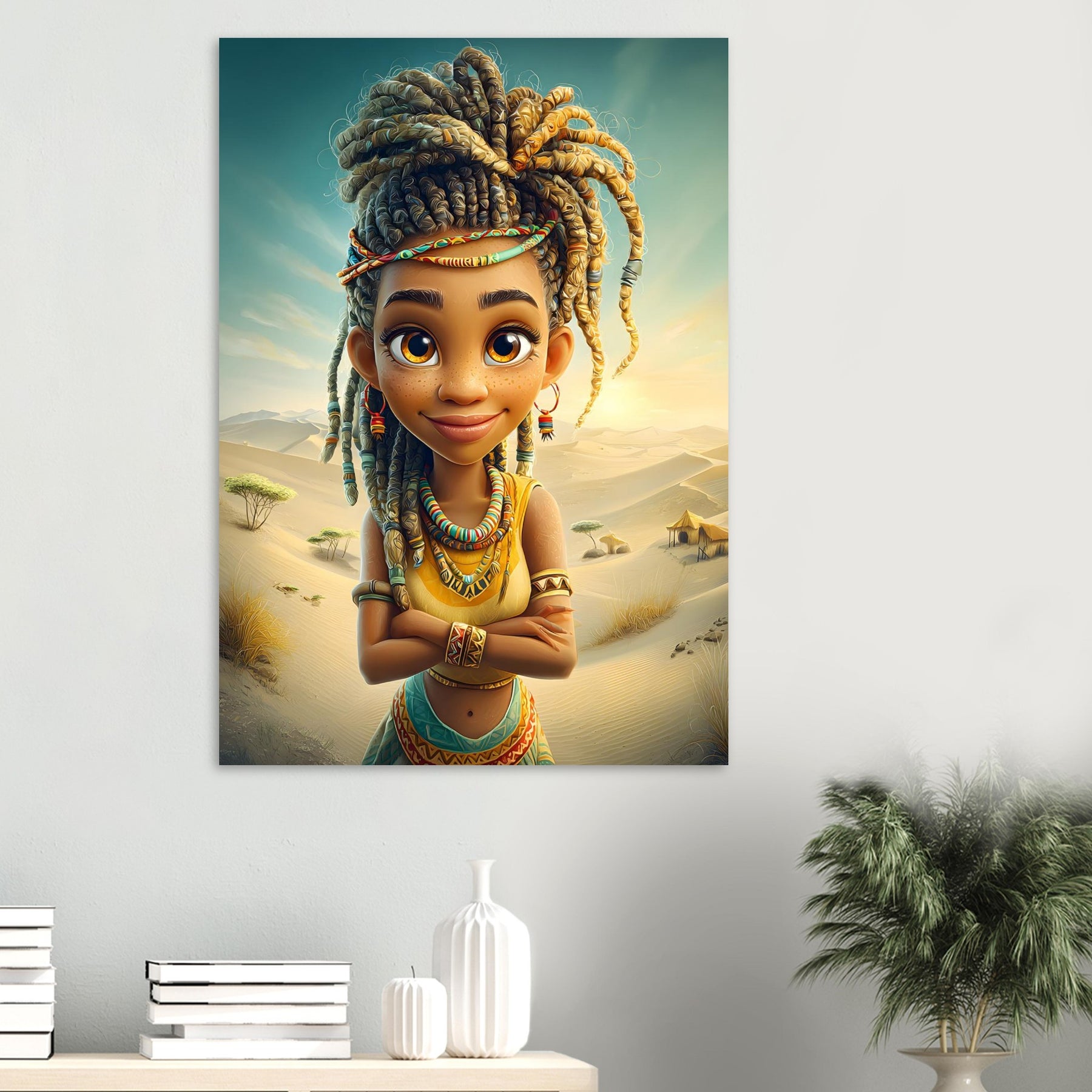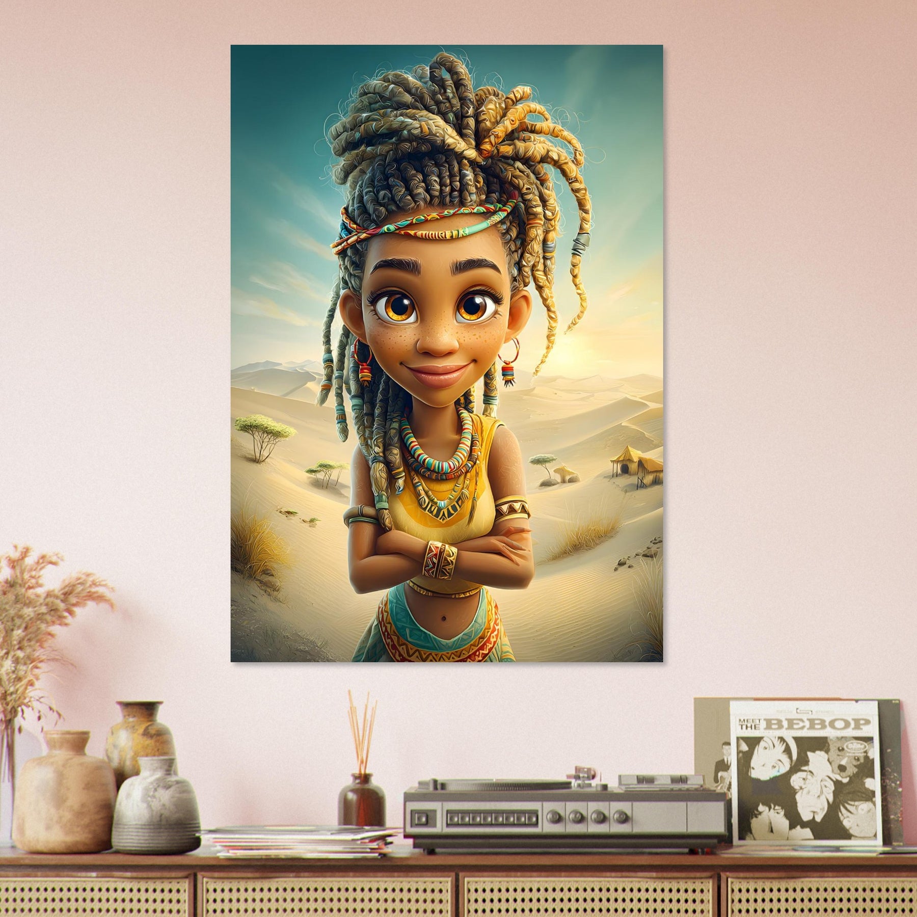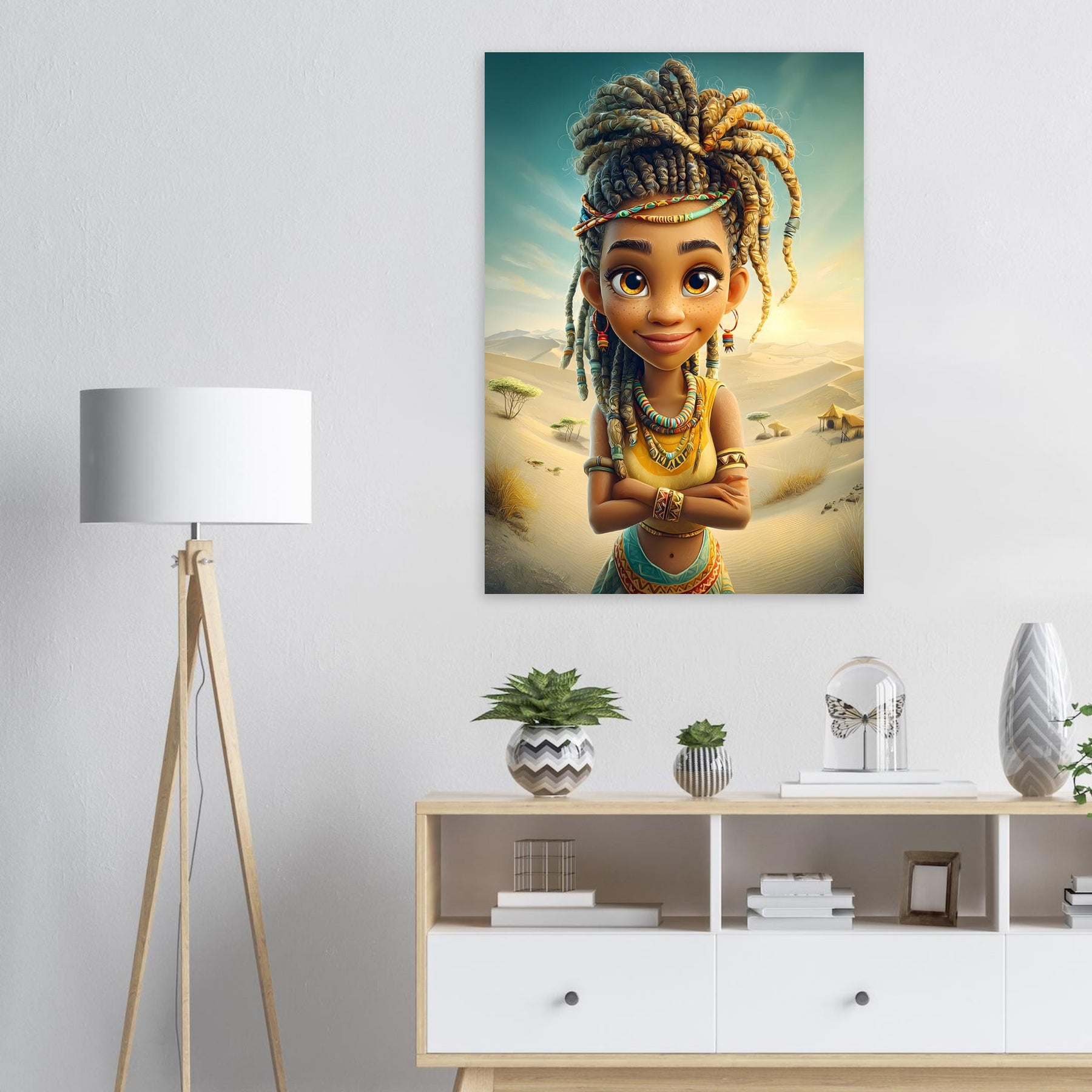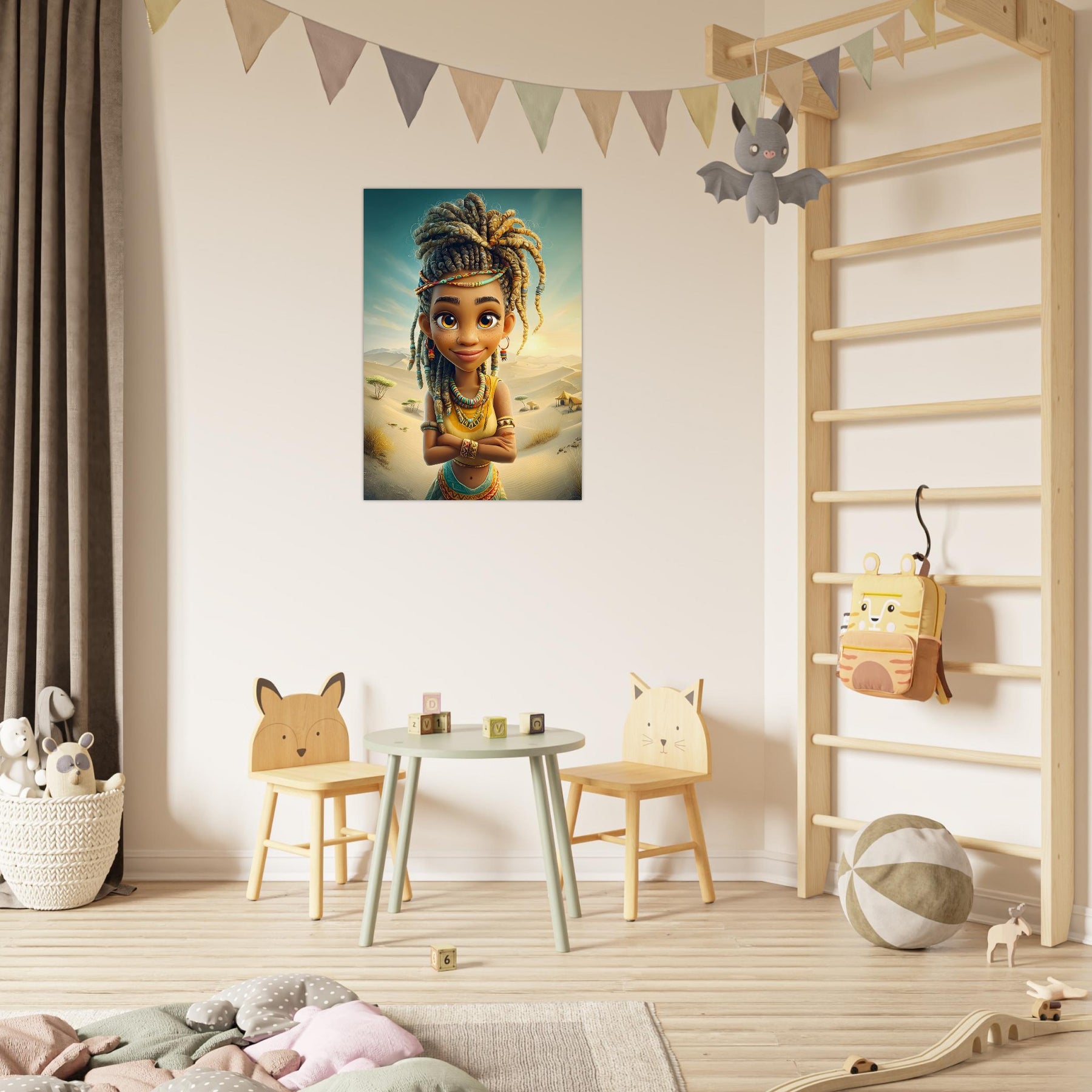 Infuse your child’s room with color, culture, and confidence through Desert Grace Aluminum Wall Art. This captivating illustration features a whimsical young woman standing proudly in a serene desert landscape, her intricate braided hairstyle and vibrant attire reflecting beauty, heritage, and strength. The warm tones and artistic detailing create a harmonious blend of elegance and inspiration, perfect for nurturing imagination and cultural appreciation.