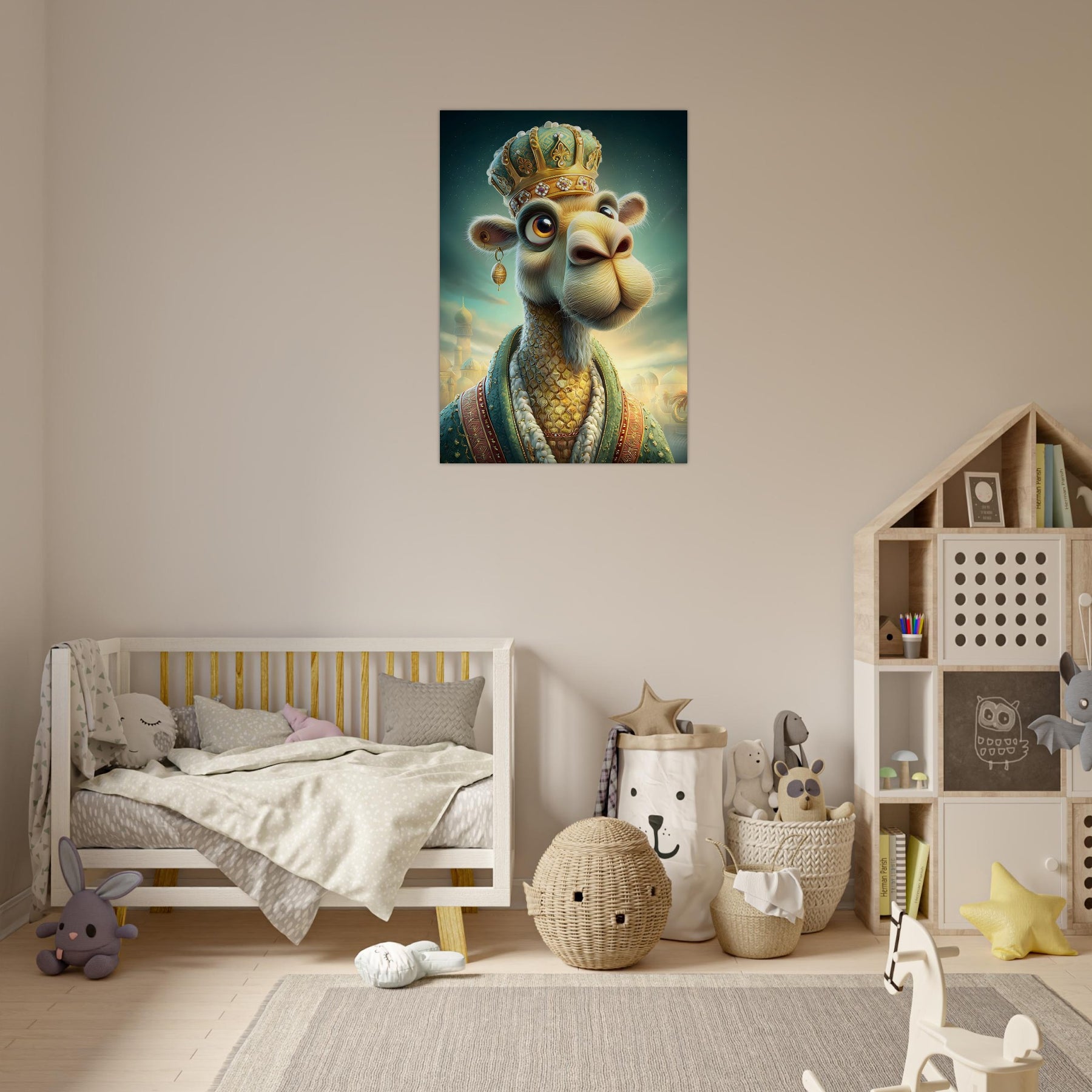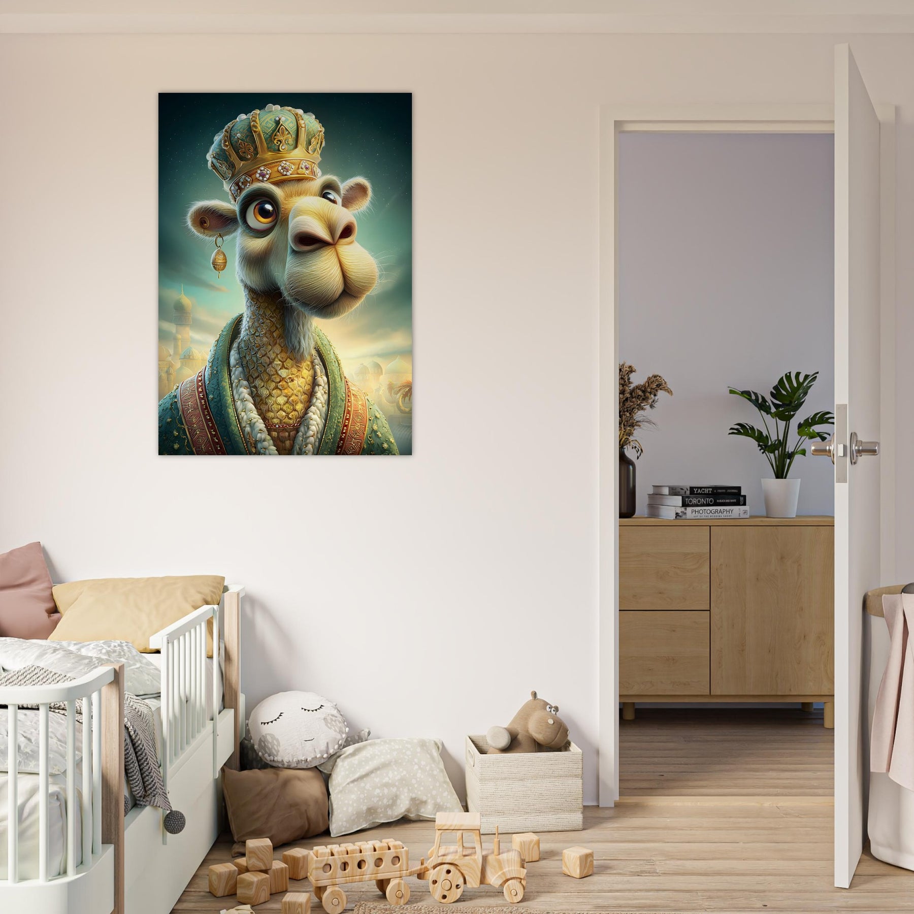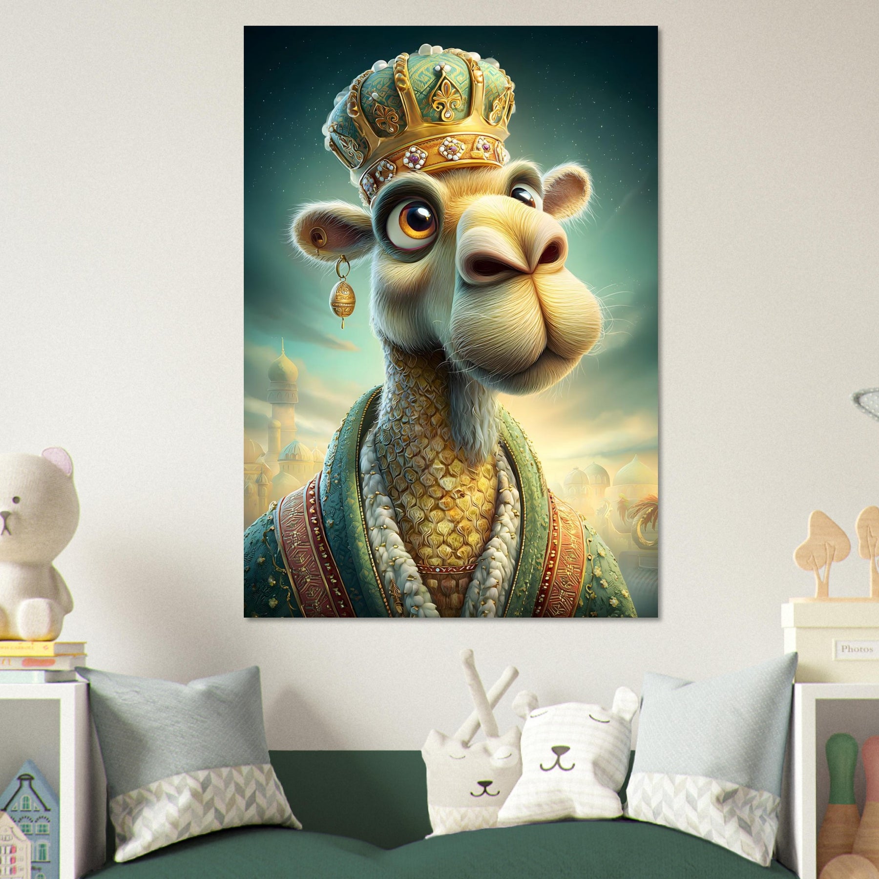 Transform your child’s room with the royal charm of the Desert Majesty Aluminum Wall Art. This enchanting illustration features a whimsical camel adorned with a glittering crown and luxurious robes, standing proudly against a breathtaking desert landscape. Radiating elegance, warmth, and playful sophistication, this artwork celebrates imagination, adventure, and the magic of storytelling.