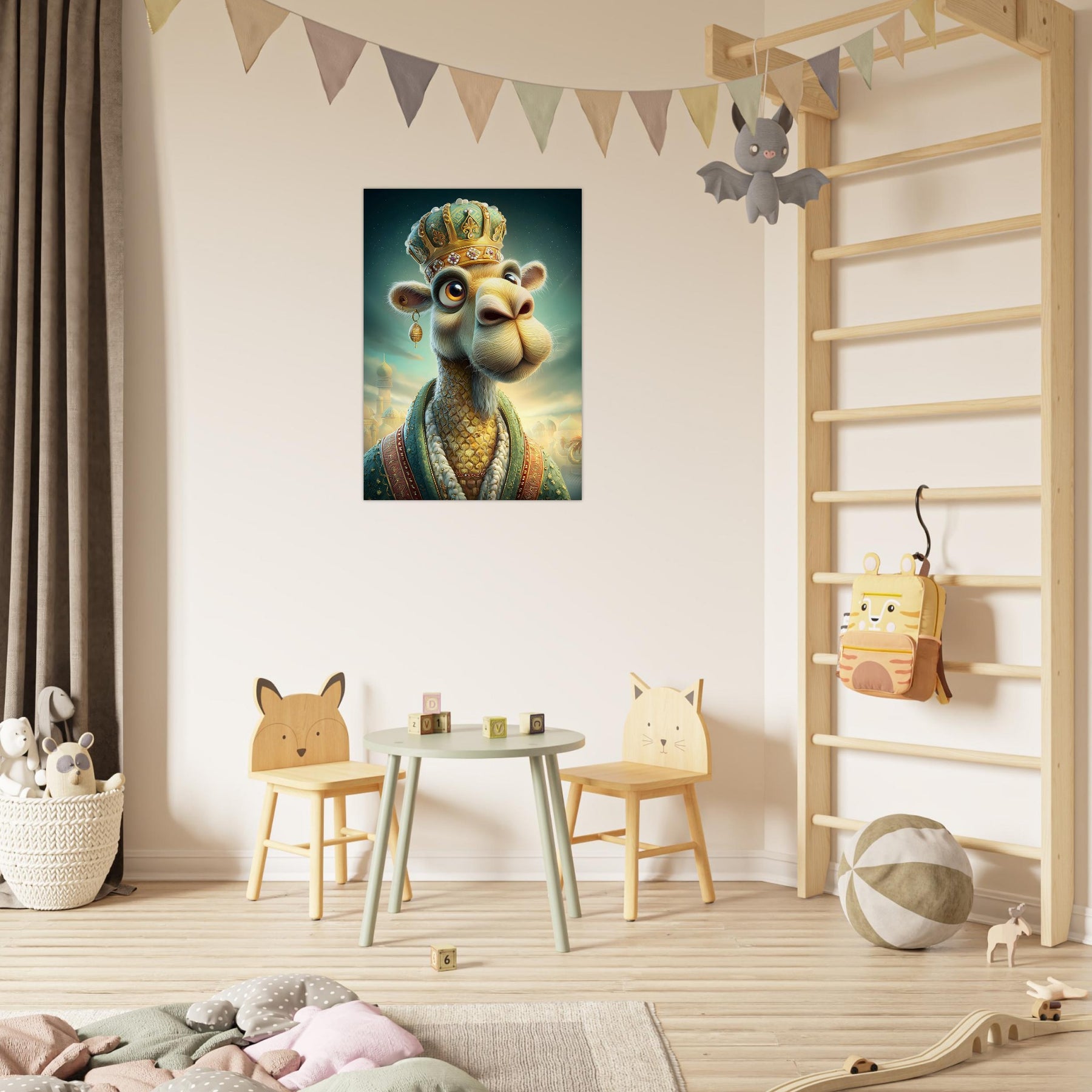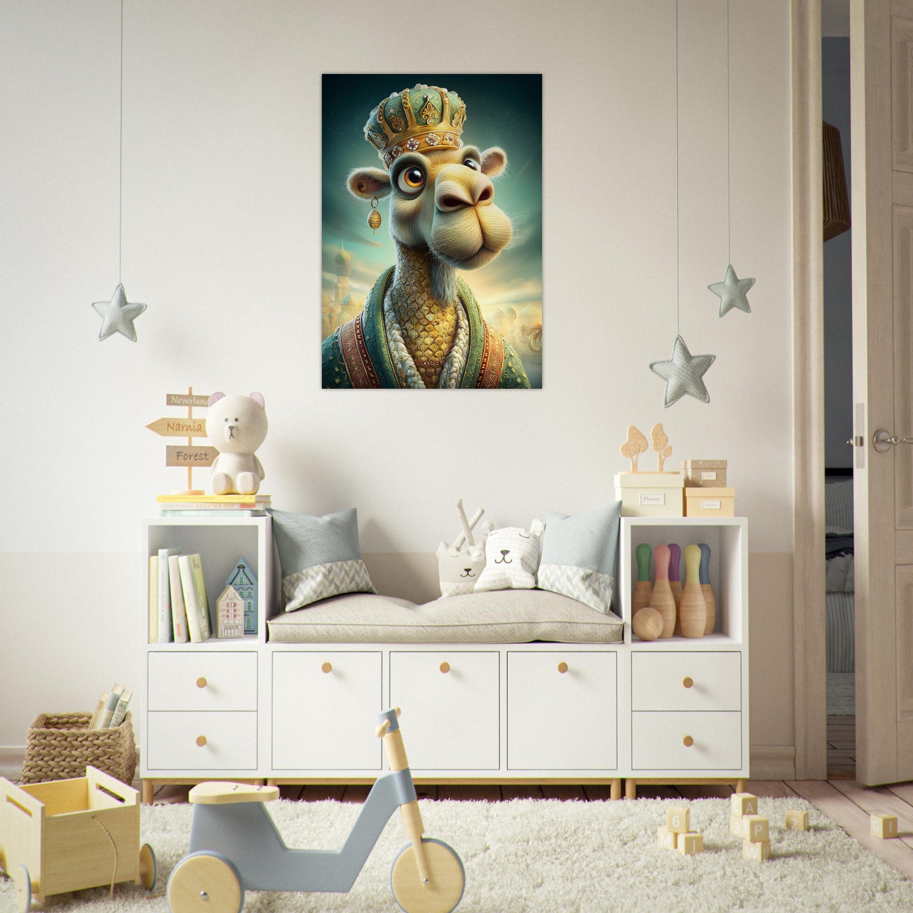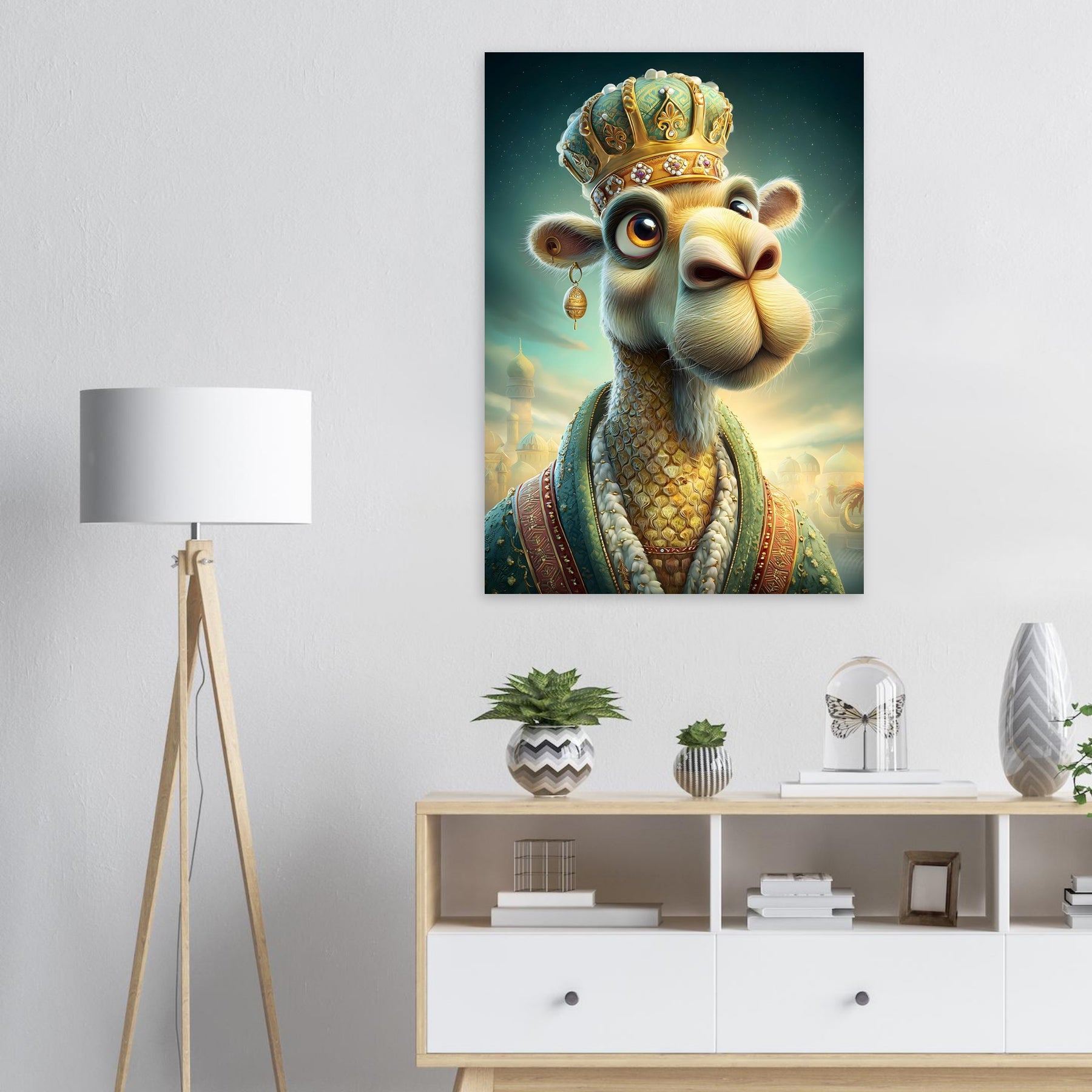 Transform your child’s room with the royal charm of the Desert Majesty Aluminum Wall Art. This enchanting illustration features a whimsical camel adorned with a glittering crown and luxurious robes, standing proudly against a breathtaking desert landscape. Radiating elegance, warmth, and playful sophistication, this artwork celebrates imagination, adventure, and the magic of storytelling.