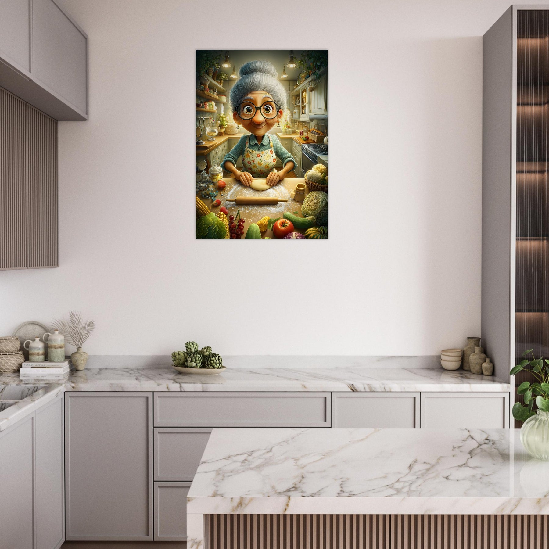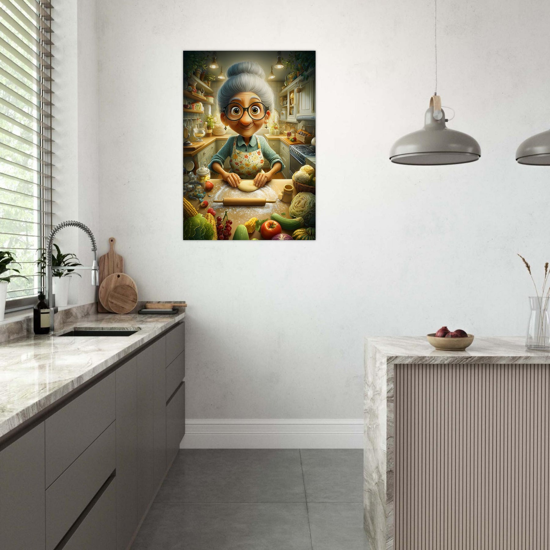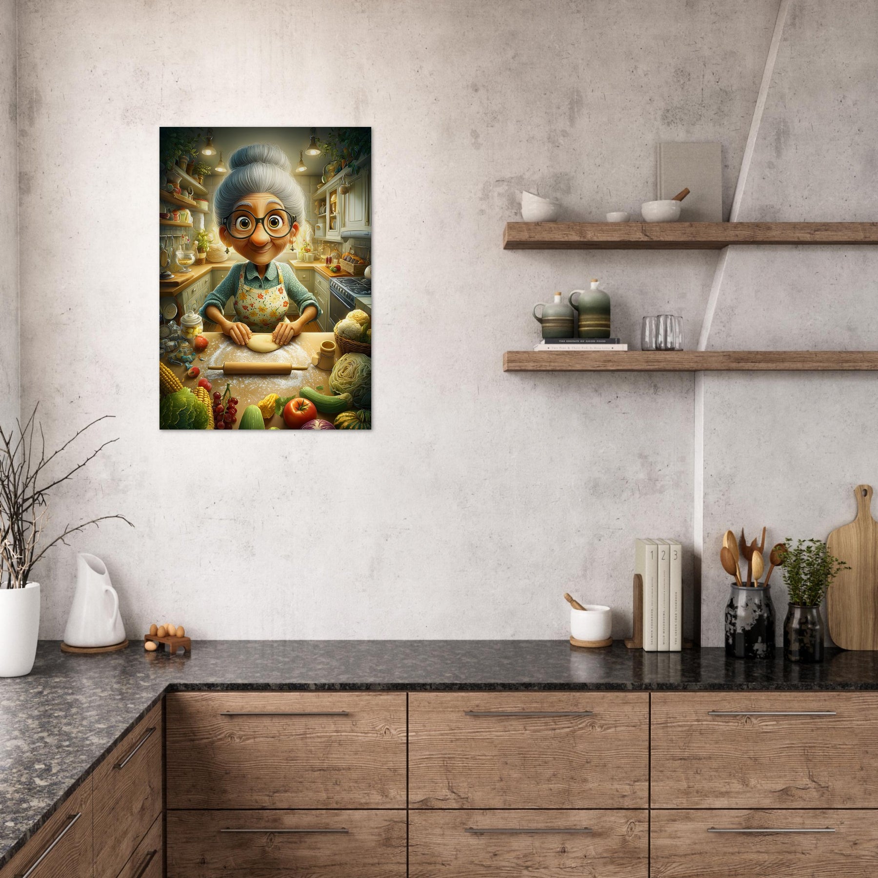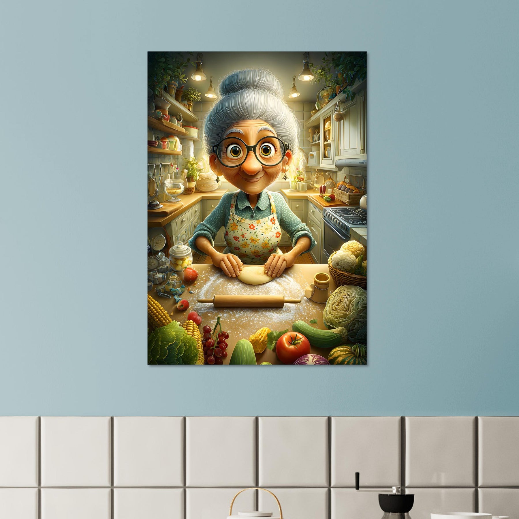 Bring heartwarming charm and cozy nostalgia into your kitchen with Grandma’s Kitchen Magic Aluminum Wall Art. This delightful illustration features a whimsical elderly woman with glasses, joyfully kneading dough in a bright, cheerful kitchen, surrounded by fresh produce, baking ingredients, and the warmth of home-cooked love. The artwork beautifully captures the essence of tradition, comfort, and joy, making it a perfect addition to any culinary space.