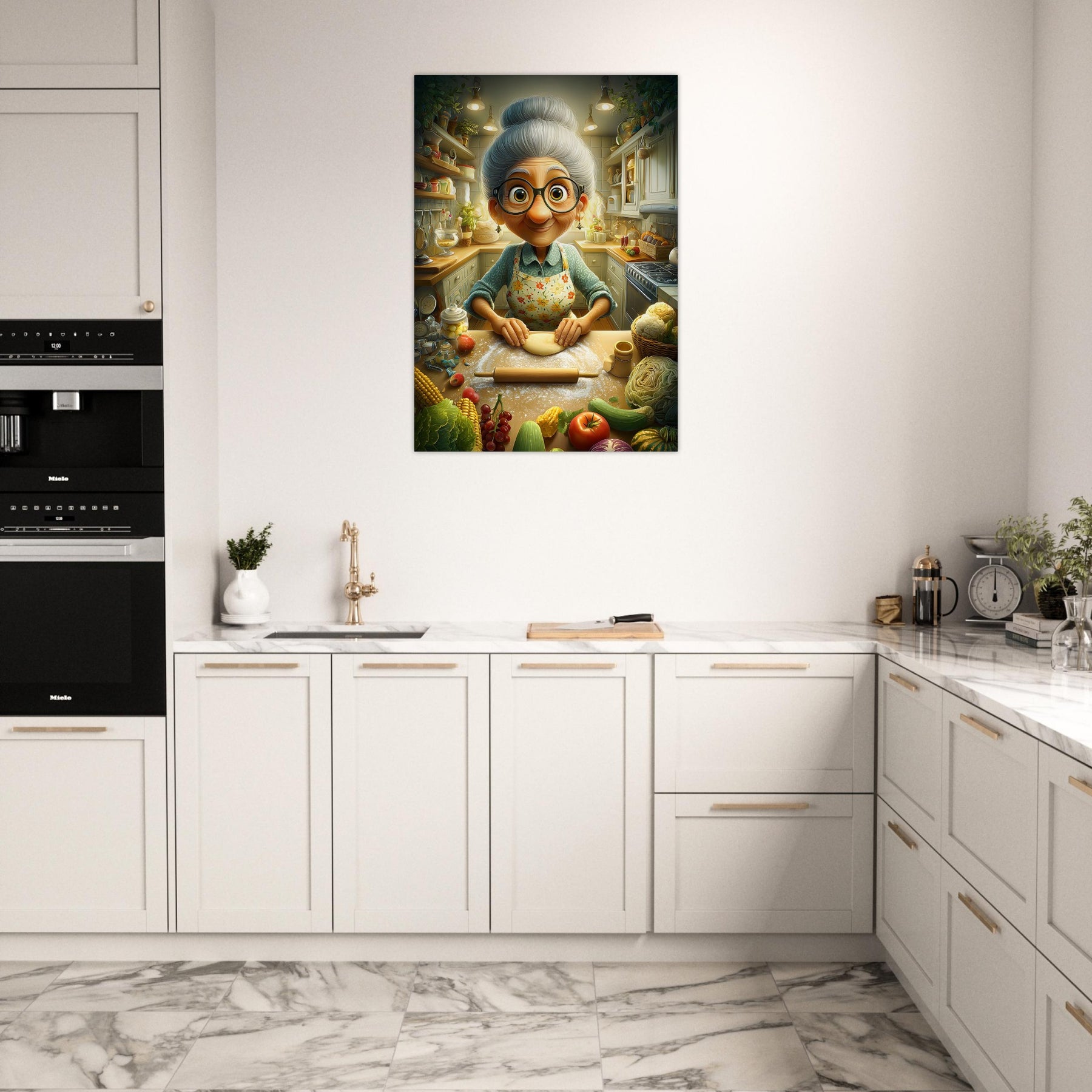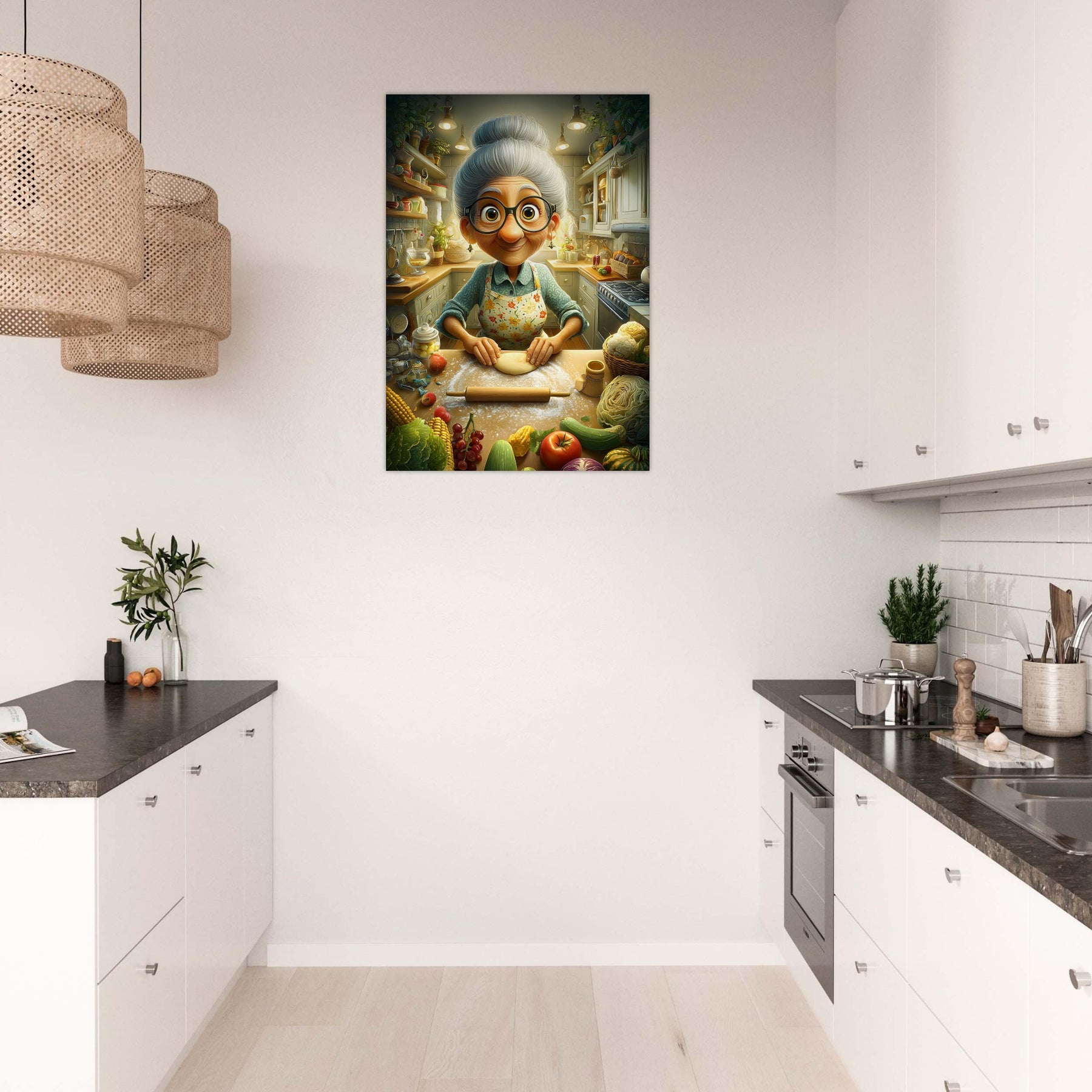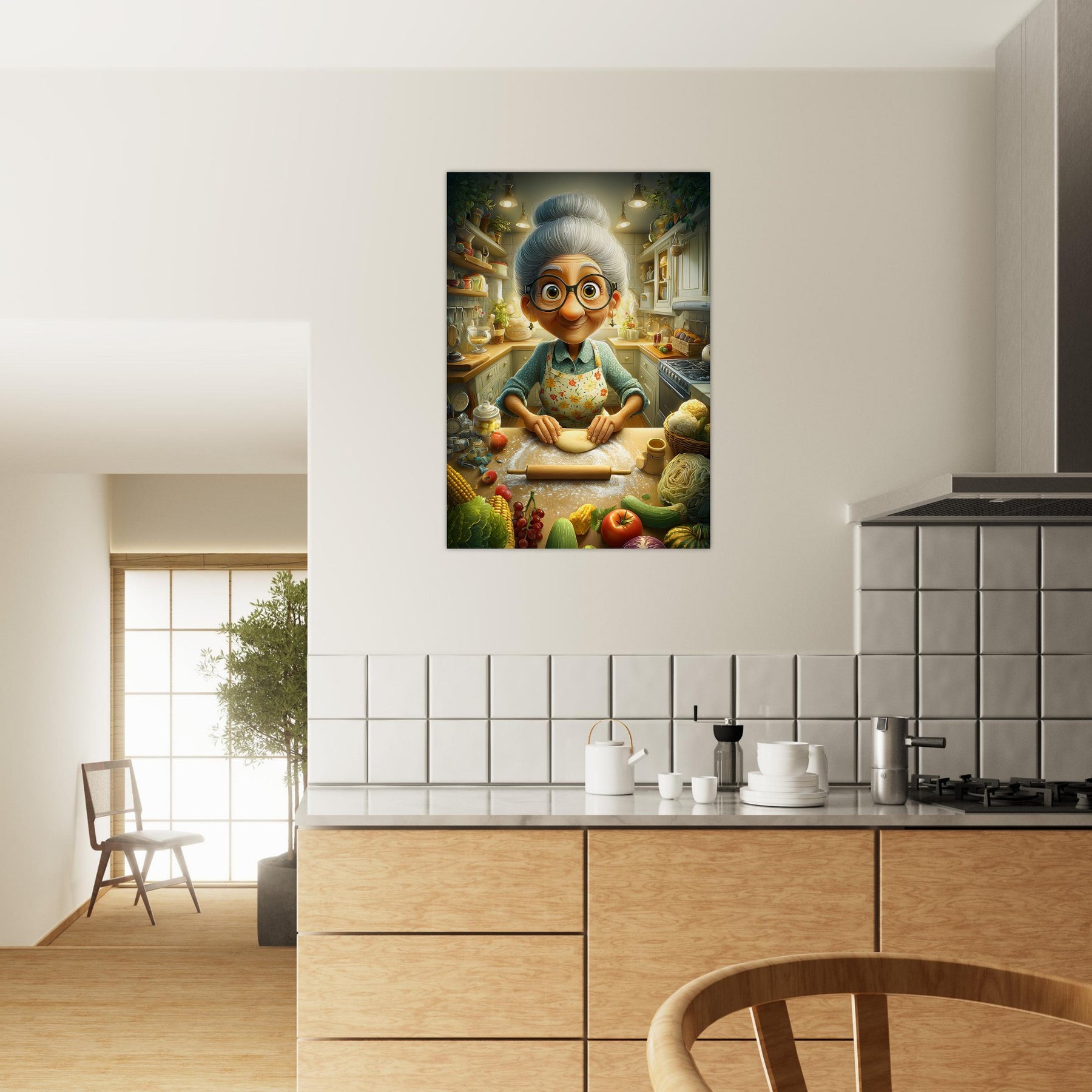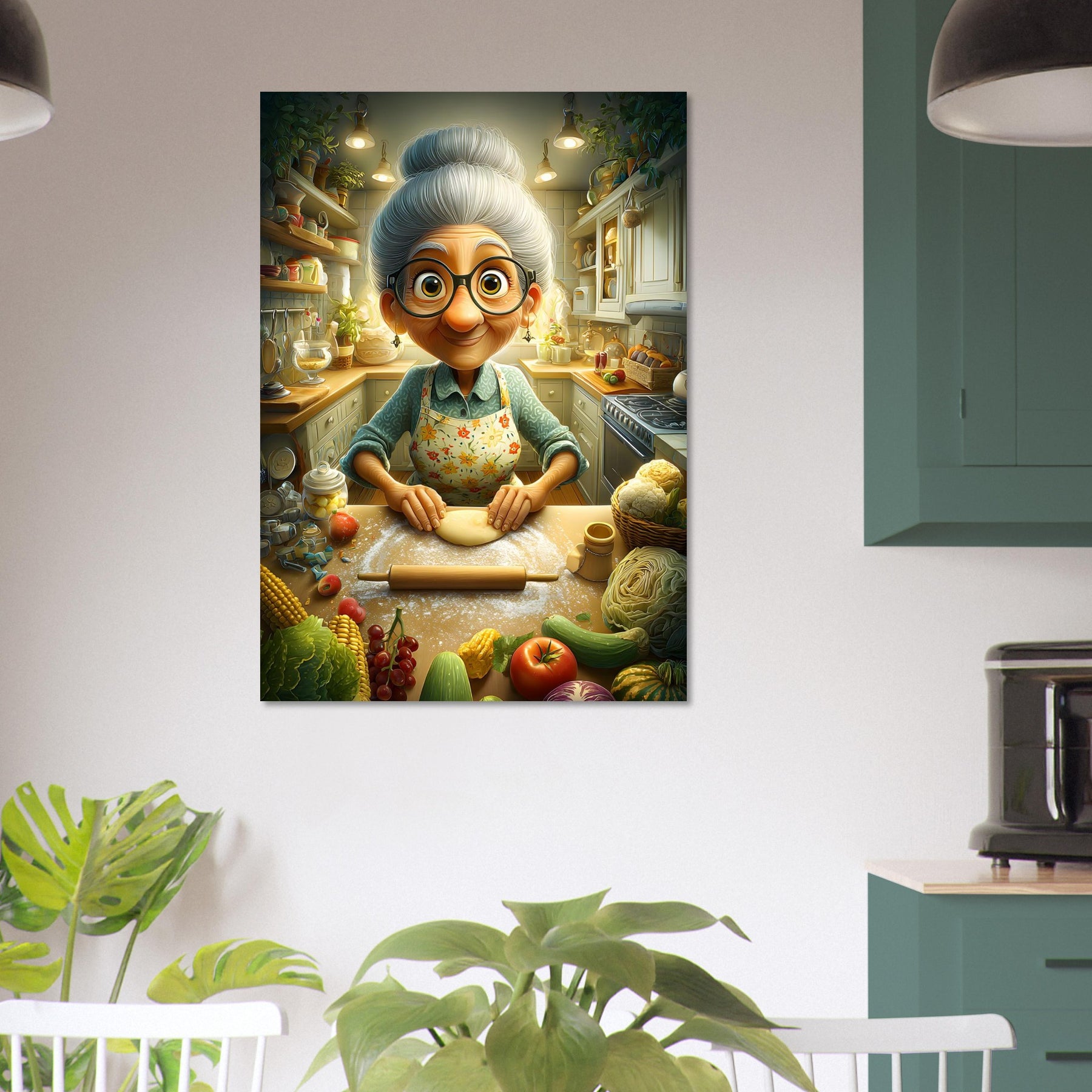 Bring heartwarming charm and cozy nostalgia into your kitchen with Grandma’s Kitchen Magic Aluminum Wall Art. This delightful illustration features a whimsical elderly woman with glasses, joyfully kneading dough in a bright, cheerful kitchen, surrounded by fresh produce, baking ingredients, and the warmth of home-cooked love. The artwork beautifully captures the essence of tradition, comfort, and joy, making it a perfect addition to any culinary space.