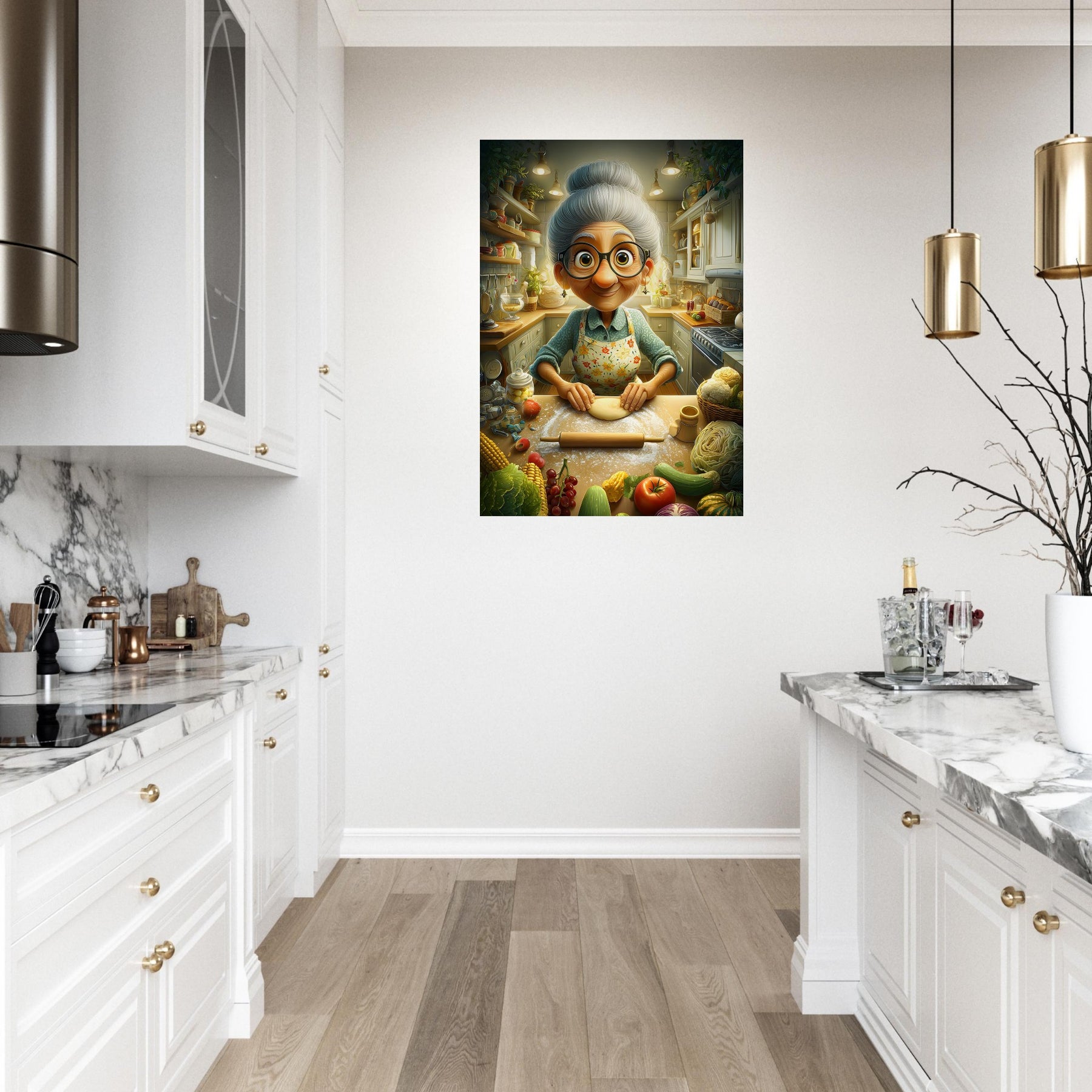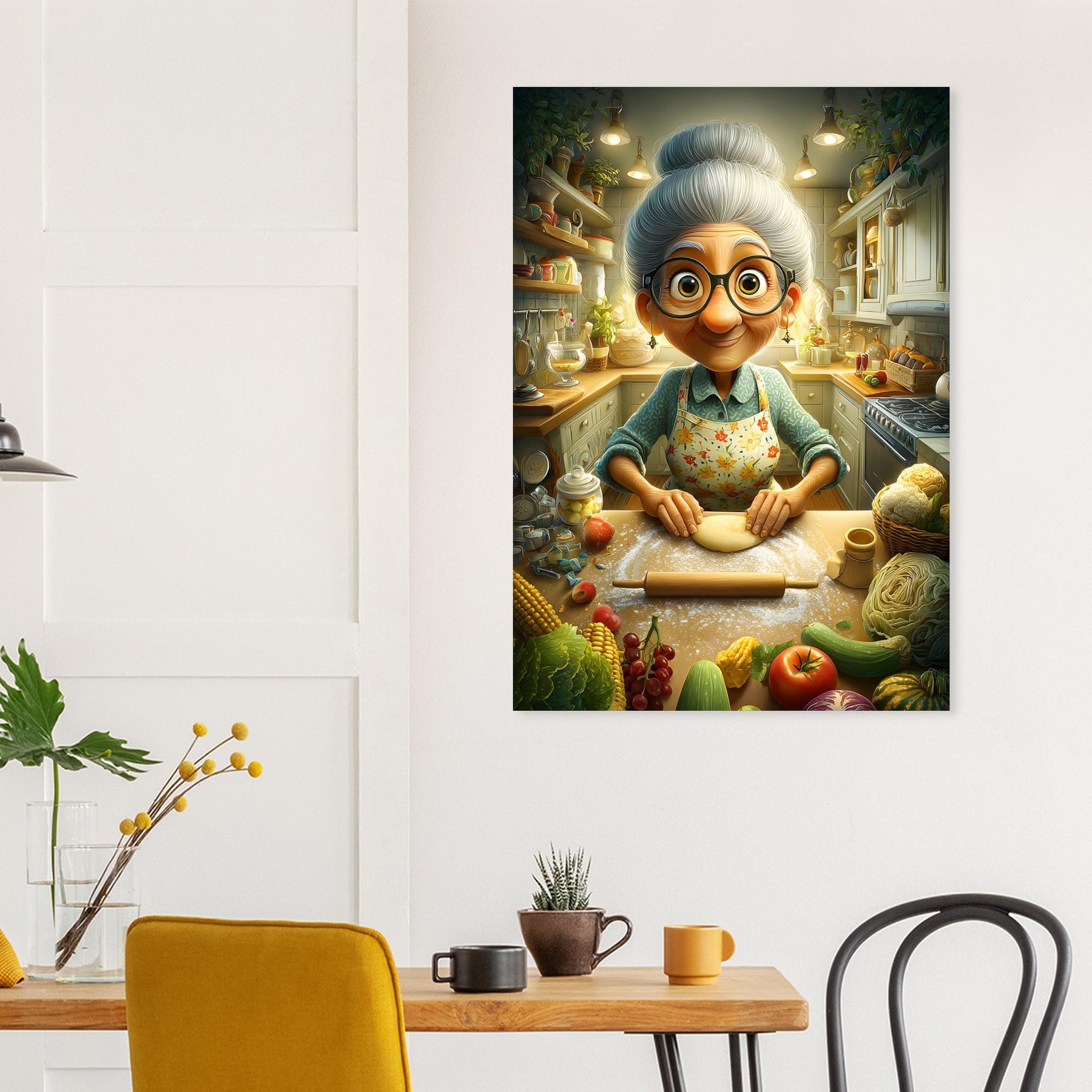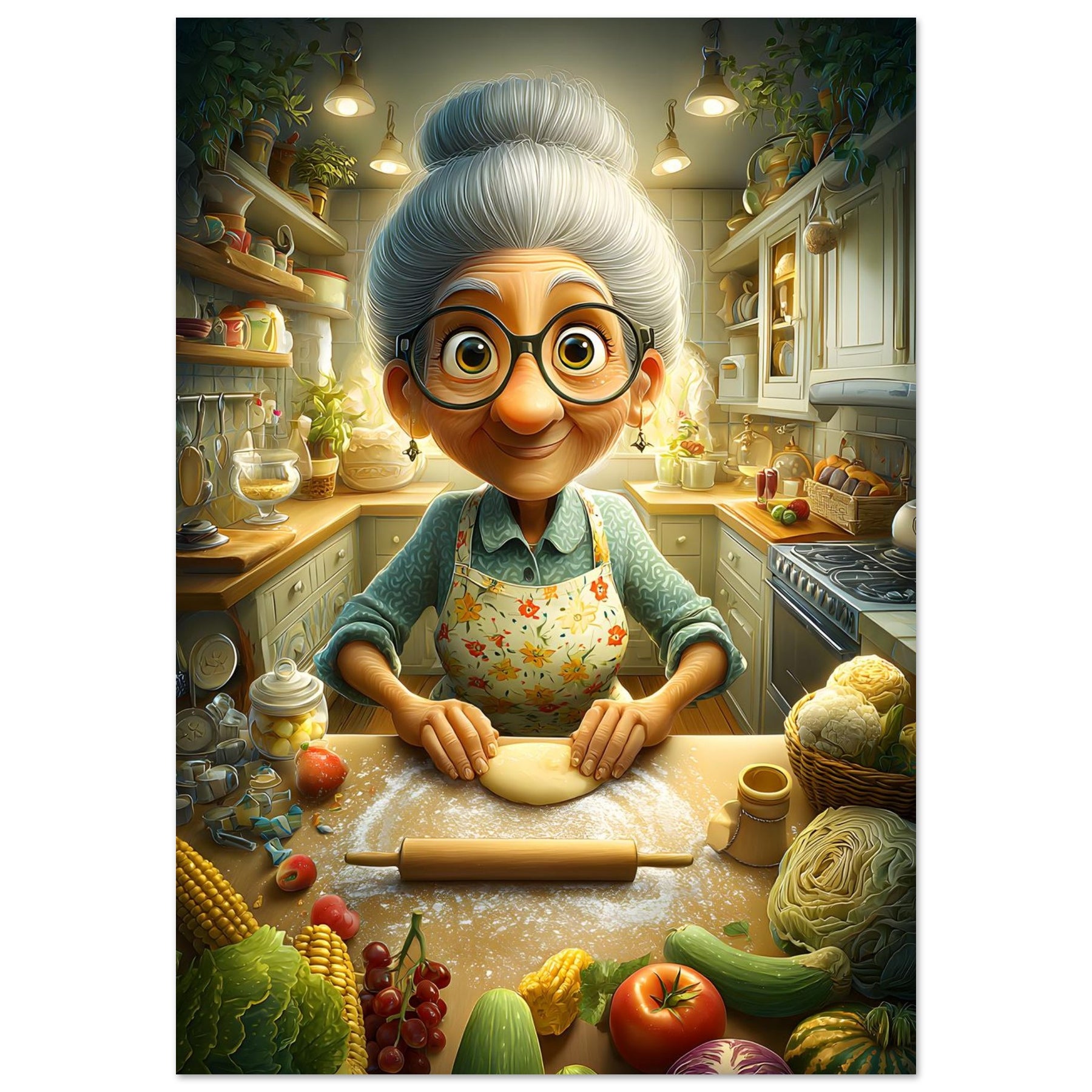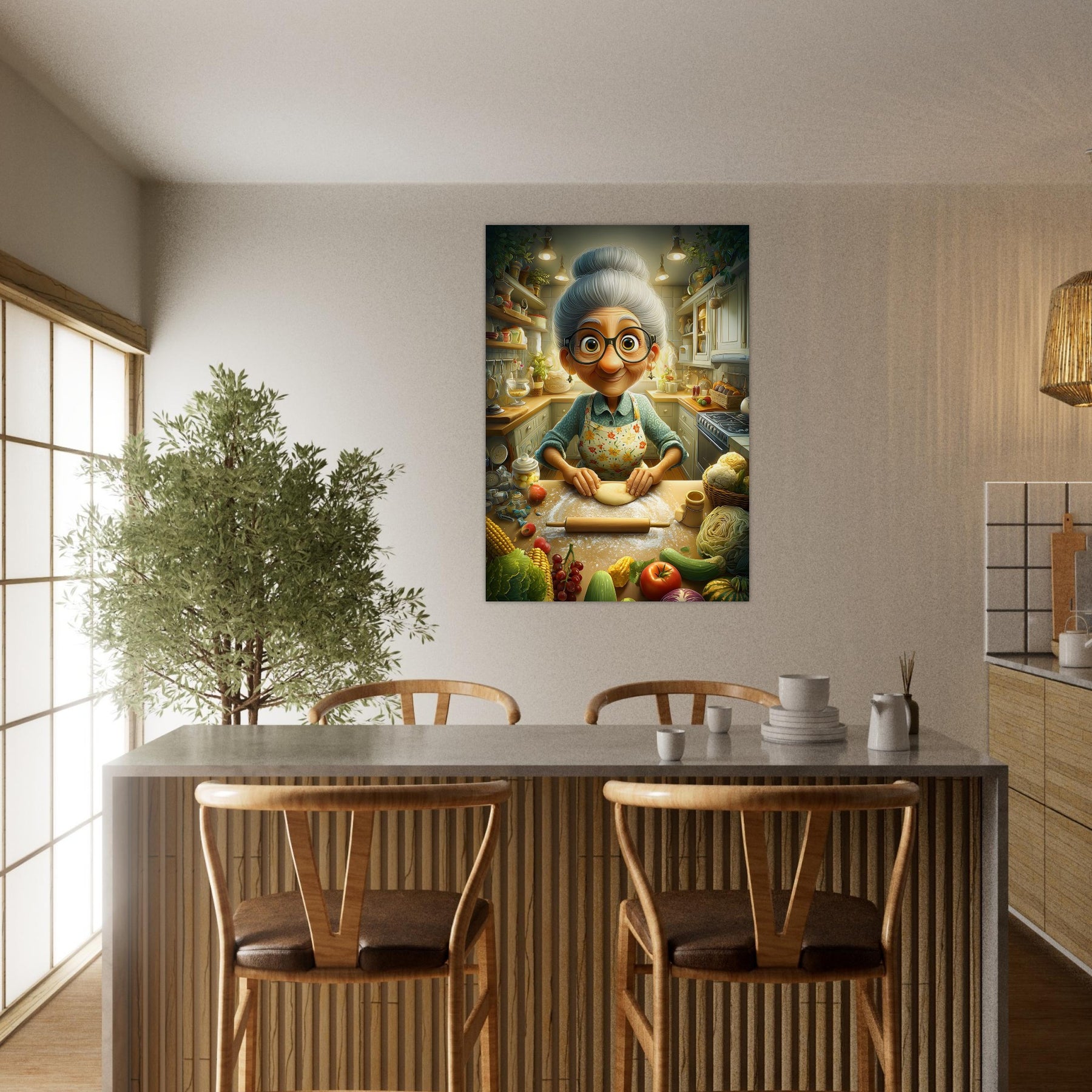 Bring heartwarming charm and cozy nostalgia into your kitchen with Grandma’s Kitchen Magic Aluminum Wall Art. This delightful illustration features a whimsical elderly woman with glasses, joyfully kneading dough in a bright, cheerful kitchen, surrounded by fresh produce, baking ingredients, and the warmth of home-cooked love. The artwork beautifully captures the essence of tradition, comfort, and joy, making it a perfect addition to any culinary space.