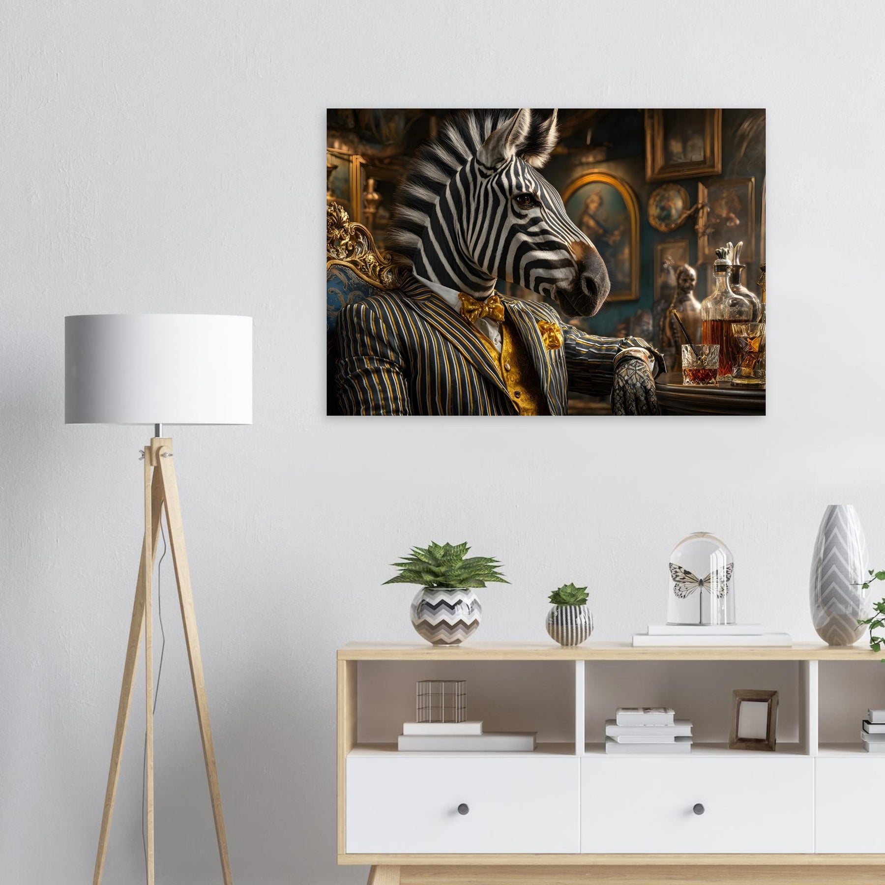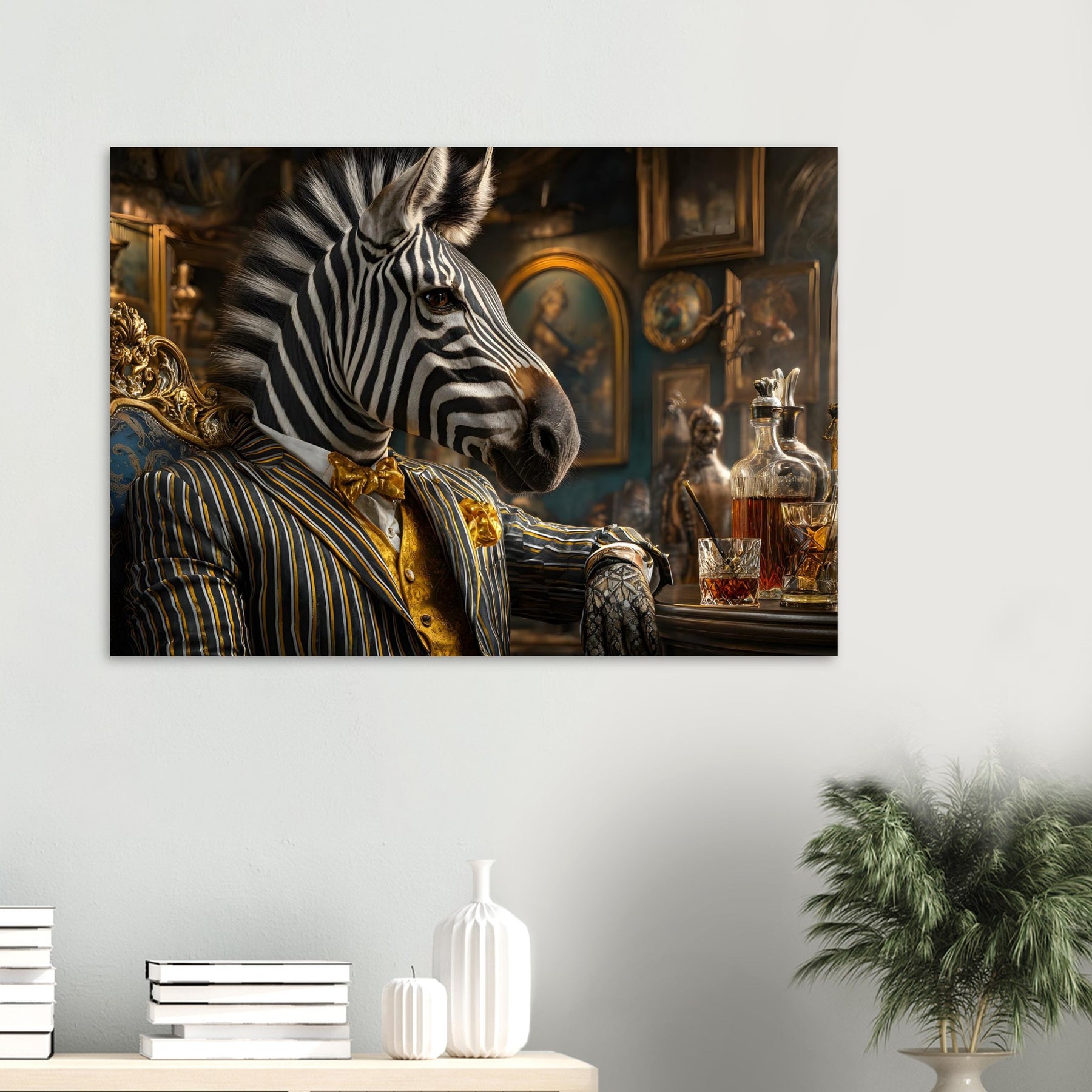 Transform your space with Midnight Gentlemen, a striking aluminum wall art piece featuring a stylish zebra dressed in elegant formal attire, seated confidently at a classic bar. Surrounded by ornate décor and vintage details, this imaginative portrait blends realism with whimsy, creating a bold and sophisticated statement.