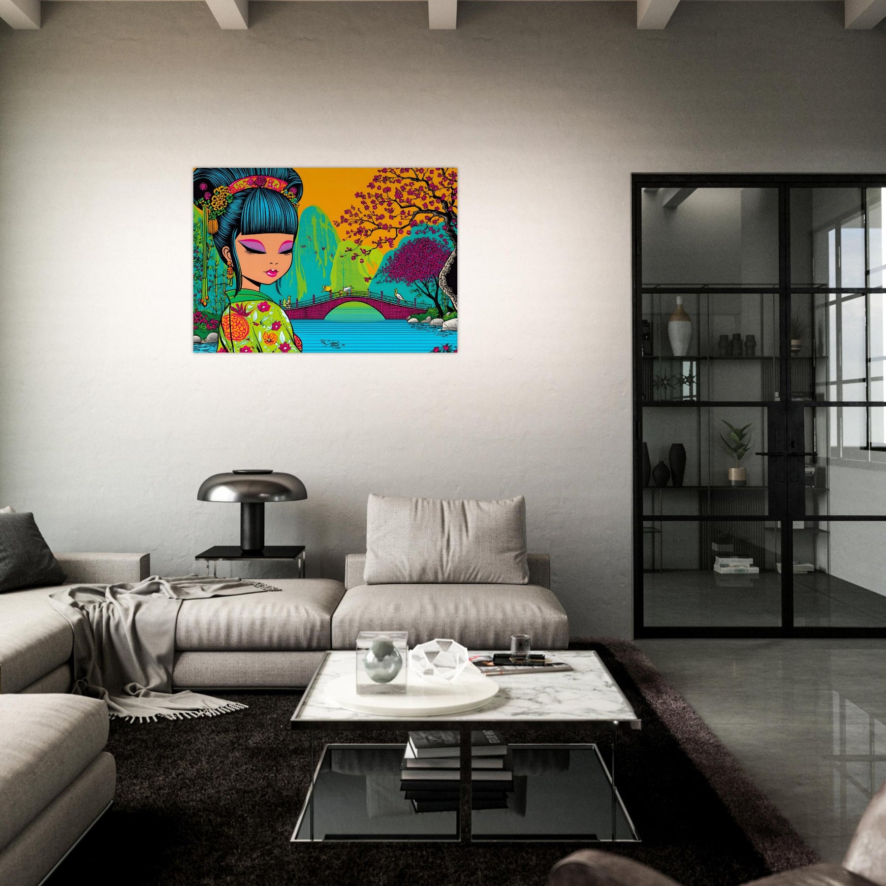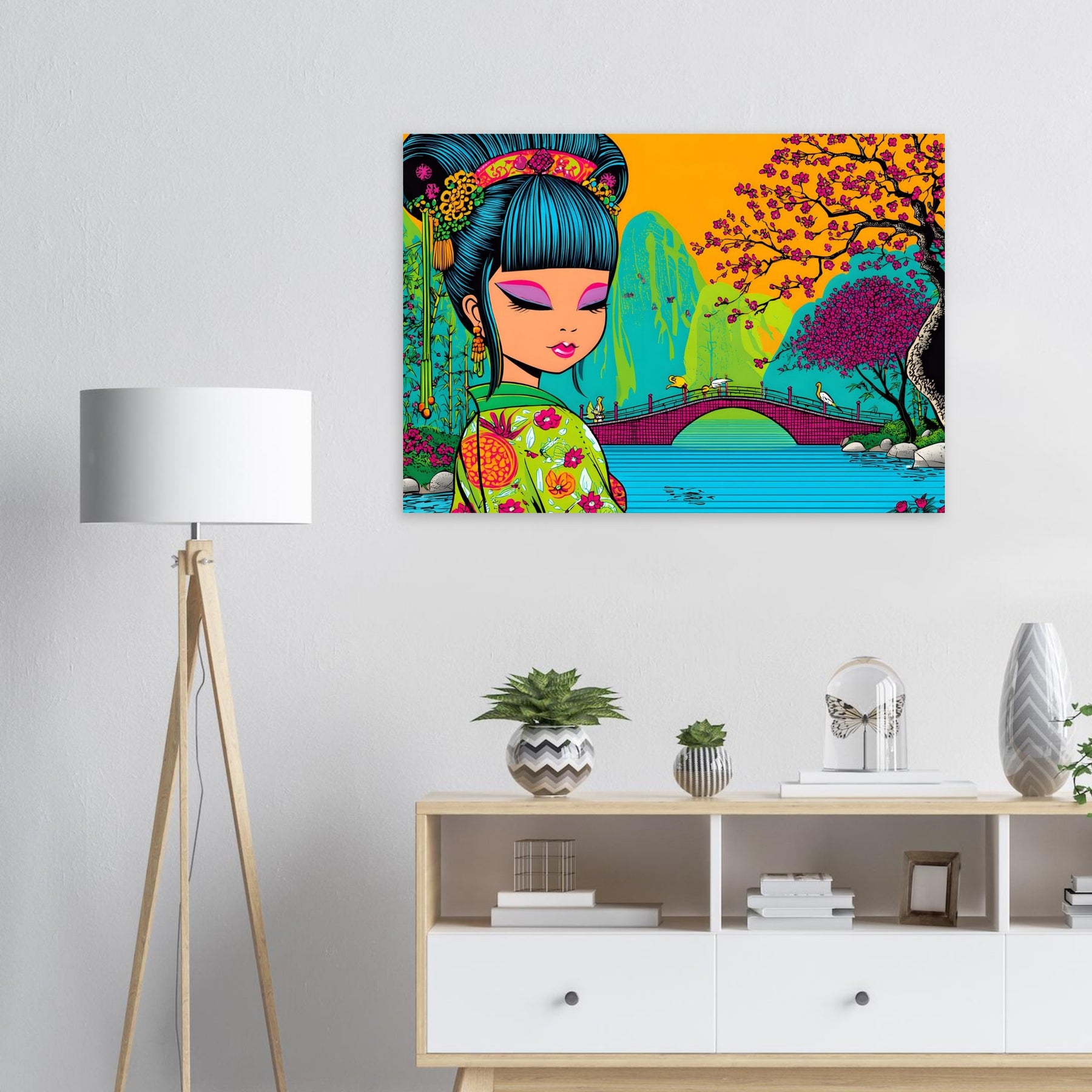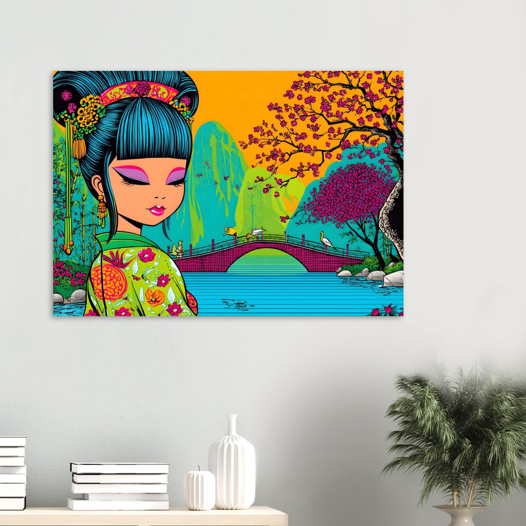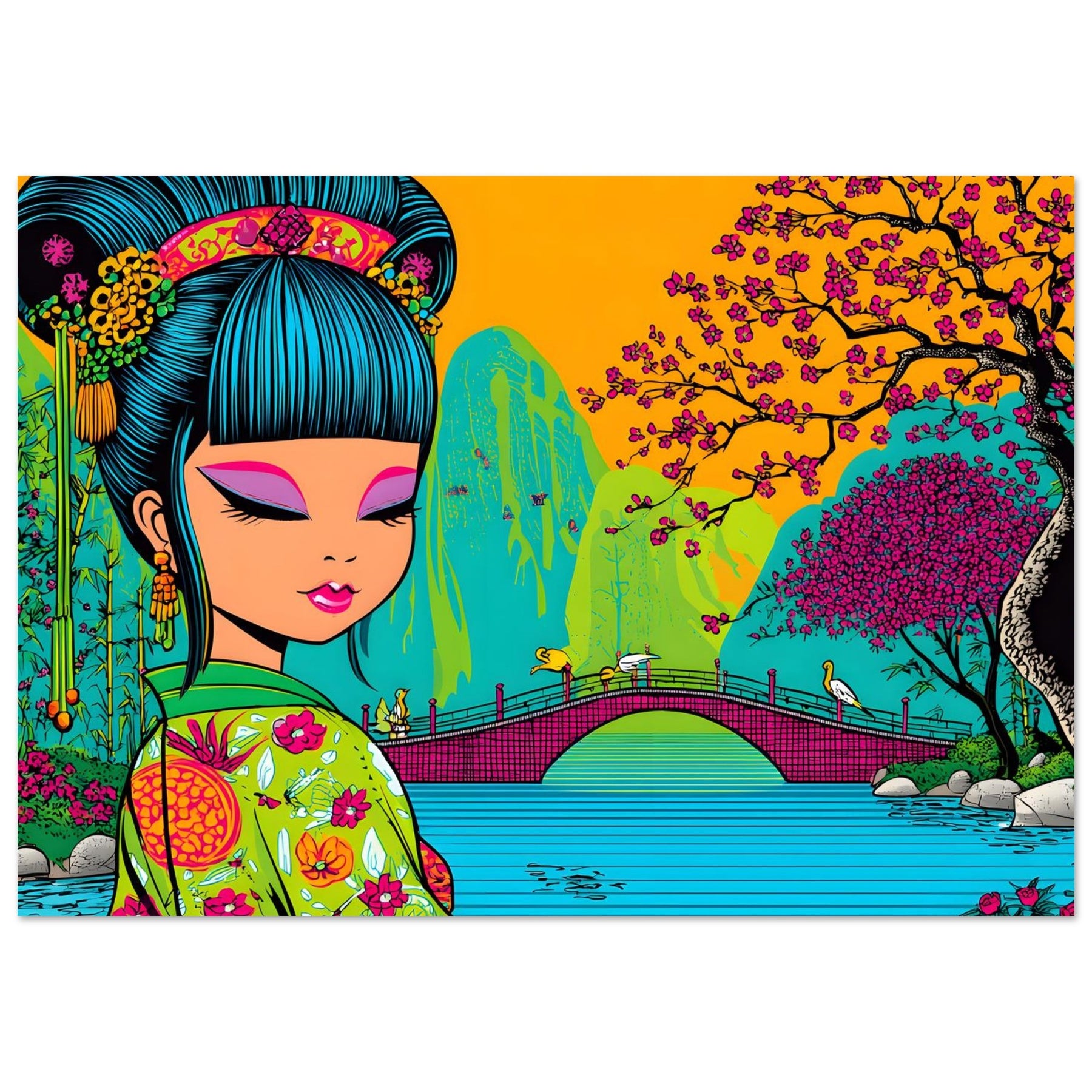Experience calm elegance and cultural beauty with Cherry Blossom Serenity, a stunning pop art aluminum wall art highlighting a serene Asian landscape. The illustration features a graceful girl in traditional attire, surrounded by blooming cherry blossoms and tranquil waters, blending soft harmony with vibrant pop art expression.