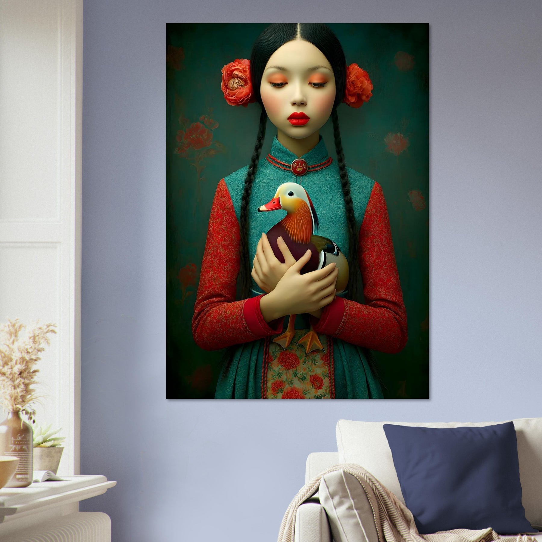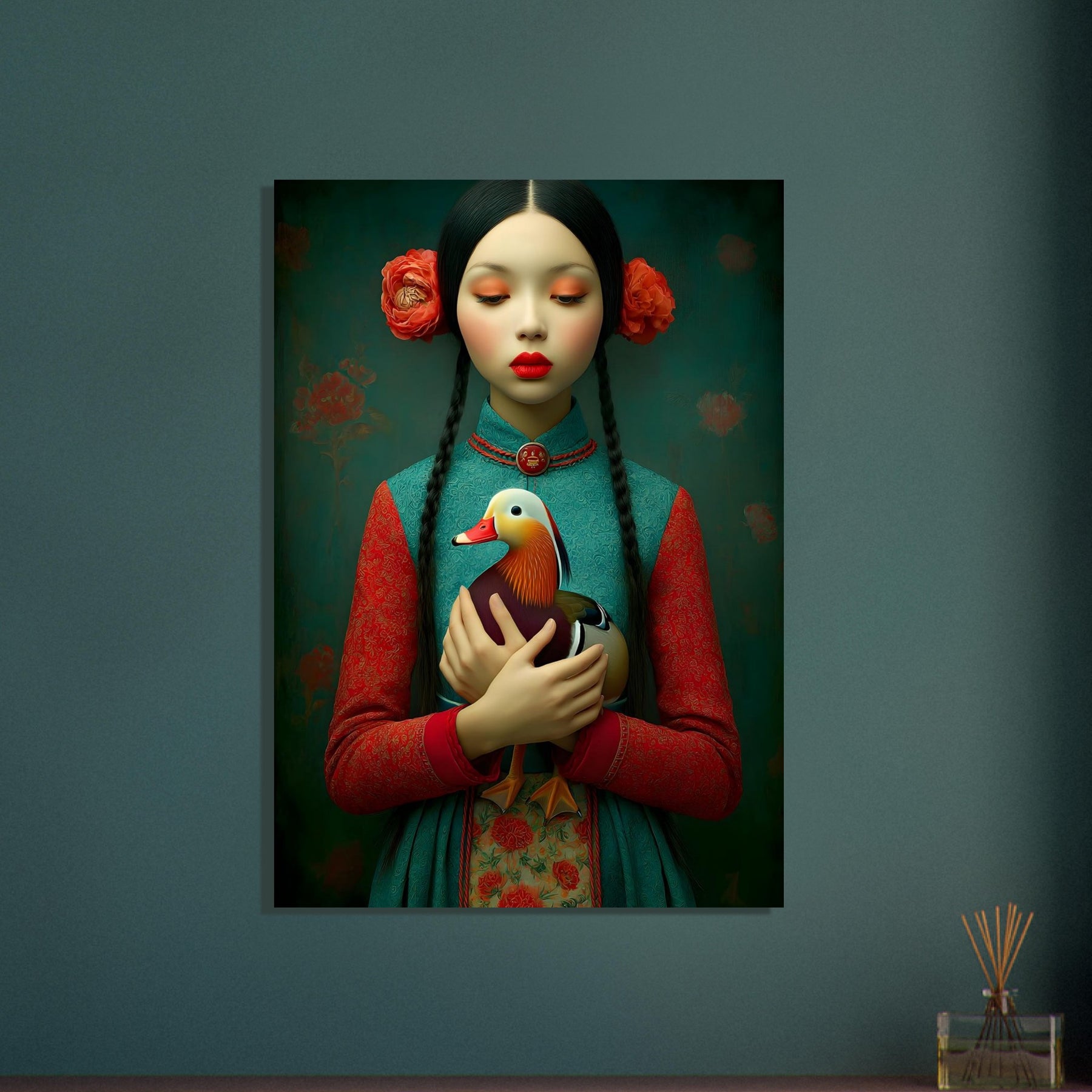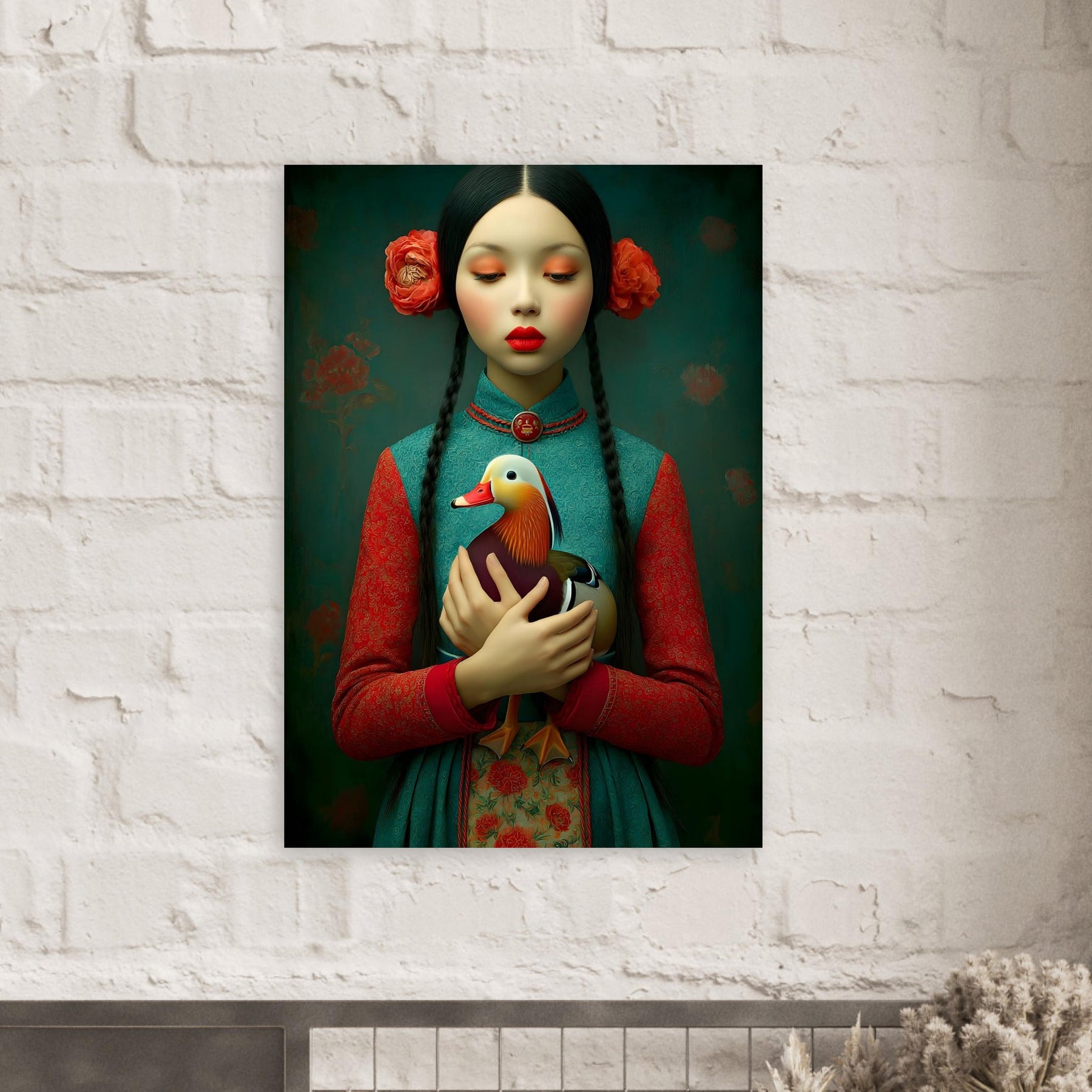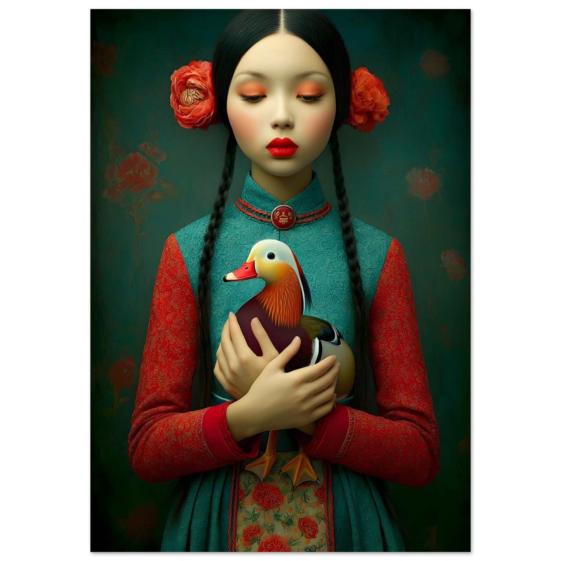 Bring elegance, culture, and natural beauty into your home with the Harmony in Bloom Aluminum Wall Art. This enchanting portrait features a young girl in traditional attire holding a colorful duck, symbolizing grace, harmony, and the connection between humans and nature. Set against a richly textured background adorned with floral elements, the artwork radiates warmth, tradition, and timeless charm.