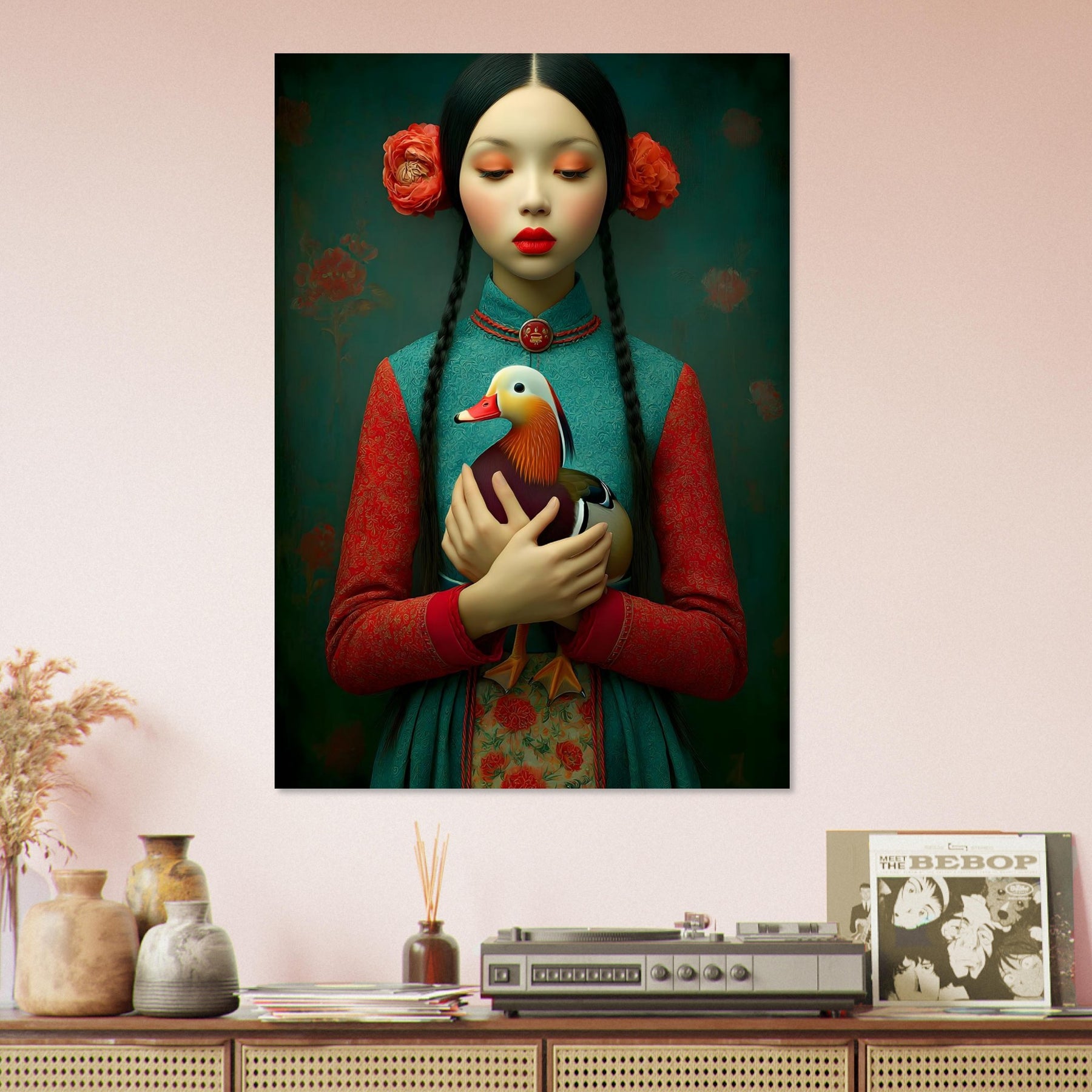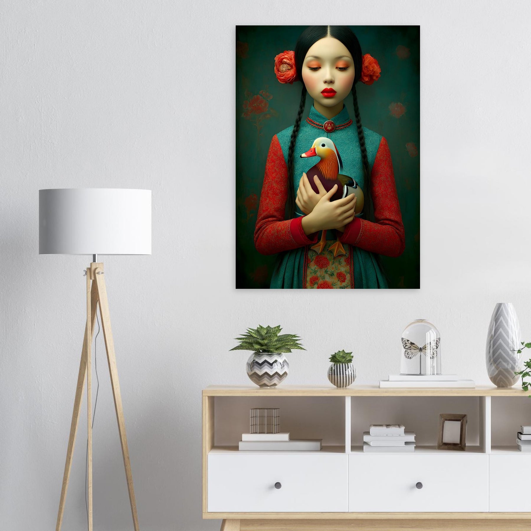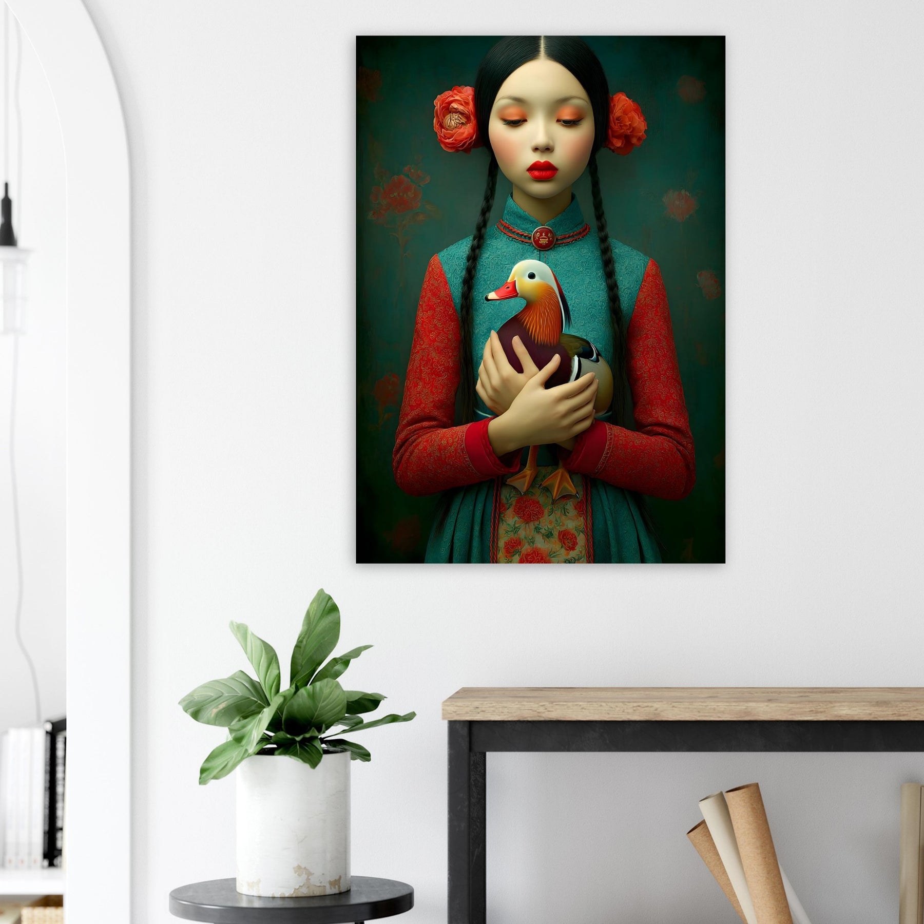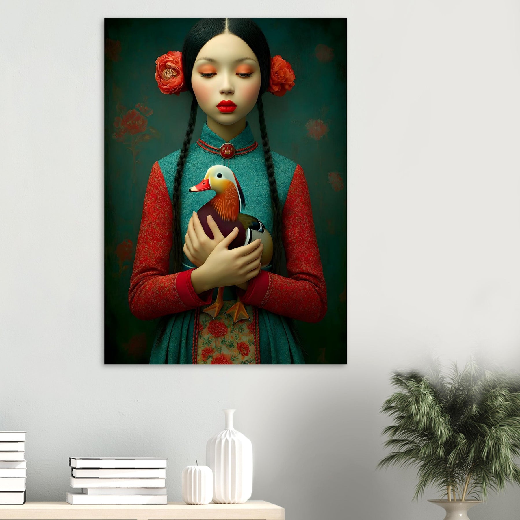 Bring elegance, culture, and natural beauty into your home with the Harmony in Bloom Aluminum Wall Art. This enchanting portrait features a young girl in traditional attire holding a colorful duck, symbolizing grace, harmony, and the connection between humans and nature. Set against a richly textured background adorned with floral elements, the artwork radiates warmth, tradition, and timeless charm.