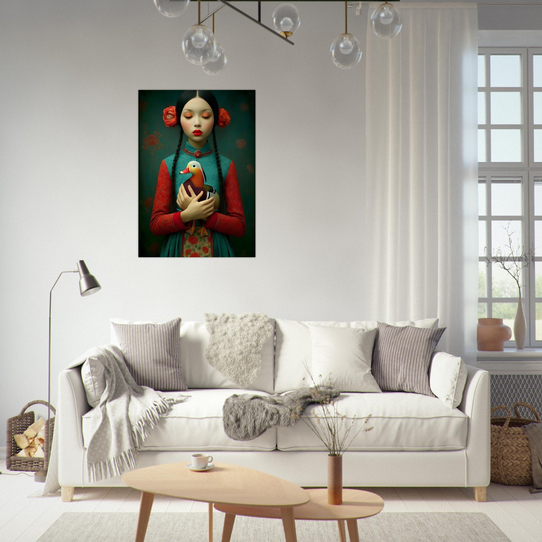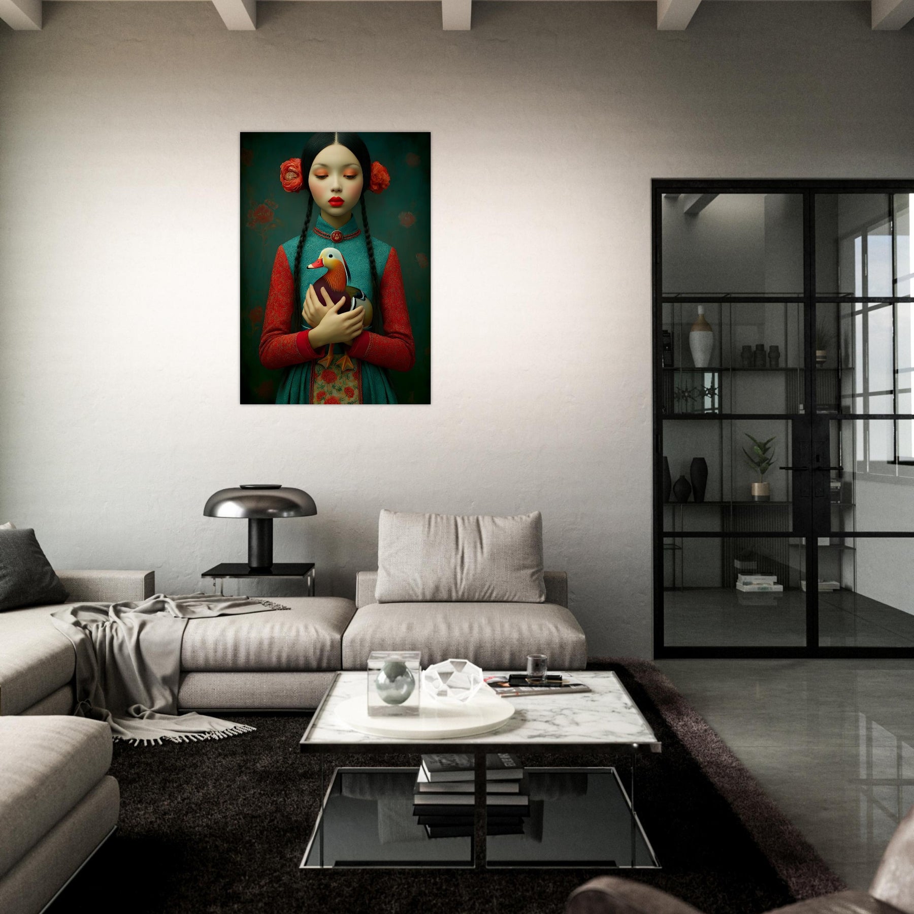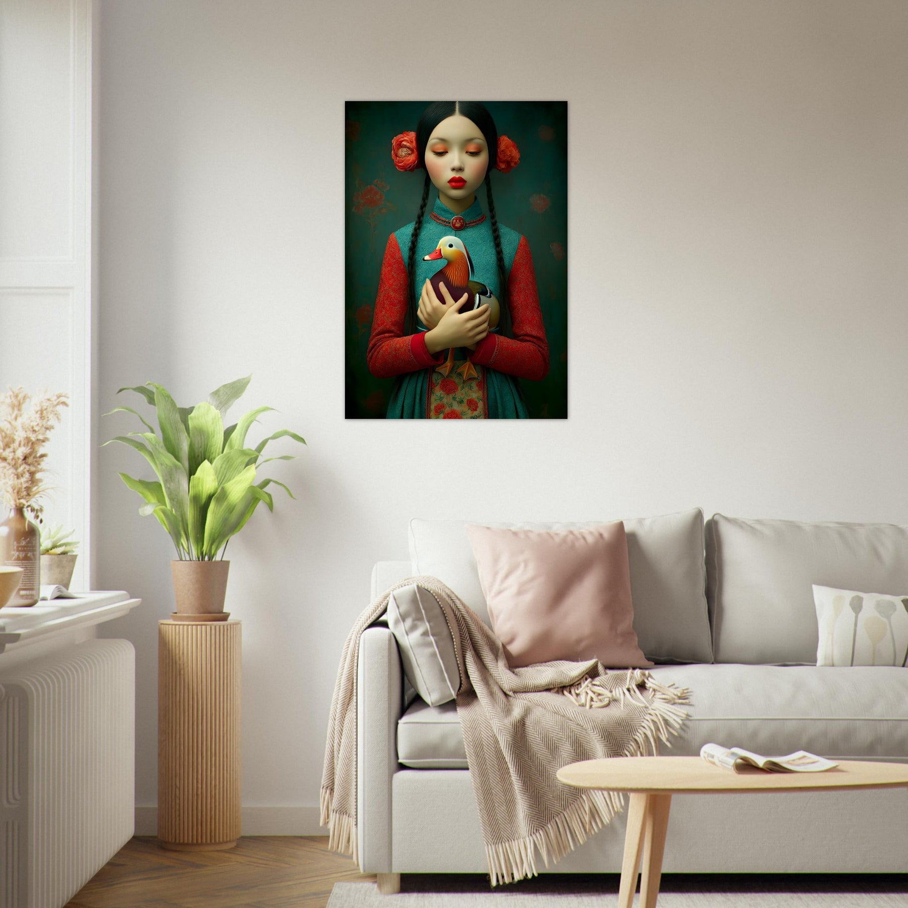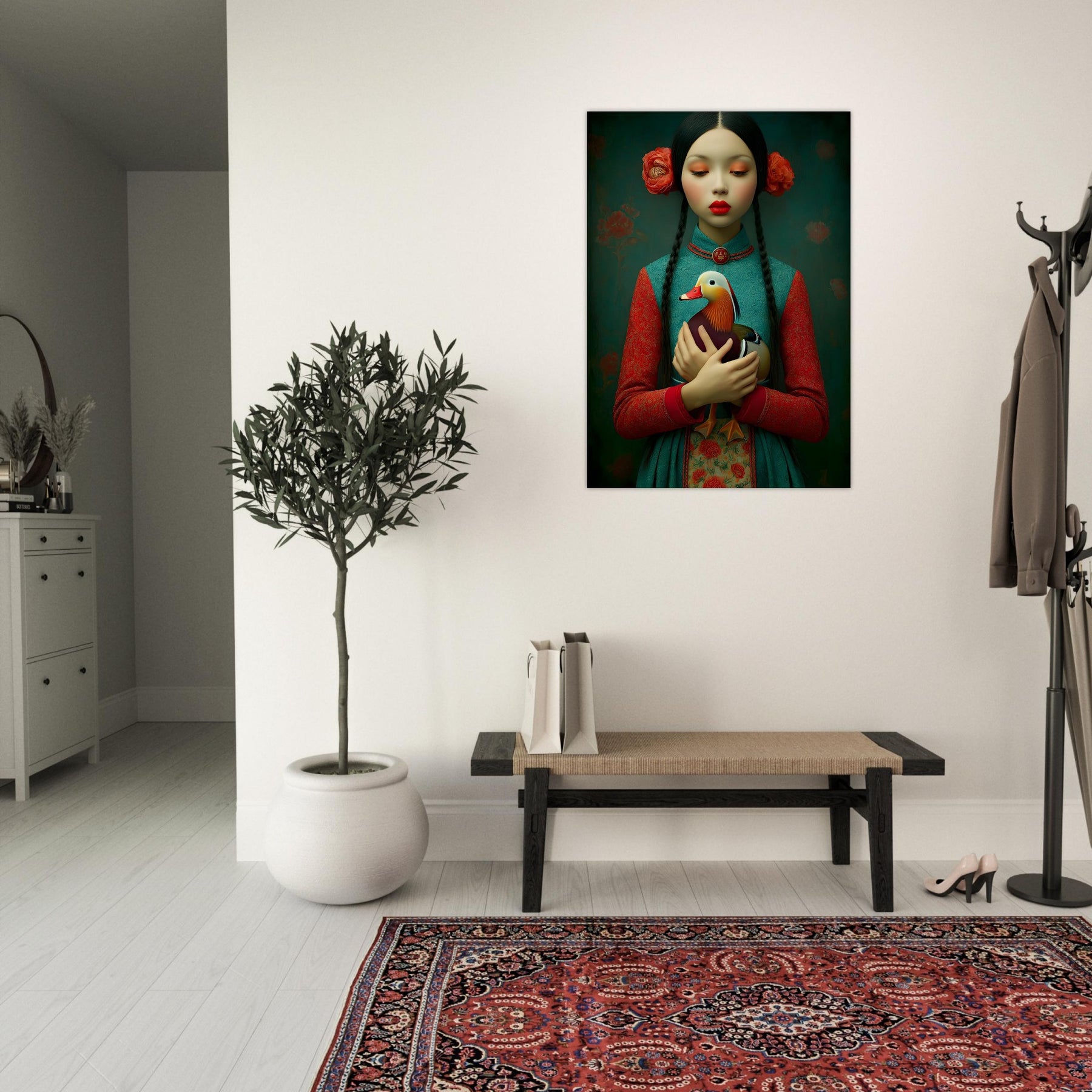 Bring elegance, culture, and natural beauty into your home with the Harmony in Bloom Aluminum Wall Art. This enchanting portrait features a young girl in traditional attire holding a colorful duck, symbolizing grace, harmony, and the connection between humans and nature. Set against a richly textured background adorned with floral elements, the artwork radiates warmth, tradition, and timeless charm.